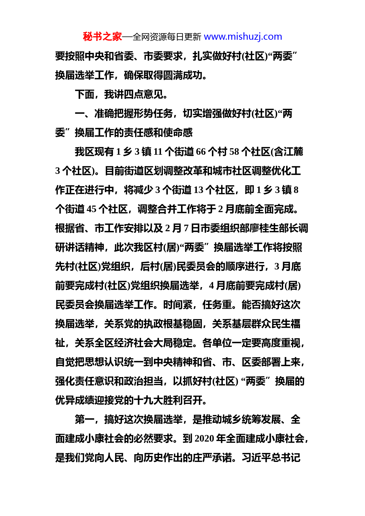 秘书之家—全网资源每日更新www.mishuzj.com在全区村(居)“两委”换届选举工作动员会议上的讲话同志们:今年的村(社区)“两委”换届选举,是全省首次进行的村和社区同步换届,也是全市新一轮合乡并村改革、街道区划调整改革和城市社区调整优化后进行的第一次换届选举,具有特殊性,也更需要重视。中央和省、市、区委高度重视基层组织建设。去年5月,中组部召开市县乡换届工作推进会时,就对村(社区)“两委”换届工作提出明确要求。全国组织部长会议强调,要坚持稳中求进工作总基调,持续做好抓基层、打基础的工作,把城市基层党建摆在重要位置,严格规范村“两委”选举,完善基层民主管理制度。省委常委会进行专题研究,家毫书记指示,要切实把村级组织换届工作抓好,选出素质过硬、作风过硬、能够带领群众脱贫致富的好班子、好书记。2月17日,我市召开村(社区)“两委”换届选举工作推进会。市委书记、市人大常委会主任曹炯芳主持会议并讲话,强调要高度重视,坚定信心,牢记责任,相信群众,敢于担当,注重方法,确保换届选举圆满成功。要配出好班子,选出好支书,开出好风气,理出好思路,严守不出大问题、不大面积出问题两条底线,出现问题的责任人实行“一票否决”。我们一定秘书之家—全网资源每日更新www.mishuzj.com要按照中央和省委、市委要求,扎实做好村(社区)“两委”换届选举工作,确保取得圆满成功。下面,我讲四点意见。一、准确把握形势任务,切实增强做好村(社区)“两委”换届工作的责任感和使命感我区现有1乡3镇11个街道66个村58个社区(含江麓3个社区)。目前街道区划调整改革和城市社区调整优化工作正在进行中,将减少3个街道13个社区,即1乡3镇8个街道45个社区,调整合并工作将于2月底前全面完成。根据省、市工作安排以及2月7日市委组织部廖桂生部长调研讲话精神,此次我区村(居)“两委”换届选举工作将按照先村(社区)党组织,后村(居)民委员会的顺序进行,3月底前要完成村(社区)党组织换届选举,4月底前要完成村(居)民委员会换届选举工作。时间紧,任务重。能否搞好这次换届选举,关系党的执政根基稳固,关系基层群众民生福祉,关系全区经济社会大局稳定。各单位一定要高度重视,自觉把思想认识统一到中央精神和省、市、区委部署上来,强化责任意识和政治担当,以抓好村(社区)“两委”换届的优异成绩迎接党的十九大胜利召开。第一,搞好这次换届选举,是推动城乡统筹发展、全面建成小康社会的必然要求。到2020年全面建成小康社会,是我们党向人民、向历史作出的庄严承诺。习近平总书记秘书之家—全网资源每日更新www.mishuzj.com强调,全面小康是全面发展的小康,是全民共享的小康,不能出现有人掉队。目前,我省还有6000多个贫困村300多万贫困人口、400多万低保人口,其中不少是贫中之贫、困中之困。从现在起到2020年,只有3年多时间,这与换届后的村(社区)“两委”任期高度重合,新的一届村(社区)“两委”担负着实现全面小康目标“排头兵”的重任。无论是推进城市和谐文明社区建设、为居民提供多样化的优质服务,还是加快美丽乡村建设、发展现代农业、促进农民增收致富,都需要基层党组织发挥好领导核心作用和战斗堡垒作用,离不开群众信任的好班子、好书记。我们一定要站在战略和全局的高度,切实抓好村(社区)“两委”换届,真正把基层组织建设成为坚强领导核心,确保基层组织带头人个个过硬,为打赢脱贫攻坚战、全面建成小康社会提供组织保证。第二,搞好这次换届选举,是深化改革、提升基层治理水平的关键之举。习近平总书记指出,推进改革发展稳定大量任务在基层,推进国家治理体系和治理能力现代化的基础性工作也在基层;社会治理的重心必须落到城乡社区,社区服务和管理能力强了,社会治理的基础就实了。当前,随着新型城镇化加快推进,大量人口进入城市就业、定居和生活,群众的利益诉求日益多元化,城市基层改革治理的任务很重,迫切需要社区基层组织发挥好协调各方秘书之家—全网资源每日更新www.mishuzj.com利益、促进社区和谐稳定的“托底”作用。在农村,推进农业经营体系、农村集体产权制度等方面改革,依法打击非法宗族、宗教和黑恶势力,维护农村社会和谐稳定,以及妥善处理好并村改革的后续问题,都迫切需要农村基层组织解放思想、开拓创新、敢于担当、化解矛盾、团结群众。只有切实抓好村(社区)“两委”换届选举,选出勇于负责、善于治理、能打硬仗、群众拥护的基层组织领导班子和“当家人”,深化城乡改革的各项任务才能落地见效,基层社会治理才能朝着法治化、现代化的目标不断迈进。第三,搞好这次换届选举,是推动全面从严治党向基层延伸、夯实党的执政根基的重要实践。基层组织是党执政大厦的地基,基层干部是这个地基中的钢筋,只有把基层党组织这个地基打牢了,把地基中的钢筋配强了,我们党才能从容应对各种风险挑战,永远立于不败之地。这些年,各地树立大抓基层的鲜明导向,基层组织建设进一步加强,基层面貌有了很大改观,但基层基础总体薄弱的状况仍然没有得到根本改变,一些基层党组织软弱涣散,基层民主管理制度不够健全,有的地方村级事务不公开、“雁过拔毛”式腐败时有发生,基层党员干部队伍年龄老化、能力弱化的问题还比较突出,等等