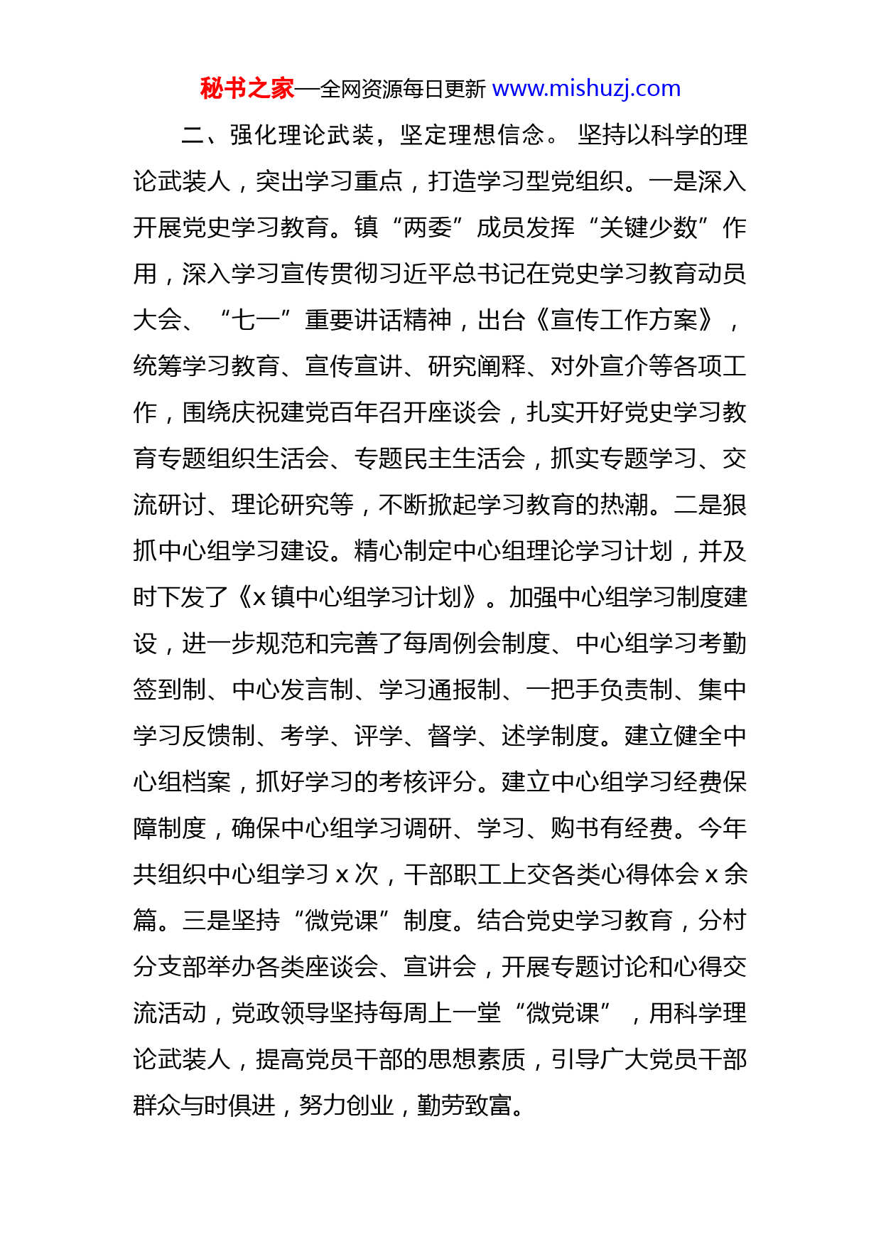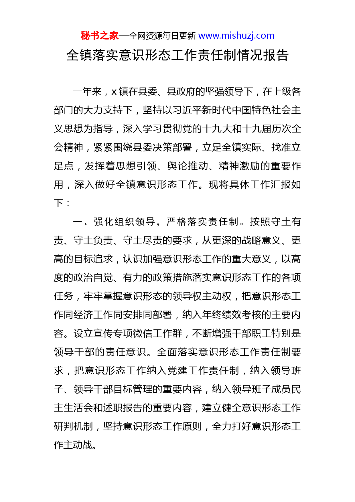 秘书之家—全网资源每日更新www.mishuzj.com全镇落实意识形态工作责任制情况报告一年来,x镇在县委、县政府的坚强领导下,在上级各部门的大力支持下,坚持以习近平新时代中国特色社会主义思想为指导,深入学习贯彻党的十九大和十九届历次全会精神,紧紧围绕县委决策部署,立足全镇实际、找准立足点,发挥着思想引领、舆论推动、精神激励的重要作用,深入做好全镇意识形态工作。现将具体工作汇报如下:一、强化组织领导,严格落实责任制。按照守土有责、守土负责、守土尽责的要求,从更深的战略意义、更高的目标追求,认识加强意识形态工作的重大意义,以高度的政治自觉、有力的政策措施落实意识形态工作的各项任务,牢牢掌握意识形态的领导权主动权,把意识形态工作同经济工作同安排同部署,纳入年终绩效考核的主要内容。设立宣传专项微信工作群,不断增强干部职工特别是领导干部的责任意识。全面落实意识形态工作责任制要求,把意识形态工作纳入党建工作责任制,纳入领导班子、领导干部目标管理的重要内容,纳入领导班子成员民主生活会和述职报告的重要内容,建立健全意识形态工作研判机制,坚持意识形态工作原则,全力打好意识形态工作主动战。秘书之家—全网资源每日更新www.mishuzj.com二、强化理论武装,坚定理想信念。坚持以科学的理论武装人,突出学习重点,打造学习型党组织。一是深入开展党史学习教育。镇“两委”成员发挥“关键少数”作用,深入学习宣传贯彻习近平总书记在党史学习教育动员大会、“七一”重要讲话精神,出台《宣传工作方案》,统筹学习教育、宣传宣讲、研究阐释、对外宣介等各项工作,围绕庆祝建党百年召开座谈会,扎实开好党史学习教育专题组织生活会、专题民主生活会,抓实专题学习、交流研讨、理论研究等,不断掀起学习教育的热潮。二是狠抓中心组学习建设。精心制定中心组理论学习计划,并及时下发了《x镇中心组学习计划》。加强中心组学习制度建设,进一步规范和完善了每周例会制度、中心组学习考勤签到制、中心发言制、学习通报制、一把手负责制、集中学习反馈制、考学、评学、督学、述学制度。建立健全中心组档案,抓好学习的考核评分。建立中心组学习经费保障制度,确保中心组学习调研、学习、购书有经费。今年共组织中心组学习x次,干部职工上交各类心得体会x余篇。三是坚持“微党课”制度。结合党史学习教育,分村分支部举办各类座谈会、宣讲会,开展专题讨论和心得交流活动,党政领导坚持每周上一堂“微党课”,用科学理论武装人,提高党员干部的思想素质,引导广大党员干部群众与时俱进,努力创业,勤劳致富。秘书之家—全网资源每日更新www.mishuzj.com三、强化舆论引导,传播凝聚正能量。在舆论引导与对外宣传中,始终坚持团结稳定鼓劲,正面宣传为主,尊重舆论宣传规律,讲究舆论宣传艺术,提高舆论引导效果,为全镇的改革发展稳定大局提供强有力的舆论支持。一是把握导向,规范舆论宣传。进一步健全完善新闻“三审制”,搭建信息互通的平台,对一些苗头性问题努力做到早预见、早发现。注重把握不同时期宣传重点,提高舆论引导水平。对重大事件及突发性问题及时尤其注重提前介入,防患未然,特别注意掌握网络舆情,牢牢掌握新闻报导主动权。二是强化载体,占领舆论阵地。投入x元,先后在各村建立固定的群众工作宣传栏,在镇区中心街设立大型LED彩频、政府院内设立了大型LED宣传廊,宣传党史学习教育、乡村振兴、基层党建、党风廉政建设、安全生产、森林防火等内容,强化宣传载体建设。三是主动出击,切实加强对外宣传。一年来,先后在中央和省、市、县主要媒体报刊共投稿x多篇,x、x、x等媒体对我镇乡村换届、党史学习教育、乡村振兴等典型案例进行了推介报导。同时,我镇成功推介了乡村振兴、少年足球、产业发展等的故事,并在x市电视台进行了专题报道。四、弘扬社会文明,践行核心价值观。一方面,领导重视,软件硬件有保障。高度重视精神文明建设工作,成立了以党委书记为组长,镇长任常务副组长的精神文明建秘书之家—全网资源每日更新www.mishuzj.com设工作领导小组,定期研究精神文明建设有关工作,做到“资金有保障、机制更健全、活动有载体、建设有阵地”。建设了功能齐全的综合文化大楼,建成了休闲广场,在各村配置了农家书屋,完成了村村响工程。完善了精神文明建设领导机制、责任机制、督促机制和投入机制。出台了一系列文件,将任务分解落实到各有关单位、各村,对其责任规定和标准要求等均作了详细规定,做到“活动前有动员、有布置,活动中有检查、有反馈,活动后有考核、有总结”,形成一级抓一级、层层抓落实的良好局面。另一方面,活动丰富,文明创建有成效。深入开展群众性精神文化活动。举办了中小学足球文化体育节、平安中国x行、广场舞比赛等广泛开展文明单位、文明村镇创建活动。以“乡贤文化示范村”创建为契机,加强“五有”乡贤文化建设和“x好人”评选活动,大力弘扬乡贤文化和好人文化,开展“平安家庭”评选活动,开展移风易俗宣传教育,无封建迷信、非法宗教、邪教发生。开展美丽乡村、洁净乡村行动。坚持走可持续发展道路,建立美丽乡村、洁净乡村专项资金,专门用于农村三改以及农村环境