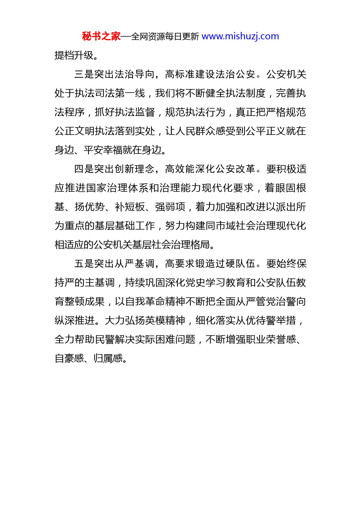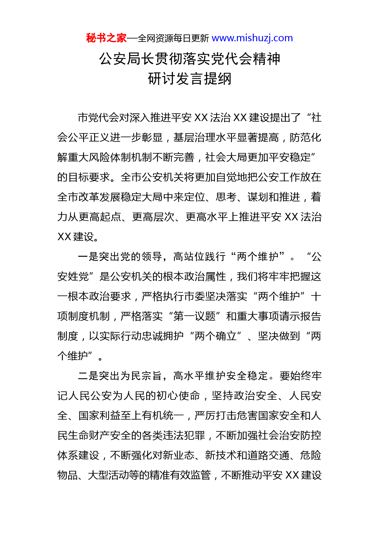 秘书之家—全网资源每日更新www.mishuzj.com公安局长贯彻落实党代会精神研讨发言提纲市党代会对深入推进平安XX法治XX建设提出了“社会公平正义进一步彰显,基层治理水平显著提高,防范化解重大风险体制机制不断完善,社会大局更加平安稳定”的目标要求。全市公安机关将更加自觉地把公安工作放在全市改革发展稳定大局中来定位、思考、谋划和推进,着力从更高起点、更高层次、更高水平上推进平安XX法治XX建设。一是突出党的领导,高站位践行“两个维护”。“公安姓党”是公安机关的根本政治属性,我们将牢牢把握这一根本政治要求,严格执行市委坚决落实“两个维护”十项制度机制,严格落实“第一议题”和重大事项请示报告制度,以实际行动忠诚拥护“两个确立”、坚决做到“两个维护”。二是突出为民宗旨,高水平维护安全稳定。要始终牢记人民公安为人民的初心使命,坚持政治安全、人民安全、国家利益至上有机统一,严厉打击危害国家安全和人民生命财产安全的各类违法犯罪,不断加强社会治安防控体系建设,不断强化对新业态、新技术和道路交通、危险物品、大型活动等的精准有效监管,不断推动平安XX建设秘书之家—全网资源每日更新www.mishuzj.com提档升级。三是突出法治导向,高标准建设法治公安。公安机关处于执法司法第一线,我们将不断健全执法制度,完善执法程序,抓好执法监督,规范执法行为,真正把严格规范公正文明执法落到实处,让人民群众感受到公平正义就在身边、平安幸福就在身边。四是突出创新理念,高效能深化公安改革。要积极适应推进国家治理体系和治理能力现代化要求,着眼固根基、扬优势、补短板、强弱项,着力加强和改进以派出所为重点的基层基础工作,努力构建同市域社会治理现代化相适应的公安机关基层社会治理格局。五是突出从严基调,高要求锻造过硬队伍。要始终保持严的主基调,持续巩固深化党史学习教育和公安队伍教育整顿成果,以自我革命精神不断把全面从严管党治警向纵深推进。大力弘扬英模精神,细化落实从优待警举措,全力帮助民警解决实际困难问题,不断增强职业荣誉感、自豪感、归属感。