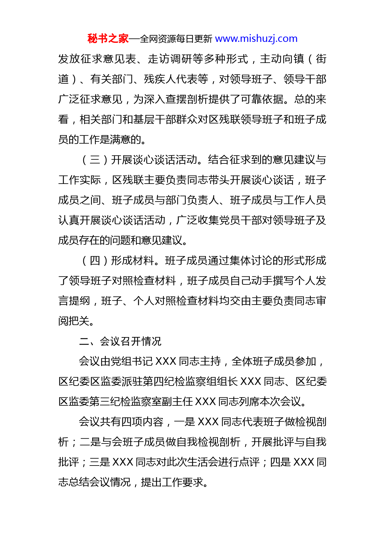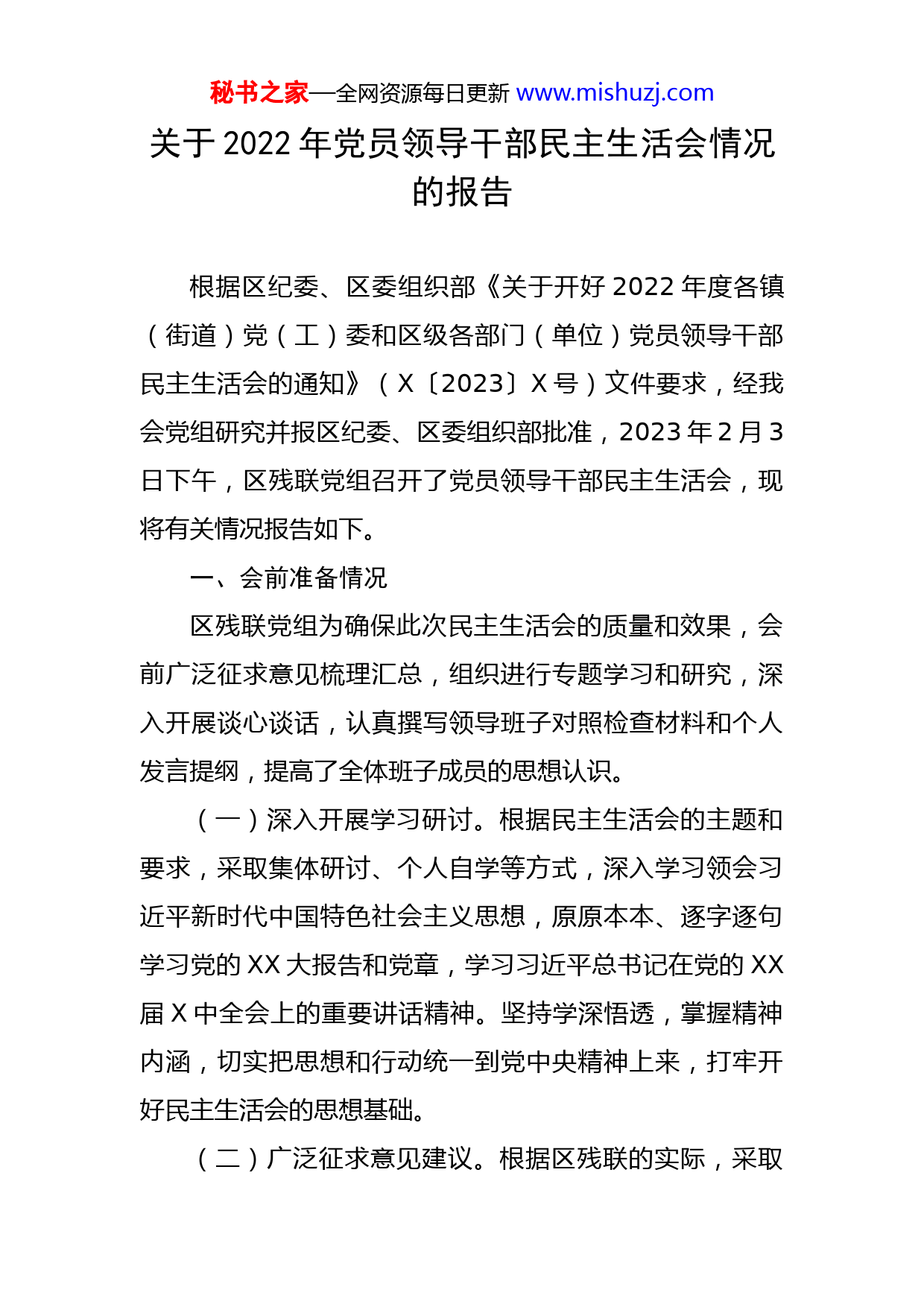 秘书之家—全网资源每日更新www.mishuzj.com关于2022年党员领导干部民主生活会情况的报告根据区纪委、区委组织部《关于开好2022年度各镇(街道)党(工)委和区级各部门(单位)党员领导干部民主生活会的通知》(X〔2023〕X号)文件要求,经我会党组研究并报区纪委、区委组织部批准,2023年2月3日下午,区残联党组召开了党员领导干部民主生活会,现将有关情况报告如下。一、会前准备情况区残联党组为确保此次民主生活会的质量和效果,会前广泛征求意见梳理汇总,组织进行专题学习和研究,深入开展谈心谈话,认真撰写领导班子对照检查材料和个人发言提纲,提高了全体班子成员的思想认识。(一)深入开展学习研讨。根据民主生活会的主题和要求,采取集体研讨、个人自学等方式,深入学习领会习近平新时代中国特色社会主义思想,原原本本、逐字逐句学习党的XX大报告和党章,学习习近平总书记在党的XX届X中全会上的重要讲话精神。坚持学深悟透,掌握精神内涵,切实把思想和行动统一到党中央精神上来,打牢开好民主生活会的思想基础。(二)广泛征求意见建议。根据区残联的实际,采取秘书之家—全网资源每日更新www.mishuzj.com发放征求意见表、走访调研等多种形式,主动向镇(街道)、有关部门、残疾人代表等,对领导班子、领导干部广泛征求意见,为深入查摆剖析提供了可靠依据。总的来看,相关部门和基层干部群众对区残联领导班子和班子成员的工作是满意的。(三)开展谈心谈话活动。结合征求到的意见建议与工作实际,区残联主要负责同志带头开展谈心谈话,班子成员之间、班子成员与部门负责人、班子成员与工作人员认真开展谈心谈话活动,广泛收集党员干部对领导班子及成员存在的问题和意见建议。(四)形成材料。班子成员通过集体讨论的形式形成了领导班子对照检查材料,班子成员自己动手撰写个人发言提纲,班子、个人对照检查材料均交由主要负责同志审阅把关。二、会议召开情况会议由党组书记XXX同志主持,全体班子成员参加,区纪委区监委派驻第四纪检监察组组长XXX同志、区纪委区监委第三纪检监察室副主任XXX同志列席本次会议。会议共有四项内容,一是XXX同志代表班子做检视剖析;二是与会班子成员做自我检视剖析,开展批评与自我批评;三是XXX同志对此次生活会进行点评;四是XXX同志总结会议情况,提出工作要求。秘书之家—全网资源每日更新www.mishuzj.com此次民主生活会紧紧围绕此次主题,严格按照会议议程,聚焦6个重点方面,班子成员开展积极健康的批评与自我批评,在自我剖析和批评中见血见肉,分析根源究根究源。在相互批评中讲真理不讲面子,讲原则不讲关系,真心诚意地帮助同志指明问题,提出意见。通过坦诚交流思想,大家加深了理解、增进了团结,达到坚持真理、修正错误、严明纪律、改进作风的目的。班子共查找问题点6个方面12条,班子成员共查找问题点44条,相互提出批评意见16条。三、会后整改情况针对查找出来的问题,班子成员决心立说立行、即知即改,认真抓好问题的整改落实,切实加强班子自身建设,以更加优良的党风、政风和行风推动南湖区残疾人事业快速健康持续发展。(一)抓理论学习,突出政治引领作用。以解决思想和工作中存在的实际问题为出发点,坚持学习习近平新时代中国特色社会主义思想和党的XX大精神,深刻把握其治国理政的新思想、新观点、新论断、新要求,学会用马克思主义立场、观点、方法观察问题、分析问题、解决问题。深刻领会习近平总书记关于残疾人工作的重要指示批示精神,牢牢把握残疾人工作的正确方向。(二)抓班子建设,突出管党主体责任。始终坚持以秘书之家—全网资源每日更新www.mishuzj.com政治建设为统领,切实履行好管党治党的责任,增强“四个意识”、坚定“四个自信”、做到“两个维护”,严格遵守党的政治纪律和政治规矩,始终从思想上、政治上、行动上同以习近平同志为核心的党中央保持高度一致,坚定不移的维护党的权威,坚决执行上级党组织的各项规定。班子成员带头检查自己的思想和行为,带头落实党内政治生活的各项要求,带头接受党内监督,为全体党员作表率,当示范。(三)抓能力建设,突出干部担当作为。努力学习与岗位职责相关的业务知识,弥补短板,克服本领恐慌,增强工作的前瞻性、主动性,履职尽责,担当作为,不断提高班子成员工作水平。用高站位、宽视野、新思维做好残联工作,切实发挥促进社会和谐稳定的作用。树立“细节决定成败”的理念,以高度负责的精神、扎实细致的作风,做好各项残疾人工作,推进业务流程精细化、制度化和规范化。加大走访服务力度,创新工作推进方式,切实提高服务残疾人的能力。(四)抓制度建设,突出党员带头示范。把党的组织生活作为从严落实党内政治生活的重要内容和载体,认真落实“三会一课”制度、谈心谈话、民主评议党员制度,积极探索主题日活动的创新做法。充分发挥党员带动作用,始终保持在思想上、政治上的清醒和坚定。进一步健秘书之家—全网资源每日更新www.mishuzj.com全和完善机关管理制度,对已经形成并运行良好的制度继续加以坚持,对尚不完善的制度及时修订完善,建立按制度办事、以制度管人、用制度约束的工作格局,进一步促进机关作风转变、工作效能提升。