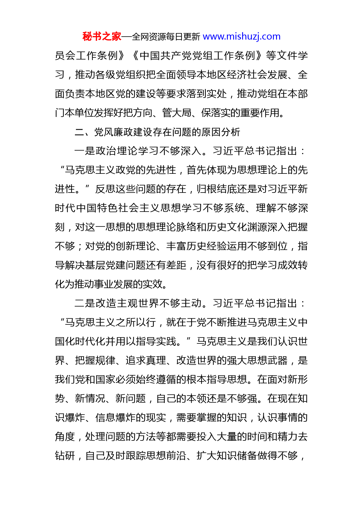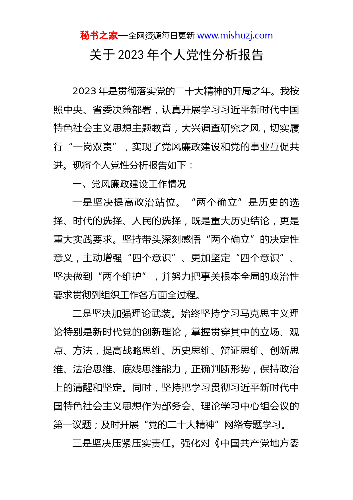 秘书之家—全网资源每日更新www.mishuzj.com关于2023年个人党性分析报告2023年是贯彻落实党的二十大精神的开局之年。我按照中央、省委决策部署,认真开展学习习近平新时代中国特色社会主义思想主题教育,大兴调查研究之风,切实履行“一岗双责”,实现了党风廉政建设和党的事业互促共进。现将个人党性分析报告如下:一、党风廉政建设工作情况一是坚决提高政治站位。“两个确立”是历史的选择、时代的选择、人民的选择,既是重大历史结论,更是重大实践要求。坚持带头深刻感悟“两个确立”的决定性意义,主动增强“四个意识”、更加坚定“四个意识”、坚决做到“两个维护”,并努力把事关根本全局的政治性要求贯彻到组织工作各方面全过程。二是坚决加强理论武装。始终坚持学习马克思主义理论特别是新时代党的创新理论,掌握贯穿其中的立场、观点、方法,提高战略思维、历史思维、辩证思维、创新思维、法治思维、底线思维能力,正确判断形势,保持政治上的清醒和坚定。同时,坚持把学习贯彻习近平新时代中国特色社会主义思想作为部务会、理论学习中心组会议的第一议题;及时开展“党的二十大精神”网络专题学习。三是坚决压紧压实责任。强化对《中国共产党地方委秘书之家—全网资源每日更新www.mishuzj.com员会工作条例》《中国共产党党组工作条例》等文件学习,推动各级党组织把全面领导本地区经济社会发展、全面负责本地区党的建设等要求落到实处,推动党组在本部门本单位发挥好把方向、管大局、保落实的重要作用。二、党风廉政建设存在问题的原因分析一是政治埋论学习不够深入。习近平总书记指出:“马克思主义政党的先进性,首先体现为思想理论上的先进性。”反思这些问题的存在,归根结底还是对习近平新时代中国特色社会主义思想学习不够系统、理解不够深刻,对这一思想的思想理论脉络和历史文化渊源深入把握不够;对党的创新理论、丰富历史经验运用不够到位,指导解决基层党建问题还有差距,没有很好的把学习成效转化为推动事业发展的实效。二是改造主观世界不够主动。习近平总书记指出:“马克思主义之所以行,就在于党不断推进马克思主义中国化时代化并用以指导实践。”马克思主义是我们认识世界、把握规律、追求真理、改造世界的强大思想武器,是我们党和国家必须始终遵循的根本指导思想。在面对新形势、新情况、新问题,自己的本领还是不够强。在现在知识爆炸、信息爆炸的现实,需要掌握的知识,认识事情的角度,处理问题的方法等都需要投入大量的时间和精力去钻研,自己及时跟踪思想前沿、扩大知识储备做得不够,秘书之家—全网资源每日更新www.mishuzj.com在实践中补齐能力短板、经验盲区做得不好,创新能力和精神仍不够。三是宗旨意识树得仍不够牢固。习近平总书记指出,“前进道路上,全党要坚持全心全意为人民服务的根本宗旨”“始终保持同人民群众的血肉联系,始终接受人民批评和监督,始终同人民同呼吸、共命运、心连心。”在工作遇到问题,特别的一些棘手的问题时,不能很好的深入基层、深入实际、深入一线群众中,作过细的调查研究,摸清问题的原因,找准问题内在关系,研究出解决问题的方法和措施;对基层群众的酸甜苦辣感受不深,为群众着想、服务群众的主动性不够。三、今后的党风廉政建设努力方向和改进措施一是锚定凝心铸魂,筑牢思想根基。思想清醒才能保持政治坚定。把认真学习贯彻党的二十大精神作为首要政治任务,每周挤出固定的时间坐下来学习,多踱方步思考些问题,进一步增强学习的系统性、完整性,原原本本、原汁原味、逐字逐句地认真研读、全面掌握科学理论的基本观点、理论体系和实践意义;同时,以身作则引导广大党员干部原原本本、逐字逐句学习,深刻领会丰富内涵和精髓要义。充分利用“三会一课”、主题党日等方式,推动党的二十大精神进农村、进社区、进机关、进企业、进学校,让大会精神在XX每一个基层党组织、每一名党员干秘书之家—全网资源每日更新www.mishuzj.com部中入脑入心、走深走实。二是强化初心本色,树牢宗旨意识。牢固树立“人民对美好生活的向往,就是我们的奋斗目标”的宗旨意识,站稳群众立场,做到想群众之所想,急群众之所急,帮群众之所需,始终站在改革发展的主战场、维护稳定的第一线、服务群众的最前沿。坚决树牢群众观念和公仆意识,密切与群众联系,经常带着感情、带着责任、带着问题深入到农村、社区和企业等基层一线,了解掌握群众的所思、所想、所盼,帮助解决好群众急难愁盼问题,把群众呼声作为第一信号,把群众需要作为第一选择,把群众满意作为第一标准,切实把党的政治优势、组织优势转化为基层治理效能,把事关民生福祉的工作做深做细做实做好。三是强化责任担当,勇于突破创新。持续发扬实干作风,始终追求卓越,注重细节、严把质量、精益求精,用“钉钉子”精神把各项工作抓到底。带头解放思想真抓实干,对照中央、省委部署要求,紧密联系全X工作大局,认真学习借鉴发达地区的好经验、好做法。围绕人才强X战略,加大人才引进力度,着力破解我X产业发展瓶颈;进一步做好产学研一体化工作,推动更多研究成果在我X落地落实。适时组织X村干部外出学习,进一步更新思维、开阔眼