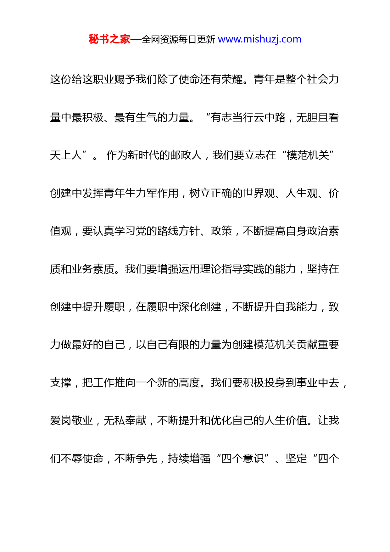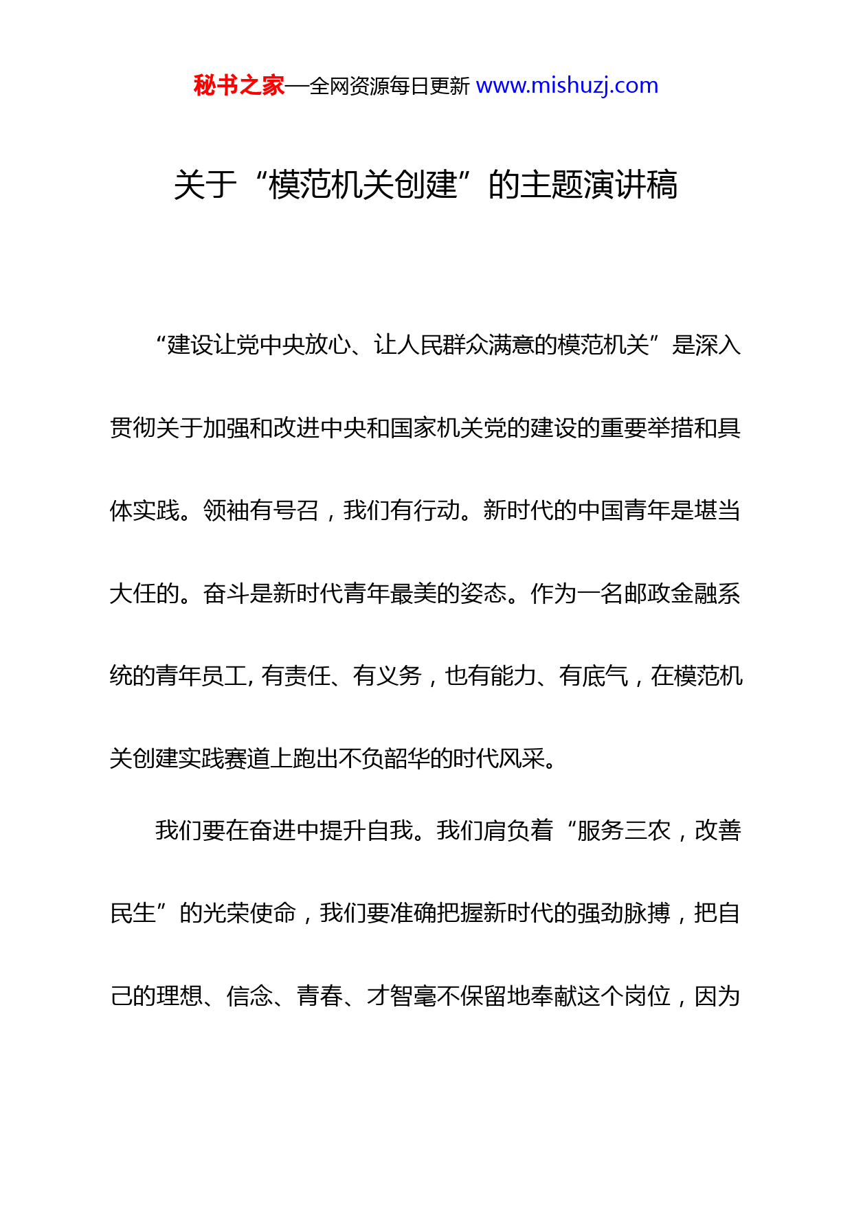 秘书之家—全网资源每日更新www.mishuzj.com关于“模范机关创建”的主题演讲稿“建设让党中央放心、让人民群众满意的模范机关”是深入贯彻关于加强和改进中央和国家机关党的建设的重要举措和具体实践。领袖有号召,我们有行动。新时代的中国青年是堪当大任的。奋斗是新时代青年最美的姿态。作为一名邮政金融系统的青年员工,有责任、有义务,也有能力、有底气,在模范机关创建实践赛道上跑出不负韶华的时代风采。我们要在奋进中提升自我。我们肩负着“服务三农,改善民生”的光荣使命,我们要准确把握新时代的强劲脉搏,把自己的理想、信念、青春、才智毫不保留地奉献这个岗位,因为秘书之家—全网资源每日更新www.mishuzj.com这份给这职业赐予我们除了使命还有荣耀。青年是整个社会力量中最积极、最有生气的力量。“有志当行云中路,无胆且看天上人”。作为新时代的邮政人,我们要立志在“模范机关”创建中发挥青年生力军作用,树立正确的世界观、人生观、价值观,要认真学习党的路线方针、政策,不断提高自身政治素质和业务素质。我们要增强运用理论指导实践的能力,坚持在创建中提升履职,在履职中深化创建,不断提升自我能力,致力做最好的自己,以自己有限的力量为创建模范机关贡献重要支撑,把工作推向一个新的高度。我们要积极投身到事业中去,爱岗敬业,无私奉献,不断提升和优化自己的人生价值。让我们不辱使命,不断争先,持续增强“四个意识”、坚定“四个秘书之家—全网资源每日更新www.mishuzj.com自信”、用行动持续践行“不忘初心、牢记使命”奋斗精神,不断为企业高效发展贡献个人的力量。我们要在平凡中追求不凡。从“路漫漫其修远兮,吾将上下而求索”的屈原到“人生自古谁无死,留取丹心照汗青”的文天祥,从“苟利国家生死以,岂因祸福避趋之”的林则徐到“横眉冷对千夫指,俯首甘为孺子牛”的鲁迅,不论岁月如何变迁,不论时代如何发展,亘古不变的是他们身上无不体现着勇于担当、勇往直前的精神和品质。历史照进现实。讲到这,不得不想起那些冲锋“疫”线,争做疫情防控的守卫者们。前一阵疫情突如其来,西安被按下“暂停键”,喧嚣的城市变得安静。当人们的生活变成0.1倍速时,有些人的步伐却变成了秘书之家—全网资源每日更新www.mishuzj.com1.5倍速,甚至更快。疫情防控期间,时间紧,任务重,他们穿着防护服作业,动作明显比平时慢了许多。最难熬的时候,因小区封控管理,隔离人员竟达130余人,71人的班组仅剩在岗人员21人,大家尽量不喝水、不上厕所,生产作业场地上只有穿梭不停的脚步声和埋头搬运邮件的声音,忙完一阵在16点才开始吃午饭。他们说:“这段时间都主动克服困难,没有一个人因为个人原因请假,大家很有责任担当。都铆足了劲儿,越是艰难时刻,越要体现团队精神”。是啊,“人人为安全,安全为人人”不是纸上谈兵的一句口号,整个集体都秉持“人民邮政为人民”初心使命,他们用行动保证生产安全有序,为自己热爱的这座城市贡献出自己的力量。这种精神和力量让秘书之家—全网资源每日更新www.mishuzj.com他们在平凡的岗位上创造了不凡的佳绩,这种不凡必将也指引着我在模范机关创建实践中守土有责、守土尽责。我们要在小我中成就大我。助推乡村振兴战略是邮政人的重要责任担当,更是模范机关创建的重要抓手和载体。田间地头,你总能看到我们邮政人普及金融知识,宣传微邮付、简易险的身影。他们常常利用休息时间,班后电联客户,为客户进行资产配置,将合适的产品推荐给合适的人群。这就是热情周到,加班加点,服务为先。就是要把一点一滴的小事做好,把一分一秒的时间抓牢。收好每一笔款,出好每一笔账,解答好每一个问题,他们不求殷殷回报,只为完成当日计划。更有一些人,牺牲小我,成就大我,在开门红金融业务发展的关键时秘书之家—全网资源每日更新www.mishuzj.com期,忍者病痛,顾不上家庭,都要抢占市场份额,完成开门红摘标计划。他们就是实干为上,肩负勇于担当的使命,全力支撑企业业务发展的,正因为有他们,才有渭南邮政在2022年一季度余额发展全省第一、保险增幅第一的骄人成绩。也有这样一直队伍,敢打硬仗,争做风险排查的排头兵。渭南邮政自2014年组建了合规检查队伍,积极培育动真碰硬、担当作为的精神风貌。按照“翻箱倒柜,不留死角,深挖问题,化解风险”的工作目标,充分发挥了合规队伍案防“特种兵”作用。他们忘我奋战、持续贡献,2022年,365个日夜,475次现场检查,3152条风险数据核查,675人次员工行为排查,77场线上线下培训全市上下同心,戮力同行,代理金融风控管理秘书之家—全网资源每日更新www.mishuzj.com水平显著提升,实现了多年零案件、零风险事件的案防目标。而这些成果来之不易,离不开每一个合规人坚持原则,不畏牺牲的奉献精神。用青春信仰锚定坐标,以青春奋斗慨然以赴。只要我们秉承对信念的执着,对细节的关注,对工作的耐心,对精致的追求和对平淡的坚守,就一定会在模范机关创建实践中激荡出更加磅礴的先锋力量,绽放出更加绚丽的青春之花,跑出我们这一代邮政人的最好成绩。