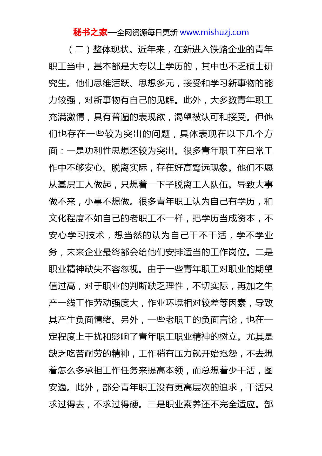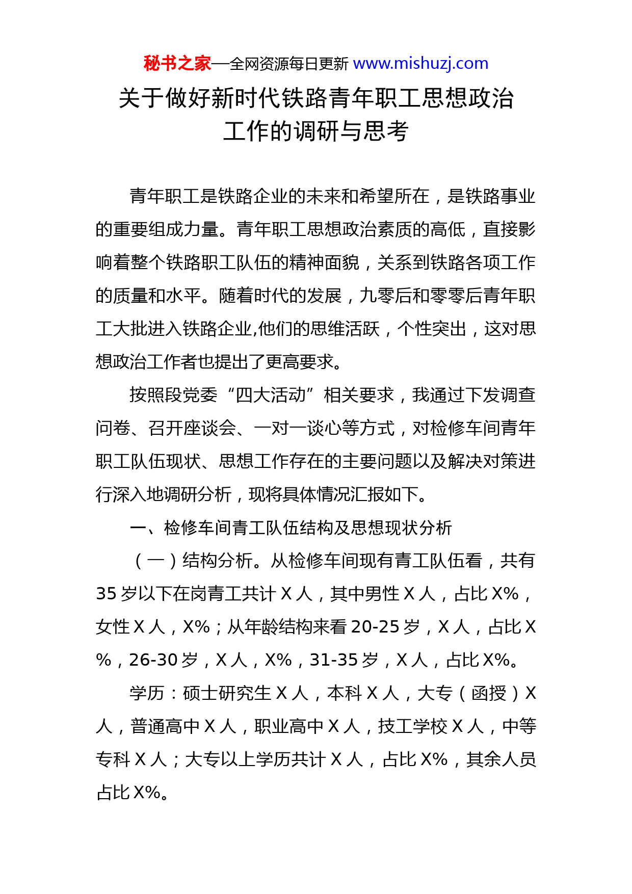 秘书之家—全网资源每日更新www.mishuzj.com关于做好新时代铁路青年职工思想政治工作的调研与思考青年职工是铁路企业的未来和希望所在,是铁路事业的重要组成力量。青年职工思想政治素质的高低,直接影响着整个铁路职工队伍的精神面貌,关系到铁路各项工作的质量和水平。随着时代的发展,九零后和零零后青年职工大批进入铁路企业,他们的思维活跃,个性突出,这对思想政治工作者也提出了更高要求。按照段党委“四大活动”相关要求,我通过下发调查问卷、召开座谈会、一对一谈心等方式,对检修车间青年职工队伍现状、思想工作存在的主要问题以及解决对策进行深入地调研分析,现将具体情况汇报如下。一、检修车间青工队伍结构及思想现状分析(一)结构分析。从检修车间现有青工队伍看,共有35岁以下在岗青工共计X人,其中男性X人,占比X%,女性X人,X%;从年龄结构来看20-25岁,X人,占比X%,26-30岁,X人,X%,31-35岁,X人,占比X%。学历:硕士研究生X人,本科X人,大专(函授)X人,普通高中X人,职业高中X人,技工学校X人,中等专科X人;大专以上学历共计X人,占比X%,其余人员占比X%。秘书之家—全网资源每日更新www.mishuzj.com(二)整体现状。近年来,在新进入铁路企业的青年职工当中,基本都是大专以上学历的,其中也不乏硕士研究生。他们思维活跃、思想多元,接受和学习新事物的能力较强,对新事物有自己的见解。此外,大多数青年职工充满激情,具有普遍的表现欲,渴望被认可和接受。但他们也存在一些较为突出的问题,具体表现在以下几个方面:一是功利性思想还较为突出。很多青年职工在日常工作中不够安心、脱离实际,存在好高骛远现象。他们不愿从基层工人做起,只想着一下子脱离工人队伍。导致大事做不来,小事不想做。很多青年职工认为自己有学历,和文化程度不如自己的老职工不一样,把学历当成资本,不安心学习技术,想当然的认为自己干不干活,学不学业务,未来企业最终都会给他们安排适当的工作岗位。二是职业精神缺失不容忽视。由于一些青年职工对职业的期望值过高,对于职业的判断缺乏理性,不切实际,再加之生产一线工作劳动强度大,作业环境相对较差等因素,导致其产生负面情绪。另外,一些老职工的负面言论,也在一定程度上干扰和影响了青年职工职业精神的树立。尤其是缺乏吃苦耐劳的精神,工作稍有压力就开始抱怨,不去想着怎么多承担工作任务来提高本领,而总想着少干活,图安逸。此外,部分青年职工没有更高层次的追求,干活只求过得去,不求过得硬。三是职业素养还不完全适应。部秘书之家—全网资源每日更新www.mishuzj.com分青工自由散漫、我行我素,不希望被各项管理制度所管束,导致他们的行为规范与企业要求相差甚大,职业素养难以适应企业管理要求。例如,有些青年职工经常存在迟到早退现象,或者没有请假便私自离开单位。有些青年职工职场作业文明化程度低,只想着快速把活干完,但却没有收拾好遗留配件、抹布和把机车部件擦拭干净。此外,还有些青年职工对单位的主流管理理念存在抵触情绪。二、青工思想政治工作存在的问题(一)齐抓共管的局面还没有形成。铁路企业政工干部与行政管理人员相比还比较少,且工作定量和标准正在逐年提高,这使得政工干部无暇去改进和创新思想政治工作方法,更没有太多精力对青年职工思想政治工作方法进行针对性研究。还有部分支部书记属于兼职工作,自身担当着自己的本职生产工作,这就分散了兼职支部书记的党务工作精力。而且,多数兼职支部书记为非政工专业出身,对他们缺乏系统培训,导致其对业务不够熟练,这也在很大程度上限制了思想政治工作的有效实施。此外,在青工的思想政治工作中,没有局外人和旁观者,党政工团各级组织都应担负起各自职责。然而现实中只抓生产、不过问思想工作,“一岗双责”落实不到位,把思想和生产分离开来,在参与上做的不主动等现象,割裂了思想工作与行政工作的有机联系。秘书之家—全网资源每日更新www.mishuzj.com(二)行之有效的方法还比较匮乏。根据现代青工成长环境以及思想特点,部分传统的思想政治工作方法已经很难适应。但实际我们在开展青工思想政治工作中经常是墨守成规,缺乏创新,习惯性运用以往的工作经验。没有把青工思想政治工作同本单位、部门日常实际工作情况结合起来。思想政治工作者往往掌握不好准确的切入点,一人一事的思想政治工作让青工难以找到共鸣。不了解青年职工的惯性思维,不迎合时代特点,对青年职工个人兴趣及心理特点没能很好掌握,与青年职工沟通交流不在一个频道,导致思想政治工作只停留在表面,不能深入青年职工内心,没有起到很好效果。(三)宣教阵地的覆盖还留有空白。开展思想政治工作时“大锅烩”,不考虑青年职工的个性差异,是青工思想工作效果不佳的又一问题。传统的宣传阵地和宣传手段已经完全不适合青工,青工日常更习惯从抖音、快手、知乎等APP上接收信息,而我们的宣传阵地上还没有延伸拓展于此,或者说已经拓展但还尚未完全占领。而且,受编制以及选人用人等条件限制,部分参加工作时间较长的大学生青工仍然在操作技能岗位工作,不同程度挫伤了他们的自信心。此外,只是一味重视青工岗位技能的培养,培训多以业务为主,忽略了青年职工职业道德和思想道德的教育。
