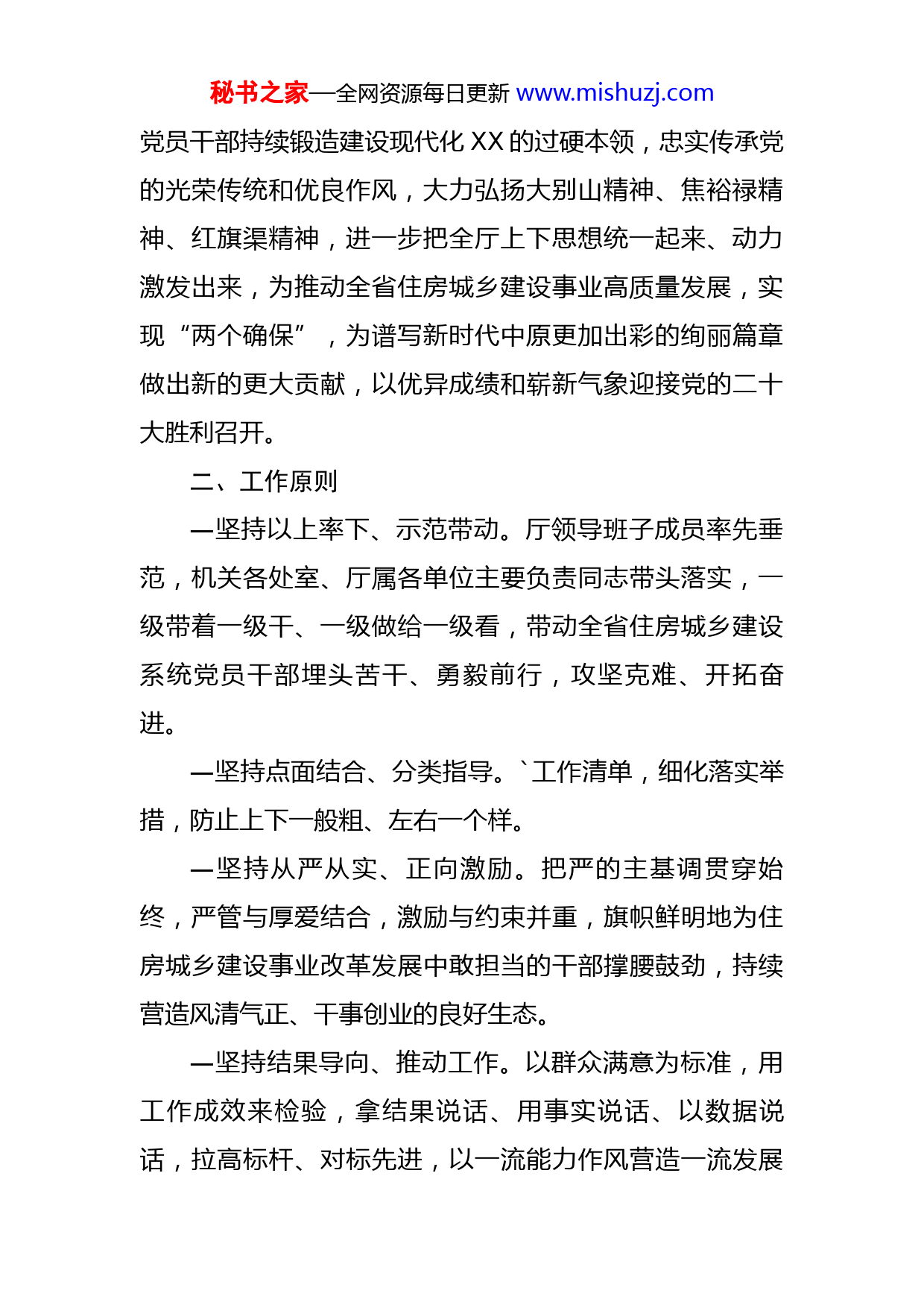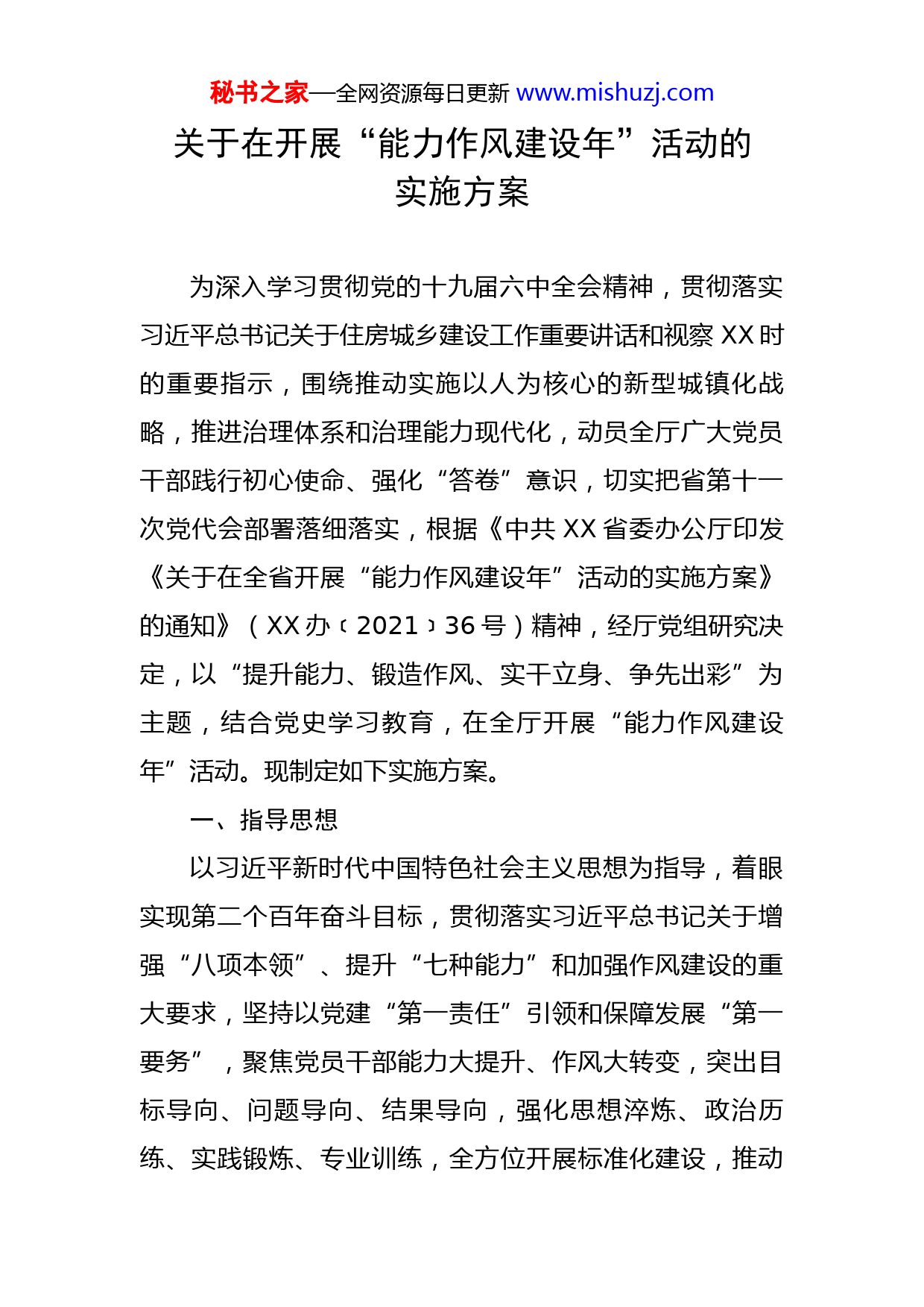 秘书之家—全网资源每日更新www.mishuzj.com关于在开展“能力作风建设年”活动的实施方案为深入学习贯彻党的十九届六中全会精神,贯彻落实习近平总书记关于住房城乡建设工作重要讲话和视察XX时的重要指示,围绕推动实施以人为核心的新型城镇化战略,推进治理体系和治理能力现代化,动员全厅广大党员干部践行初心使命、强化“答卷”意识,切实把省第十一次党代会部署落细落实,根据《中共XX省委办公厅印发《关于在全省开展“能力作风建设年”活动的实施方案》的通知》(XX办﹝202136﹞号)精神,经厅党组研究决定,以“提升能力、锻造作风、实干立身、争先出彩”为主题,结合党史学习教育,在全厅开展“能力作风建设年”活动。现制定如下实施方案。一、指导思想以习近平新时代中国特色社会主义思想为指导,着眼实现第二个百年奋斗目标,贯彻落实习近平总书记关于增强“八项本领”、提升“七种能力”和加强作风建设的重大要求,坚持以党建“第一责任”引领和保障发展“第一要务”,聚焦党员干部能力大提升、作风大转变,突出目标导向、问题导向、结果导向,强化思想淬炼、政治历练、实践锻炼、专业训练,全方位开展标准化建设,推动秘书之家—全网资源每日更新www.mishuzj.com党员干部持续锻造建设现代化XX的过硬本领,忠实传承党的光荣传统和优良作风,大力弘扬大别山精神、焦裕禄精神、红旗渠精神,进一步把全厅上下思想统一起来、动力激发出来,为推动全省住房城乡建设事业高质量发展,实现“两个确保”,为谱写新时代中原更加出彩的绚丽篇章做出新的更大贡献,以优异成绩和崭新气象迎接党的二十大胜利召开。二、工作原则—坚持以上率下、示范带动。厅领导班子成员率先垂范,机关各处室、厅属各单位主要负责同志带头落实,一级带着一级干、一级做给一级看,带动全省住房城乡建设系统党员干部埋头苦干、勇毅前行,攻坚克难、开拓奋进。—坚持点面结合、分类指导。`工作清单,细化落实举措,防止上下一般粗、左右一个样。—坚持从严从实、正向激励。把严的主基调贯穿始终,严管与厚爱结合,激励与约束并重,旗帜鲜明地为住房城乡建设事业改革发展中敢担当的干部撑腰鼓劲,持续营造风清气正、干事创业的良好生态。—坚持结果导向、推动工作。以群众满意为标准,用工作成效来检验,拿结果说话、用事实说话、以数据说话,拉高标杆、对标先进,以一流能力作风营造一流发展秘书之家—全网资源每日更新www.mishuzj.com环境、创造一流工作业绩,确保各项目标任务按时限要求的节点稳步推进、见到实效。三、目标任务实现“五个明显增强”。旗帜鲜明讲政治的能力作风明显增强,大兴学习之风,深刻领会“两个确立”的决定性意义,深入贯彻习近平总书记视察XX重要讲话指示精神,不断提高政治判断力、政治领悟力、政治执行力,切实增强“四个意识”、坚定“四个自信”、做到“两个维护”。联系服务群众的能力作风明显增强,大兴亲民爱民之风,践行以人民为中心的发展思想,走好新时代群众路线,立足住房城乡建设职能定位,解决好群众关切的操心事烦心事揪心事,让群众有更多的获得感幸福感安全感。深入调查研究的能力作风明显增强,大兴调查研究之风,把调查研究作为基本工作方法,吃透情况、把准方向,加强前瞻性布局、全局性谋划,做到脑子里有思路、眼睛里有问题、手上有招数、脚下有路子。防范化解重大风险的能力作风明显增强,大力弘扬斗争精神,强化底线思维,加强本质安全,善于源头防控、过程把控、应急管控,增强党员干部应急处突的知识见识胆识,着力防范化解行业突出风险隐患,守牢安全底线。推进改革创新的能力作风明显增强,大兴务实重行之风,勇于担当、主动作为,善于用改革的办法解决住房城乡建设事业高质量发展中的难秘书之家—全网资源每日更新www.mishuzj.com题,以永不懈怠的精神状态和一往无前的奋斗姿态,在比学赶超中争先进位,在加压奋进中开创新局。四、主要措施坚持“学与干”并重、“查与改”贯通、“治与建”结合,通过对标对表找差距、立足本职提能力、针对问题转作风、树正导向激活力,推动全厅党员干部以过硬能力、优良作风更好担负起住房城乡建设事业创新发展重任。(一)对标对表找差距全面对标对表习近平总书记关于能力作风建设的重要论述,发扬刀刃向内的自我革命精神,把自己摆进去、把职责摆进去、把工作摆进去,聚焦“四个对照”“四个围绕”,通过自己找、领导点、同志提等形式,系统梳理能力作风方面存在的主要问题,查摆不足,剖析根源。对照习近平新时代中国特色社会主义思想和党中央决策部署,以及习近平总书记视察XX重要讲话重要指示,对照习近平总书记关于增强“八项本领”、提升“七种能力”和加强作风建设的重大要求,对照实现“两个确保”、实施“十大战略”需要,对照先进典型、身边榜样、行业标杆。重点围绕贯彻落实习近平总书记重要指示批示精神和党中央决策部署是否坚决、及时、到位,围绕贯彻中央八项规定及其实施细则精神是否坚定、主动、彻底,围绕推动省委秘书之家—全网资源每日更新www.mishuzj.com省政府重要部署和中心工作落实落地是否有力、有为、有效,围绕在本职工作岗位上是否尽职、尽责、尽心等,检视党员干部