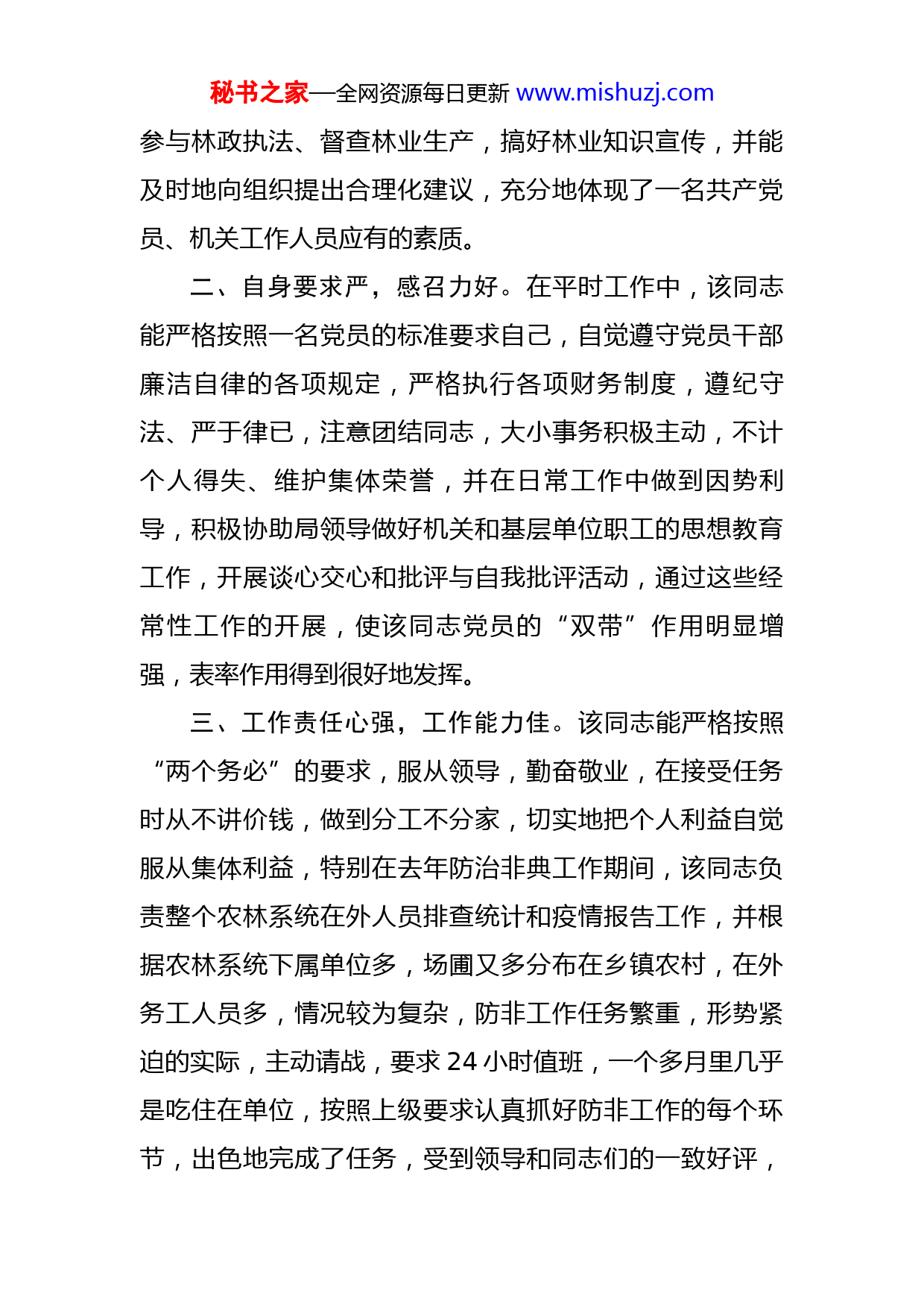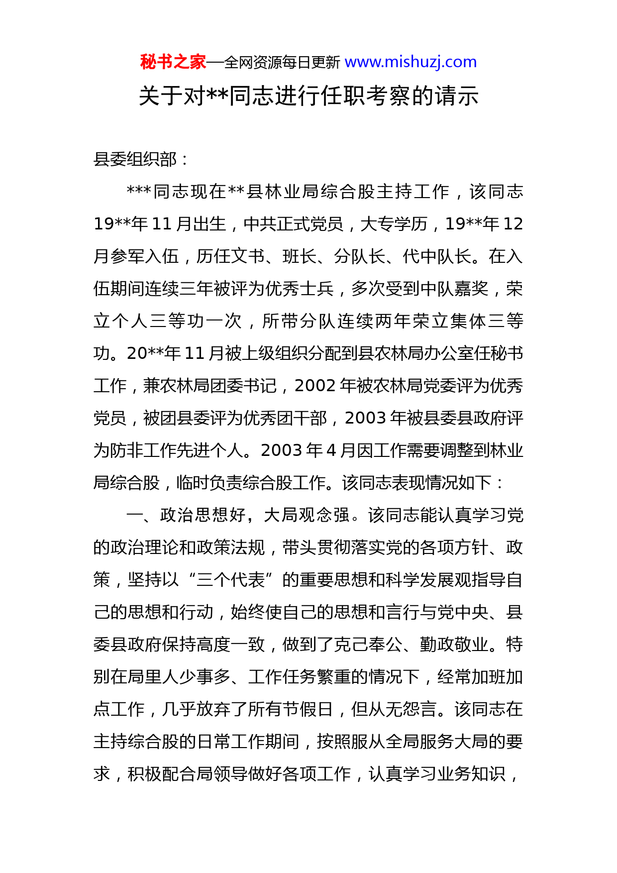 秘书之家—全网资源每日更新www.mishuzj.com关于对同志进行任职考察的请示县委组织部:同志现在县林业局综合股主持工作,该同志19年11月出生,中共正式党员,大专学历,19年12月参军入伍,历任文书、班长、分队长、代中队长。在入伍期间连续三年被评为优秀士兵,多次受到中队嘉奖,荣立个人三等功一次,所带分队连续两年荣立集体三等功。20年11月被上级组织分配到县农林局办公室任秘书工作,兼农林局团委书记,2002年被农林局党委评为优秀党员,被团县委评为优秀团干部,2003年被县委县政府评为防非工作先进个人。2003年4月因工作需要调整到林业局综合股,临时负责综合股工作。该同志表现情况如下:一、政治思想好,大局观念强。该同志能认真学习党的政治理论和政策法规,带头贯彻落实党的各项方针、政策,坚持以“三个代表”的重要思想和科学发展观指导自己的思想和行动,始终使自己的思想和言行与党中央、县委县政府保持高度一致,做到了克己奉公、勤政敬业。特别在局里人少事多、工作任务繁重的情况下,经常加班加点工作,几乎放弃了所有节假日,但从无怨言。该同志在主持综合股的日常工作期间,按照服从全局服务大局的要求,积极配合局领导做好各项工作,认真学习业务知识,秘书之家—全网资源每日更新www.mishuzj.com参与林政执法、督查林业生产,搞好林业知识宣传,并能及时地向组织提出合理化建议,充分地体现了一名共产党员、机关工作人员应有的素质。二、自身要求严,感召力好。在平时工作中,该同志能严格按照一名党员的标准要求自己,自觉遵守党员干部廉洁自律的各项规定,严格执行各项财务制度,遵纪守法、严于律已,注意团结同志,大小事务积极主动,不计个人得失、维护集体荣誉,并在日常工作中做到因势利导,积极协助局领导做好机关和基层单位职工的思想教育工作,开展谈心交心和批评与自我批评活动,通过这些经常性工作的开展,使该同志党员的“双带”作用明显增强,表率作用得到很好地发挥。三、工作责任心强,工作能力佳。该同志能严格按照“两个务必”的要求,服从领导,勤奋敬业,在接受任务时从不讲价钱,做到分工不分家,切实地把个人利益自觉服从集体利益,特别在去年防治非典工作期间,该同志负责整个农林系统在外人员排查统计和疫情报告工作,并根据农林系统下属单位多,场圃又多分布在乡镇农村,在外务工人员多,情况较为复杂,防非工作任务繁重,形势紧迫的实际,主动请战,要求24小时值班,一个多月里几乎是吃住在单位,按照上级要求认真抓好防非工作的每个环节,出色地完成了任务,受到领导和同志们的一致好评,秘书之家—全网资源每日更新www.mishuzj.com并被县委县政府评为防非典先进个人。该同志在负责综合股工作期间,还积极协助局领导做好财务管理工作,严格把关,把有限的经费用在刀刃上,杜绝各项不合理开支,体现了该同志强烈的工作热情和良好的管理能力。通过多年来组织的精心培养和个人严格的锻炼,该同志已具备胜任办公室工作的条件和能力,因此,我们郑重地向县委组织部推荐同志,敬请县委组织部考察任用。特此请示县林业局