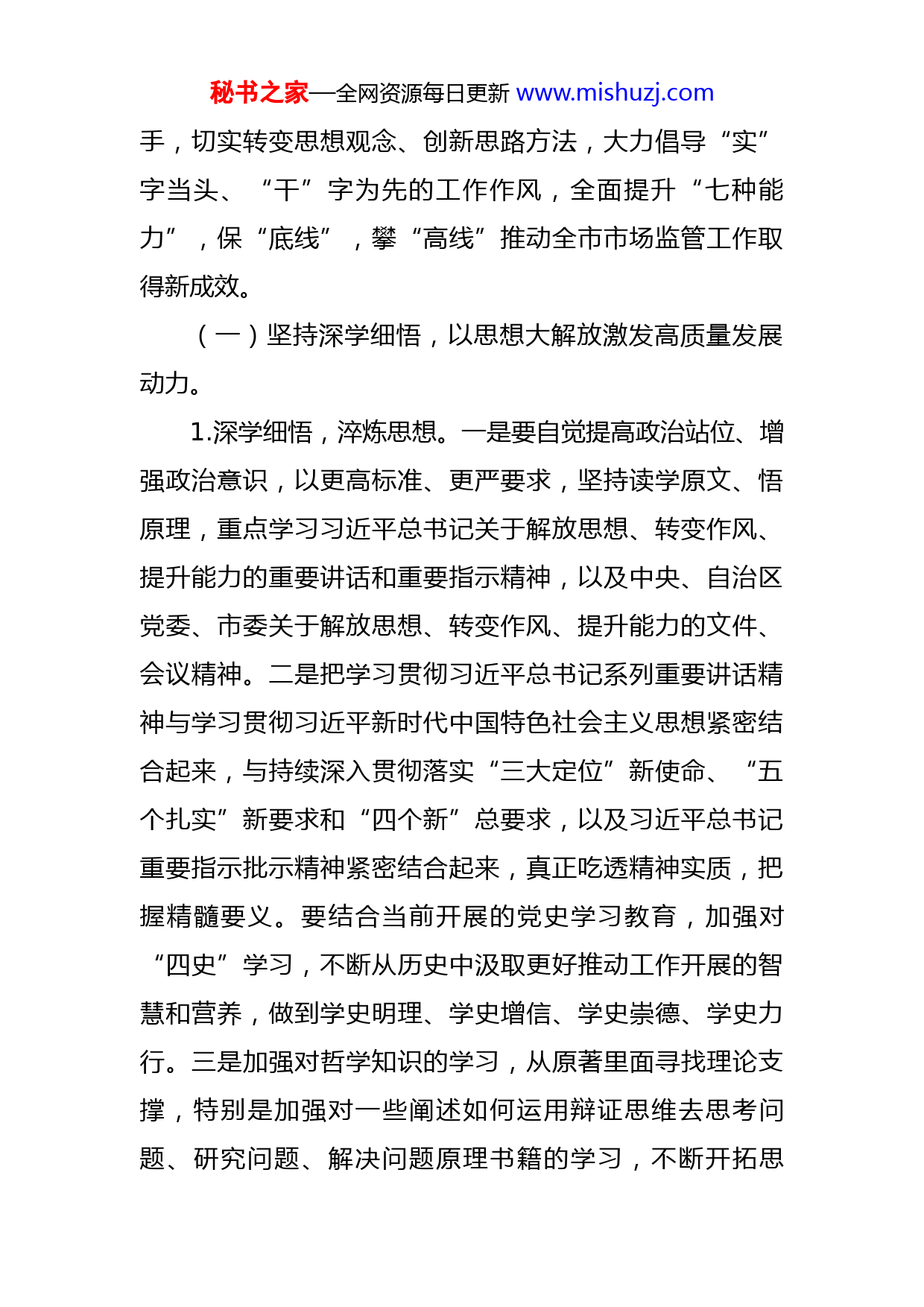 秘书之家—全网资源每日更新www.mishuzj.com关于开展“解放思想、转变作风、提升能力”专项行动实施方案为全面落实市第XX次党代会明确的今后五年奋斗目标和主要任务,教育引导全局广大干部职工进一步解放思想、开拓创新、转变观念、扩大开放、真抓实干,结合我局实际,特制定本实施方案。一、指导思想坚持以习近平新时代中国特色社会主义思想为指导,深入学习习近平总书记重要指示精神,认真贯彻自治区党委XX届XX次全体(扩大)会议精神和市第XX次党代会精神,紧紧围绕建设高标准市场体系这一中心任务,深入开展“解放思想、转变作风、提升能力”专项行动,确保市委各项决策部署落地见效。通过专项行动的开展,教育和引导广大干部职工增强“四个意识”、坚定“四个自信”、做到“两个维护”,牢记“国之大者”,促使广大干部职工担当实干,敢于突破,勇于创新,切实转变工作作风,着力提升能力素质,为高效推进市场监管事业高质量发展提供坚强的思想、作风和能力保障。二、目标任务思想“闸门”不紧,行为做派就会“漏风”。全局干部要以“解放思想、转变作风、提升能力”专项行动为抓秘书之家—全网资源每日更新www.mishuzj.com手,切实转变思想观念、创新思路方法,大力倡导“实”字当头、“干”字为先的工作作风,全面提升“七种能力”,保“底线”,攀“高线”推动全市市场监管工作取得新成效。(一)坚持深学细悟,以思想大解放激发高质量发展动力。1.深学细悟,淬炼思想。一是要自觉提高政治站位、增强政治意识,以更高标准、更严要求,坚持读学原文、悟原理,重点学习习近平总书记关于解放思想、转变作风、提升能力的重要讲话和重要指示精神,以及中央、自治区党委、市委关于解放思想、转变作风、提升能力的文件、会议精神。二是把学习贯彻习近平总书记系列重要讲话精神与学习贯彻习近平新时代中国特色社会主义思想紧密结合起来,与持续深入贯彻落实“三大定位”新使命、“五个扎实”新要求和“四个新”总要求,以及习近平总书记重要指示批示精神紧密结合起来,真正吃透精神实质,把握精髓要义。要结合当前开展的党史学习教育,加强对“四史”学习,不断从历史中汲取更好推动工作开展的智慧和营养,做到学史明理、学史增信、学史崇德、学史力行。三是加强对哲学知识的学习,从原著里面寻找理论支撑,特别是加强对一些阐述如何运用辩证思维去思考问题、研究问题、解决问题原理书籍的学习,不断开拓思秘书之家—全网资源每日更新www.mishuzj.com路,掌握抓落实的方法论。加强对专业知识的学习。要结合自身本职工作,采取自主学习和“走出去”学习的方式,多学习专业知识。在局机关推行“科长讲堂”,每月由各科长轮流走上讲台,带领全局干部学习法律知识和业务技能。在加强自主学习基础上,多到先进地区学习先进理念和方式方法。每名党员、干部在20XX年XX月底前撰写1篇有深度的学习心得体会。2.深入实际,笃行实干。坚决破除等待观望、静靠支持,当“甩手掌柜”、“抢抓机遇能力差”等思想顽疾。聚焦市场监管中心工作,在全局大兴调查研究之风,坚持从实际出发和坚持问题导向,树立以一域服务全局意识,形成一批高质量调研成果。主动对接,不等不靠。强化协调外联,对接跑办能力建设,带着问题主动向自治区市场监管局征求好思路、好办法,寻找政策的突破口和扶持措施,发现机遇、抢抓平台、推动发展,形成推动我市市场监管工作高质量发展的良策。局每年至少向自治区市场监管局专题汇报2次。深入一线,凝聚共识。要深入基层、企业、商贸市场一线,听真话、察真情,真研究问题、研究真问题。领导干部每年深入基层调研不少于60天,每名班子领导成员要精心设计、深入思考,组织开展一次有深度、接地气的调研活动。要紧扣自身和分管区域在思想、作风、能力三个方面存在的突出问题,坚持问题导向、目秘书之家—全网资源每日更新www.mishuzj.com标导向,不能走马观花、蜻蜓点水,真正找到找准找实存在的突出问题。全局在解放思想、转变作风、提升能力三个方面各找准XX-XX个突出问题,总计XX-XX个。每名班子领导成员在20XX年XX月前撰写1篇高质量的调研报告,对于专题调研中找准的问题要认真分析、查找原因,分别从思想、作风、能力三个方面进行剖析,制定出符合实际、符合群众心声的解决办法,定好解决问题的目标任务、具体措施、完成时限、牵头单位、责任单位,并实行清单化、项目化管理。解决问题的措施办法要路径清晰,具有可操作性并可督查评估,原则上半年内要有实际成效。根据工作实际,整改时限可分短期(半年至一年)、中期(2年内)或长期(3年及3年以上)。局专项行动领导小组办公室将全局解决问题的实际成效、成果以表格化、清单化形式报市委专项行动领导小组办公室,实行每月一报告制度。3.不甘落后,力争上游。坚决破除干事缺乏精气神,躺在“功劳簿”上歇歇脚、吃老本,小富即安、小得即满、小进即止、沉醉在“过去排行榜”等思想顽疾。领导干部特别是局班子领导成员要以上率下,带领干部迎接挑战、克难攻坚,爬坡过坎、赶超跨越,永不满足、永不止步。助力全产业链优化升级再加力。紧扣我市经济社会发展存在的主要问题,聚焦绿色制造业体系,立足市场监管职