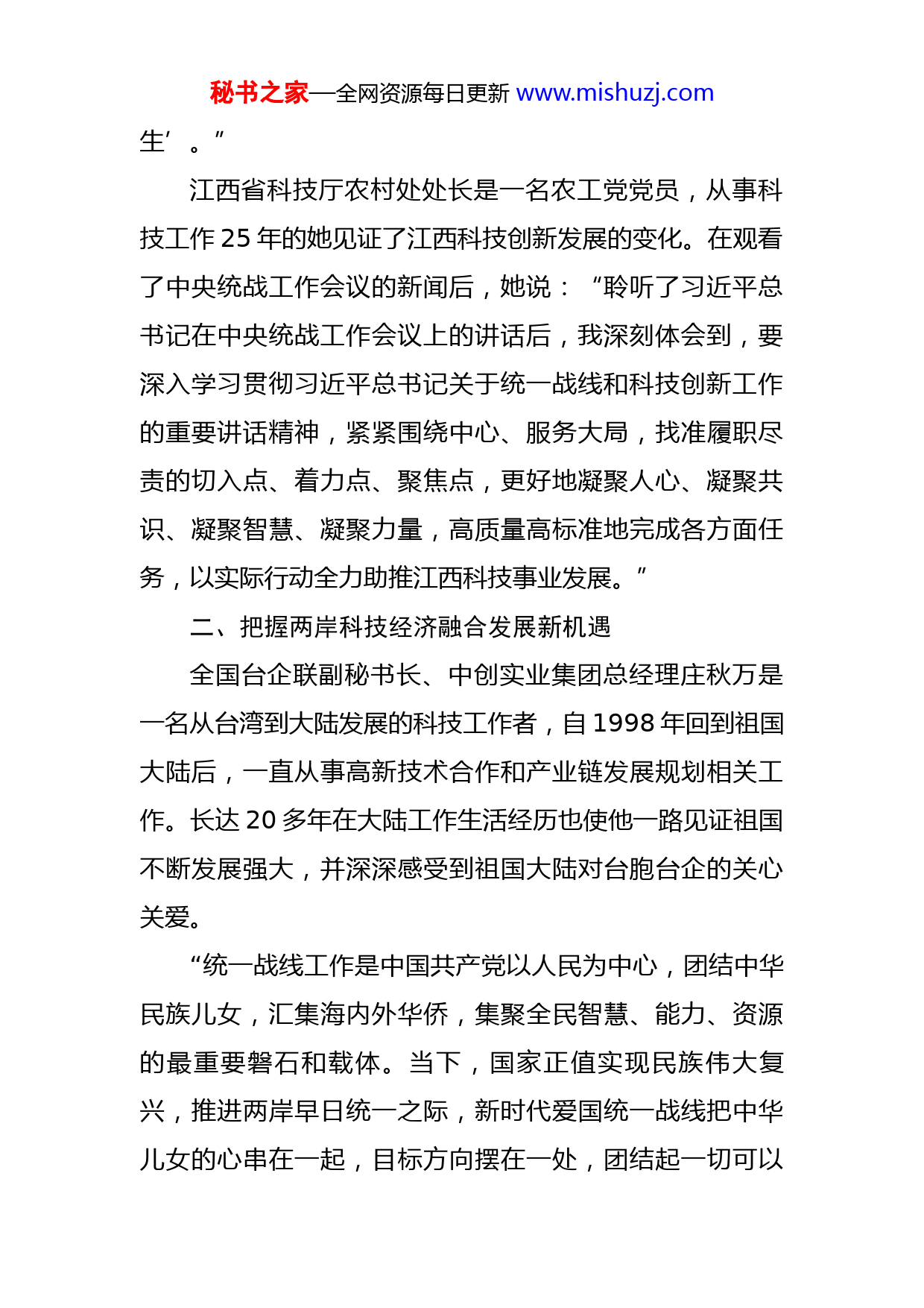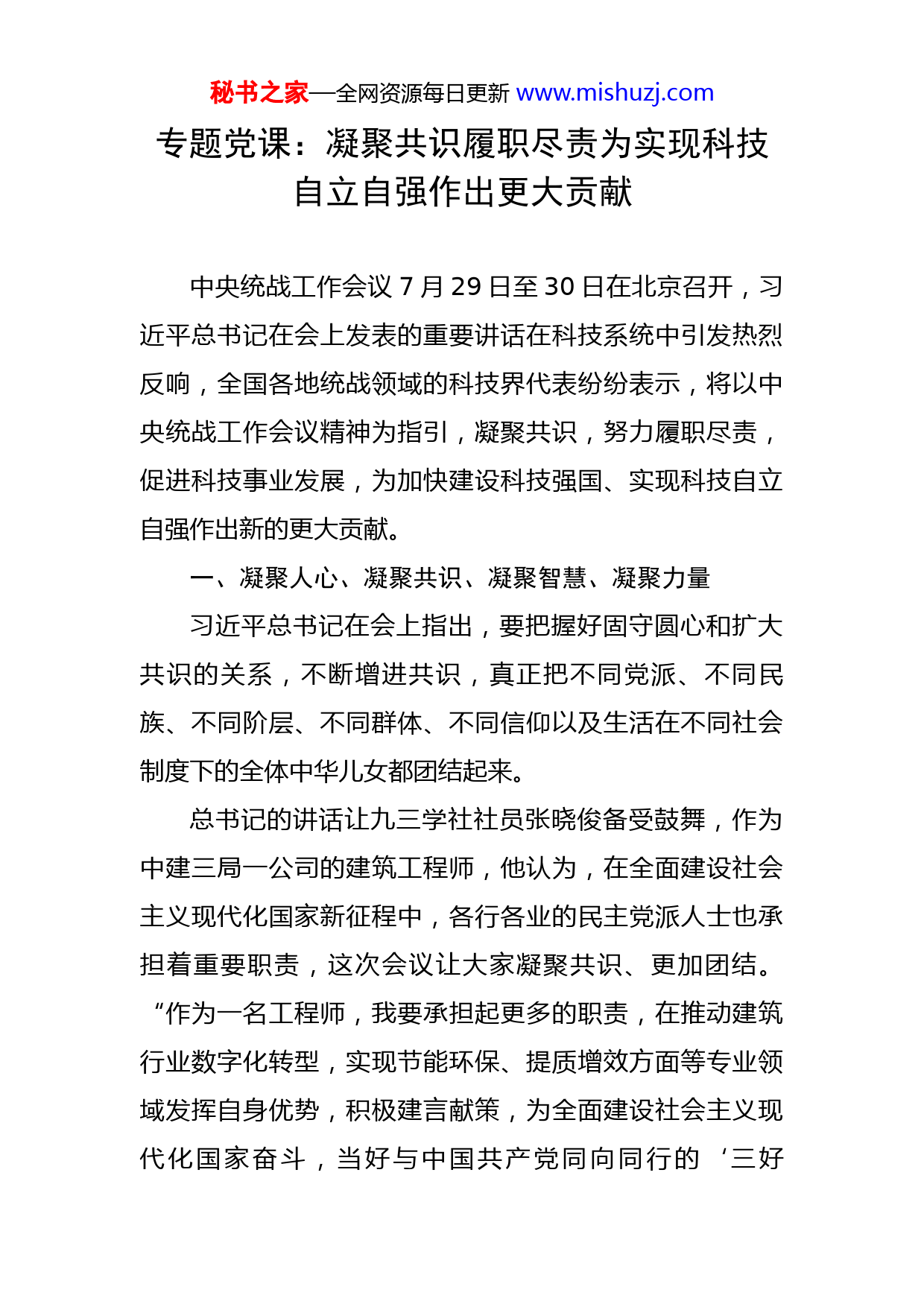 秘书之家—全网资源每日更新www.mishuzj.com专题党课:凝聚共识履职尽责为实现科技自立自强作出更大贡献中央统战工作会议7月29日至30日在北京召开,习近平总书记在会上发表的重要讲话在科技系统中引发热烈反响,全国各地统战领域的科技界代表纷纷表示,将以中央统战工作会议精神为指引,凝聚共识,努力履职尽责,促进科技事业发展,为加快建设科技强国、实现科技自立自强作出新的更大贡献。一、凝聚人心、凝聚共识、凝聚智慧、凝聚力量习近平总书记在会上指出,要把握好固守圆心和扩大共识的关系,不断增进共识,真正把不同党派、不同民族、不同阶层、不同群体、不同信仰以及生活在不同社会制度下的全体中华儿女都团结起来。总书记的讲话让九三学社社员张晓俊备受鼓舞,作为中建三局一公司的建筑工程师,他认为,在全面建设社会主义现代化国家新征程中,各行各业的民主党派人士也承担着重要职责,这次会议让大家凝聚共识、更加团结。“作为一名工程师,我要承担起更多的职责,在推动建筑行业数字化转型,实现节能环保、提质增效方面等专业领域发挥自身优势,积极建言献策,为全面建设社会主义现代化国家奋斗,当好与中国共产党同向同行的‘三好秘书之家—全网资源每日更新www.mishuzj.com生’。”江西省科技厅农村处处长是一名农工党党员,从事科技工作25年的她见证了江西科技创新发展的变化。在观看了中央统战工作会议的新闻后,她说:“聆听了习近平总书记在中央统战工作会议上的讲话后,我深刻体会到,要深入学习贯彻习近平总书记关于统一战线和科技创新工作的重要讲话精神,紧紧围绕中心、服务大局,找准履职尽责的切入点、着力点、聚焦点,更好地凝聚人心、凝聚共识、凝聚智慧、凝聚力量,高质量高标准地完成各方面任务,以实际行动全力助推江西科技事业发展。”二、把握两岸科技经济融合发展新机遇全国台企联副秘书长、中创实业集团总经理庄秋万是一名从台湾到大陆发展的科技工作者,自1998年回到祖国大陆后,一直从事高新技术合作和产业链发展规划相关工作。长达20多年在大陆工作生活经历也使他一路见证祖国不断发展强大,并深深感受到祖国大陆对台胞台企的关心关爱。“统一战线工作是中国共产党以人民为中心,团结中华民族儿女,汇集海内外华侨,集聚全民智慧、能力、资源的最重要磐石和载体。当下,国家正值实现民族伟大复兴,推进两岸早日统一之际,新时代爱国统一战线把中华儿女的心串在一起,目标方向摆在一处,团结起一切可以秘书之家—全网资源每日更新www.mishuzj.com团结的力量为中华民族伟大复兴奋斗,为中国梦书写美好的诗篇。”庄秋万说,近年来,大陆持续出台一系列惠台利民政策措施,不断完善与大陆居民享受同等待遇的制度政策,为台胞融入大陆经济社会发展进程,实现融合发展与共同发展提供政策保障,期待两岸科技工作者能把握两岸科技经济融合发展新机遇,催生更多的新技术、新产业。三、个人与国家民族前途命运紧密相连习近平总书记强调,要加强党外知识分子和新的社会阶层人士统战工作,以凝聚共识为根本,以爱国奋斗为目的,鼓励支持他们立足本职建功立业,积极投身改革创新一线,施展才华和抱负。对此,江苏省党外知识分子联谊会副会长、东南大学吴健雄学院执行院长游雨蒙表示:“总书记为我们开展人才培养工作举旗定向,爱国应该是科研工作者不变的底色。”“我鼓励学生们开拓国际视野,也希望他们将个人的发展与国家和民族的前途命运紧密相连。”游雨蒙表示,“当今世界处于百年未有之大变局,作为高校的科研工作者,我会在做好材料化学研究的同时,探索新型教育理念和人才培养模式,通过学科交叉融合、导师引导、产学研结合等形式,为国育才。”九三学社北京市委常委、通州区工委主委,北京节能环保中心能源评估部部长柳晓雷表示,中央统战工作会秘书之家—全网资源每日更新www.mishuzj.com议,是在我国开启全面建设社会主义现代化国家新征程,全国人民以实际行动迎接党的二十大的重要时刻召开的一次重要会议。作为一名九三学社社员和北京城市副中心的统战成员,感到十分振奋。副中心的孕育、诞生、成长和生机勃发,是习近平总书记亲自谋划、亲自部署、亲自推动的结果。副中心的统战成员,将认真学习贯彻会议精神,在本职工作和统战工作中,双岗建功,为新时代首都发展和统一战线事业作出更大贡献。