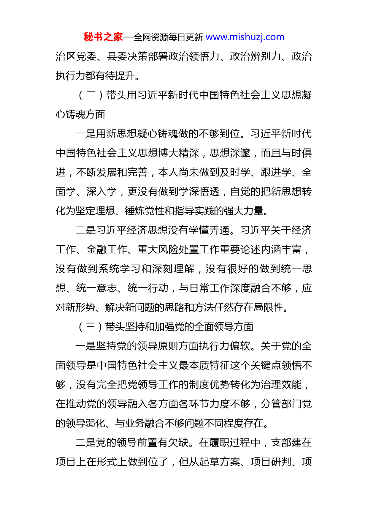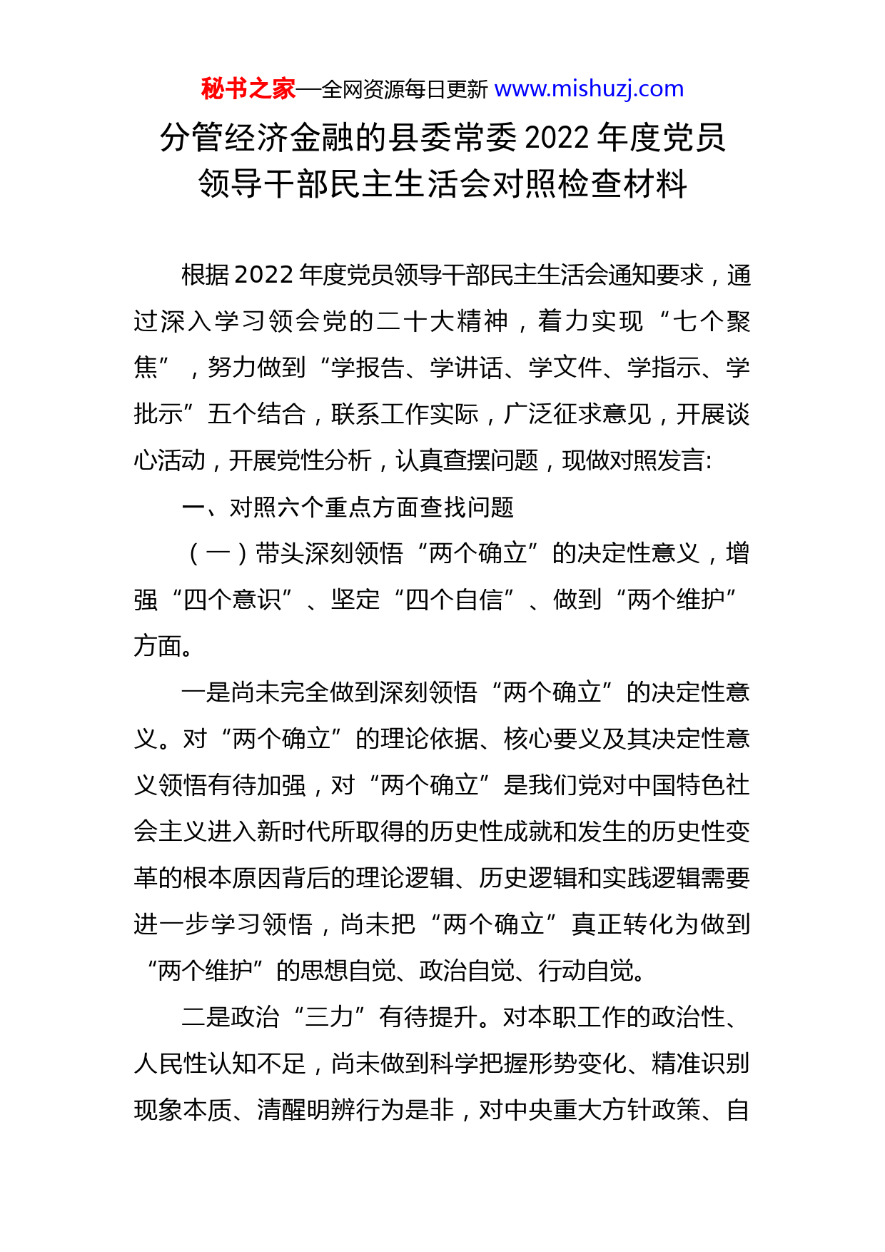 秘书之家—全网资源每日更新www.mishuzj.com分管经济金融的县委常委2022年度党员领导干部民主生活会对照检查材料根据2022年度党员领导干部民主生活会通知要求,通过深入学习领会党的二十大精神,着力实现“七个聚焦”,努力做到“学报告、学讲话、学文件、学指示、学批示”五个结合,联系工作实际,广泛征求意见,开展谈心活动,开展党性分析,认真查摆问题,现做对照发言:一、对照六个重点方面查找问题(一)带头深刻领悟“两个确立”的决定性意义,增强“四个意识”、坚定“四个自信”、做到“两个维护”方面。一是尚未完全做到深刻领悟“两个确立”的决定性意义。对“两个确立”的理论依据、核心要义及其决定性意义领悟有待加强,对“两个确立”是我们党对中国特色社会主义进入新时代所取得的历史性成就和发生的历史性变革的根本原因背后的理论逻辑、历史逻辑和实践逻辑需要进一步学习领悟,尚未把“两个确立”真正转化为做到“两个维护”的思想自觉、政治自觉、行动自觉。二是政治“三力”有待提升。对本职工作的政治性、人民性认知不足,尚未做到科学把握形势变化、精准识别现象本质、清醒明辨行为是非,对中央重大方针政策、自秘书之家—全网资源每日更新www.mishuzj.com治区党委、县委决策部署政治领悟力、政治辨别力、政治执行力都有待提升。(二)带头用习近平新时代中国特色社会主义思想凝心铸魂方面一是用新思想凝心铸魂做的不够到位。习近平新时代中国特色社会主义思想博大精深,思想深邃,而且与时俱进,不断发展和完善,本人尚未做到及时学、跟进学、全面学、深入学,更没有做到学深悟透,自觉的把新思想转化为坚定理想、锤炼党性和指导实践的强大力量。二是习近平经济思想没有学懂弄通。习近平关于经济工作、金融工作、重大风险处置工作重要论述内涵丰富,没有做到系统学习和深刻理解,没有很好的做到统一思想、统一意志、统一行动,与日常工作深度融合不够,应对新形势、解决新问题的思路和方法任然存在局限性。(三)带头坚持和加强党的全面领导方面一是坚持党的领导原则方面执行力偏软。关于党的全面领导是中国特色社会主义最本质特征这个关键点领悟不够,没有完全把党领导工作的制度优势转化为治理效能,在推动党的领导融入各方面各环节力度不够,分管部门党的领导弱化、与业务融合不够问题不同程度存在。二是党的领导前置有欠缺。在履职过程中,支部建在项目上在形式上做到位了,但从起草方案、项目研判、项秘书之家—全网资源每日更新www.mishuzj.com目建设等重要环节还是沿用习惯的行政行为,支部和党员先锋模范作用没有充分发挥。三是落实总书记对本地区的重要指示批示精神不到位。习近平总书记交给内蒙古五大任务,对五大任务内容、目标、质量要求不清晰,没有结合监管职责、本地实际认领到位,对市委提出的“一核三体两翼”核心要义理解的不深不透。(四)带头坚持以人民为中心的发展思想,推动改革发展稳定方面一是缺乏真挚朴实的为民情怀。调研走访课时不够,深入底层深入一线不多,对群众意愿、诉求了解偏少,办实事解难题停留在一般层面。二是推动普惠金融政策落地缺乏力度。党和国家出台了一系列普惠金融政策,但是在我们地区落地难、见效慢问题突出。全区营商环境评估打分通辽市“融资服务项目”排列靠后,融资总量不足,融资结构不合理,金融产品适配性错位,企业融资难、信用贷款占比低等问题突出。三是消费者权益保护工作有短板。部分机构消保工作体制机制不健全,消费者权益保护工作委员会作用发挥不充分,内设部门之间职责不清、配合不够、衔接脱节,消费者权益保护工作运行不流畅。秘书之家—全网资源每日更新www.mishuzj.com(五)带头发扬斗争精神,防范化解风险挑战方面一是缺乏斗争精神,高风险机构处置化解力度不够。辖内有两家法人银行为高风险机构,高风险成因复杂,历史遗留问题较多,隐患大、整治难。面对这些问题和困难自己产生了畏难思想,厌战情绪,缺乏必胜信心和斗争精神。二是缺乏斗争本领,处置风方法、手段和技术单一滞后。对经济金融风险缺乏前瞻性预警,缺乏评估计量手段,缺乏风险处置高招实招。对一些重大问题和重点工作思考带有片面性、局限性;对分管领域的业务运营、内部控制、风险管理只掌握基本数据和情况,缺乏深度分析和研判。(六)带头落实全面从严治党政治责任方面一是“一岗双责”压的不够实。作为党委委员抓分管部门业务时间、精力投入多,抓党建投入少,尚未做到同布置、同落实、同发力,从严这根弦还没有完全绷紧,严以律己、严管所辖都欠火候。二是对新时代新形势下抓意识形态、宣传思想工作缺少有效的方法、手段。对分管领域干部思想动态、意识形态分析研判不够精准,没有做到有的放矢推动宣传思想工作和意识形态工作。三是对新形势下“四风”问题的隐形变异表现把握还秘书之家—全网资源每日更新www.mishuzj.com不精准,形式主义、官僚主义还不同程度存在,召开各类会议多,到基层调研少;安排布置多,靠前指挥少。四是落实权力监督制约机制不到位。督导分管部门党风廉政建设停留在一些规定动作上,更多以会议布置、宣讲告知、警示教育为主,没有深入研究廉政风险隐患