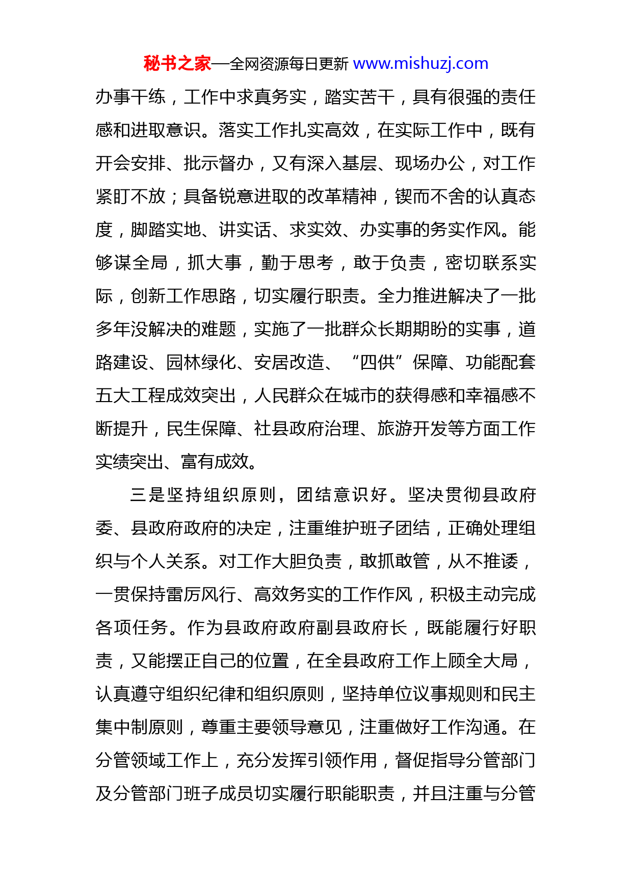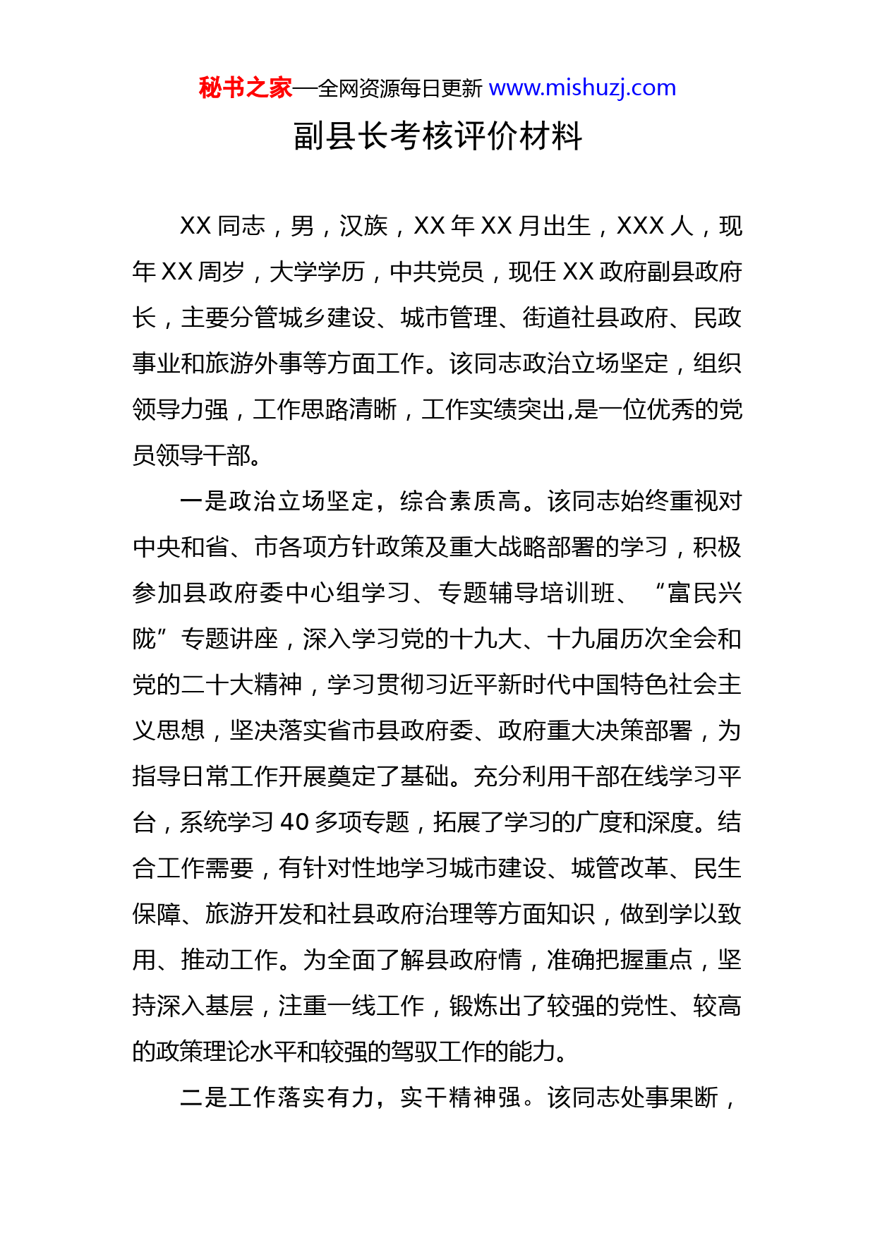 秘书之家—全网资源每日更新www.mishuzj.com副县长考核评价材料XX同志,男,汉族,XX年XX月出生,XXX人,现年XX周岁,大学学历,中共党员,现任XX政府副县政府长,主要分管城乡建设、城市管理、街道社县政府、民政事业和旅游外事等方面工作。该同志政治立场坚定,组织领导力强,工作思路清晰,工作实绩突出,是一位优秀的党员领导干部。一是政治立场坚定,综合素质高。该同志始终重视对中央和省、市各项方针政策及重大战略部署的学习,积极参加县政府委中心组学习、专题辅导培训班、“富民兴陇”专题讲座,深入学习党的十九大、十九届历次全会和党的二十大精神,学习贯彻习近平新时代中国特色社会主义思想,坚决落实省市县政府委、政府重大决策部署,为指导日常工作开展奠定了基础。充分利用干部在线学习平台,系统学习40多项专题,拓展了学习的广度和深度。结合工作需要,有针对性地学习城市建设、城管改革、民生保障、旅游开发和社县政府治理等方面知识,做到学以致用、推动工作。为全面了解县政府情,准确把握重点,坚持深入基层,注重一线工作,锻炼出了较强的党性、较高的政策理论水平和较强的驾驭工作的能力。二是工作落实有力,实干精神强。该同志处事果断,秘书之家—全网资源每日更新www.mishuzj.com办事干练,工作中求真务实,踏实苦干,具有很强的责任感和进取意识。落实工作扎实高效,在实际工作中,既有开会安排、批示督办,又有深入基层、现场办公,对工作紧盯不放;具备锐意进取的改革精神,锲而不舍的认真态度,脚踏实地、讲实话、求实效、办实事的务实作风。能够谋全局,抓大事,勤于思考,敢于负责,密切联系实际,创新工作思路,切实履行职责。全力推进解决了一批多年没解决的难题,实施了一批群众长期期盼的实事,道路建设、园林绿化、安居改造、“四供”保障、功能配套五大工程成效突出,人民群众在城市的获得感和幸福感不断提升,民生保障、社县政府治理、旅游开发等方面工作实绩突出、富有成效。三是坚持组织原则,团结意识好。坚决贯彻县政府委、县政府政府的决定,注重维护班子团结,正确处理组织与个人关系。对工作大胆负责,敢抓敢管,从不推诿,一贯保持雷厉风行、高效务实的工作作风,积极主动完成各项任务。作为县政府政府副县政府长,既能履行好职责,又能摆正自己的位置,在全县政府工作上顾全大局,认真遵守组织纪律和组织原则,坚持单位议事规则和民主集中制原则,尊重主要领导意见,注重做好工作沟通。在分管领域工作上,充分发挥引领作用,督促指导分管部门及分管部门班子成员切实履行职能职责,并且注重与分管秘书之家—全网资源每日更新www.mishuzj.com部门领导干部的工作交流,力求决策民主化、科学化,共同推动工作落实。四是注重廉洁从政,个人作风实。该同志坚持把依法行政作为基本要求,把廉洁从政作为根本准则,严格按法定权限行使权力、履行职责,认真落实全面从严治党“一岗双责”,做到了率先垂范、以身作则,始终把纪律和规矩挺在前面。通过廉政约谈、工作约谈、“三述”等形式,狠抓分管领域党风廉政建设,教育分管部门领导干部筑牢防线、守住底线、不越红线,形成了风清气正的良好氛围。严格遵守中央八项规定、省市“双十条”规定,坚持用制度管权、靠制度管人、按制度办事,同时,严格要求自己、亲属和身边工作人员,注重强化工作和生活作风,切实做到了廉洁从政。