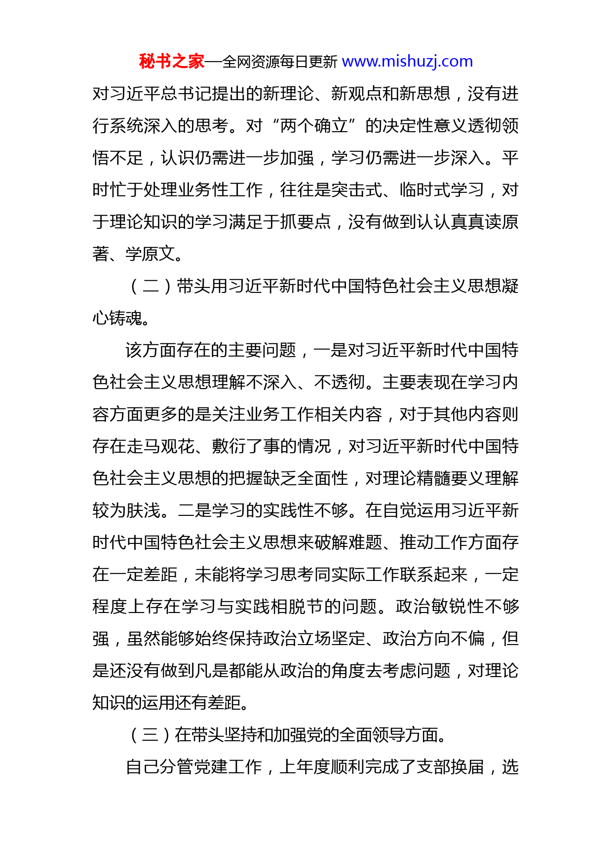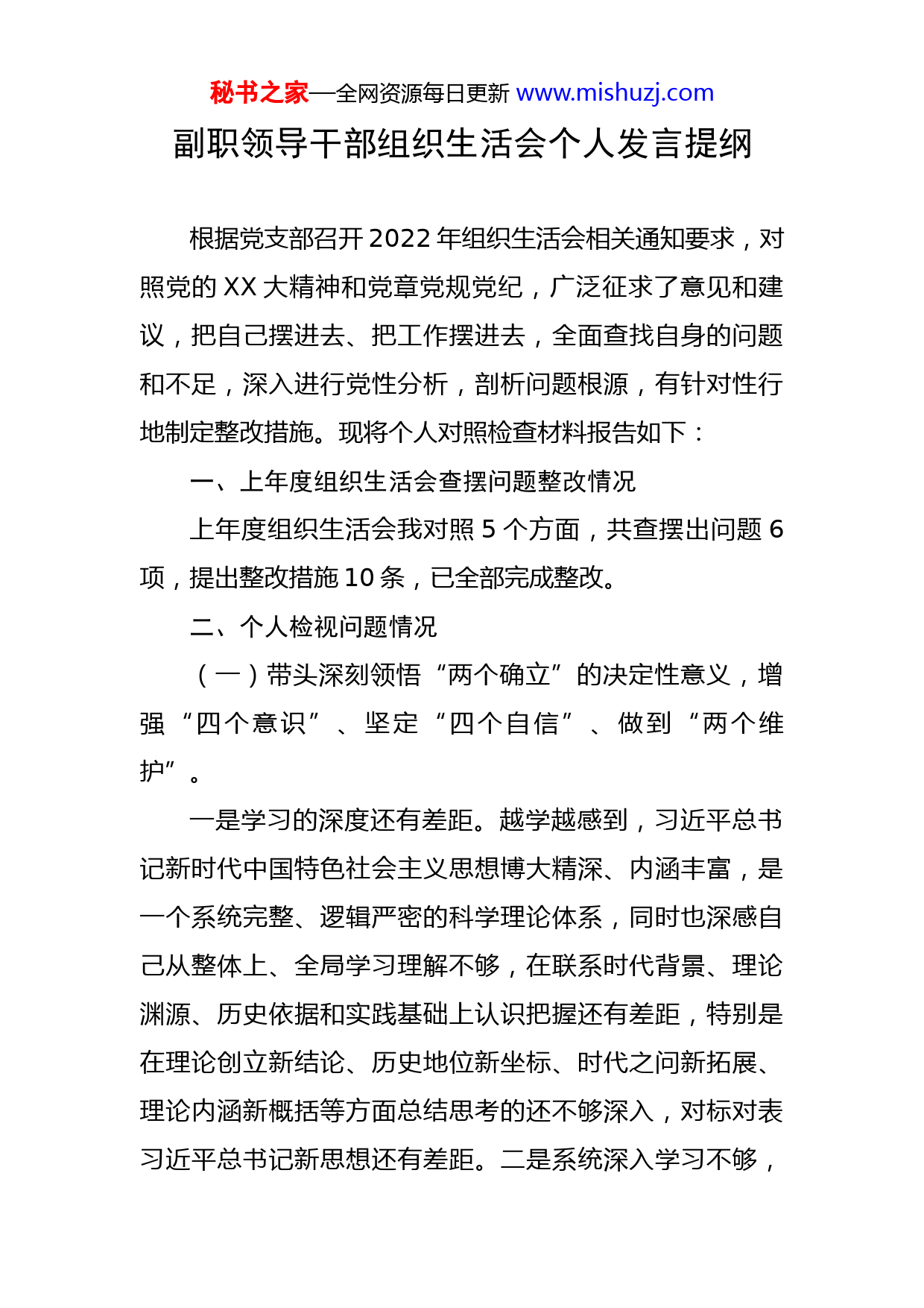 秘书之家—全网资源每日更新www.mishuzj.com副职领导干部组织生活会个人发言提纲根据党支部召开2022年组织生活会相关通知要求,对照党的XX大精神和党章党规党纪,广泛征求了意见和建议,把自己摆进去、把工作摆进去,全面查找自身的问题和不足,深入进行党性分析,剖析问题根源,有针对性行地制定整改措施。现将个人对照检查材料报告如下:一、上年度组织生活会查摆问题整改情况上年度组织生活会我对照5个方面,共查摆出问题6项,提出整改措施10条,已全部完成整改。二、个人检视问题情况(一)带头深刻领悟“两个确立”的决定性意义,增强“四个意识”、坚定“四个自信”、做到“两个维护”。一是学习的深度还有差距。越学越感到,习近平总书记新时代中国特色社会主义思想博大精深、内涵丰富,是一个系统完整、逻辑严密的科学理论体系,同时也深感自己从整体上、全局学习理解不够,在联系时代背景、理论渊源、历史依据和实践基础上认识把握还有差距,特别是在理论创立新结论、历史地位新坐标、时代之问新拓展、理论内涵新概括等方面总结思考的还不够深入,对标对表习近平总书记新思想还有差距。二是系统深入学习不够,秘书之家—全网资源每日更新www.mishuzj.com对习近平总书记提出的新理论、新观点和新思想,没有进行系统深入的思考。对“两个确立”的决定性意义透彻领悟不足,认识仍需进一步加强,学习仍需进一步深入。平时忙于处理业务性工作,往往是突击式、临时式学习,对于理论知识的学习满足于抓要点,没有做到认认真真读原著、学原文。(二)带头用习近平新时代中国特色社会主义思想凝心铸魂。该方面存在的主要问题,一是对习近平新时代中国特色社会主义思想理解不深入、不透彻。主要表现在学习内容方面更多的是关注业务工作相关内容,对于其他内容则存在走马观花、敷衍了事的情况,对习近平新时代中国特色社会主义思想的把握缺乏全面性,对理论精髓要义理解较为肤浅。二是学习的实践性不够。在自觉运用习近平新时代中国特色社会主义思想来破解难题、推动工作方面存在一定差距,未能将学习思考同实际工作联系起来,一定程度上存在学习与实践相脱节的问题。政治敏锐性不够强,虽然能够始终保持政治立场坚定、政治方向不偏,但是还没有做到凡是都能从政治的角度去考虑问题,对理论知识的运用还有差距。(三)在带头坚持和加强党的全面领导方面。自己分管党建工作,上年度顺利完成了支部换届,选秘书之家—全网资源每日更新www.mishuzj.com优配强了支部班子成员,并指导两个支部持续开展标准化规范化建设,深化了党支部的战斗堡垒作用,党建工作取得了一些成效。但经过深入剖析,还存在习惯用老经验和老方法解决问题,运用党的创新理论解决实际问题的能力不足,学用结合做的不好的问题,主要表现在在开展党建工作时,创新能力和主动性不强,未能自觉把习近平新时代中国特色社会主义思想转化为坚定思想、锻炼党性和指导实践、推动工作的强大力量。全局意识、大局意识方面需进一步提高,工作尚未抓实抓细。同时党建工作与业务工作融合度不高,未能深入思考如何更好抓好党建工作,未能真正起到以党建促业务、促发展的作用。(四)带头坚持以人民为中心的发展思想。经认真自查,该方面存在的问题是在思想上、行动上树立起全心全意为人民服务的公仆意识不强,宗旨意识有所淡化。主观认识上还是存在一定偏差,总觉得“一级管一级、一级负责一级”,群众的事情是社区及相关职能部门的事情,自己平时忙于日常事务,面对面接触群众不多,对群众的所思所想所盼了解得不够全面,造成了工作与群众的实际需求相脱节。群众服务意识还不够,深入群众生活意识不够强,没有真切地走到群众之中,对群众的意见建议了解不够,为群众办实事办好事不够多。(五)带头发扬斗争精神,防范化解风险挑战。秘书之家—全网资源每日更新www.mishuzj.com该方面存在的主要问题是,斗争精神不强。应对新形势新问题不够主动。适应新形势和解决新问题的能力不足,面对发展任务繁重的形势,未能及时调整自身的工作节奏,抓工作力度和频次不够。敢于担当的勇气还不足,在思想上和工作中习惯于已有的工作套路和方法,缺乏探索科学创新工作方法的精神和决断力,安于现状,对一些新政策、新观点、新经验吸取的不够多,存在等靠依赖思想,工作的主动性、创新意识出现了差距,在处理问题时思想不够解放、创新意识不够强,没有很好地发挥主观能动性。(六)带头落实全面从严治党政治责任。工作中能切实落实党风廉政建设主体责任,带头遵守政治纪律和政治规矩,面对大是大非敢于亮剑,面对矛盾敢于迎难而上,敢于坚决斗争。但也存在一些问题,一是廉洁文化建设氛围不够浓厚,作用发挥不明显。在局内积极开展廉洁文化宣传教育,积极营造风清气正政治环境,虽然取得了一些成绩,但也存在着不足,如对落实全面从严治党政治责任认识还有待提高,责任履行还有一定差距。二是践行党章党规要求不严实。对于党章党规的高标准要求,往往只做到了眼到心到,还没有真正达到内化于心,外化于行的境界。但在工作以外的日常生活之中,自我教育、自我警醒、自己我约束不够坚决和彻底,未能时秘书之家—全网资源每日更新www.mishuzj.