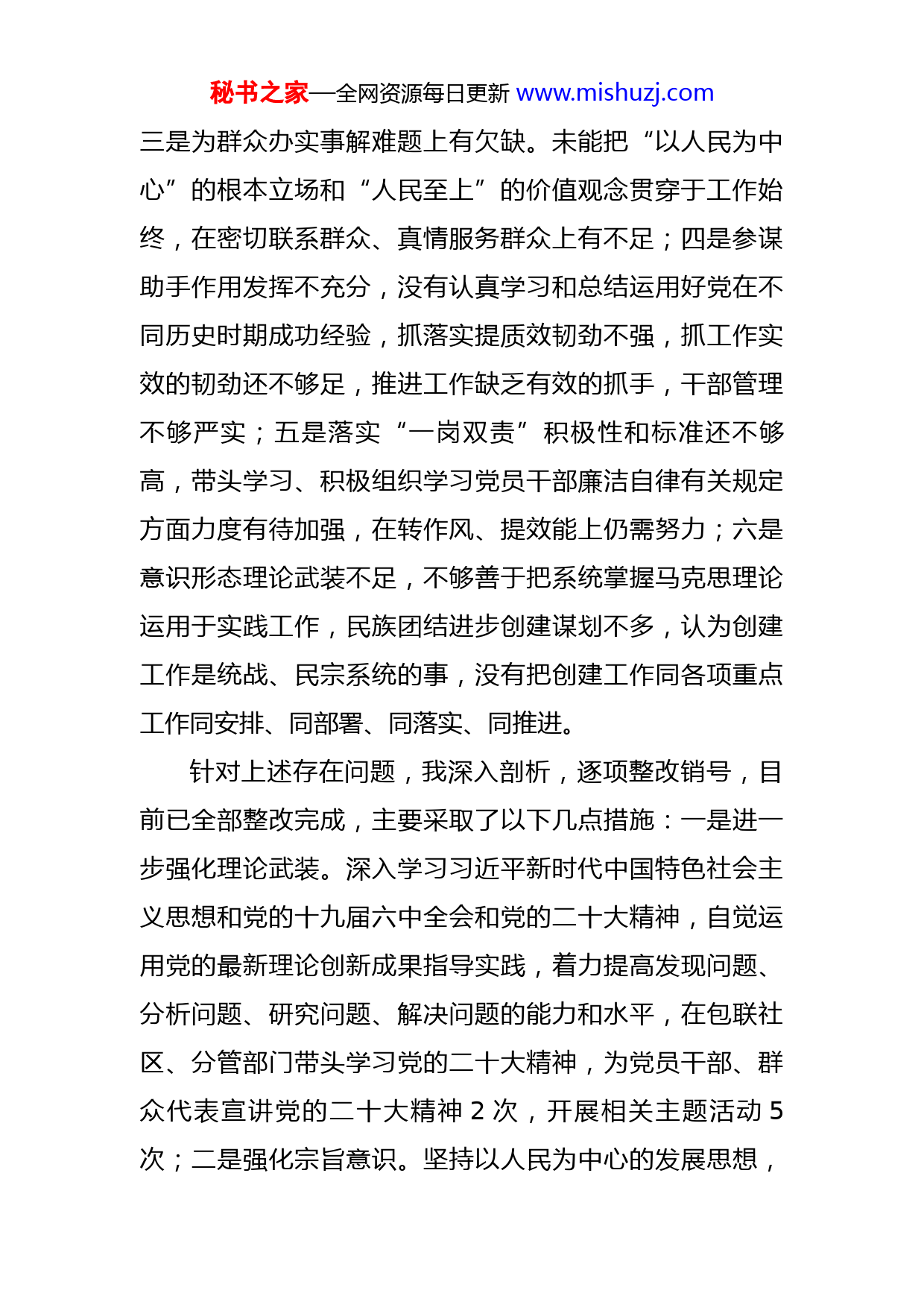 秘书之家—全网资源每日更新www.mishuzj.com副镇长2022年度民主生活会对照检查材料上年度整改按照《XX镇2022年度民主生活会工作方案》要求,我深入学习党的二十大精神,认真领悟党的二十大提出的新思想新论断、作出的新部署新要求,加深对习近平新时代中国特色社会主义思想的认识,深刻领悟“两个确立”的决定性意义,增强“四个意识”、坚定“四个自信”、做到“两个维护”。同时围绕本次民主生活会的主题,学习市委常委班子2022年度民主生活会典型案例剖析材料,检视个人问题整改落实情况,坚持问题导向,对照六个方面深入查摆自身存在不足,深刻剖析产生问题根源,进一步明确下一步整改措施和今后努力方向。一、整改落实完成情况根据2021年度党史学习教育专题民主生活会认领的个人问题,主要有六个方面:一是学习积极性、主动性不高,对学习计划执行不到位,发现问题、分析问题、解决问题的能力有待提高,对习近平总书记系列重要讲话以及考察时的重要指示精神与分管工作实际缺乏深度结合;二是在树立大局意识、全局观念上有差距,在统筹协调、跟踪问效上有短板,对工作的思考、下功夫不够,对分管领域的一些重要工作缺乏主动性、预见性,习惯于老经验;秘书之家—全网资源每日更新www.mishuzj.com三是为群众办实事解难题上有欠缺。未能把“以人民为中心”的根本立场和“人民至上”的价值观念贯穿于工作始终,在密切联系群众、真情服务群众上有不足;四是参谋助手作用发挥不充分,没有认真学习和总结运用好党在不同历史时期成功经验,抓落实提质效韧劲不强,抓工作实效的韧劲还不够足,推进工作缺乏有效的抓手,干部管理不够严实;五是落实“一岗双责”积极性和标准还不够高,带头学习、积极组织学习党员干部廉洁自律有关规定方面力度有待加强,在转作风、提效能上仍需努力;六是意识形态理论武装不足,不够善于把系统掌握马克思理论运用于实践工作,民族团结进步创建谋划不多,认为创建工作是统战、民宗系统的事,没有把创建工作同各项重点工作同安排、同部署、同落实、同推进。针对上述存在问题,我深入剖析,逐项整改销号,目前已全部整改完成,主要采取了以下几点措施:一是进一步强化理论武装。深入学习习近平新时代中国特色社会主义思想和党的十九届六中全会和党的二十大精神,自觉运用党的最新理论创新成果指导实践,着力提高发现问题、分析问题、研究问题、解决问题的能力和水平,在包联社区、分管部门带头学习党的二十大精神,为党员干部、群众代表宣讲党的二十大精神2次,开展相关主题活动5次;二是强化宗旨意识。坚持以人民为中心的发展思想,秘书之家—全网资源每日更新www.mishuzj.com做到深入实际、深入群众、深入基层,在群众中汲取工作的智慧和力量,寻找解决问题的方法和路径,全力做好包联社区的各项工作,2022年XX社区获XX市第七次全国人口普查工作成绩突出集体、“XX省卫生村”称号,XX社区获XX市五星级基层党组织称号;三是时刻牢记使命,坚守为民务实担当。紧紧围绕XX镇中心工作,在镇党委政府的统一领导下抓紧加快推动各项工作,做到思路再创新、重点再聚焦、工作再务实。加快推进镇便民服务中心建设,持续深化“一枚印章管审批”改革,梳理整合53项行政审批、公共服务事项纳入便民服务中心办理,将原涉及多部门的6枚印章的审批事项整合为“行政审批(服务)专用章”统一办理,进一步简化办事流程、提高办事效率,加快审批(服务)模式由“分散式受理”向“全科式受理”转变,进一步打通服务群众的“最后一公里”;四是以案为鉴,筑牢思想防线。认真剖析违纪违法典型案例,从中汲取教训、举一反三、引以为戒,杜绝一切违法违纪的情况出现。严格落实廉洁自律各项规定,始终严守思想“防线”、道德“底线”和法纪“红线”,坚持严于律己。二、个人需要明示的事项(一)家庭(含共同生活的子女)住房情况。XX(二)办公用房情况。秘书之家—全网资源每日更新www.mishuzj.com办公用房2人共用1间,面积为20㎡。(三)工资情况。本人工资由XX区财政统一发放。(四)子女与外国、无国籍人士,香港、澳门、台湾居民通婚情况。无。(五)配偶子女从业情况。XX(六)群众反映、巡视反馈、组织约谈函询等问题。无。(七)个人及家庭情况发生重大变化,需及时向组织报告的其他事项。(1)身体状况:健康;(2)婚姻状况:已婚。三、存在的主要问题本人紧扣民主生活会主题,对照党的二十大精神和党章党规党纪,把自己摆进去、把职责摆进去、把工作摆进去,重点从以下7个方面进行对照检查:(一)在带头深刻领悟“两个确立”的决定性意义,增强“四个意识”、坚定“四个自信”、做到“两个维护”。严明政治纪律和政治规矩,提高政治判断力、政治领悟力、政治执行力,始终在政治立场、政治方向、政治原则、政治道路上同以习近平同志为核心的党中央保持高度一致方面。一是认识体会不够深刻。对“两个确立”中蕴含的科学内涵,阐释的深刻道理,学习思考得还不够全面透彻,秘书之家—全网资源每日更新www.mishuzj.com对“两个确立”中的理论逻辑、历史逻辑和实践逻辑,未能完全做到心神合一,融会贯通,在把研究成果转化为推动工作发展动力的政治自觉方面还存在一定差距。体现到基层开展群众工作时,未能完