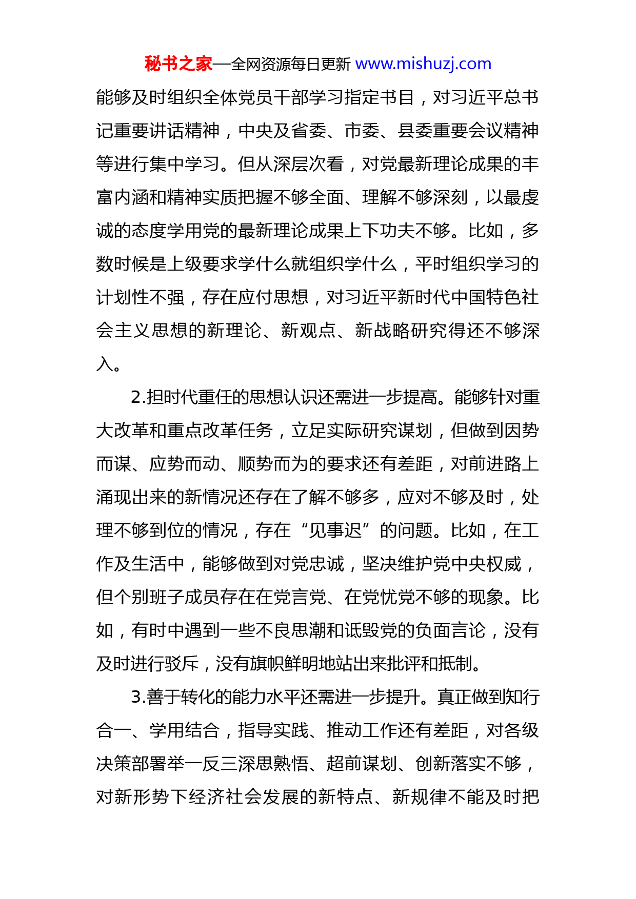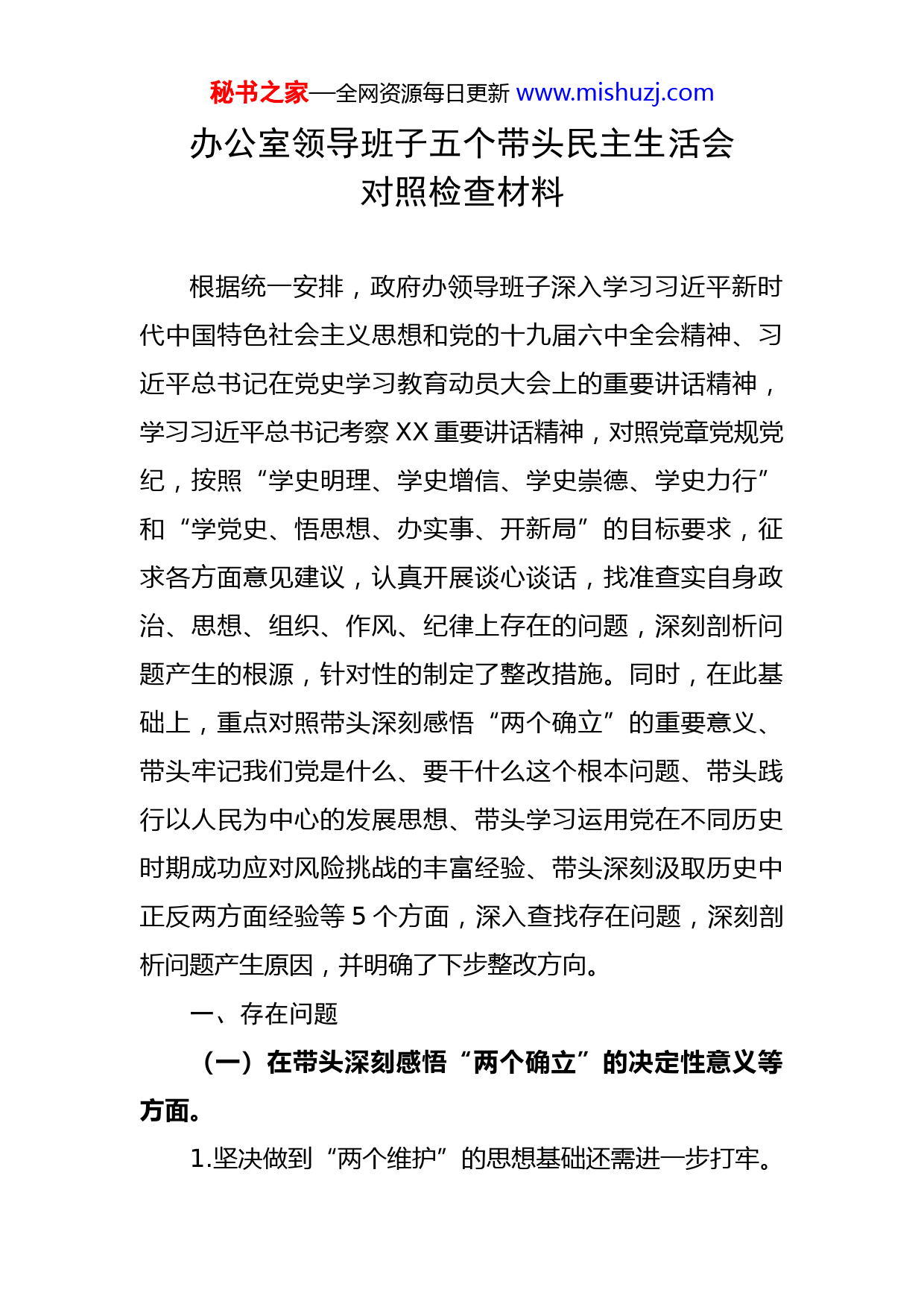 秘书之家—全网资源每日更新www.mishuzj.com办公室领导班子五个带头民主生活会对照检查材料根据统一安排,政府办领导班子深入学习习近平新时代中国特色社会主义思想和党的十九届六中全会精神、习近平总书记在党史学习教育动员大会上的重要讲话精神,学习习近平总书记考察XX重要讲话精神,对照党章党规党纪,按照“学史明理、学史增信、学史崇德、学史力行”和“学党史、悟思想、办实事、开新局”的目标要求,征求各方面意见建议,认真开展谈心谈话,找准查实自身政治、思想、组织、作风、纪律上存在的问题,深刻剖析问题产生的根源,针对性的制定了整改措施。同时,在此基础上,重点对照带头深刻感悟“两个确立”的重要意义、带头牢记我们党是什么、要干什么这个根本问题、带头践行以人民为中心的发展思想、带头学习运用党在不同历史时期成功应对风险挑战的丰富经验、带头深刻汲取历史中正反两方面经验等5个方面,深入查找存在问题,深刻剖析问题产生原因,并明确了下步整改方向。一、存在问题(一)在带头深刻感悟“两个确立”的决定性意义等方面。1.坚决做到“两个维护”的思想基础还需进一步打牢。秘书之家—全网资源每日更新www.mishuzj.com能够及时组织全体党员干部学习指定书目,对习近平总书记重要讲话精神,中央及省委、市委、县委重要会议精神等进行集中学习。但从深层次看,对党最新理论成果的丰富内涵和精神实质把握不够全面、理解不够深刻,以最虔诚的态度学用党的最新理论成果上下功夫不够。比如,多数时候是上级要求学什么就组织学什么,平时组织学习的计划性不强,存在应付思想,对习近平新时代中国特色社会主义思想的新理论、新观点、新战略研究得还不够深入。2.担时代重任的思想认识还需进一步提高。能够针对重大改革和重点改革任务,立足实际研究谋划,但做到因势而谋、应势而动、顺势而为的要求还有差距,对前进路上涌现出来的新情况还存在了解不够多,应对不够及时,处理不够到位的情况,存在“见事迟”的问题。比如,在工作及生活中,能够做到对党忠诚,坚决维护党中央权威,但个别班子成员存在在党言党、在党忧党不够的现象。比如,有时中遇到一些不良思潮和诋毁党的负面言论,没有及时进行驳斥,没有旗帜鲜明地站出来批评和抵制。3.善于转化的能力水平还需进一步提升。真正做到知行合一、学用结合,指导实践、推动工作还有差距,对各级决策部署举一反三深思熟悟、超前谋划、创新落实不够,对新形势下经济社会发展的新特点、新规律不能及时把秘书之家—全网资源每日更新www.mishuzj.com握、合理利用,将习近平总书记的相关重要讲话精神转化为解决制约XX改革发展的实际问题效果不明显。比如,工作中更多注重领导讲话、政策文件和业务知识的学习,多是用于传达贯彻,利用重要理论指导解决问题不够,没有很好地发挥理论对实践的指导作用,没能更好地通过强化理论武装来推动工作发展,提高工作水平。(二)在带头牢记我们党是什么、要干什么这个根本问题等方面。1.坚决贯彻的政治站位还不够高。存在措施不够精准、成效不够显著等问题,缺少体现地方特色的创新性招法和举措,特别是贯彻落实习近平新时代中国特色社会主义思想与经济社会发展结合得不够。比如;在围绕中心工作,没能充分把习近平总书记对办公室工作的重要指示批示和党中央决策部署转化为推动工作的重要抓手,在理解和践行“五个坚持”方面还存在局限性,尤其是起草汇报材料时不到位,文稿质量不高。2.带头攻坚克难的劲头有所下降。工作落实过程中缺乏“钉钉子”精神,办公室班子成员有时满足于按部就班完成上级安排的工作任务,特别是困难多压力重情况下,还有应付过关的偷懒思想。没能更好把政府办工作放到经济社会发展的大局中去思考、去谋划、去落实,自身工作节奏和全县发展节奏还不够合拍,有时存在闭门造车现象。秘书之家—全网资源每日更新www.mishuzj.com在创新举措、及时响应方面,站位不高,思路不宽,如何利用现有业务数据、深度挖掘分析,为县政府领导科学决策提供依据,做的还不到位;对一些新情况、新矛盾、新问题,还不能做到时时刻刻扑下身子去思考、去研究、去化解;在办务实的事、开有效的会、发管用的文等方面抓细节不够,推动工作落实办法还不多。3.疫情防控工作落实还有差距。面对向好的疫情防控形势,内心也会出现乐观情绪、麻痹思想,逐渐放松了工作要求,在疫情防控工作上做到自始至终、慎终如始还有差距。又如,有的班子成员在新冠肺炎疫情防控、保持经济发展、深化改革开放、维护社会稳定等工作思考不多,满足于现状,不求新求变。(三)在带头践行以人民为中心的发展思想等方面。1.密切联系群众的作风还不实。班子成员在机关工作久了,工作重心逐渐转移到项目建设、经济发展等领域,对群众的生产生活、冷暖疾苦关注程度有所降低,逐渐拉开了与群众的距离,干群之间的鱼水深情逐渐弱化。比如,在落实巩固拓展脱贫攻坚成果同乡村振兴有效衔接部署中,帮助群众解决实际困难做得不到位。这些问题反映出班子成员宗旨意识树得不牢,践行群众路线不彻底。2.深入调查研究的主动性还不强。班子成员平时在办公室的时间多,主动下基层调查研究的时间少,尤