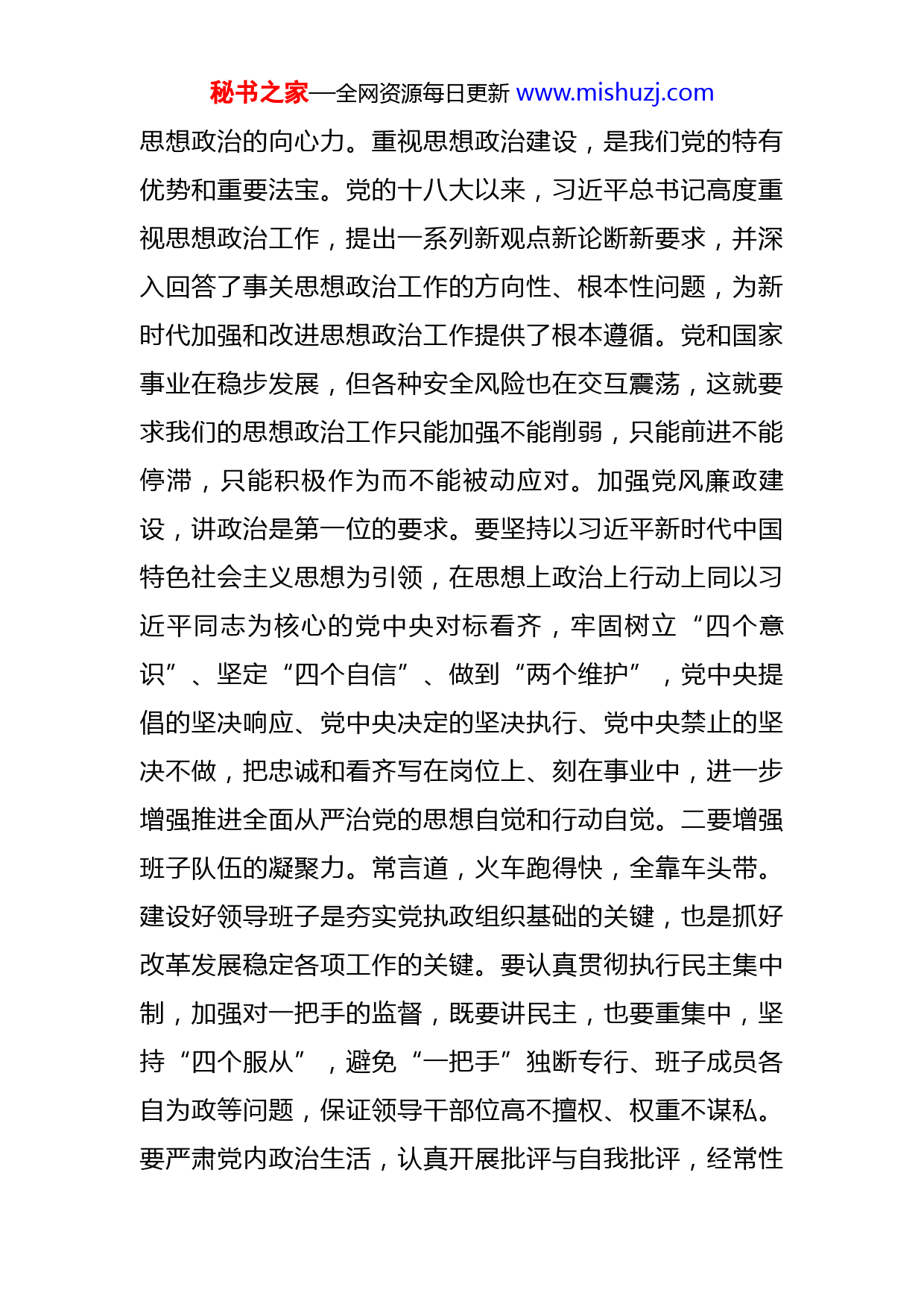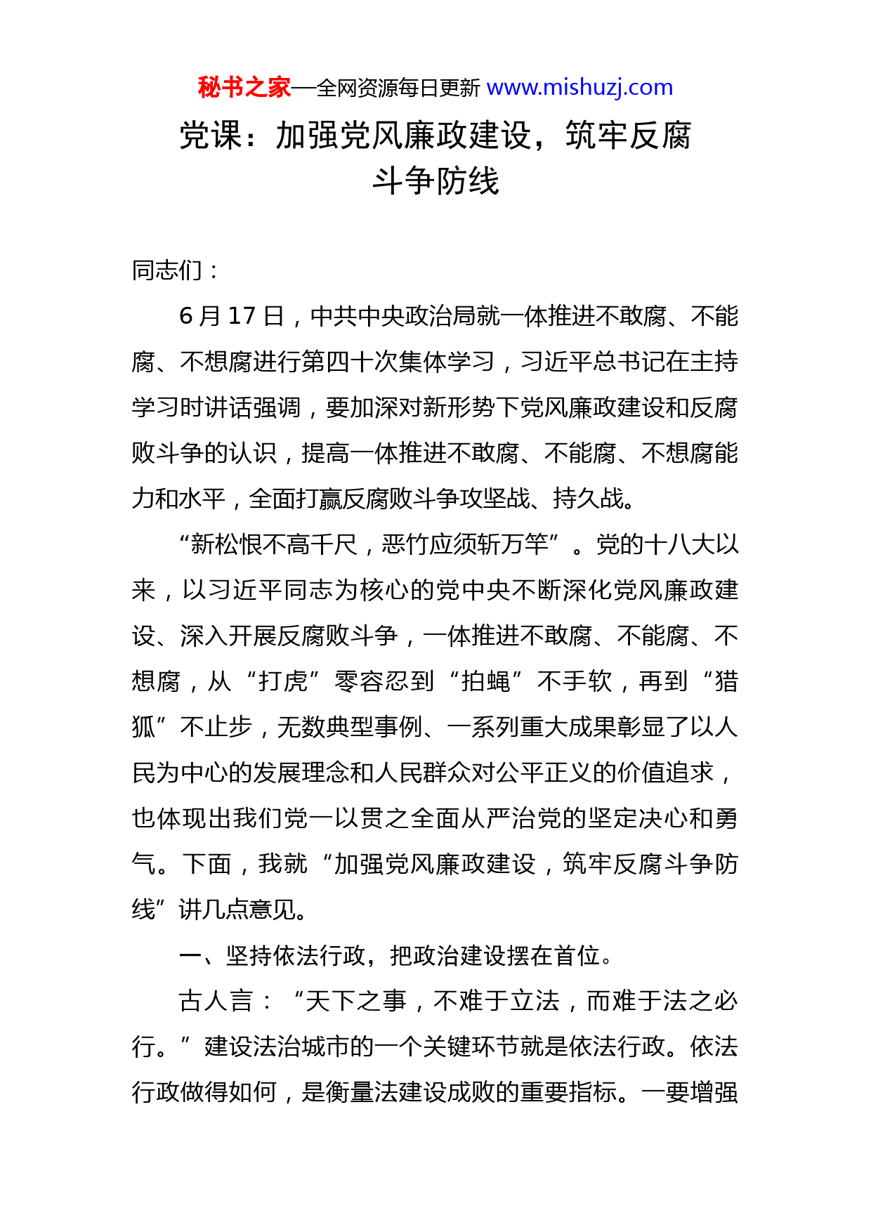 秘书之家—全网资源每日更新www.mishuzj.com党课:加强党风廉政建设,筑牢反腐斗争防线同志们:6月17日,中共中央政治局就一体推进不敢腐、不能腐、不想腐进行第四十次集体学习,习近平总书记在主持学习时讲话强调,要加深对新形势下党风廉政建设和反腐败斗争的认识,提高一体推进不敢腐、不能腐、不想腐能力和水平,全面打赢反腐败斗争攻坚战、持久战。“新松恨不高千尺,恶竹应须斩万竿”。党的十八大以来,以习近平同志为核心的党中央不断深化党风廉政建设、深入开展反腐败斗争,一体推进不敢腐、不能腐、不想腐,从“打虎”零容忍到“拍蝇”不手软,再到“猎狐”不止步,无数典型事例、一系列重大成果彰显了以人民为中心的发展理念和人民群众对公平正义的价值追求,也体现出我们党一以贯之全面从严治党的坚定决心和勇气。下面,我就“加强党风廉政建设,筑牢反腐斗争防线”讲几点意见。一、坚持依法行政,把政治建设摆在首位。古人言:“天下之事,不难于立法,而难于法之必行。”建设法治城市的一个关键环节就是依法行政。依法行政做得如何,是衡量法建设成败的重要指标。一要增强秘书之家—全网资源每日更新www.mishuzj.com思想政治的向心力。重视思想政治建设,是我们党的特有优势和重要法宝。党的十八大以来,习近平总书记高度重视思想政治工作,提出一系列新观点新论断新要求,并深入回答了事关思想政治工作的方向性、根本性问题,为新时代加强和改进思想政治工作提供了根本遵循。党和国家事业在稳步发展,但各种安全风险也在交互震荡,这就要求我们的思想政治工作只能加强不能削弱,只能前进不能停滞,只能积极作为而不能被动应对。加强党风廉政建设,讲政治是第一位的要求。要坚持以习近平新时代中国特色社会主义思想为引领,在思想上政治上行动上同以习近平同志为核心的党中央对标看齐,牢固树立“四个意识”、坚定“四个自信”、做到“两个维护”,党中央提倡的坚决响应、党中央决定的坚决执行、党中央禁止的坚决不做,把忠诚和看齐写在岗位上、刻在事业中,进一步增强推进全面从严治党的思想自觉和行动自觉。二要增强班子队伍的凝聚力。常言道,火车跑得快,全靠车头带。建设好领导班子是夯实党执政组织基础的关键,也是抓好改革发展稳定各项工作的关键。要认真贯彻执行民主集中制,加强对一把手的监督,既要讲民主,也要重集中,坚持“四个服从”,避免“一把手”独断专行、班子成员各自为政等问题,保证领导干部位高不擅权、权重不谋私。要严肃党内政治生活,认真开展批评与自我批评,经常性秘书之家—全网资源每日更新www.mishuzj.com开展谈心谈话,及时了解干部的思想动态,无论是在日常工作中,还是在“八小时之外”,常打“预防针”、常敲“警示钟”,避免关键时刻“动手术”。三要增强监督管理的约束力。习近平总书记指出:“没有监督的权力必然导致腐败,这是一条铁律。”“反腐倡廉的核心是制约和监督权力”,“没有健全的制度,权力没有关进制度的笼子里,腐败现象就控制不住”。反腐败没有盲区、没有死角,党风廉政建设不能有真空地带。要加强对政府系统组成部门的监管,把反腐败的触角延伸到政府部门的每个角落。党的十八大以来,以习近平同志为核心的党中央,以彻底的自我革命精神,坚定不移推进全面从严治党,持之以恒正风肃纪反腐,把监督制约权力作为永葆党的肌体健康的重要保障,以党内监督带动促进其他监督,健全党和国家监督体系,不断增强党自我净化、自我完善、自我革新、自我提高能力,党在新时代新征程中焕发出更加强大的生机活力。二、坚持勤勉理政,始终保持干事创业的奋斗姿态。习近平总书记在给参加海峡青年论坛的台湾青年的回信中指出,青年兴则国家兴,青年强则国家强。祖国和民族的前途寄托在青年人身上。新时代的青年干部是推动经济社会发展的“主力军”“攻坚队”,是党和国家事业的接班人,要想成为可堪大用、能担重任的栋梁之才,就要秘书之家—全网资源每日更新www.mishuzj.com善做“加、减、乘、除”四则运算,争当“四气”干部。一要有高境界。“先天下之忧而忧,后天下之乐而乐”,是范仲淹的境界;“苟利国家生死以,岂因祸福避趋之”,是林则徐的境界;“人生自古谁无死,留取丹心照汗青”,是文天祥的境界;“横眉冷对千夫指,俯首甘为孺子牛”,是鲁迅的境界。当前,报党报国,全心全意为人民服务,实现“两大目标”,树立“三个自信”,推进“四个全面”,落实“五大发展理念”,为实现中华民族伟大复兴的中国梦努力工作、奋力拼搏,应当成为每一名党员干部的崇高境界。要有淡泊名利、甘于奉献的境界,各级领导干部要率先垂范,始终牢记全心全意为人民服务的根本宗旨,自觉把个人的成长与党的事业和发展紧紧连在一起,不计个人得失,甘于任劳任怨,经得起各种诱惑和考验,用人格力量引领本地本部门始终保持想干事、真干事、干成事的精神状态,以勤勉敬业、夙夜在公的干劲抓工作。要有“功成不必在我、功成必须有我”的境界,阶段性的目标要清晰,长远性的目标要明确,既要重显绩,也要重潜绩,不要刷“存在感”,俯下身子、踏踏实实干好工作,多做打基础、利长远的事,要增强“高目标、高标准、高成效”意识,要拿出“比、