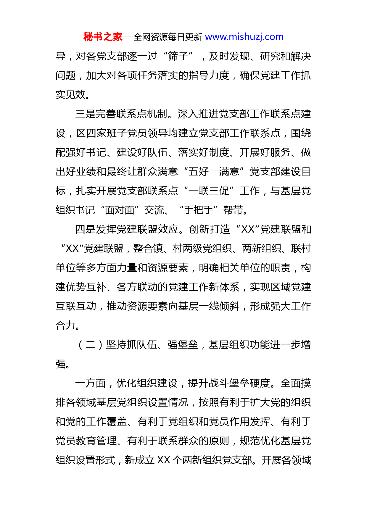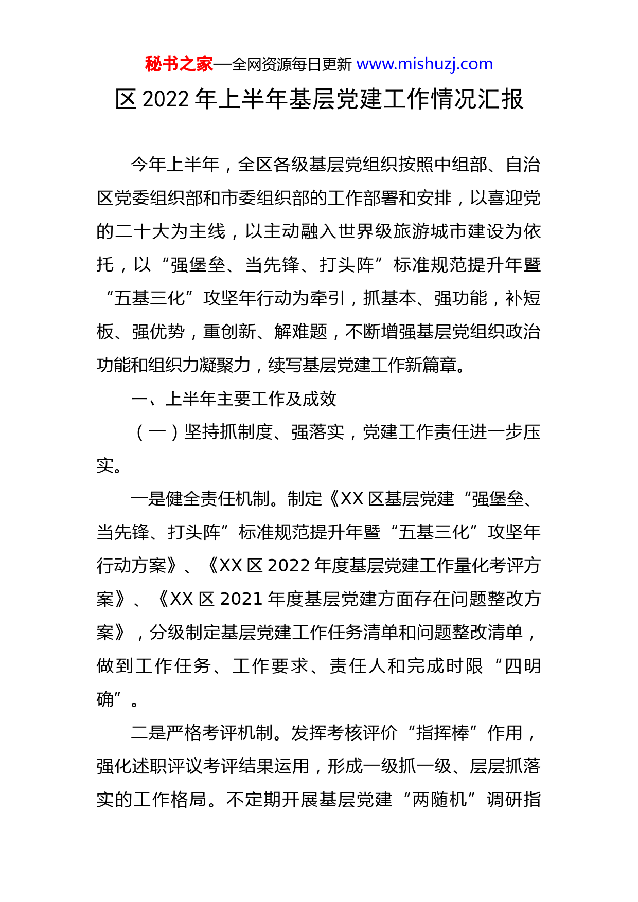 秘书之家—全网资源每日更新www.mishuzj.com区2022年上半年基层党建工作情况汇报今年上半年,全区各级基层党组织按照中组部、自治区党委组织部和市委组织部的工作部署和安排,以喜迎党的二十大为主线,以主动融入世界级旅游城市建设为依托,以“强堡垒、当先锋、打头阵”标准规范提升年暨“五基三化”攻坚年行动为牵引,抓基本、强功能,补短板、强优势,重创新、解难题,不断增强基层党组织政治功能和组织力凝聚力,续写基层党建工作新篇章。一、上半年主要工作及成效(一)坚持抓制度、强落实,党建工作责任进一步压实。一是健全责任机制。制定《XX区基层党建“强堡垒、当先锋、打头阵”标准规范提升年暨“五基三化”攻坚年行动方案》、《XX区2022年度基层党建工作量化考评方案》、《XX区2021年度基层党建方面存在问题整改方案》,分级制定基层党建工作任务清单和问题整改清单,做到工作任务、工作要求、责任人和完成时限“四明确”。二是严格考评机制。发挥考核评价“指挥棒”作用,强化述职评议考评结果运用,形成一级抓一级、层层抓落实的工作格局。不定期开展基层党建“两随机”调研指秘书之家—全网资源每日更新www.mishuzj.com导,对各党支部逐一过“筛子”,及时发现、研究和解决问题,加大对各项任务落实的指导力度,确保党建工作抓实见效。三是完善联系点机制。深入推进党支部工作联系点建设,区四家班子党员领导均建立党支部工作联系点,围绕配强好书记、建设好队伍、落实好制度、开展好服务、做出好业绩和最终让群众满意“五好一满意”党支部建设目标,扎实开展党支部联系点“一联三促”工作,与基层党组织书记“面对面”交流、“手把手”帮带。四是发挥党建联盟效应。创新打造“XX”党建联盟和“XX”党建联盟,整合镇、村两级党组织、两新组织、联村单位等多方面力量和资源要素,明确相关单位的职责,构建优势互补、各方联动的党建工作新体系,实现区域党建互联互动,推动资源要素向基层一线倾斜,形成强大工作合力。(二)坚持抓队伍、强堡垒,基层组织功能进一步增强。一方面,优化组织建设,提升战斗堡垒硬度。全面摸排各领域基层党组织设置情况,按照有利于扩大党的组织和党的工作覆盖、有利于党组织和党员作用发挥、有利于党员教育管理、有利于联系群众的原则,规范优化基层党组织设置形式,新成立XX个两新组织党支部。开展各领域秘书之家—全网资源每日更新www.mishuzj.com基层党组织评星定级,今年新增XX个五星级、XX个四星级和XX个三星级农村基层党组织,截至目前全区农村星级党组织覆盖率达XX%。对未定星级的两新组织党组织主动帮助提升水平、争创星级,对已经评定星级的党组织定期开展复核、抓好巩固提升,把XX等XX家争创星级的党组织打造成特色鲜明、亮点突出的两新组织党建工作示范点。持续推进城市居民小区评星定级,XX小区获评自治区三星级居民小区党组织。建设XX村屯级党群服务中心,打通服务群众“最后一百米”。另一方面,培育“XX先锋”,壮大雁阵队伍力量。严格把关发展党员质量,注重在农村优秀青年、致富带头人、高知识群体、35岁以下青年等类型中大力发展党员,确保发展党员数量和质量“双线”提升,截至目前已发展党员XX名,入党积极分子库存XX名。强化流动党员管理,推动完成乡镇(街道)和村(社区)全部建立流动党员名册,建立由村“两委”干部与流动党员“一对一”联系服务机制,实现对流动党员的有效管理。创新党员教育形式,组建“红色送学队”,举办“党建领航清风护航”文艺汇演暨“党课开讲啦”清廉社区情景党课,让党课的阵地从课堂搬到舞台。创新推出“田坎党课”“车间党课”和“非遗党课”等一批形式新颖接地气的党课,有效破解党员教育吸引力不强、感染力不足等问题。开展换届秘书之家—全网资源每日更新www.mishuzj.com“回头看”,聚焦“班子运行顺不顺、工作能力强不强、精神状态好不好、群众反映怎么样、矛盾问题有没有”,突出“五查五看”,对XX个乡镇XX个行政村(社区)全覆盖回访调研,并对XX名乡镇班子成员逐个谈心谈话,对XX名村(社区)“两委”干部进行一一调研谈话,全面掌握换届后乡镇和村“两委”班子运行情况,进一步巩固2021年乡镇、村(社区)“两委”换届选举成果。持续加强党员队伍建设。以党员积分制管理为抓手,不断优化党员队伍结构,保持党的生机和活力。抓好村“两委”干部培训轮训,增强“领头雁”抓基层党建工作责任意识和业务本领。完善村党组织书记区级备案管理制度,实行村党组织书记系统化培养、专职化管理、星级化考核。配备XX个村级党建组织员,增强村级后备力量,强化后备人才储备。(三)坚持抓投入、强基础,基层基础保障进一步夯实。一是强化基础保障。持续抓好党建经费预算和党建经费落实,确保基层党组织开展工作提供必要经费保障。XX社区和XX乡高标准打造党建文化广场和党建振兴广场,XX村特色产业示范基地获评XX市党员教育培训示范基地和干部教育培训现场教学点。二是推进“数字党建”。积极推进“壮美XX·党建云”秘书之家—全网资源每日更新www.mishuzj.com党员教育终端站点建设,做到站点建设全覆盖,实现“XX数字网络图书馆”和“党员教育站点”资源共享。突出“问题+需求”导向