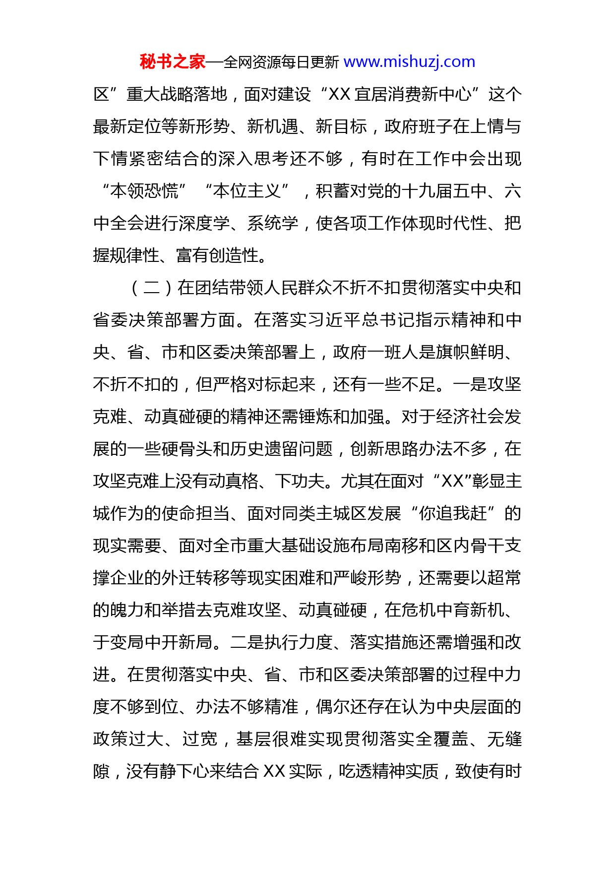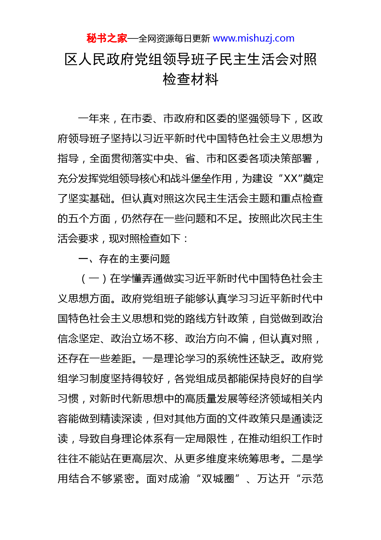 秘书之家—全网资源每日更新www.mishuzj.com区人民政府党组领导班子民主生活会对照检查材料一年来,在市委、市政府和区委的坚强领导下,区政府领导班子坚持以习近平新时代中国特色社会主义思想为指导,全面贯彻落实中央、省、市和区委各项决策部署,充分发挥党组领导核心和战斗堡垒作用,为建设“XX”奠定了坚实基础。但认真对照这次民主生活会主题和重点检查的五个方面,仍然存在一些问题和不足。按照此次民主生活会要求,现对照检查如下:一、存在的主要问题(一)在学懂弄通做实习近平新时代中国特色社会主义思想方面。政府党组班子能够认真学习习近平新时代中国特色社会主义思想和党的路线方针政策,自觉做到政治信念坚定、政治立场不移、政治方向不偏,但认真对照,还存在一些差距。一是理论学习的系统性还缺乏。政府党组学习制度坚持得较好,各党组成员都能保持良好的自学习惯,对新时代新思想中的高质量发展等经济领域相关内容能做到精读深读,但对其他方面的文件政策只是通读泛读,导致自身理论体系有一定局限性,在推动组织工作时往往不能站在更高层次、从更多维度来统筹思考。二是学用结合不够紧密。面对成渝“双城圈”、万达开“示范秘书之家—全网资源每日更新www.mishuzj.com区”重大战略落地,面对建设“XX宜居消费新中心”这个最新定位等新形势、新机遇、新目标,政府班子在上情与下情紧密结合的深入思考还不够,有时在工作中会出现“本领恐慌”“本位主义”,积蓄对党的十九届五中、六中全会进行深度学、系统学,使各项工作体现时代性、把握规律性、富有创造性。(二)在团结带领人民群众不折不扣贯彻落实中央和省委决策部署方面。在落实习近平总书记指示精神和中央、省、市和区委决策部署上,政府一班人是旗帜鲜明、不折不扣的,但严格对标起来,还有一些不足。一是攻坚克难、动真碰硬的精神还需锤炼和加强。对于经济社会发展的一些硬骨头和历史遗留问题,创新思路办法不多,在攻坚克难上没有动真格、下功夫。尤其在面对“XX”彰显主城作为的使命担当、面对同类主城区发展“你追我赶”的现实需要、面对全市重大基础设施布局南移和区内骨干支撑企业的外迁转移等现实困难和严峻形势,还需要以超常的魄力和举措去克难攻坚、动真碰硬,在危机中育新机、于变局中开新局。二是执行力度、落实措施还需增强和改进。在贯彻落实中央、省、市和区委决策部署的过程中力度不够到位、办法不够精准,偶尔还存在认为中央层面的政策过大、过宽,基层很难实现贯彻落实全覆盖、无缝隙,没有静下心来结合XX实际,吃透精神实质,致使有时秘书之家—全网资源每日更新www.mishuzj.com在落实执行时停留在一般性号召上,以文件落实文件、以会议贯彻会议的现象仍然存在。(三)在履职尽责,担当作为,着力破解突出矛盾和问题等方面。政府党组一班人坚持忠诚担当、务实高效的工作理念,但对照上级要求、工作实际和群众期待,在抓落实与出实效之间还有一定差距。一是缺乏“统筹兼顾”的安排。在统筹抓好疫情防控与经济社会发展方面,没有做到统筹兼顾、整体推进,导致部分工作脱节失衡。比如,在疫情防控工作中,虽然加强了设备配置、物资储备、人员培训和应急演练,积累了丰富的“抗疫”经验,但随着病例得到清零、企业逐渐复产、秩序基本恢复后,大家紧绷的弦有所放松,这其中有各项重要工作挤占精力的客观因素,但主要原因还是主观上存在侥幸心理,还需慎终如始抓好疫情防控。再比如,将时间和精力更多地用在了项目建设、产业发展等经济方面,推动个别民生工程建设速度偏慢,导致殡仪馆迁建项目至今还没有投入运营。二是缺乏“一抓到底”的韧劲。在抓落实上有安排、有督促,但对具体工作的抓细抓小不够紧,对部门乡镇推动落实的指导督促不够细,未能完全做到全时掌控、末端督导、一线问效。比如在优化营商环境工作上做了大量工作,“一站式集成办理”、“最多跑一次”等举措深入实施,但今年市阳光问廉通报了我区“奇葩证明事项”的问秘书之家—全网资源每日更新www.mishuzj.com题,说明部门之间仍然存在玻璃门、旋转门,老百姓办事多跑路、跑空路的现象还在发生,反映了我们少数工作抓落实未能打通“最后一公里”。(四)在学习贯彻党的十九届五中、六中全会精神部署要求,对照中央、省委“十四五”经济社会发展目标,查找短板弱项方面。一是站高谋远的思考不够。针对“十四五”时期的工作安排谋划不多、思考不深,尤其是成渝“双城圈”、万达开“示范区”的战略融入和工作结合上,思考还不够系统、视野还不够宽广、思路还不够开阔,致使将XX新区作为万达开“示范区”桥头堡的示范打造上推动较慢,经开区的支撑作用还不够明显。二是产业发展的研究不深。当前,XX面临外迁,XX产业园刚刚起步,工业支撑后劲乏力;消费品质不高、消费产品不多,电子商务突破性发展缓慢;新兴产业、科技创新产业等短板依然明显,亟需政府党组班子成员下功夫、出实招,加快产业转型升级。三是建设“品质XX”的谋划不足。能够坚决执行区委建设“XX”、打造“XX”的决策部署,但较为局限于区委有部署、政府抓落实的理念中,主动思考、创新推动做得不够,有针对性、突破性、实效性的