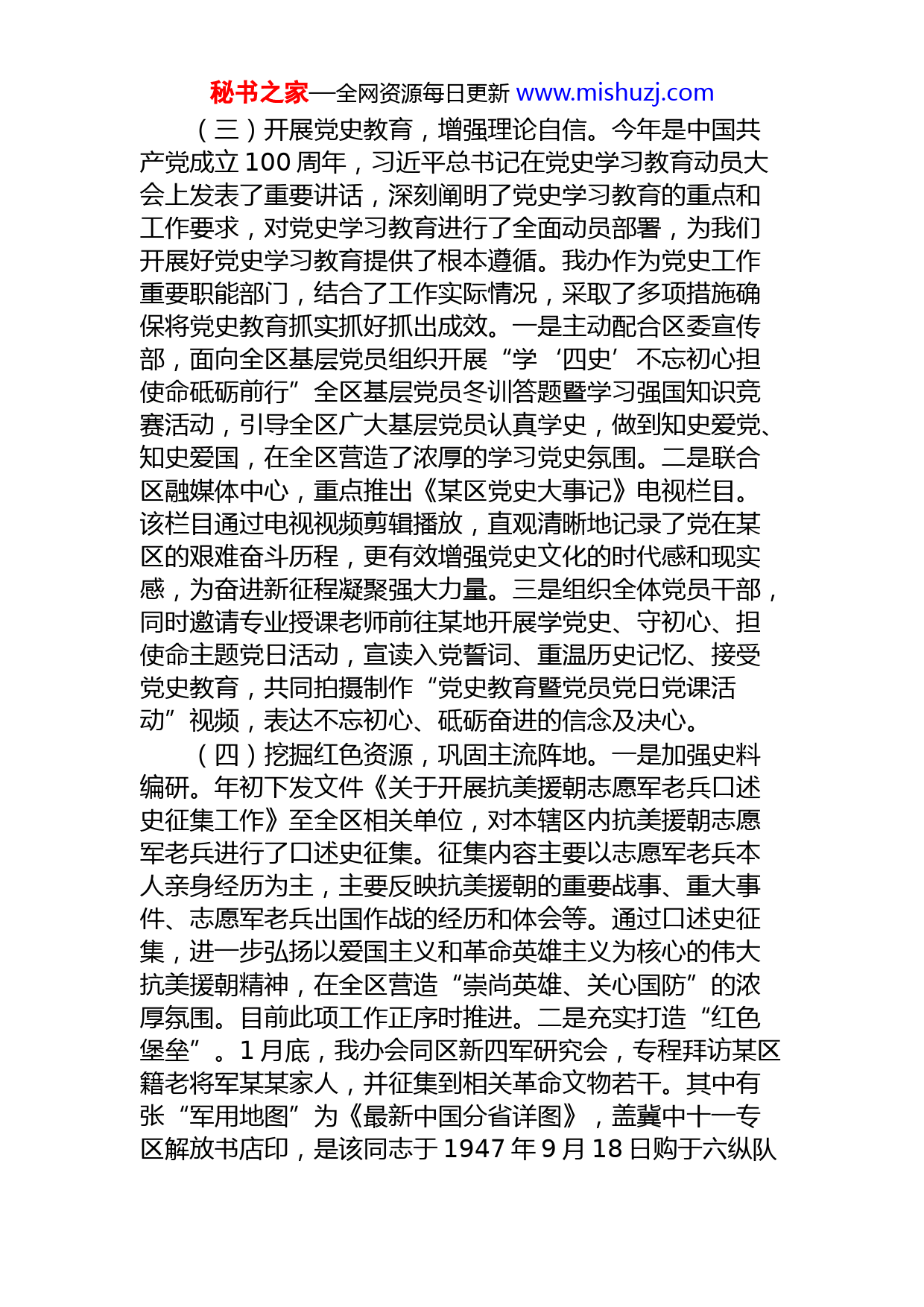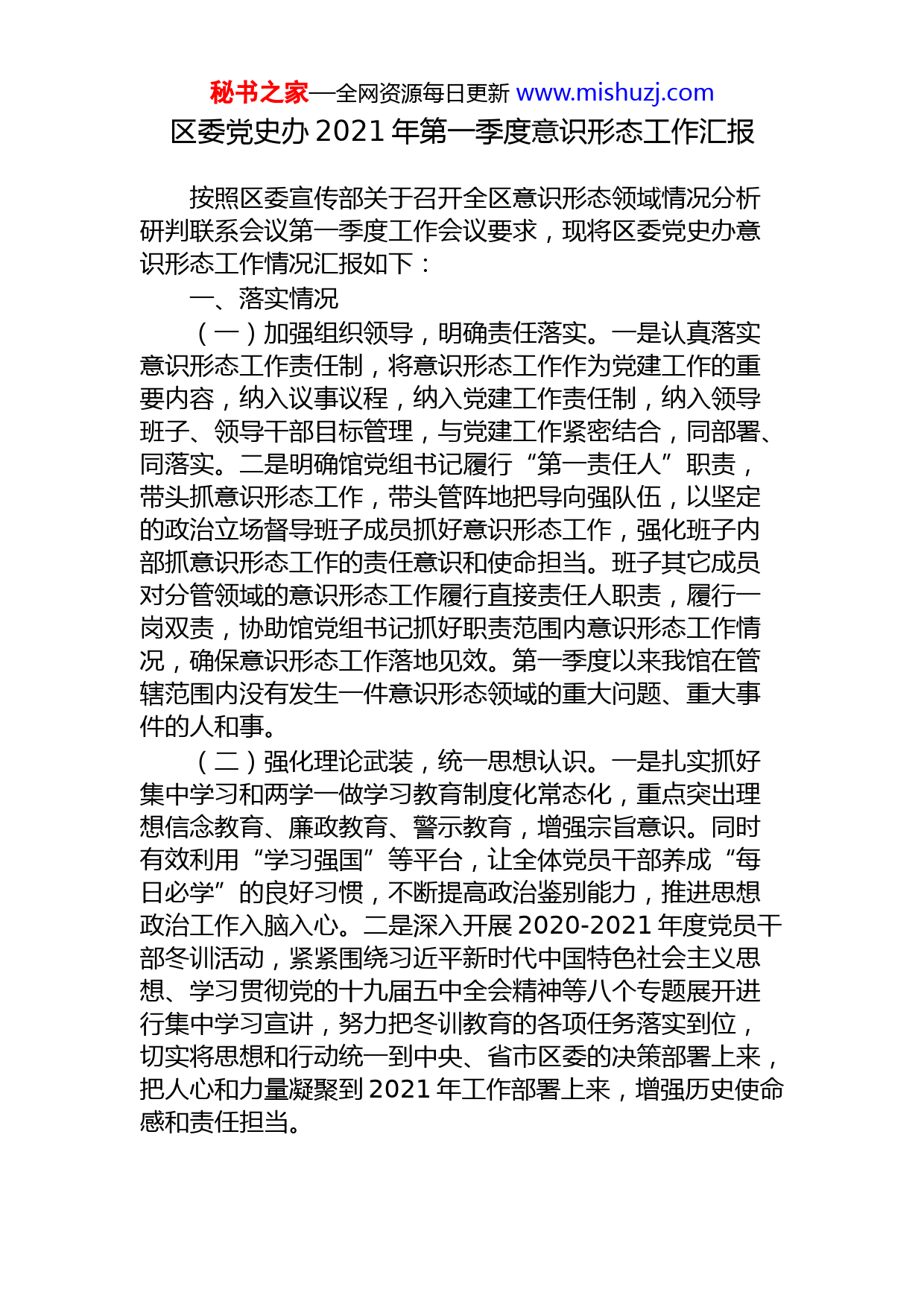 秘书之家—全网资源每日更新www.mishuzj.com区委党史办2021年第一季度意识形态工作汇报按照区委宣传部关于召开全区意识形态领域情况分析研判联系会议第一季度工作会议要求,现将区委党史办意识形态工作情况汇报如下:一、落实情况(一)加强组织领导,明确责任落实。一是认真落实意识形态工作责任制,将意识形态工作作为党建工作的重要内容,纳入议事议程,纳入党建工作责任制,纳入领导班子、领导干部目标管理,与党建工作紧密结合,同部署、同落实。二是明确馆党组书记履行“第一责任人”职责,带头抓意识形态工作,带头管阵地把导向强队伍,以坚定的政治立场督导班子成员抓好意识形态工作,强化班子内部抓意识形态工作的责任意识和使命担当。班子其它成员对分管领域的意识形态工作履行直接责任人职责,履行一岗双责,协助馆党组书记抓好职责范围内意识形态工作情况,确保意识形态工作落地见效。第一季度以来我馆在管辖范围内没有发生一件意识形态领域的重大问题、重大事件的人和事。(二)强化理论武装,统一思想认识。一是扎实抓好集中学习和两学一做学习教育制度化常态化,重点突出理想信念教育、廉政教育、警示教育,增强宗旨意识。同时有效利用“学习强国”等平台,让全体党员干部养成“每日必学”的良好习惯,不断提高政治鉴别能力,推进思想政治工作入脑入心。二是深入开展2020-2021年度党员干部冬训活动,紧紧围绕习近平新时代中国特色社会主义思想、学习贯彻党的十九届五中全会精神等八个专题展开进行集中学习宣讲,努力把冬训教育的各项任务落实到位,切实将思想和行动统一到中央、省市区委的决策部署上来,把人心和力量凝聚到2021年工作部署上来,增强历史使命感和责任担当。秘书之家—全网资源每日更新www.mishuzj.com(三)开展党史教育,增强理论自信。今年是中国共产党成立100周年,习近平总书记在党史学习教育动员大会上发表了重要讲话,深刻阐明了党史学习教育的重点和工作要求,对党史学习教育进行了全面动员部署,为我们开展好党史学习教育提供了根本遵循。我办作为党史工作重要职能部门,结合了工作实际情况,采取了多项措施确保将党史教育抓实抓好抓出成效。一是主动配合区委宣传部,面向全区基层党员组织开展“学‘四史’不忘初心担使命砥砺前行”全区基层党员冬训答题暨学习强国知识竞赛活动,引导全区广大基层党员认真学史,做到知史爱党、知史爱国,在全区营造了浓厚的学习党史氛围。二是联合区融媒体中心,重点推出《某区党史大事记》电视栏目。该栏目通过电视视频剪辑播放,直观清晰地记录了党在某区的艰难奋斗历程,更有效增强党史文化的时代感和现实感,为奋进新征程凝聚强大力量。三是组织全体党员干部,同时邀请专业授课老师前往某地开展学党史、守初心、担使命主题党日活动,宣读入党誓词、重温历史记忆、接受党史教育,共同拍摄制作“党史教育暨党员党日党课活动”视频,表达不忘初心、砥砺奋进的信念及决心。(四)挖掘红色资源,巩固主流阵地。一是加强史料编研。年初下发文件《关于开展抗美援朝志愿军老兵口述史征集工作》至全区相关单位,对本辖区内抗美援朝志愿军老兵进行了口述史征集。征集内容主要以志愿军老兵本人亲身经历为主,主要反映抗美援朝的重要战事、重大事件、志愿军老兵出国作战的经历和体会等。通过口述史征集,进一步弘扬以爱国主义和革命英雄主义为核心的伟大抗美援朝精神,在全区营造“崇尚英雄、关心国防”的浓厚氛围。目前此项工作正序时推进。二是充实打造“红色堡垒”。1月底,我办会同区新四军研究会,专程拜访某区籍老将军某某家人,并征集到相关革命文物若干。其中有张“军用地图”为《最新中国分省详图》,盖冀中十一专区解放书店印,是该同志于1947年9月18日购于六纵队秘书之家—全网资源每日更新www.mishuzj.com随军书店,在解放战争中行军打仗经过的地方均有标记,是一份珍贵的历史资料。通过这次革命文物征集,进一步充实“红色堡垒”展陈内容,传承铁军精神,为我区红色旅游事业发展提供了物质保障。二、存在具体风险点一是思想认识还不够充分,中心工作与意识形态工作未能完全做到“两手抓,两手都要硬”,对加强意识形态工作重要性的理解有时还存在“误区”。二是工作氛围还不够浓厚,对意识形态工作缺乏持续深入研究和推进部署,缺乏深层次的组织性和指导性,意识形态工作往往显得较为被动应付。三是舆论宣传力度尚显薄弱,不能够及时、准确地把握本系统本领域内意识形态舆情动向。舆论宣传的覆盖率还不够,有分量的重点报告在宣传的广度和深度上还显不足,在重大舆情引导上主力军作用发挥得还不够,意识形态主流阵地还需不断巩固。三、下一步意识形态工作具体举措下一步,我办将继续夯实意识形态工作责任制,充分发挥党史部门“存史、资政、育人”作用,传播党史工作“正能量”,从以下几个方面全力以赴抓好意识形态工作,具体如下。(一)提高政治站位,强化思想认识。继续认真学习贯彻习近平总书记关于加强意识形态工作的最新重要讲话精神,切实将意识形态工作摆上重要位置,定期研究部署系统领域内的意识形态工作,强化党员干部政治意识和责任意识,从正面引导中筑牢思想防线,