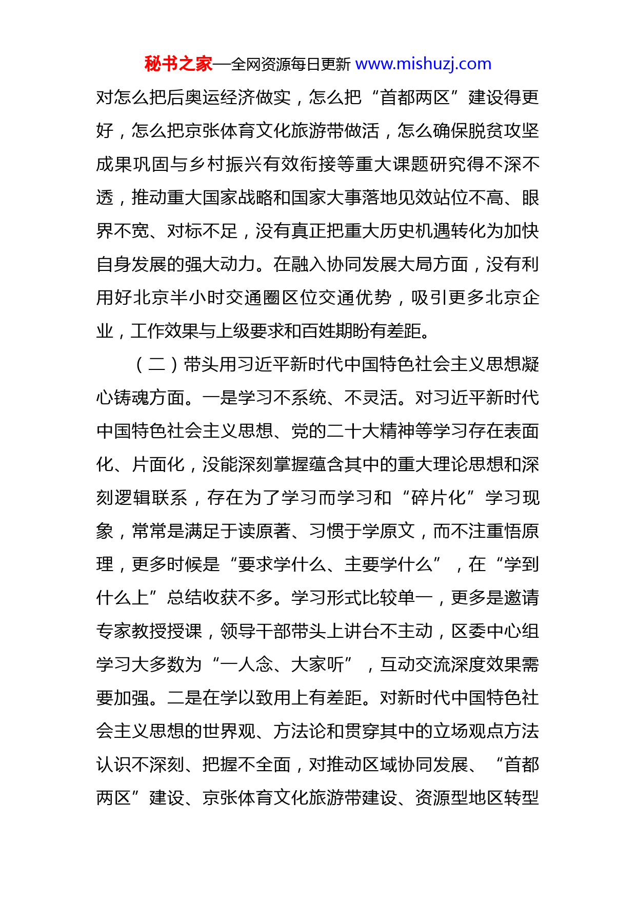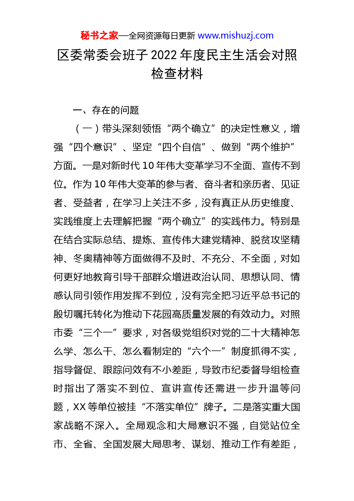 秘书之家—全网资源每日更新www.mishuzj.com区委常委会班子2022年度民主生活会对照检查材料一、存在的问题(一)带头深刻领悟“两个确立”的决定性意义,增强“四个意识”、坚定“四个自信”、做到“两个维护”方面。一是对新时代10年伟大变革学习不全面、宣传不到位。作为10年伟大变革的参与者、奋斗者和亲历者、见证者、受益者,在学习上关注不多,没有真正从历史维度、实践维度上去理解把握“两个确立”的实践伟力。特别是在结合实际总结、提炼、宣传伟大建党精神、脱贫攻坚精神、冬奥精神等方面做得不及时、不充分、不全面,对如何更好地教育引导干部群众增进政治认同、思想认同、情感认同引领作用发挥不到位,没有完全把习近平总书记的殷切嘱托转化为推动下花园高质量发展的有效动力。对照市委“三个一”要求,对各级党组织对党的二十大精神怎么学、怎么干、怎么看制定的“六个一”制度抓得不实,指导督促、跟踪问效有不小差距,导致市纪委督导组检查时指出了落实不到位、宣讲宣传还需进一步升温等问题,XX等单位被挂“不落实单位”牌子。二是落实重大国家战略不深入。全局观念和大局意识不强,自觉站位全市、全省、全国发展大局思考、谋划、推动工作有差距,秘书之家—全网资源每日更新www.mishuzj.com对怎么把后奥运经济做实,怎么把“首都两区”建设得更好,怎么把京张体育文化旅游带做活,怎么确保脱贫攻坚成果巩固与乡村振兴有效衔接等重大课题研究得不深不透,推动重大国家战略和国家大事落地见效站位不高、眼界不宽、对标不足,没有真正把重大历史机遇转化为加快自身发展的强大动力。在融入协同发展大局方面,没有利用好北京半小时交通圈区位交通优势,吸引更多北京企业,工作效果与上级要求和百姓期盼有差距。(二)带头用习近平新时代中国特色社会主义思想凝心铸魂方面。一是学习不系统、不灵活。对习近平新时代中国特色社会主义思想、党的二十大精神等学习存在表面化、片面化,没能深刻掌握蕴含其中的重大理论思想和深刻逻辑联系,存在为了学习而学习和“碎片化”学习现象,常常是满足于读原著、习惯于学原文,而不注重悟原理,更多时候是“要求学什么、主要学什么”,在“学到什么上”总结收获不多。学习形式比较单一,更多是邀请专家教授授课,领导干部带头上讲台不主动,区委中心组学习大多数为“一人念、大家听”,互动交流深度效果需要加强。二是在学以致用上有差距。对新时代中国特色社会主义思想的世界观、方法论和贯穿其中的立场观点方法认识不深刻、把握不全面,对推动区域协同发展、“首都两区”建设、京张体育文化旅游带建设、资源型地区转型秘书之家—全网资源每日更新www.mishuzj.com等内容学习,学思践悟不够、学用结合不够,与XX发展实际结合不紧密,指导实践、推动工作成效不明显。特别是在系统把握习近平新时代中国特色社会主义经济思想上缺乏深入研究,对经济发展规律把握不准,对国家经济政策没有真正吃透用好,与“学思用贯通、知信行统一”要求有很大差距。围绕中国式现代化下花园干什么、怎么干、谁来干,对发展什么产业研究不深不透、谋划不够精准,围绕《“十四五”扩大内需战略实施方案》,谋划包装的中国式现代化XX场景重大项目较少。三是解放思想成效不明显。开展“学总书记讲话、谋XX发展”活动和“解放思想”大讨论成效不明显,XX书记在省委十届二次全会上一针见血、直中要害指出的“六个意识不强”问题仍不同程度存在。开拓创新力度不够,思考问题、推动工作存在传统思维和路径依赖的惯性,2022年帮助企业解决问题诉求XX件,在破解土地、资金难题上思路狭窄、办法不多,特别是对企业专业技术人才需求未能有效满足,助企纾困作用发挥不够充分。运用市场思维、市场手段破解难题不多,向市场要思路、要活力、要资金、要效益不够,2022年实施重点项目XX个,社会投资的仅占XX%,与上年相比下降XX个百分点。同时,存在“等靠”思想,“奔着问题去、盯着问题改”的态度不坚决,缺乏“真刀真枪干一场”的亮剑精神,表现在工作中,就是招商引资上热下秘书之家—全网资源每日更新www.mishuzj.com冷。(三)带头坚持和加强党的全面领导方面。一是民主集中制不规范。区委班子在执行民主集中制方面,民主决策机制有待加强,有的决策事项会前征求意见不充分,没有广泛征集“两代表一委员”和基层干部群众的意见建议,没有很好体现基层声音。群策群力推动高质量发展做得还不到位,没有完全把制度优势转化为领导效能。对常委会报告、全会讲话等个别性讲话、报告文件研究,提交常委会讨论之前,只向班子成员征求意见,而且收集汇总时间要求紧,导致研读不充分、讨论不充分,不能深入发表意见。二是基层党建抓得不紧。面对新时期基层党建工作,缺乏新思维、新办法,在强化基层党组织功能、政治功能上下得功夫不够。对凤凰街社区多为北京人群居住这一资源优势没有充分用好,社区党建与如何发挥北京高端人群作用服务下花园发展结合不紧密。抓党建促乡村振兴效果还不明显,对软弱涣散村党组织转化、党建品牌打造的后续跟踪指导不到位,导致党组织书记责任意识不强、领富带富能力不足,村集体经济收入XX万元以上的仅为XX%,