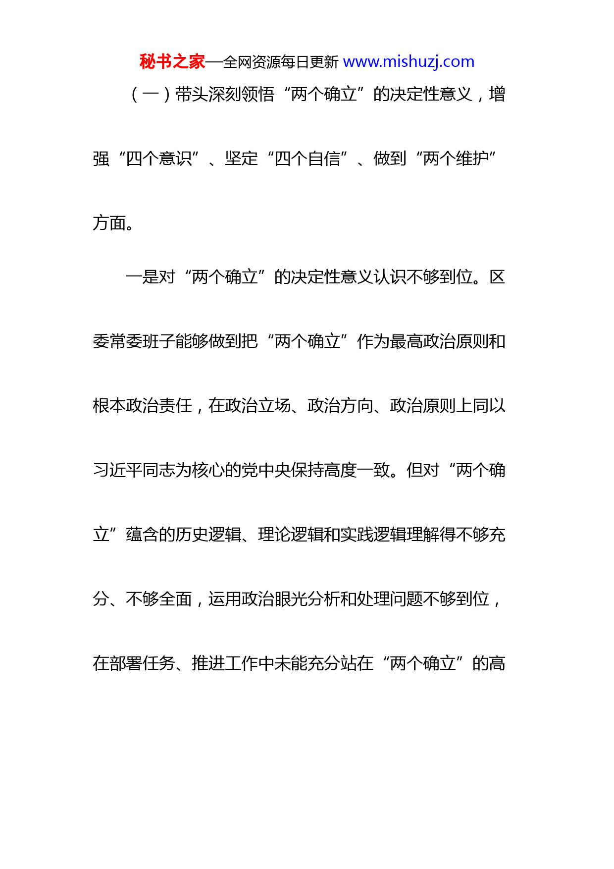 秘书之家—全网资源每日更新www.mishuzj.com区委常委班子2022年度民主生活会“六个带头”对照检查材料按照《关于认真开好2022年度县以上党和国家机关党员领导干部民主生活会的通知》要求,区委常委班子紧紧围绕主题,聚焦“六个带头”,认真组织学习研讨,深入开展谈心谈话,广泛征求意见建议,全面查摆突出问题,深刻剖析问题根源,明确具体整改措施和努力方向。经常委班子研究讨论,现对照检查如下。一、存在的主要问题秘书之家—全网资源每日更新www.mishuzj.com(一)带头深刻领悟“两个确立”的决定性意义,增强“四个意识”、坚定“四个自信”、做到“两个维护”方面。一是对“两个确立”的决定性意义认识不够到位。区委常委班子能够做到把“两个确立”作为最高政治原则和根本政治责任,在政治立场、政治方向、政治原则上同以习近平同志为核心的党中央保持高度一致。但对“两个确立”蕴含的历史逻辑、理论逻辑和实践逻辑理解得不够充分、不够全面,运用政治眼光分析和处理问题不够到位,在部署任务、推进工作中未能充分站在“两个确立”的高秘书之家—全网资源每日更新www.mishuzj.com度对标对表、校准偏差,致使部分政策举措发力不够精准、成效不够明显。二是对政治判断力、领悟力、执行力的理解把握还有欠缺。区委常委班子始终高度重视自身政治能力和履职能力建设,不断锤炼党性修养、提高政治素质,能够做到党中央提倡的坚决响应、党中央决定的坚决执行、党中央禁止的坚决不做。但从客观实际上看,在执行和落实党的路线方针政策过程中效率还不够高、成绩还不够理想,特别是对于提高政治“三力”关键要抓什么、怎么抓还缺乏深入思考,采取的具体措施还比较单一,考核评价标准还不够细化实化具体化。秘书之家—全网资源每日更新www.mishuzj.com(二)带头用习近平新时代中国特色社会主义思想凝心铸魂方面。一是理论武装不够深入。区委常委班子始终坚持以习近平新时代中国特色社会主义思想为指导,全年累计开展区委理论学习中心组集体学习xx场次,能够做到读原著、学原文、悟原理。但对一些党的创新理论在系统把握、学思践悟方面还存在不足。比如,对xx提出一系列新理论、新观念和新战略学习得不够深入、理解得不够透彻,距离融会贯通、学以致用的要求还有一定差距。再比如,对新发展理念把握不够精准,在解决我区产业分散、链条短、秘书之家—全网资源每日更新www.mishuzj.com产品附加值低和抵御市场风险能力不足等问题上仍然缺乏行之有效、务实管用的举措。二是学用结合不够紧密。区委常委班子始终坚持用习近平新时代中国特色社会主义思想指导实践、推动工作,但在具体落实的过程中,运用贯穿其中的立场观点解决问题还不够到位,距离以知促行、知行合一还有差距。比如,对于科技、人才等制约我区高质量发展的短板弱项,还缺少更广阔的思路、更有效的政策和更有针对性的举措。再比如,我区资源、区位优势明显,农产品丰富,但在推动产业集中集约集聚发展方面刚刚起步,特别是在延秘书之家—全网资源每日更新www.mishuzj.com伸产业链条、提升精深加工水平、扩大品牌影响力和健全社会化服务体系等方面还有很多工作要做。(三)在带头坚持和加强党的全面领导方面。一是对下级党组织的指导还不够有力。区委常委班子始终把坚持和加强党的全面领导贯穿经济社会发展各领域和全过程,但从实际效果来看,领导方式还需进一步优化。比如,对各级党组织围绕中心和大局开展工作督促指导不够到位,导致个别党组织没有把本职工作融入到全区发展大局中来谋划推动,对区委、政府作出的重大部署投入精力不多、工作举措不实。再比如,各地区各部门之间秘书之家—全网资源每日更新www.mishuzj.com协调联动不够顺畅,在解决一些涉及跨地区、跨部门问题过程中,存在推诿扯皮现象,尚未形成工作合力。二是基层党组织战斗堡垒作用发挥不明显。区委常委班子高度重视基层党建工作,深入实施基层党建提升工程,但也存在一些突出问题。比如,有的党组织引领示范作用发挥不够好,对产业发展研究谋划不够深入,个别村缺少能够带领群众增收致富的优势产业项目,部分村集体经济经营性收入占比较低。再比如,有的党组织破解“两张皮”问题的措施不实,就党建抓党建,没有找准党建工作与中心工作的结合点,党建与业务结合不够、融合不深、整合不足。秘书之家—全网资源每日更新www.mishuzj.com(四)在带头坚持以人民为中心的发展思想,推动改革发展稳定方面。一是保障和改善民生工作还需进一步加强。区委常委班子坚持把提升群众幸福感和满意度作为一项重大政治任务,扎实推进老旧小区改造、市容市貌整治和街巷道路贯通等项目建设,但仍有一些问题没有得到有效解决,民生领域还有很多短板要补。比如,通过人民网留言和信访来访情况了解,群众对个别住宅小区“办证难”文体活动场所紧缺、物业服务不到位等问题反应强烈。再比如,农村交通、水利、通讯等基础设施欠账还有很多,公共服务体系不够健全,人居环境治理成效有待进一步提升。秘书之家—全网资源每日更新www.mishuzj.com二是完整准确全面贯彻新发展理念还有差距。区委常委班子坚持把发展经济的着力点放在实体经济上,坚持生态优先