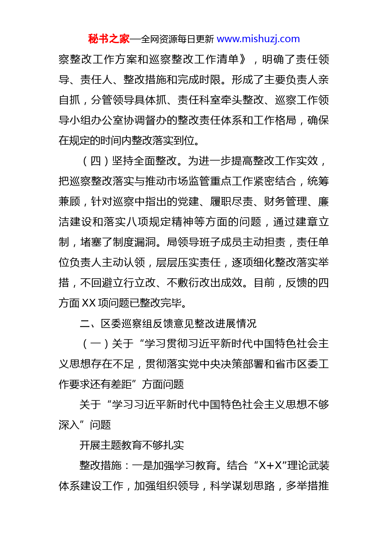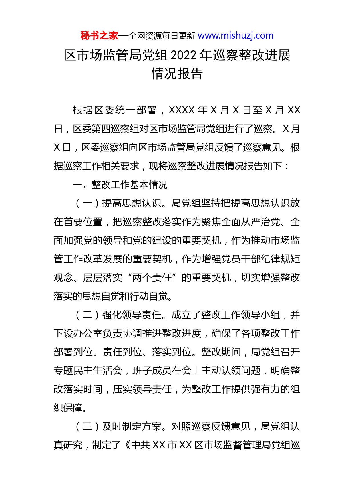 秘书之家—全网资源每日更新www.mishuzj.com区市场监管局党组2022年巡察整改进展情况报告根据区委统一部署,XXXX年X月X日至X月XX日,区委第四巡察组对区市场监管局党组进行了巡察。X月X日,区委巡察组向区市场监管局党组反馈了巡察意见。根据巡察工作相关要求,现将巡察整改进展情况报告如下:一、整改工作基本情况(一)提高思想认识。局党组坚持把提高思想认识放在首要位置,把巡察整改落实作为聚焦全面从严治党、全面加强党的领导和党的建设的重要契机,作为推动市场监管工作改革发展的重要契机,作为增强党员干部纪律规矩观念、层层落实“两个责任”的重要契机,切实增强整改落实的思想自觉和行动自觉。(二)强化领导责任。成立了整改工作领导小组,并下设办公室负责协调推进整改进度,确保了各项整改工作部署到位、责任到位、落实到位。整改期间,局党组召开专题民主生活会,班子成员在会上主动认领问题,明确整改落实时间,压实领导责任,为整改工作提供强有力的组织保障。(三)及时制定方案。对照巡察反馈意见,局党组认真研究,制定了《中共XX市XX区市场监督管理局党组巡秘书之家—全网资源每日更新www.mishuzj.com察整改工作方案和巡察整改工作清单》,明确了责任领导、责任人、整改措施和完成时限。形成了主要负责人亲自抓,分管领导具体抓、责任科室牵头整改、巡察工作领导小组办公室协调督办的整改责任体系和工作格局,确保在规定的时间内整改落实到位。(四)坚持全面整改。为进一步提高整改工作实效,把巡察整改落实与推动市场监管重点工作紧密结合,统筹兼顾,针对巡察中指出的党建、履职尽责、财务管理、廉洁建设和落实八项规定精神等方面的问题,通过建章立制,堵塞了制度漏洞。局领导班子成员主动担责,责任单位负责人主动认领,层层压实责任,逐项细化整改落实举措,不回避立行立改、不敷衍改出成效。目前,反馈的四方面XX项问题已整改完毕。二、区委巡察组反馈意见整改进展情况(一)关于“学习贯彻习近平新时代中国特色社会主义思想存在不足,贯彻落实党中央决策部署和省市区委工作要求还有差距”方面问题关于“学习习近平新时代中国特色社会主义思想不够深入”问题开展主题教育不够扎实整改措施:一是加强学习教育。结合“X+X”理论武装体系建设工作,加强组织领导,科学谋划思路,多举措推秘书之家—全网资源每日更新www.mishuzj.com动活动开展,持续巩固主题教育成果。二是丰富活动内容。XX月,组织各基层党组织开展了“喜庆二十大奋进新征程”主题党日;XX月开展了“学思践悟二十大凝心聚力干实事”主题党日活动,继续深入学习习近平新时代中国特色社会主义思想。理论学习滞后整改措施:一是抓关键少数。扎实开展党组中心组学习,丰富学习内容,严格学习程序,确保取得实效。二是抓全面覆盖。结合“三会一课”、主题党日等活动,组织全体党员干部“学深悟透”习近平新时代中国特色社会主义思想,切实以党的创新理论武装头脑、指导工作、推动实践。对理论武装重视不足整改措施:一是丰富党组中心组学习形式和内容,增加研讨发言内容,规范党组中心组学习记录;二是修订完善《党组议事制度》,将第一议题学习制度写入《党组议事制度》。关于“贯彻上级重大决策部署有差距,全面提升市场监管水平不够”问题依法行政意识不足,法治政府建设有差距整改措施:一是将法治建设纳入重要议事日程,局党组定期研究法治政府建设和行政执法工作,并做好相关记秘书之家—全网资源每日更新www.mishuzj.com录;二是规范案审会记录,对参会委员的发言进行详细记录,并在会议结束后,及时形成会议纪要存档。保障群众“舌尖上的安全”存在薄弱环节整改措施:一是制定快检室管理使用规范,配备固定检测人员,加强业务培训,提高检测能力;二是加大宣传引导力度,开展“开放日”等活动,邀请群众代表参观检测室,让更多的群众了解食品安全检测工作,提高群众参与食品安全监管的积极性和检测室设备使用率。电梯“保险+服务”试点工作推进缓慢整改措施:一是成立由分管区长任组长的XX区电梯“保险+服务”推进领导小组办公室,开展集中攻坚行动,加强协调,统筹推进,尽快提高电梯“保险+服务”覆盖率。二是各镇街成立工作专班,政府主要负责人亲自布置、分管科级干部带领工作专班和保险公司深入社区和物业公司讲政策、做工作,街道物业办、市场监管所全面配合,对推而不动或推动较慢的单独约谈,保证工作进展和效果。三是利用“安全生产月”“电梯安全宣传周”等方式,走进社区、走进商场、车站、公园等公共聚集场所,进行电梯安全知识及电梯保险的宣传,提高公众对电梯风险的认知水平,积极营造电梯“保险+服务”良好社会氛围。目前,XXXX台住宅电梯购买了电梯综合险,购买率达到X%。秘书之家—全网资源每日更新www.mishuzj.com消费者权益保障不力整改措施:一是开展消费环境优化专项行动,加强与行政审批服务部门的沟通协作,对办理工单涉及虚假注册的,分步采取“列入经营异常名录、吊销或撤销营业执照、函告电商平台下架处理”X项综合措施,逐步清理出市场。已函告区行政审批局撤销虚假注册XXXX家;二是对虚假注册集中的专业市场实行集中清理,其中虚假注册最集中的华丰副食品批发