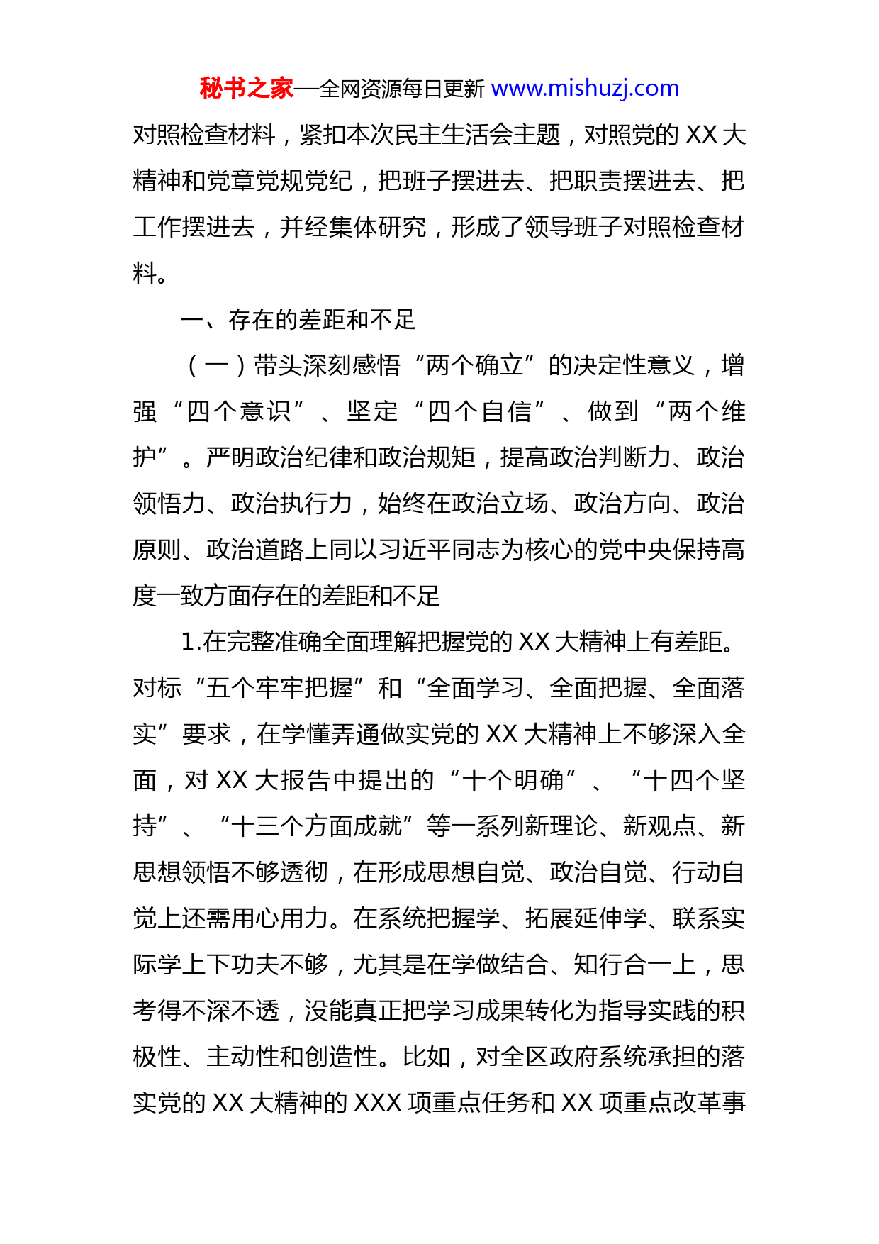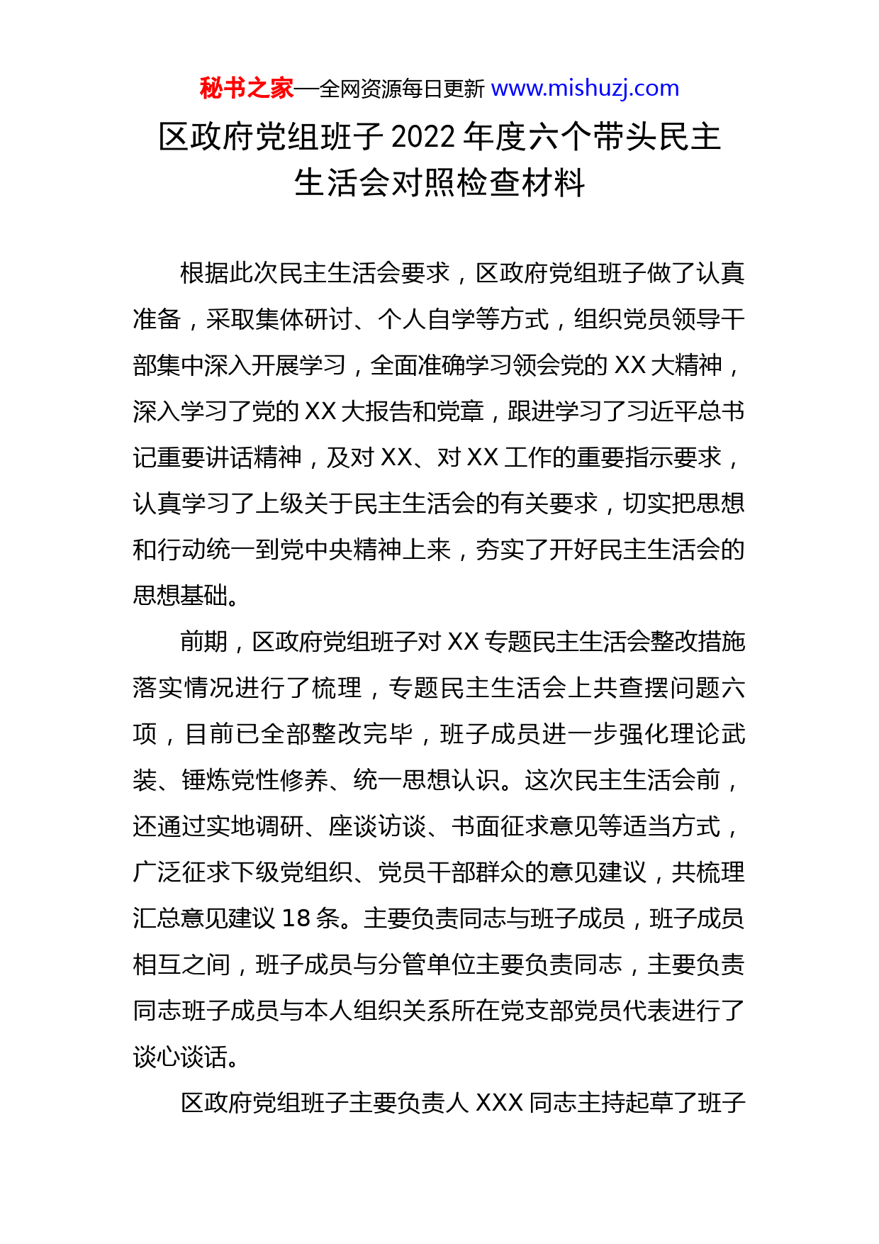 秘书之家—全网资源每日更新www.mishuzj.com区政府党组班子2022年度六个带头民主生活会对照检查材料根据此次民主生活会要求,区政府党组班子做了认真准备,采取集体研讨、个人自学等方式,组织党员领导干部集中深入开展学习,全面准确学习领会党的XX大精神,深入学习了党的XX大报告和党章,跟进学习了习近平总书记重要讲话精神,及对XX、对XX工作的重要指示要求,认真学习了上级关于民主生活会的有关要求,切实把思想和行动统一到党中央精神上来,夯实了开好民主生活会的思想基础。前期,区政府党组班子对XX专题民主生活会整改措施落实情况进行了梳理,专题民主生活会上共查摆问题六项,目前已全部整改完毕,班子成员进一步强化理论武装、锤炼党性修养、统一思想认识。这次民主生活会前,还通过实地调研、座谈访谈、书面征求意见等适当方式,广泛征求下级党组织、党员干部群众的意见建议,共梳理汇总意见建议18条。主要负责同志与班子成员,班子成员相互之间,班子成员与分管单位主要负责同志,主要负责同志班子成员与本人组织关系所在党支部党员代表进行了谈心谈话。区政府党组班子主要负责人XXX同志主持起草了班子秘书之家—全网资源每日更新www.mishuzj.com对照检查材料,紧扣本次民主生活会主题,对照党的XX大精神和党章党规党纪,把班子摆进去、把职责摆进去、把工作摆进去,并经集体研究,形成了领导班子对照检查材料。一、存在的差距和不足(一)带头深刻感悟“两个确立”的决定性意义,增强“四个意识”、坚定“四个自信”、做到“两个维护”。严明政治纪律和政治规矩,提高政治判断力、政治领悟力、政治执行力,始终在政治立场、政治方向、政治原则、政治道路上同以习近平同志为核心的党中央保持高度一致方面存在的差距和不足1.在完整准确全面理解把握党的XX大精神上有差距。对标“五个牢牢把握”和“全面学习、全面把握、全面落实”要求,在学懂弄通做实党的XX大精神上不够深入全面,对XX大报告中提出的“十个明确”、“十四个坚持”、“十三个方面成就”等一系列新理论、新观点、新思想领悟不够透彻,在形成思想自觉、政治自觉、行动自觉上还需用心用力。在系统把握学、拓展延伸学、联系实际学上下功夫不够,尤其是在学做结合、知行合一上,思考得不深不透,没能真正把学习成果转化为指导实践的积极性、主动性和创造性。比如,对全区政府系统承担的落实党的XX大精神的XXX项重点任务和XX项重点改革事秘书之家—全网资源每日更新www.mishuzj.com项,未能完全做到统筹起来推进、贯通起来落实,把学习成果转化为推动各项工作上水平的具体举措还不多,存在学用脱节的现象。2.在不断提高“政治三力”上有差距。不断提高政治判断力、政治领悟力、政治执行力,是习近平总书记对各级领导干部提出的要求。对一些复杂敏感问题,政府系统个别干部缺乏警惕性和判断力,对国际国内各种复杂局势还无法科学研判和准确把握;对党中央的各项决策部署,一些部门习惯性以会议落实会议,以文件落实文件,未能做到认真学习和严格执行。比如,习近平总书记在中央经济工作会上指出,要在落实碳达峰碳中和目标任务过程中锻造新的产业竞争优势。个别部门和领导干部未能准确领悟其中的理论精髓及核心要义,对传统产业转型升级和战略性新兴产业培育壮大等研究不够透彻,在全面推进能源、工业等重点领域绿色低碳转型方面缺乏有效举措,成效不够显著。3.在坚决做到“两个维护”上有差距。区政府党组班子在坚决扛起“两个维护”的重要政治责任上还不够有力,践行“两个维护”的制度机制仍需进一步健全,对党中央重大决策部署和习近平总书记重要指示批示贯彻落实的督查落实力度仍需进一步加大。比如,习近平总书记在中央经济工作会上指出,要把恢复和扩大消费摆在优先位置。秘书之家—全网资源每日更新www.mishuzj.com但面对如何增强消费能力、改善消费条件、创新消费场景等诸多切实问题,个别部门领导干部没有充分提高思想认识,研究消费鼓励、引导措施的主动性不强,仅把促消费当做商务、文旅部门的职责任务,没有立足稳增长大局,紧密结合部门职责出思路、定措施,在凝聚形成整体促消费合力上还存在薄弱环节。(二)带头用习近平新时代中国特色社会主义思想凝心铸魂。坚持用习近平新时代中国特色社会主义思想统一思想、统一意志、统一行动,做到学思用贯通、知信行统一,坚持好、运用好贯穿其中的立场观点方法,自觉把习近平新时代中国特色社会主义思想转化为坚定理想、锤炼党性和指导实践、推动工作的强大力量方面存在的差距和不足1.学习习近平新时代中国特色社会主义思想不系统,在学懂弄通上有差距。及时跟进学、原原本本学、联系实际学做得不到位,对习近平新时代中国特色社会主义思想的丰富内涵和精神实质理解还不透彻,一定程度上存在重业务、轻学习的心态和以会代学、以干代学的现象。比如,党组班子对习近平生态文明思想缺乏系统研究和深刻理解,在加强环境基础设施建设、实施污染物协同控制、增强污染整体防治能力方面下的功夫不足。2022年我区结构性污染问题仍然存在,全年PM2.5平均浓度为XX微克/秘书之家—全网资源每日更新www.mishuzj.com立方米,高于市区XX微