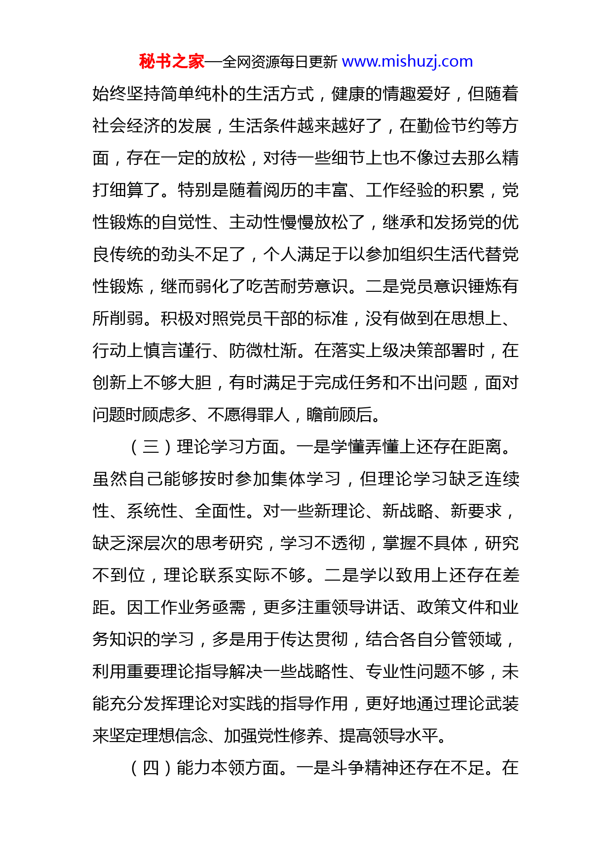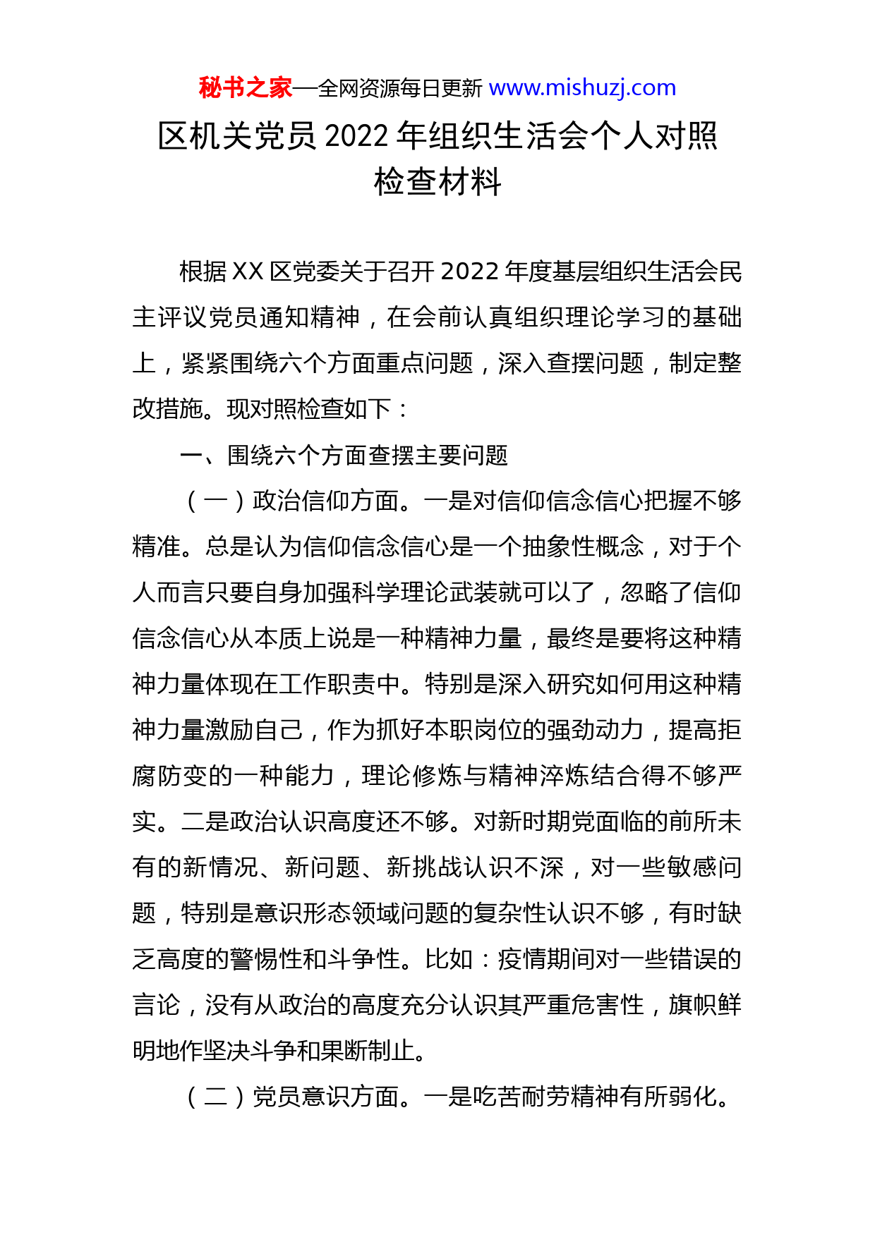 秘书之家—全网资源每日更新www.mishuzj.com区机关党员2022年组织生活会个人对照检查材料根据XX区党委关于召开2022年度基层组织生活会民主评议党员通知精神,在会前认真组织理论学习的基础上,紧紧围绕六个方面重点问题,深入查摆问题,制定整改措施。现对照检查如下:一、围绕六个方面查摆主要问题(一)政治信仰方面。一是对信仰信念信心把握不够精准。总是认为信仰信念信心是一个抽象性概念,对于个人而言只要自身加强科学理论武装就可以了,忽略了信仰信念信心从本质上说是一种精神力量,最终是要将这种精神力量体现在工作职责中。特别是深入研究如何用这种精神力量激励自己,作为抓好本职岗位的强劲动力,提高拒腐防变的一种能力,理论修炼与精神淬炼结合得不够严实。二是政治认识高度还不够。对新时期党面临的前所未有的新情况、新问题、新挑战认识不深,对一些敏感问题,特别是意识形态领域问题的复杂性认识不够,有时缺乏高度的警惕性和斗争性。比如:疫情期间对一些错误的言论,没有从政治的高度充分认识其严重危害性,旗帜鲜明地作坚决斗争和果断制止。(二)党员意识方面。一是吃苦耐劳精神有所弱化。秘书之家—全网资源每日更新www.mishuzj.com始终坚持简单纯朴的生活方式,健康的情趣爱好,但随着社会经济的发展,生活条件越来越好了,在勤俭节约等方面,存在一定的放松,对待一些细节上也不像过去那么精打细算了。特别是随着阅历的丰富、工作经验的积累,党性锻炼的自觉性、主动性慢慢放松了,继承和发扬党的优良传统的劲头不足了,个人满足于以参加组织生活代替党性锻炼,继而弱化了吃苦耐劳意识。二是党员意识锤炼有所削弱。积极对照党员干部的标准,没有做到在思想上、行动上慎言谨行、防微杜渐。在落实上级决策部署时,在创新上不够大胆,有时满足于完成任务和不出问题,面对问题时顾虑多、不愿得罪人,瞻前顾后。(三)理论学习方面。一是学懂弄懂上还存在距离。虽然自己能够按时参加集体学习,但理论学习缺乏连续性、系统性、全面性。对一些新理论、新战略、新要求,缺乏深层次的思考研究,学习不透彻,掌握不具体,研究不到位,理论联系实际不够。二是学以致用上还存在差距。因工作业务亟需,更多注重领导讲话、政策文件和业务知识的学习,多是用于传达贯彻,结合各自分管领域,利用重要理论指导解决一些战略性、专业性问题不够,未能充分发挥理论对实践的指导作用,更好地通过理论武装来坚定理想信念、加强党性修养、提高领导水平。(四)能力本领方面。一是斗争精神还存在不足。在秘书之家—全网资源每日更新www.mishuzj.com谋划分管领域和推进重点工作的本领上还有待于进一步提高,理论创新与实际情况结合不够紧密。特别是在解决一些瓶颈性、复杂性问题上,务实有效的招法不够多,统揽全局、驾驭复杂局面的领导能力上距离党和人民群众的要求还有一定的差距。二是抓工作落实的韧劲还有所不足。主要表现在推进工作落实的过程中,存在以会议落实会议、文件落实文件的现象。特别是在速度变化、动力转换、结构优化的经济发展新常态下,习惯于用老眼光、老思想、老办法、老经验看待、认识和解决新条件下的新问题,不能很好地适应新形势的发展需要。(五)作用发挥方面。本人能够自觉践行以人民为中心的发展思想,尊重群众意愿,为群众办实事解难题,增强人民群众获得感幸福感安全感,确保党永远保持同人民群众的血肉联系情况。但是在实践活动中,认为自己只是一名普通的党员,权责有限、能力有限,完成好任务就可以了,设身处地、深入群众了解所思所盼,千方百计、解放思想破解群众急难愁盼方面还需要进一步的加力。(六)纪律作风方面。踏石留印、抓铁有痕的劲头和苦干实干的思想根子扎的不够深,面对繁琐的工作任务,有时会疲于应付,满足于不超时、不出错,安于现状、按部就班,降低了工作标准。对新常态下如何更好地开展工作,主动研究不够,措施办法不多,凡事等着上级安排部秘书之家—全网资源每日更新www.mishuzj.com署。二、存在问题原因剖析(一)理论学习不够系统。政治理论学习方面,多以“学习强国”“青海党建”等手机网络、报刊杂志媒介的“快餐式”“碎片化”学习为主,对习近平新时代中国特色社会主义思想、党章党规以及革命先辈和先进典型的学习上,缺乏系统性的研究掌握,没有真正将新理念、新方法、新成效,内化于心、外化于行,指导实践、推动工作。存在实用主义现象,与工作相关的知识能够积极主动学习,对暂时性用不上的有选择性学习,使得自身知识结构缺乏系统性和全面性。(二)党性修养不够经常。作为一名共产党员,长期以来非常重视加强党性锻炼,始终从讲政治、讲党性的高度严格要求自己,在思想上、政治上、作风上都得到了全面提升。但对照党中央和习近平总书记的号召、党员标准,发现自己对保持党员先进性和纯洁性的追求有所放松,时刻用高标准严格要求自己还不够,潜意识里有了“吃老本”的思想。(三)宗旨意识还不够强。在牢固树立以人民为中心的发展理念中,听取群众意见较少,在想问题、作决策、办事情上设身处地为群众着想不够,更多的精力放在了完成上级交办的任务上,为人民服务的宗旨意识有所淡化,秘书之家—全网资