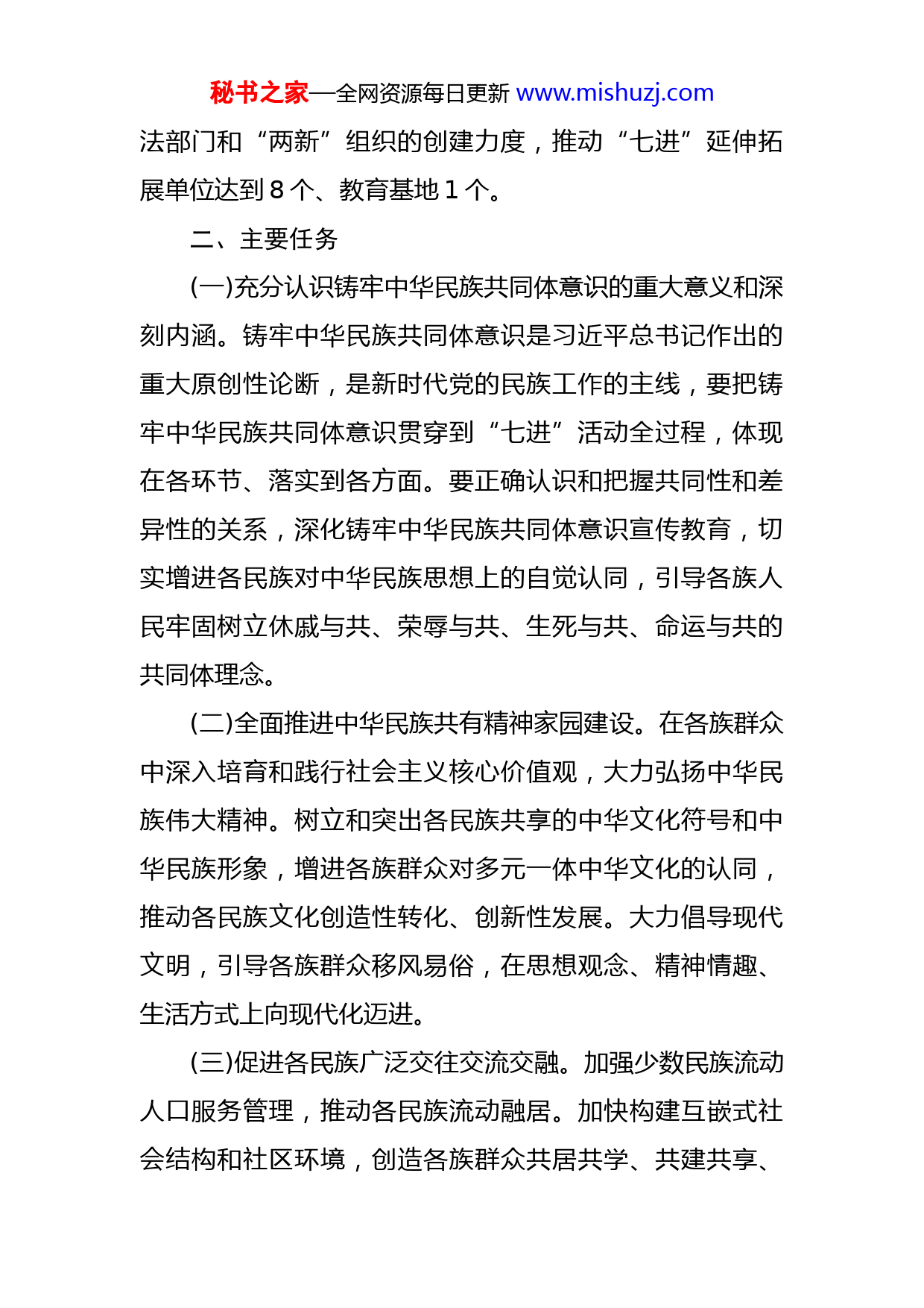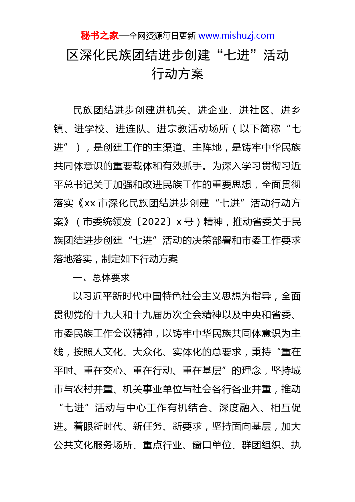 秘书之家—全网资源每日更新www.mishuzj.com区深化民族团结进步创建“七进”活动行动方案民族团结进步创建进机关、进企业、进社区、进乡镇、进学校、进连队、进宗教活动场所(以下简称“七进”),是创建工作的主渠道、主阵地,是铸牢中华民族共同体意识的重要载体和有效抓手。为深入学习贯彻习近平总书记关于加强和改进民族工作的重要思想,全面贯彻落实《xx市深化民族团结进步创建“七进”活动行动方案》(市委统领发〔2022〕x号)精神,推动省委关于民族团结进步创建“七进”活动的决策部署和市委工作要求落地落实,制定如下行动方案一、总体要求以习近平新时代中国特色社会主义思想为指导,全面贯彻党的十九大和十九届历次全会精神以及中央和省委、市委民族工作会议精神,以铸牢中华民族共同体意识为主线,按照人文化、大众化、实体化的总要求,秉持“重在平时、重在交心、重在行动、重在基层”的理念,坚持城市与农村并重、机关事业单位与社会各行各业并重,推动“七进”活动与中心工作有机结合、深度融入、相互促进。着眼新时代、新任务、新要求,坚持面向基层,加大公共文化服务场所、重点行业、窗口单位、群团组织、执秘书之家—全网资源每日更新www.mishuzj.com法部门和“两新”组织的创建力度,推动“七进”延伸拓展单位达到8个、教育基地1个。二、主要任务(一)充分认识铸牢中华民族共同体意识的重大意义和深刻内涵。铸牢中华民族共同体意识是习近平总书记作出的重大原创性论断,是新时代党的民族工作的主线,要把铸牢中华民族共同体意识贯穿到“七进”活动全过程,体现在各环节、落实到各方面。要正确认识和把握共同性和差异性的关系,深化铸牢中华民族共同体意识宣传教育,切实增进各民族对中华民族思想上的自觉认同,引导各族人民牢固树立休戚与共、荣辱与共、生死与共、命运与共的共同体理念。(二)全面推进中华民族共有精神家园建设。在各族群众中深入培育和践行社会主义核心价值观,大力弘扬中华民族伟大精神。树立和突出各民族共享的中华文化符号和中华民族形象,增进各族群众对多元一体中华文化的认同,推动各民族文化创造性转化、创新性发展。大力倡导现代文明,引导各族群众移风易俗,在思想观念、精神情趣、生活方式上向现代化迈进。(三)促进各民族广泛交往交流交融。加强少数民族流动人口服务管理,推动各民族流动融居。加快构建互嵌式社会结构和社区环境,创造各族群众共居共学、共建共享、秘书之家—全网资源每日更新www.mishuzj.com共事共乐和迁徙流动的社会条件,逐步实现各民族在空间、文化、经济、社会、心理等方面的全方位嵌入。加大城市民族工作力度,合理照顾少数民族风俗习惯,帮助解决就业、就医、就学、社保、落户、住房租赁等方面的问题。(四)提升民族事务治理体系和治理能力现代化水平。统筹推进区域内各民族共同发展,保障发展成果公平惠及各族群众。树立法治思维,把民族事务纳入共建共治共享的社会治理格局。提高依法治理民族事务的能力,加强法制宣传教育,坚持一视同仁、一断于法,依法妥善处理涉民族因素的案件,保证各族公民平等享有权利、平等履行义务,确保民族事务治理在法治轨道上运行。(五)坚决防范民族领域重大风险隐患。全面落实总体国家安全观,坚持底线思维,强化风险意识,有针对性地做好少数民族代表人士、知识分子形势教育,引导广大干部群众认清境内外敌对势力利用民族问题干扰破坏的图谋。维护民族领域意识形态安全,及时排查调处和防范化解涉及民族因素的风险隐患和矛盾纠纷,坚决防范民族领域发生“黑天鹅”灰犀牛”事件。(六)纵深推进“xx民族团结进步示范走廊”创建行动。注重全局性、保持连续性、强化开创性,积极参加河西五市联创共建、互观互检,建立正向激励、动态管理机秘书之家—全网资源每日更新www.mishuzj.com制,积极参与“河西铸牢中华民族共同体意识示范走廊”建设,推动“河西民族团结进步示范走廊”创建行动纵深开展,持续打造一批特色鲜明、亮点突出、成效明显的示范典型,争创全省民族团结进步示范区。三、具体要求民族团结进步创建“七进”活动,既要全面贯彻落实中央决策部署和省委、市委、区委关于民族团结进步创建工作的相关要求,更要从自身职能职责和工作实际出发,按照“因地制宜、突出重点、体现特色、持续用力”的要求,切实找准与社会心理的契合点、与民族情感的共鸣点、与群众利益的结合点,深化内涵、丰富形式、创新方法,不断推动创建工作全面深入持久开展。(一)进机关民族团结进步创建“进机关”,就是要发挥好各级机关的带头表率作用,不仅要提高对创建工作的重视程度,使铸牢中华民族共同体意识根植各族干部心灵深处,更要结合本职工作,把党和国家的各项民族政策真正运用好、落实好。1.在带头学习贯彻民族政策上做表率。各级各部门单位要坚持用习近平总书记关于加强和改进民族工作的重要思想武装头脑,各级党委(党组)理论学习中心组每年至少安排一次铸牢中华民族共同体意识专题学习。各部门单位秘书之家—全网资源每日更新www.mishuzj.com把民族团结进步创建工作纳入干部日常学习培训,与中心工作有机结合、深度融入,与精神文明创建、