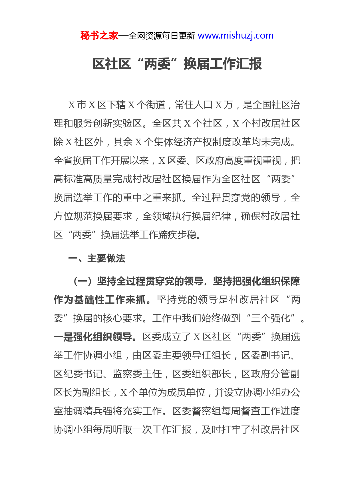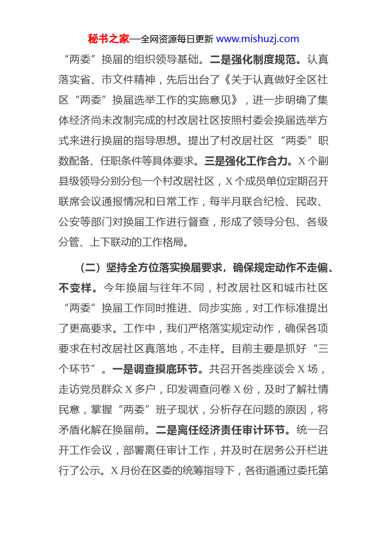 秘书之家—全网资源每日更新www.mishuzj.com区社区“两委”换届工作汇报X市X区下辖X个街道,常住人口X万,是全国社区治理和服务创新实验区。全区共X个社区,X个村改居社区除X社区外,其余X个集体经济产权制度改革均未完成。全省换届工作开展以来,X区委、区政府高度重视重视,把高标准高质量完成村改居社区换届作为全区社区“两委”换届选举工作的重中之重来抓。全过程贯穿党的领导,全方位规范换届要求,全领域执行换届纪律,确保村改居社区“两委”换届选举工作蹄疾步稳。一、主要做法(一)坚持全过程贯穿党的领导,坚持把强化组织保障作为基础性工作来抓。坚持党的领导是村改居社区“两委”换届的核心要求。工作中我们始终做到“三个强化”。一是强化组织领导。区委成立了X区社区“两委”换届选举工作协调小组,由区委主要领导任组长,区委副书记、区纪委书记、监察委主任,区委组织部长,区政府分管副区长为副组长,X个单位为成员单位,并设立协调小组办公室抽调精兵强将充实工作。区委督察组每周督查工作进度协调小组每周听取一次工作汇报,及时打牢了村改居社区秘书之家—全网资源每日更新www.mishuzj.com“两委”换届的组织领导基础。二是强化制度规范。认真落实省、市文件精神,先后出台了《关于认真做好全区社区“两委”换届选举工作的实施意见》,进一步明确了集体经济尚未改制完成的村改居社区按照村委会换届选举方式来进行换届的指导思想。提出了村改居社区“两委”职数配备、任职条件等具体要求。三是强化工作合力。X个副县级领导分别分包一个村改居社区,X个成员单位定期召开联席会议通报情况和日常工作,每半月联合纪检、民政、公安等部门对换届工作进行督查,形成了领导分包、各级分管、上下联动的工作格局。(二)坚持全方位落实换届要求,确保规定动作不走偏、不变样。今年换届与往年不同,村改居社区和城市社区“两委”换届工作同时推进、同步实施,对工作标准提出了更高要求。工作中,我们严格落实规定动作,确保各项要求在村改居社区真落地,不走样。目前主要是抓好“三个环节”。一是调查摸底环节。共召开各类座谈会X场,走访党员群众X多户,印发调查问卷X份,及时了解社情民意,掌握“两委”班子现状,分析存在问题的原因,将矛盾化解在换届前。二是离任经济责任审计环节。统一召开工作会议,部署离任审计工作,并及时在居务公开栏进行了公示。X月份在区委的统筹指导下,各街道通过委托第秘书之家—全网资源每日更新www.mishuzj.com三方专业审计机构同步开展了对X个村改居社区的村改居社区成员任期和离任经济责任、社区居委会财务收支审计工作,并及时在居务公开栏进行了公示。三是“两委”职数设置环节。从严控制“两委”职数,明确村改居社区参考村委会配备“两委”职数,一般为X-X人,确保“两委”人员的精干、高效。(三)坚持全领域执行换届纪律,持续深化各项规定的刚性约束。一是通过政府网站、墙报标语、居委会大喇叭等大张旗鼓地宣传发动换届纪律的各项规定,确保各项规定在村改居社区“入户、入脑、入心”。二是组织收看严肃换届工作纪律的宣传片,并要求各街道针对村改居换届选举的不同特点因村施策,拿出可执行的措施来确保有序推进。三是编发《X区社区“两委”换届选举工作手册》X本、印发《中华人民共和国村委会组织法》X本、“九严禁、十不准”“六个做到、六个严禁”、“十类不宜确定为社区“两委”成员候选人”宣传海报X余份、画册X余份。通过强大的宣传攻势,真正在村改居社区居民中形成防范和打击不正当竞争行为的强大声势。二、存在的问题目前,X区村改居社区“两委”换届选举工作已顺利进展至党组织候选人资格审查环节。虽然取得了阶段性的成秘书之家—全网资源每日更新www.mishuzj.com果,但离上级要求和群众期盼仍然存在一些距离,主要表现在:一是村改居社区管辖人口多和“两委”职数偏少的矛盾比较突出。X村改居社区普遍居民较多,多数在X人以上,最多的南村社区达X万人,换届后职数偏少将对社区治理服务提出更高的要求。二是随着城市化进程的加快,X区目前村改居社区普遍存在拆迁任务,居民更希望保持目前“两委”班子稳定状态。三、下一步打算下一步区委、区政府将持续抓好村改居社区换届的后续工作,主要在四个“始终坚持”上下功夫。一是始终坚持党的领导。进一步突出党的领导这个主题主线,牢牢把握村改居社区换届选举的正确方向。二是始终坚持规范有序推进。进一步把村改居社区换届选举的各项要求和规定具体化,确保全过程有章可循,不变通、不走样。三是始终坚持问题导向。建立全区村改居社区“两委”换届选举重大事件、重要信息及时报送制度,及时防范和化解各类矛盾,做到发现在早、防范在先、处置在小四是始终坚持把纪律规定挺在前面。针对村改居社区矛盾问题相对多发的实际情况,坚持有报必查、露头就打,持续保持打击不正当竞选行为的高压姿态。各街道开通了方秘书之家—全网资源每日更新www.mishuzj.com便群众举报的绿色通道,对违法、违纪行为发现一起,查处一起。
