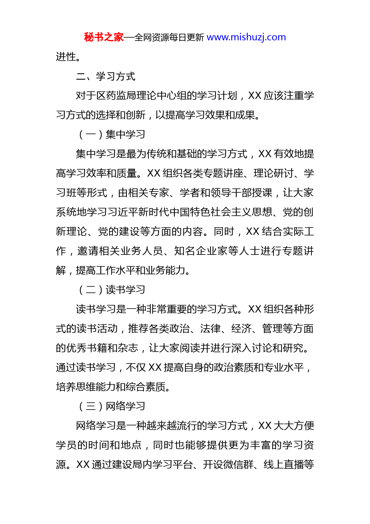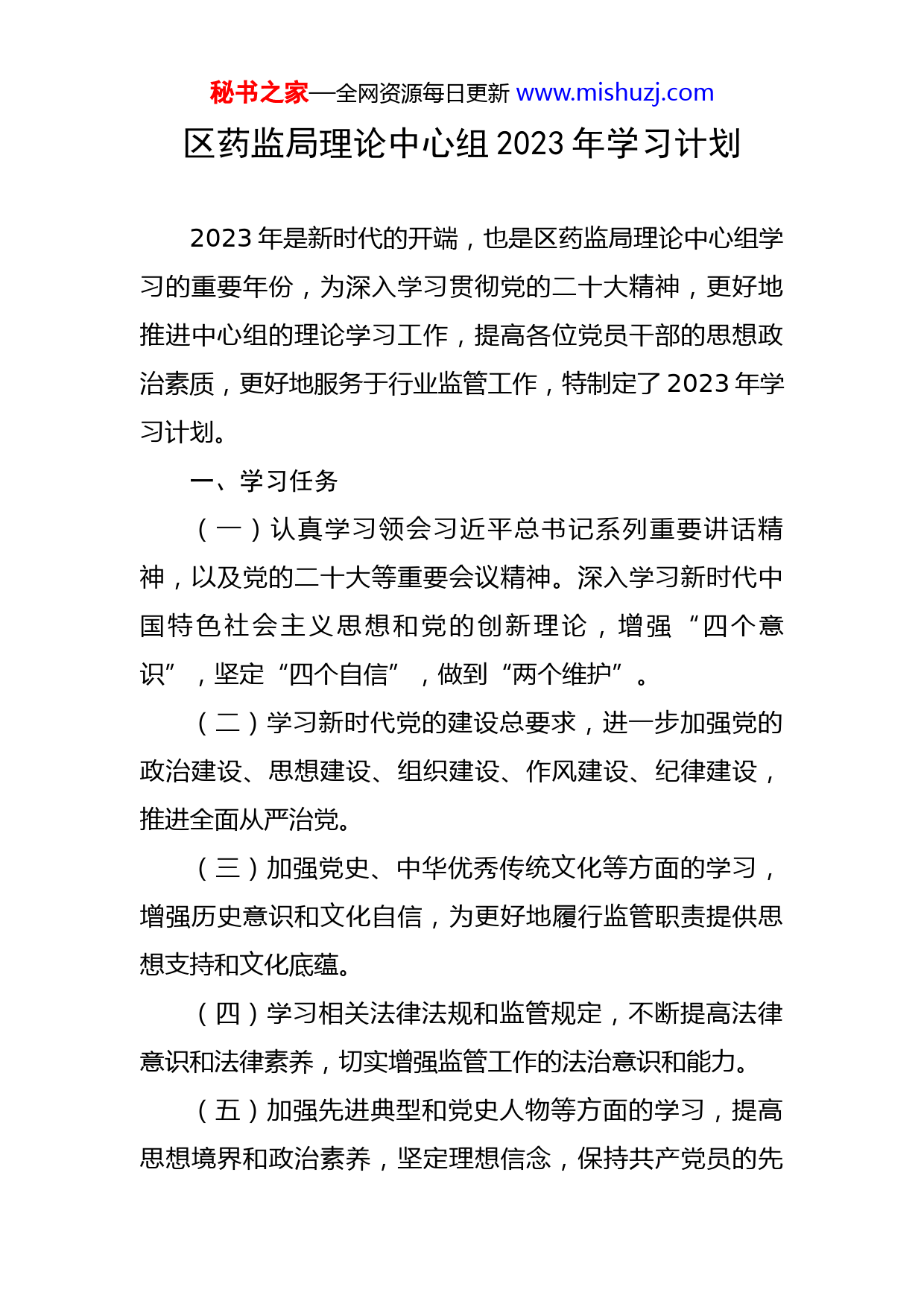 秘书之家—全网资源每日更新www.mishuzj.com区药监局理论中心组2023年学习计划2023年是新时代的开端,也是区药监局理论中心组学习的重要年份,为深入学习贯彻党的二十大精神,更好地推进中心组的理论学习工作,提高各位党员干部的思想政治素质,更好地服务于行业监管工作,特制定了2023年学习计划。一、学习任务(一)认真学习领会习近平总书记系列重要讲话精神,以及党的二十大等重要会议精神。深入学习新时代中国特色社会主义思想和党的创新理论,增强“四个意识”,坚定“四个自信”,做到“两个维护”。(二)学习新时代党的建设总要求,进一步加强党的政治建设、思想建设、组织建设、作风建设、纪律建设,推进全面从严治党。(三)加强党史、中华优秀传统文化等方面的学习,增强历史意识和文化自信,为更好地履行监管职责提供思想支持和文化底蕴。(四)学习相关法律法规和监管规定,不断提高法律意识和法律素养,切实增强监管工作的法治意识和能力。(五)加强先进典型和党史人物等方面的学习,提高思想境界和政治素养,坚定理想信念,保持共产党员的先秘书之家—全网资源每日更新www.mishuzj.com进性。二、学习方式对于区药监局理论中心组的学习计划,XX应该注重学习方式的选择和创新,以提高学习效果和成果。(一)集中学习集中学习是最为传统和基础的学习方式,XX有效地提高学习效率和质量。XX组织各类专题讲座、理论研讨、学习班等形式,由相关专家、学者和领导干部授课,让大家系统地学习习近平新时代中国特色社会主义思想、党的创新理论、党的建设等方面的内容。同时,XX结合实际工作,邀请相关业务人员、知名企业家等人士进行专题讲解,提高工作水平和业务能力。(二)读书学习读书学习是一种非常重要的学习方式。XX组织各种形式的读书活动,推荐各类政治、法律、经济、管理等方面的优秀书籍和杂志,让大家阅读并进行深入讨论和研究。通过读书学习,不仅XX提高自身的政治素质和专业水平,培养思维能力和综合素质。(三)网络学习网络学习是一种越来越流行的学习方式,XX大大方便学员的时间和地点,同时也能够提供更为丰富的学习资源。XX通过建设局内学习平台、开设微信群、线上直播等秘书之家—全网资源每日更新www.mishuzj.com方式,为大家提供相关学习资料和视频,进行网上交流和学习。同时,XX利用互联网资源,自主学习,例如利用网络学习平台上的MOOC课程等。(四)实践学习实践学习是一种非常重要的学习方式,XX让大家在实际工作中不断学习、实践和总结。XX组织实地考察、调研、交流等方式,让大家深入到基层一线,了解工作实际,进行实践学习。通过实践学习,XX加深理论学习的印象,增加实践经验,同时也能够推动实际工作的改进和提升。三、学习内容(一)学习习近平总书记系列重要讲话精神。要认真学习领会习近平总书记在不同场合的重要讲话,深刻领会其中蕴含的思想内涵,贯彻落实到具体工作中。(二)学习新时代中国特色社会主义思想和党的创新理论。要深入学习新时代中国特色社会主义思想,领会其时代背景和重要内涵,学习和掌握习近平新时代中国特色社会主义思想,不断提高政治站位和领导能力。(三)学习党的建设总要求,要认真学习党的二十大精神和全国党建工作会议精神,学习领会新时代党的建设总要求,加强自身建设,不断提高党性修养和理论水平。(四)学习党史、中华优秀传统文化等方面内容。要秘书之家—全网资源每日更新www.mishuzj.com深入学习党的历史和光辉成就,领会党的优良传统和先进经验,学习中华优秀传统文化,增强文化自信和民族自豪感。(五)学习法律法规和监管规定。要认真学习相关法律法规和监管规定,增强法治意识和法律素养,为履行监管职责提供法律支持。四、学习目标学习目标是指在学习过程中所要达到的目标和要求,对于区药监局理论中心组的学习计划,XX应该注重学习目标的制定和实现,以确保学习的针对性和实效性。(一)提高政治素质要深入学习习近平新时代中国特色社会主义思想,全面贯彻落实党的创新理论,进一步加强自身的党性修养和政治思想认识。通过学习,增强理论自信,始终保持清醒的政治头脑,牢固树立“四个意识”,坚定“四个自信”,始终做到与党中央保持一致。(二)提升业务能力要认真学习行业和工作的相关知识和技能,加强对于行业发展趋势和政策法规的了解和把握,提高工作的科学性和实效性。同时,要注重锤炼实战能力,通过实践和交流,提高自身的组织协调、沟通协调、信息处理、决策能力等方面的能力。秘书之家—全网资源每日更新www.mishuzj.com(三)加强队伍建设要注重团队建设,通过学习和交流,加强团队协作、凝聚力和创新能力,形成良好的学习氛围和团队文化。同时,要注重人才培养,通过学习和交流,挖掘和培养新型的业务人才和领导干部,促进队伍的优化和升级。(四)提高党建工作质量提高党建工作质量也是学习的重要目标,要认真学习和贯彻党的建设相关方面的理论和政策,加强对党的建设工作的认识和把握,以党的建设为引领,推进各项工作的发展。通过学习和交流,不断提高党的建设工作的科学性、规范性和实效性,确保党的建设与工作发展相互促进、相互支持。区药监局理论中心组2023年学习计划的制定是为了进一步推进党的建设工作,提高
