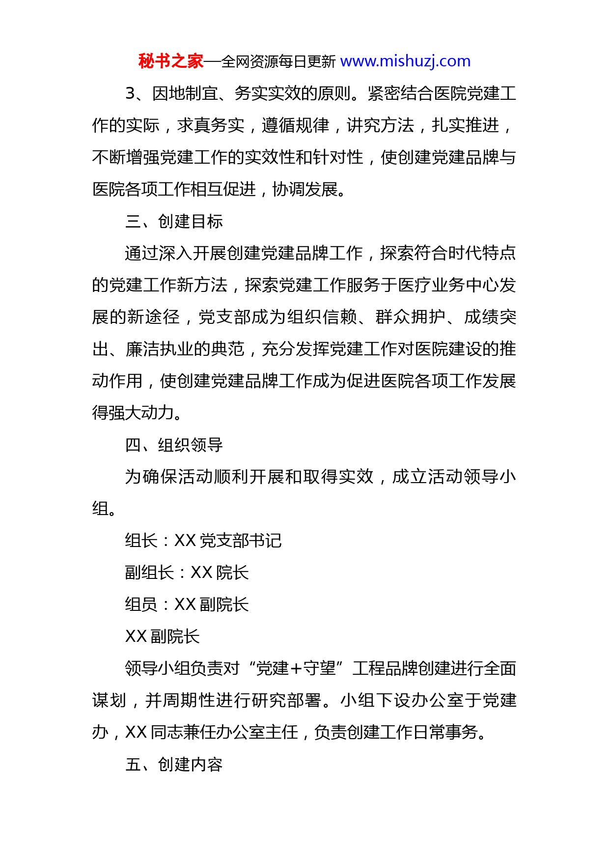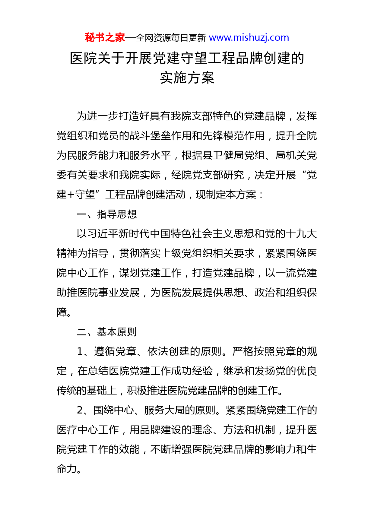 秘书之家—全网资源每日更新www.mishuzj.com医院关于开展党建守望工程品牌创建的实施方案为进一步打造好具有我院支部特色的党建品牌,发挥党组织和党员的战斗堡垒作用和先锋模范作用,提升全院为民服务能力和服务水平,根据县卫健局党组、局机关党委有关要求和我院实际,经院党支部研究,决定开展“党建+守望”工程品牌创建活动,现制定本方案:一、指导思想以习近平新时代中国特色社会主义思想和党的十九大精神为指导,贯彻落实上级党组织相关要求,紧紧围绕医院中心工作,谋划党建工作,打造党建品牌,以一流党建助推医院事业发展,为医院发展提供思想、政治和组织保障。二、基本原则1、遵循党章、依法创建的原则。严格按照党章的规定,在总结医院党建工作成功经验,继承和发扬党的优良传统的基础上,积极推进医院党建品牌的创建工作。2、围绕中心、服务大局的原则。紧紧围绕党建工作的医疗中心工作,用品牌建设的理念、方法和机制,提升医院党建工作的效能,不断增强医院党建品牌的影响力和生命力。秘书之家—全网资源每日更新www.mishuzj.com3、因地制宜、务实实效的原则。紧密结合医院党建工作的实际,求真务实,遵循规律,讲究方法,扎实推进,不断增强党建工作的实效性和针对性,使创建党建品牌与医院各项工作相互促进,协调发展。三、创建目标通过深入开展创建党建品牌工作,探索符合时代特点的党建工作新方法,探索党建工作服务于医疗业务中心发展的新途径,党支部成为组织信赖、群众拥护、成绩突出、廉洁执业的典范,充分发挥党建工作对医院建设的推动作用,使创建党建品牌工作成为促进医院各项工作发展得强大动力。四、组织领导为确保活动顺利开展和取得实效,成立活动领导小组。组长:XX党支部书记副组长:XX院长组员:XX副院长XX副院长领导小组负责对“党建+守望”工程品牌创建进行全面谋划,并周期性进行研究部署。小组下设办公室于党建办,XX同志兼任办公室主任,负责创建工作日常事务。五、创建内容秘书之家—全网资源每日更新www.mishuzj.com医院党建工作“党建+守望”工程创建活动内容为:(一)守望初心一是继续开展好“不忘初心、牢记使命”主题教育,加强思想理论学习。充分利用好支部书记上党课、集中学习会、主题党日等学习活动,积极组织全院党员干部贯彻学习党的十九大精神及习近平新时代中国特色社会主义思想,坚持好读原著、学原文、悟原理,深入学习习近平新时代中国特色社会主义思想,加深对党的核心规章制度的掌握领悟。二是利用好早会、职工大会等开展好会前学法活动,加大对宪法等法律法规的知识学习。年度内集中学习课时不低于32课时,不断促进提高职工队伍思想水平、理论水平、业务水平和服务水平,强化树立“不忘天使初心,牢记医者使命”理念。(二)守望健康一是持续推进“党建+医疗惠民”。为更好地为人民群众提供医疗服务,拓展业务范围,强化建设急诊科、乳腺科(外科)、月子中心等新科室,拓展建设手术室、产房等原有科室,形成科室协调发展、服务范围有序扩展、服务能力全面提升局面;二是全面实施“医疗惠民”工程,以“医联体”和“医共体”建设为纽带,加强与XX医院、XX医院等知名三甲医院建立合作,继续引进先进医疗技术,发挥传帮带作用,增强我院为民服务能力;三是切秘书之家—全网资源每日更新www.mishuzj.com实提升就医便捷度,通过增加自助缴费机,完善线上线下缴费挂号、自助查询等服务功能,让群众摆脱“换一家医院办一张卡”及“多跑冤枉路”的烦恼;四是抓好“绿色通道”建设,畅通急救道路,全面实施好“先诊疗后付费”就医模式,通过“一站式”结算服务,减少患者排队缴费、医保报销次数,确保病人在第一时间内得到安全有效治疗,尽最大努力减轻病人的经济负担,有效解决住院患者及贫困人员“看病难、看病贵”的问题。(三)守望先锋坚持高标准,严要求,巩固五好党支部创建成果,强化基层党支部堡垒作用。一是开展创优争先活动,对全体党员严格考核,认真把关,择优选择影响面大、基础性强、代表作用突出的岗位作为党员示范岗位,住院科室的设置责任病房;二是突出先锋模范作用,立医德、正医风、强医能,认真做好营商环境优化,严禁出现“生冷硬顶推”等现象,以抓党风带作风提行风;三是扎实对标结对共建,以支部联系帮扶八庙镇何家坪村为纽带,深入开展健康扶贫、脱贫产业帮扶、贫困户节日慰问等扶工作,努力实现“全面建成小康社会,不让一个人掉队”的目标。六、实施步骤(一)学习宣传阶段(2020年5月-6月)。医院党秘书之家—全网资源每日更新www.mishuzj.com支部结合单位实际,制定活动方案,成立活动机构,在调查摸底的基础上,明确目标任务,启动开展活动。(二)组织创建阶段(2029年6月—11月)。医院党支部按照部署要求,对照方案及党建工作考核细则,分析本支部各个党员实际能力和自身特点,指导党员有针对性地开展活动,党员通过承诺职责、与党支部签订协议等方式,公示接受监督。(三)巩固深化阶段(2020年12—长期)。医院党支部就活动开展情况进行总结回顾,实事求是肯定成绩、指出不足;同时,注重活动成果的运用,把活动的开展作为医院发展大促进、创先争优大提升、医院管理大进步的载体,着力建立健全医院党员发挥作用的长效机制。