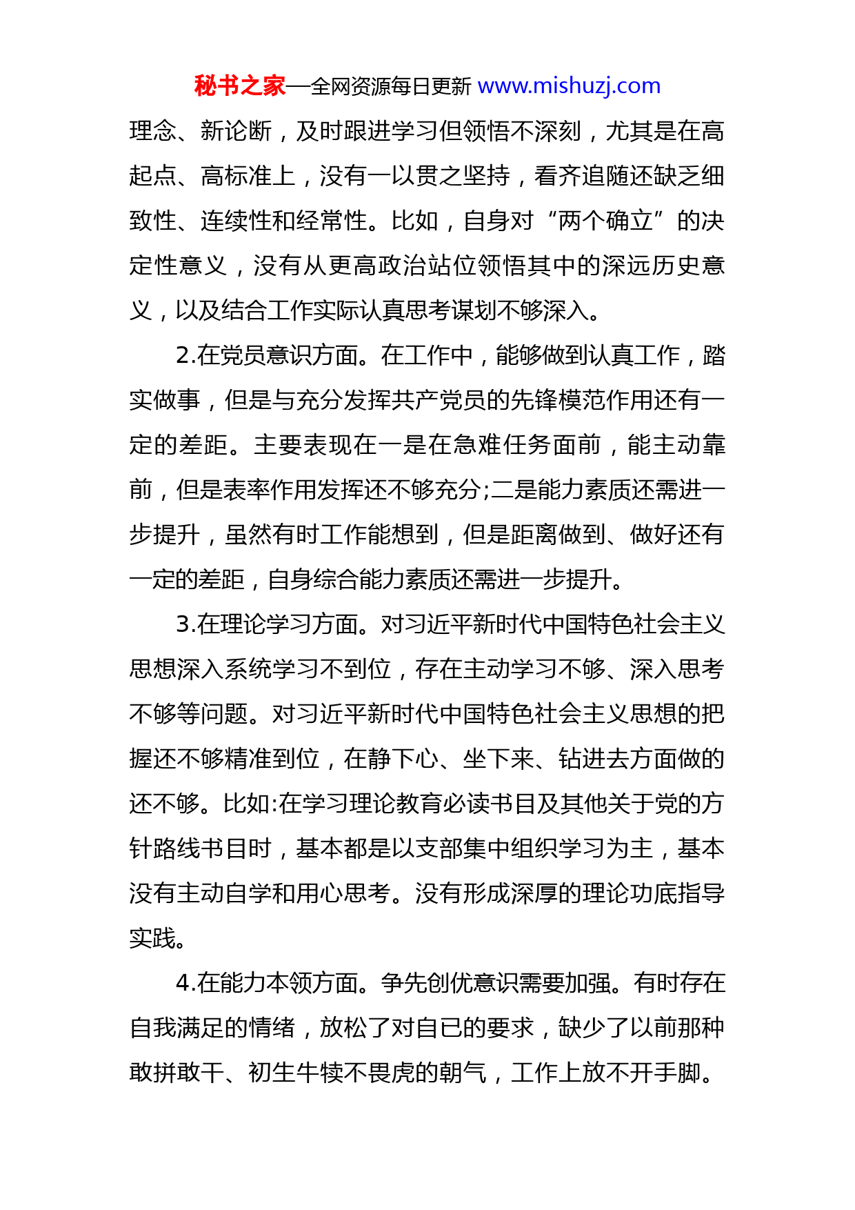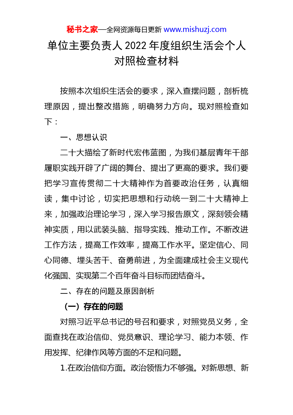 秘书之家—全网资源每日更新www.mishuzj.com单位主要负责人2022年度组织生活会个人对照检查材料按照本次组织生活会的要求,深入查摆问题,剖析梳理原因,提出整改措施,明确努力方向。现对照检查如下:一、思想认识二十大描绘了新时代宏伟蓝图,为我们基层青年干部履职实践开辟了广阔的舞台、提出了更高的要求。我们要把学习宣传贯彻二十大精神作为首要政治任务,认真细读,集中讨论,切实把思想和行动统一到二十大精神上来,加强政治理论学习,深入学习报告原文,深刻领会精神实质,用以武装头脑、指导实践、推动工作。不断改进工作方法,提高工作效率,提高工作水平。坚定信心、同心同德、埋头苦干、奋勇前进,为全面建成社会主义现代化强国、实现第二个百年奋斗目标而团结奋斗。二、存在的问题及原因剖析(一)存在的问题对照习近平总书记的号召和要求,对照党员义务,全面查找在政治信仰、党员意识、理论学习、能力本领、作用发挥、纪律作风等方面的不足和问题。1.在政治信仰方面。政治领悟力不够强。对新思想、新秘书之家—全网资源每日更新www.mishuzj.com理念、新论断,及时跟进学习但领悟不深刻,尤其是在高起点、高标准上,没有一以贯之坚持,看齐追随还缺乏细致性、连续性和经常性。比如,自身对“两个确立”的决定性意义,没有从更高政治站位领悟其中的深远历史意义,以及结合工作实际认真思考谋划不够深入。2.在党员意识方面。在工作中,能够做到认真工作,踏实做事,但是与充分发挥共产党员的先锋模范作用还有一定的差距。主要表现在一是在急难任务面前,能主动靠前,但是表率作用发挥还不够充分;二是能力素质还需进一步提升,虽然有时工作能想到,但是距离做到、做好还有一定的差距,自身综合能力素质还需进一步提升。3.在理论学习方面。对习近平新时代中国特色社会主义思想深入系统学习不到位,存在主动学习不够、深入思考不够等问题。对习近平新时代中国特色社会主义思想的把握还不够精准到位,在静下心、坐下来、钻进去方面做的还不够。比如:在学习理论教育必读书目及其他关于党的方针路线书目时,基本都是以支部集中组织学习为主,基本没有主动自学和用心思考。没有形成深厚的理论功底指导实践。4.在能力本领方面。争先创优意识需要加强。有时存在自我满足的情绪,放松了对自已的要求,缺少了以前那种敢拼敢干、初生牛犊不畏虎的朝气,工作上放不开手脚。秘书之家—全网资源每日更新www.mishuzj.com比如,工作缺乏主观能动性,对新知识、新技术的学习上热情不够,在高质量确保工作成效上还有差距。5.在作用发挥方面。带头抓组织生活制度落实的要求还不高。比如,在“三会一课”方面,能够按照党支部建设有关要求组织召开会议,给支部党员上党课,但有时因为工作忙、事务多,一些会议坚持得不够经常,有时党课教育存在照本宣科的现象,与工作实际和思想实际结合不实,教育的吸引力、渗透力不强。带头压实党建责任做得不到位。对班子成员中存在重业务、轻党建的情况也有清醒认识,但没有很好地加强教育引导、督导检查,对党建责任链条扣得不紧不实,抓党建工作积极性主动性调动的不好,影响了工作标准质量。6.在纪律作风方面。能够严格落实中央八项规定及其实施细则精神,坚决纠正“四风”问题,但艰苦奋斗的意识有所淡化,对党员干部的日常管理不深不细,在严明纪律、狠抓执行上还缺乏硬举措硬抓手,没有真正做到常抓长管、真管真严。(二)原因剖析1.政治理论学习有所放松。有时把主要精力投入到本职工作岗位上,认为把工作干好就行,存在一定的业务思维和任务思维,有时把学习当成了“软指标”而不是“硬指标”学习的刻苦劲头有所减弱,用习近平新时代中国特色秘书之家—全网资源每日更新www.mishuzj.com社会主义思想指导实践、推进工作还有差距。2.党性修养还不够坚定。在工作中进取意识、奋斗意识有所减退,只求过得去,不求过得硬,放松了对党性修养的要求,放松了对自我净化,自我完善、自我革新、自我提高能力的重视。党性修养在很大程度上决定着工作作风党性修养不强,思想就容易滑坡,精神就容易空虚,作风就容易松懈,各种问题就会随之而来。3.敢于担当精神有所欠缺。担当劲头不足,思想不够解放,工作按部就班、因循守旧,这些问题表面上是工作问题,实质还是自身存在责任意识和担当精神不够,干事创业的精气神不足。三、整改措施1.进一步强化政治意识,在看齐追随上标准更高。坚持把理论武装作为基本途径,把理论联系实际作为基本方法,带着忠诚、带着感情、带着责任,切实把习近平新时代中国特色社会主义思想、党的二十大精神学深悟透,把其中的内涵要义和科学方法更加有效地贯彻运用到工作实践中按照上级决策部署,坚决完成各项任务。2.进一步强化责任意识,在真抓实干上标准更高。端正工作态度,坚持问题导向,把实的理念、实的作风、实的要求贯穿本职业务始终,把主要精力放在本职工作上,放在提升能力素质上,提高执行力和贯彻力,在想干、会秘书之家—全网资源每日更新www.mishuzj.com干、敢干中见成效,在真干、实干、巧干中见成效,在求实、务实、落实中见成效。3.进一步强化标杆意识,在改进作风上标准更高。我认真履行好支部书记职责,做好