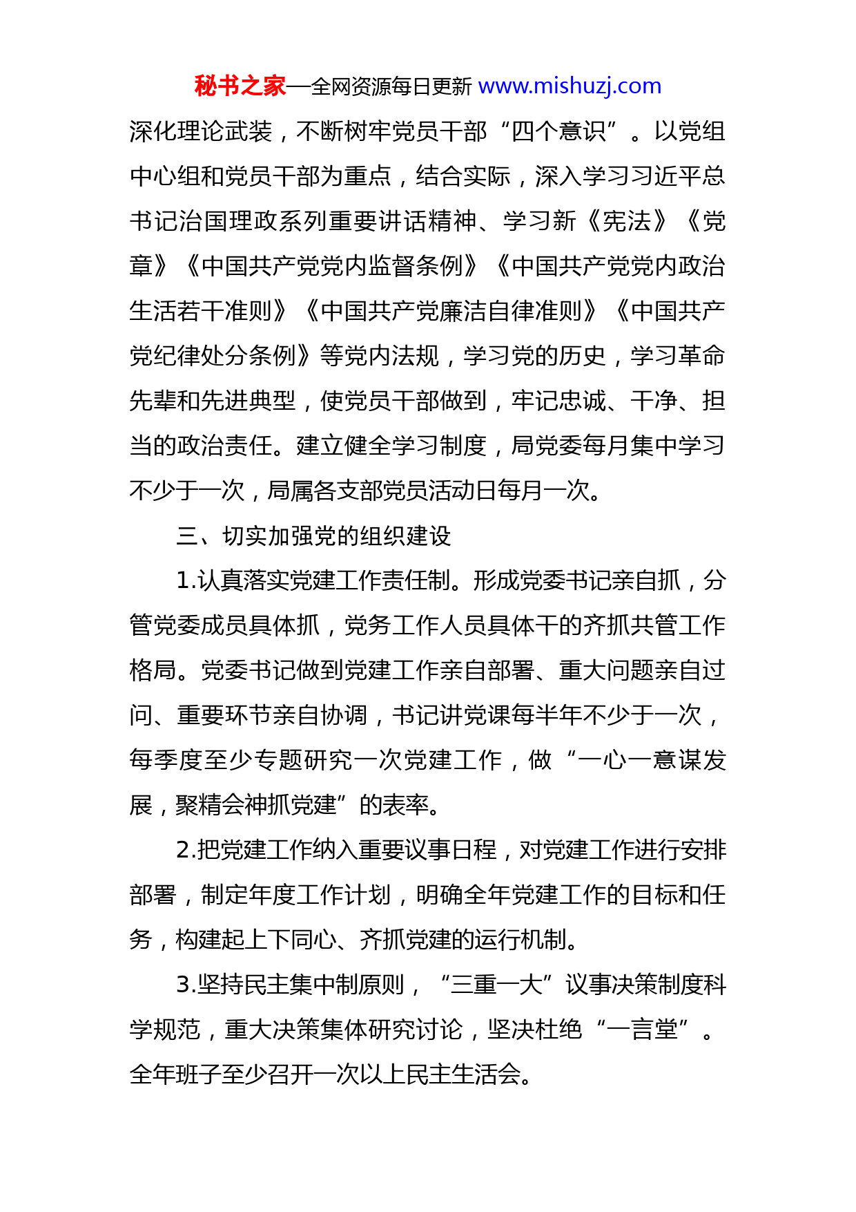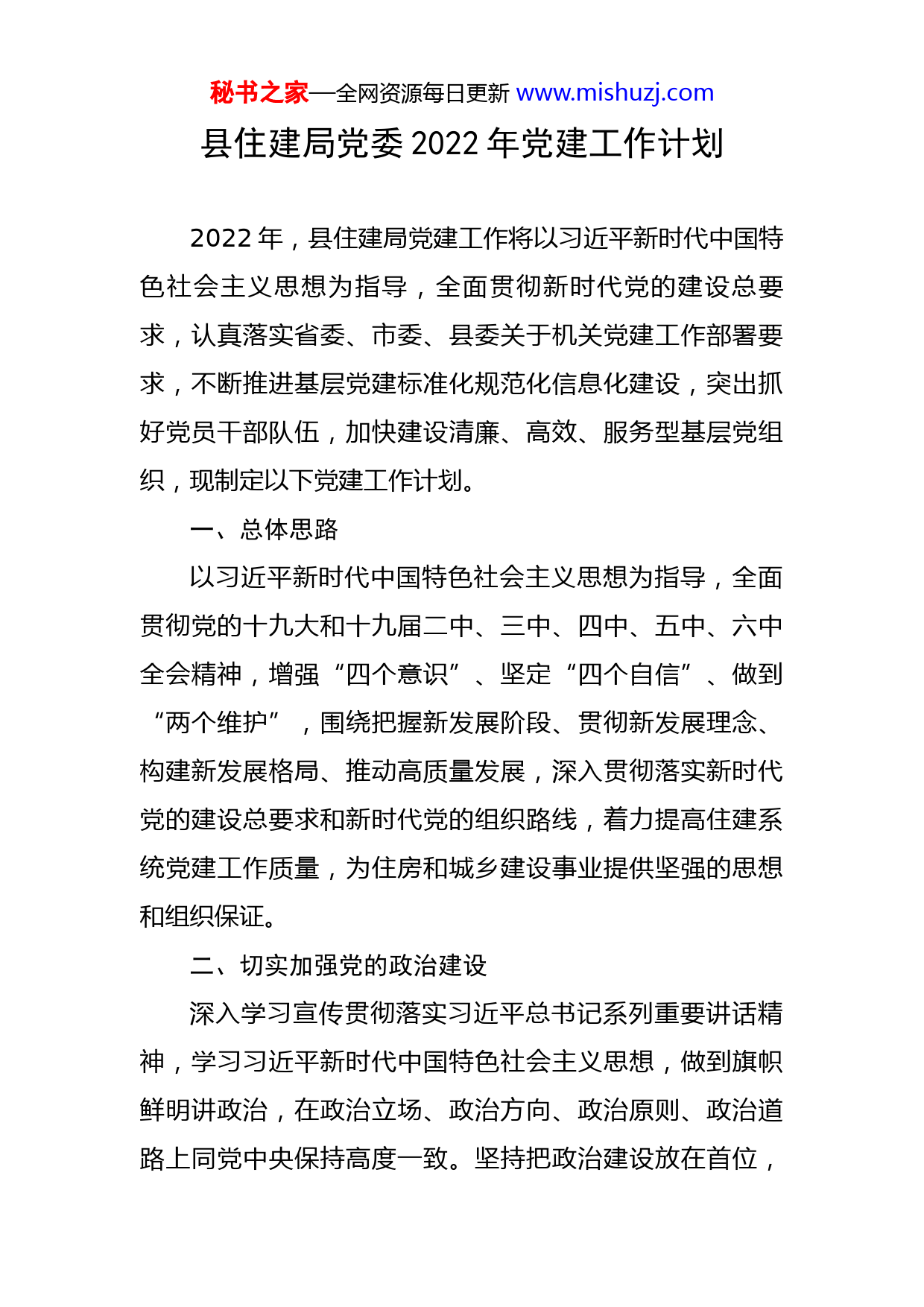 秘书之家—全网资源每日更新www.mishuzj.com县住建局党委2022年党建工作计划2022年,县住建局党建工作将以习近平新时代中国特色社会主义思想为指导,全面贯彻新时代党的建设总要求,认真落实省委、市委、县委关于机关党建工作部署要求,不断推进基层党建标准化规范化信息化建设,突出抓好党员干部队伍,加快建设清廉、高效、服务型基层党组织,现制定以下党建工作计划。一、总体思路以习近平新时代中国特色社会主义思想为指导,全面贯彻党的十九大和十九届二中、三中、四中、五中、六中全会精神,增强“四个意识”、坚定“四个自信”、做到“两个维护”,围绕把握新发展阶段、贯彻新发展理念、构建新发展格局、推动高质量发展,深入贯彻落实新时代党的建设总要求和新时代党的组织路线,着力提高住建系统党建工作质量,为住房和城乡建设事业提供坚强的思想和组织保证。二、切实加强党的政治建设深入学习宣传贯彻落实习近平总书记系列重要讲话精神,学习习近平新时代中国特色社会主义思想,做到旗帜鲜明讲政治,在政治立场、政治方向、政治原则、政治道路上同党中央保持高度一致。坚持把政治建设放在首位,秘书之家—全网资源每日更新www.mishuzj.com深化理论武装,不断树牢党员干部“四个意识”。以党组中心组和党员干部为重点,结合实际,深入学习习近平总书记治国理政系列重要讲话精神、学习新《宪法》《党章》《中国共产党党内监督条例》《中国共产党党内政治生活若干准则》《中国共产党廉洁自律准则》《中国共产党纪律处分条例》等党内法规,学习党的历史,学习革命先辈和先进典型,使党员干部做到,牢记忠诚、干净、担当的政治责任。建立健全学习制度,局党委每月集中学习不少于一次,局属各支部党员活动日每月一次。三、切实加强党的组织建设1.认真落实党建工作责任制。形成党委书记亲自抓,分管党委成员具体抓,党务工作人员具体干的齐抓共管工作格局。党委书记做到党建工作亲自部署、重大问题亲自过问、重要环节亲自协调,书记讲党课每半年不少于一次,每季度至少专题研究一次党建工作,做“一心一意谋发展,聚精会神抓党建”的表率。2.把党建工作纳入重要议事日程,对党建工作进行安排部署,制定年度工作计划,明确全年党建工作的目标和任务,构建起上下同心、齐抓党建的运行机制。3.坚持民主集中制原则,“三重一大”议事决策制度科学规范,重大决策集体研究讨论,坚决杜绝“一言堂”。全年班子至少召开一次以上民主生活会。秘书之家—全网资源每日更新www.mishuzj.com4.加强局属党支部建设。一是坚持“三会一课”制度、党员调入调出、党费收缴等组织管理制度建设,对所属党员实有情况进行全面核对,实施动态管理。进一步明确基层党建工作责任制,不断完善和规范基层党建工作考核办法,提高考核效果。二是带头讲党性、重品行、作表率,要深入基层、深入一线,采取集中培训、工作交流等方式,开展党务知识和业务技能的学习,促使基层工作人员进一步解放思想、转变观念、更新知识、拓展视野,不断提高个人素质和指导、服务基层的工作水平。三是认真做好发展党员工作。按照“控制总量、优化结构、提高素质、发挥作用”的要求,突出政治标准,有计划地做好发展党员工作,2022年至少发展党员x名。四是落实党建活动经费保障。加大党建经费投入,按照每名党员每年不少于100元标准预算党建专项经费,用于党支部组织开展党员活动,进行党员教育培训。四、巩固深化党史学习教育成果,扎实推进基层党建“三化”建设一是以党员学习议事日为载体,开展好“七个一”活动,即通读一遍党章、重温一次入党誓词、回顾一次入党初心、上好一堂党课、过好一次政治生日、开展一次党内关怀、开展一次党风廉政教育。二是继续从四个方面定标准推进基层党建标准化,从六个方面立规范推进基层党建秘书之家—全网资源每日更新www.mishuzj.com规范化。五、党建特色工作“一强”:是指强化党组领导核心作用,突出政治功能,认真履行党要管党、从严治党责任,做好理论武装和思想政治工作,管好党员、干部队伍,贯彻落实党中央和上级党组织的决策部署,发挥好把方向、管大局、保落实的重要作用。“二创”:创“样板”项目,创服务机关(单位)。1.创样板项目:坚守“工程建设无小事,项目质量是大事”的工作理念,在落实好疫情防控的前提下,组织建筑工地有序复工,党员、干部要做好“保姆式”服务,确保顺利、及时、高效复工。党建引领标准化工地建设,深入推进建设领域扫黑除恶工作,突出“四个强化”,即强化教育培训、强化常态督查、强化平安宣传、强化责任落实,确保工程质量和工地安全,使“安全施工、保质保量”的观念深入人心。2.创服务机关(单位):把提升服务效率和服务水平作为关键点,发挥党员先锋模范作用,切实强化先进典型的示范引领效应,推动党员干部服务意识新提升,畅通党员干部服务创优新途径,树起党员干部作风转变新形象,打造服务型政府。六、切实加强机关作风建设秘书之家—全网资源每日更新www.mishuzj.com一是按照县委要求,认真开展好机关作风提升活动。结合单位工作实际,制定切实可行的工作实施方案,加强组织领导,强化督促检查,确保机关工作作风有明显改善。二是