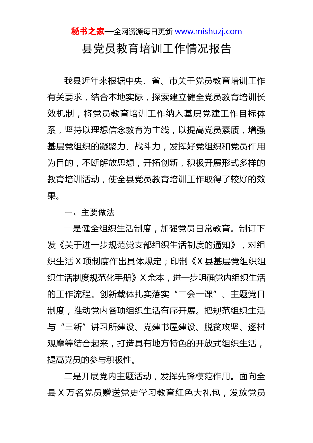 秘书之家—全网资源每日更新www.mishuzj.com县党员教育培训工作情况报告我县近年来根据中央、省、市关于党员教育培训工作有关要求,结合本地实际,探索建立健全党员教育培训长效机制,将党员教育培训工作纳入基层党建工作目标体系,坚持以理想信念教育为主线,以提高党员素质,增强基层党组织的凝聚力、战斗力,发挥好党组织和党员作用为目的,不断解放思想,开拓创新,积极开展形式多样的教育培训活动,使全县党员教育培训工作取得了较好的效果。一、主要做法一是健全组织生活制度,加强党员日常教育。制订下发《关于进一步规范党支部组织生活制度的通知》,对组织生活X项制度作出具体规定;印制《X县基层党组织组织生活制度规范化手册》X余本,进一步明确党内组织生活的工作流程。创新载体扎实落实“三会一课”、主题党日制度,推动党内各项组织生活有序开展。把规范组织生活与“三新”讲习所建设、党建书屋建设、脱贫攻坚、逐村观摩等结合起来,打造具有地方特色的开放式组织生活,提高党员的参与积极性。二是开展党内主题活动,发挥先锋模范作用。面向全县X万名党员赠送党史学习教育红色大礼包,发放党员秘书之家—全网资源每日更新www.mishuzj.com“政治生日”短信祝福,教育引导党员在追溯党史中坚定理想信念。将每月X日确定为全县统一的支部“主题党日”,经常性组织开展各类党内主题活动,有效激发党员履职尽责、担当作为的内生动力。建立X党小组活动模式,指导党员在设岗定责服务群众、助力精准乡村振兴等方面,发挥先锋模范作用。三是实行分级轮训,确保全员覆盖。全面实施党员培训培优计划,认真开展“万名党员进党校”培训活动。按照分级培训和全员培训的原则,通过县委组织部示范培训,乡镇党委重点培训,依托县、镇两级党校,有计划、有步骤、有重点地开展党员轮训工作。由县委组织部牵头、县委党校承办,全年负责对基层党组织书记、基层党员、党务工作者等进行集中培训,举办各类培训班X期,累计培训党员X人次。由乡镇党委依托镇级党校,运用“互联网+智慧党建”融平台,采取“镇会场现场授课+村会场(各行政村远程教育站点)视频会议”的形式,实现基层党员培训全覆盖。四是强化培训管理,确保培训实效。目前有一个培训基地(县委党校新校区)。位于X县小浪底镇,占地面积X亩,建筑面积X㎡,有容纳X人多功能报告厅X个,有容纳X人多功能报告厅X个,有容纳X人以上教室和会议室X个,有藏书X册资料室兼阅览室一个,有X台电脑微机秘书之家—全网资源每日更新www.mishuzj.com室X个,可同时容纳X余人培训食宿。县委党校编制X人,现有教职工X人,其中专职教师X人(高级讲师X人,讲师X人,助讲X人),管理和工勤人员X人。现设办公室、教研室、干训科、后勤股四个职能科室。在培训管理方面,一是加强校风建设,坚持“严”字当头,严以治校、严以治教、严以治学,严格落实中央八项规定精神,建立健全各项管理制度。二是县内所有班次在黄鹿山校区实行封闭式培训,所有班次安排正副班主任全程跟班管理,并邀请组织纪检部门对学员学风现场监督。三是建立健全学员在校管理档案,对学员参训情况、在校表现、考试成绩作出全面详实记录,并作出综合鉴定,其结果纳入干部个人档案。四是健全保障机制,增强党员教育长效性。一是建立领导工作责任制。县委组织部定期研究部署党员教育培训工作,制定全县党员教育培训计划,各党委结合自身实际,制定切实可行的党员教育规划,把党员教育培训工作作为硬任务、硬指标,纳入党建总体工作目标。党委书记作为党建工作的第一责任人,切实加强对党员教育培训的领导。进一步明确各党委、纪检、组织、宣传、党校等部门的职责,分工协作,形成各职能部门齐抓共管的良好格局。二是建立督导检查制度。县委组织部履行牵头抓总的职责,通过深入基层督查指导,及时掌握了解党员教育培秘书之家—全网资源每日更新www.mishuzj.com训情况,督促基层落实“三会一课”、主题党日、定期学习、民主评议党员、党内谈心谈话等党员教育管理制度,不断拓宽教育培训渠道,切实做到常抓不懈、持之以恒。三是建立经费保障制度。县财政每年列支党员教育专项经费,县委组织部也从党费中拿出部分资金,采取举办各类培训、订购党建书刊、添置电教设备、下拨培训经费等措施,确保党员教育经费的落实。二、存在的问题一是教育培训内容需进一步优化。在党员教育培训中还存在着“三多三少”现象,即教学内容侧重于理论性、知识性较多,实用性、可操作性内容较少;共性教育较多,个性教育较少;普遍培训较多,特殊培训较少。教育培训的针对性尚显不足。二是教育培训管理需进一步优化。部分党委和单位对党员教育培训工作的管理存在简单粗放的现象,注重规划制定,忽视落实监督,注重培训规模,忽视培训质量,注重举办教育培训的数量,忽视教育培训检查评估考核工作,使教育培训的成果不能有效地作用于党员队伍建设。三是外出务工党员教育难题需进一步破解。一些农村青壮年党员大量外出务工,“人员集中难、教育开展难”的问题越来越凸显,给党员教育培训工作带来新的考验。三、意见建议秘书之家—全网资源每日更新www.mishuzj.com一是进一步创新和完善教育培训的内容。通过调查问卷