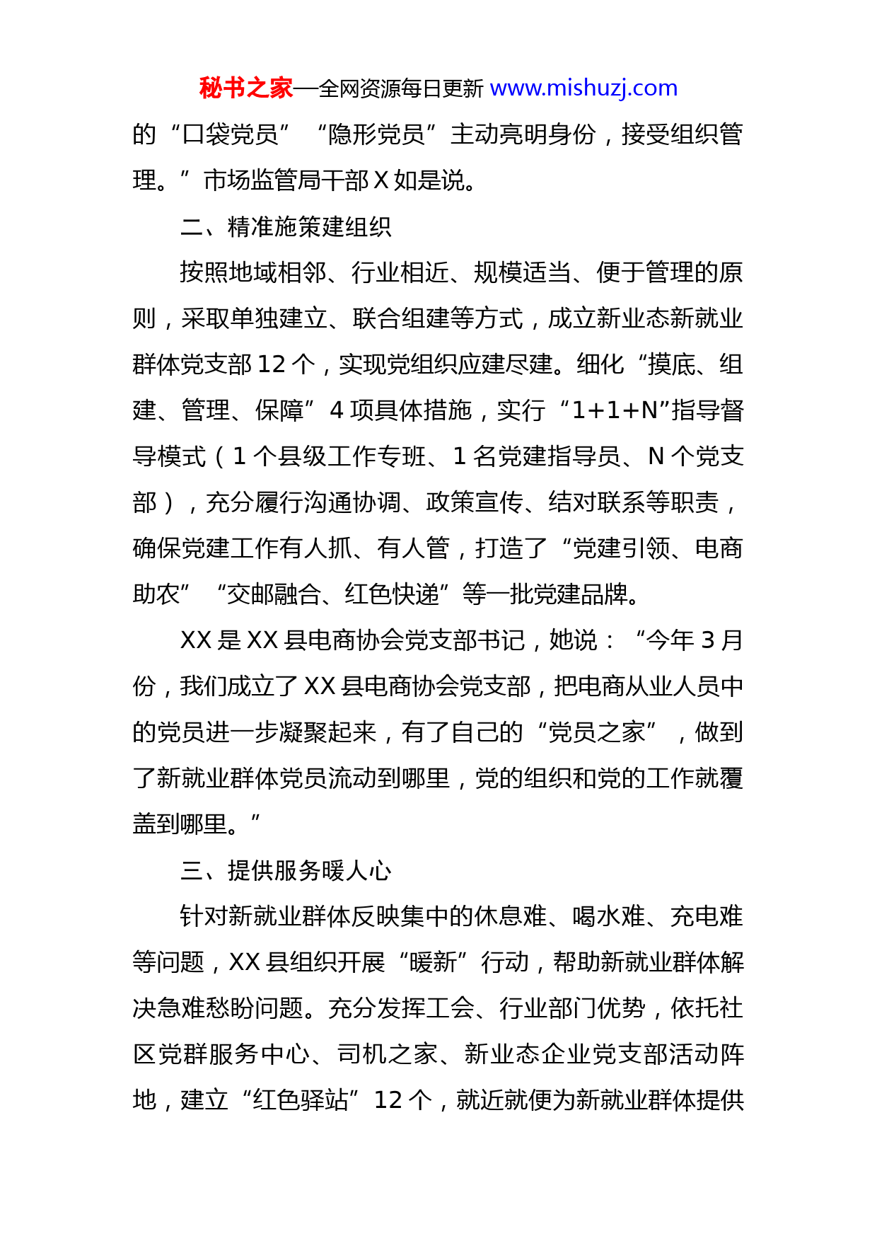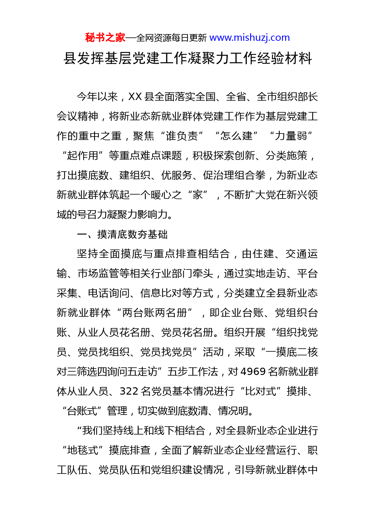 秘书之家—全网资源每日更新www.mishuzj.com县发挥基层党建工作凝聚力工作经验材料今年以来,XX县全面落实全国、全省、全市组织部长会议精神,将新业态新就业群体党建工作作为基层党建工作的重中之重,聚焦“谁负责”“怎么建”“力量弱”“起作用”等重点难点课题,积极探索创新、分类施策,打出摸底数、建组织、优服务、促治理组合拳,为新业态新就业群体筑起一个暖心之“家”,不断扩大党在新兴领域的号召力凝聚力影响力。一、摸清底数夯基础坚持全面摸底与重点排查相结合,由住建、交通运输、市场监管等相关行业部门牵头,通过实地走访、平台采集、电话询问、信息比对等方式,分类建立全县新业态新就业群体“两台账两名册”,即企业台账、党组织台账、从业人员花名册、党员花名册。组织开展“组织找党员、党员找组织、党员找党员”活动,采取“一摸底二核对三筛选四询问五走访”五步工作法,对4969名新就业群体从业人员、322名党员基本情况进行“比对式”摸排、“台账式”管理,切实做到底数清、情况明。“我们坚持线上和线下相结合,对全县新业态企业进行“地毯式”摸底排查,全面了解新业态企业经营运行、职工队伍、党员队伍和党组织建设情况,引导新就业群体中秘书之家—全网资源每日更新www.mishuzj.com的“口袋党员”“隐形党员”主动亮明身份,接受组织管理。”市场监管局干部X如是说。二、精准施策建组织按照地域相邻、行业相近、规模适当、便于管理的原则,采取单独建立、联合组建等方式,成立新业态新就业群体党支部12个,实现党组织应建尽建。细化“摸底、组建、管理、保障”4项具体措施,实行“1+1+N”指导督导模式(1个县级工作专班、1名党建指导员、N个党支部),充分履行沟通协调、政策宣传、结对联系等职责,确保党建工作有人抓、有人管,打造了“党建引领、电商助农”“交邮融合、红色快递”等一批党建品牌。XX是XX县电商协会党支部书记,她说:“今年3月份,我们成立了XX县电商协会党支部,把电商从业人员中的党员进一步凝聚起来,有了自己的“党员之家”,做到了新就业群体党员流动到哪里,党的组织和党的工作就覆盖到哪里。”三、提供服务暖人心针对新就业群体反映集中的休息难、喝水难、充电难等问题,XX县组织开展“暖新”行动,帮助新就业群体解决急难愁盼问题。充分发挥工会、行业部门优势,依托社区党群服务中心、司机之家、新业态企业党支部活动阵地,建立“红色驿站”12个,就近就便为新就业群体提供秘书之家—全网资源每日更新www.mishuzj.com休息、饮水、充电、上网等贴心服务,做到“冷可取暖、热可纳凉、渴能喝水、累能歇脚”,不断提升新就业群体的归属感和荣誉感。X是外卖小哥中的一位党员,在点餐高峰期的时候,他一次经常要带几份订单,不然根本忙不过来。他说“外卖工作虽然辛苦,但红色驿站免费给我们提供应急充电、爱心药箱、临时歇脚、纳凉避雨等贴心服务,让我们感受到家一样的温暖”四、多元共治促治理新就业群体既是社会治理的重要对象,也是社会治理的有生力量。在推进全县新业态新就业群体党建工作中,坚持一手抓关心关爱,一手抓组织引领,在外卖配送、电子商务等领域培育党员先锋引领示范岗5个,示范带动外卖骑手、快递小哥、货运司机中的党员主动亮身份、亮职责、亮承诺,争做社情民意信息员、基层治理网格员、疫情防控宣传员、城市生活服务员,在疫情防控、文明城市创建、基层治理等方面发挥先锋模范作用。“快递员、外卖配送员等新就业群体充分发挥“移动探头”作用,通过电话、微信群等方式及时向社区上报安全隐患、突发事件等20余件,已成为参与社区治理的重要力量。”昌松社区X如是说。新业态新就业群体诉求在哪里,党的温暖就送到哪秘书之家—全网资源每日更新www.mishuzj.com里。“渴了有水喝、热了能乘凉、累了能歇脚、困难能协调”是从事快递员、外卖员、货车司机等工作最普遍的诉求,XX县将紧扣新就业群体需求,持续开展“暖新”行动,不断增强新就业群体对党组织的认同感和归属感,切实将党建工作做到新业态新就业群体的心坎上。
