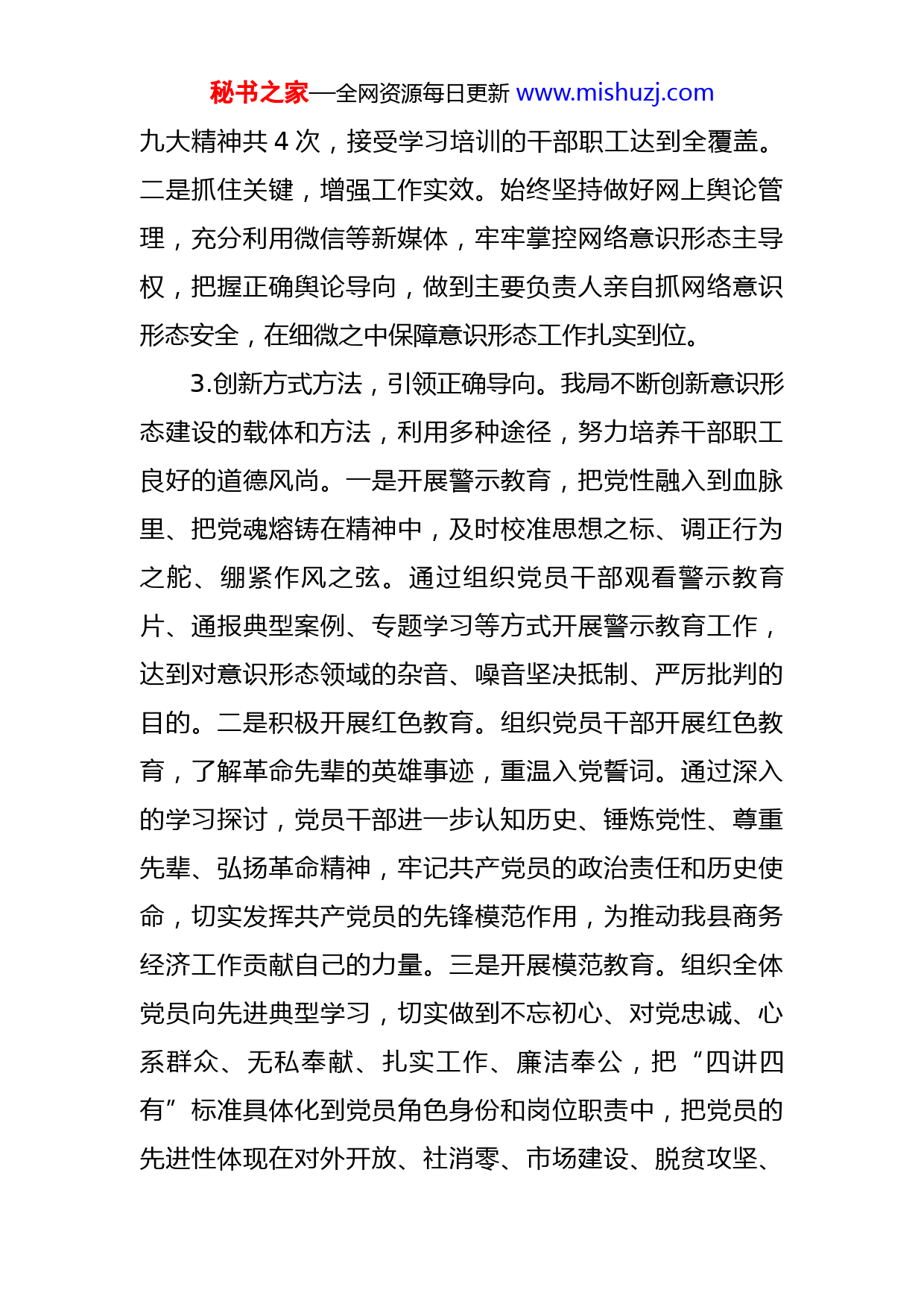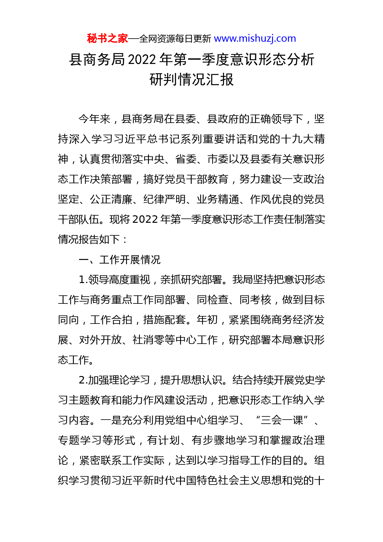 秘书之家—全网资源每日更新www.mishuzj.com县商务局2022年第一季度意识形态分析研判情况汇报今年来,县商务局在县委、县政府的正确领导下,坚持深入学习习近平总书记系列重要讲话和党的十九大精神,认真贯彻落实中央、省委、市委以及县委有关意识形态工作决策部署,搞好党员干部教育,努力建设一支政治坚定、公正清廉、纪律严明、业务精通、作风优良的党员干部队伍。现将2022年第一季度意识形态工作责任制落实情况报告如下:一、工作开展情况1.领导高度重视,亲抓研究部署。我局坚持把意识形态工作与商务重点工作同部署、同检查、同考核,做到目标同向,工作合拍,措施配套。年初,紧紧围绕商务经济发展、对外开放、社消零等中心工作,研究部署本局意识形态工作。2.加强理论学习,提升思想认识。结合持续开展党史学习主题教育和能力作风建设活动,把意识形态工作纳入学习内容。一是充分利用党组中心组学习、“三会一课”、专题学习等形式,有计划、有步骤地学习和掌握政治理论,紧密联系工作实际,达到以学习指导工作的目的。组织学习贯彻习近平新时代中国特色社会主义思想和党的十秘书之家—全网资源每日更新www.mishuzj.com九大精神共4次,接受学习培训的干部职工达到全覆盖。二是抓住关键,增强工作实效。始终坚持做好网上舆论管理,充分利用微信等新媒体,牢牢掌控网络意识形态主导权,把握正确舆论导向,做到主要负责人亲自抓网络意识形态安全,在细微之中保障意识形态工作扎实到位。3.创新方式方法,引领正确导向。我局不断创新意识形态建设的载体和方法,利用多种途径,努力培养干部职工良好的道德风尚。一是开展警示教育,把党性融入到血脉里、把党魂熔铸在精神中,及时校准思想之标、调正行为之舵、绷紧作风之弦。通过组织党员干部观看警示教育片、通报典型案例、专题学习等方式开展警示教育工作,达到对意识形态领域的杂音、噪音坚决抵制、严厉批判的目的。二是积极开展红色教育。组织党员干部开展红色教育,了解革命先辈的英雄事迹,重温入党誓词。通过深入的学习探讨,党员干部进一步认知历史、锤炼党性、尊重先辈、弘扬革命精神,牢记共产党员的政治责任和历史使命,切实发挥共产党员的先锋模范作用,为推动我县商务经济工作贡献自己的力量。三是开展模范教育。组织全体党员向先进典型学习,切实做到不忘初心、对党忠诚、心系群众、无私奉献、扎实工作、廉洁奉公,把“四讲四有”标准具体化到党员角色身份和岗位职责中,把党员的先进性体现在对外开放、社消零、市场建设、脱贫攻坚、秘书之家—全网资源每日更新www.mishuzj.com乡村振兴等工作上。4.强化组织建设,压实队伍基础。我局坚持充实意识形态工作力量,把工作能力强、业务技术精、工作经验丰富的同志调整负责意识形态工作,进一步加强和改进了本局网络舆论引导工作,有效地应对和及时正确处置网络事件。二、存在的问题我局意识形态工作虽然取得了一定的成绩,但仍存在有一些薄弱环节,主要体现以下几个方面:一是对干部职工新兴媒体的应用和引导管理需要进一步加强;二是新形势下舆论引导能力需要进一步提升;三是对内对外宣传力度还需要进一步加大。三、下一步工作打算落实意识形态工作责任制是一项经常性、基础性工作。今后,我局将进一步抓好意识形态工作,继续围绕商务经济发展、农贸市场建设、社消零、专项扶贫等工作目标,着力在统一思想、凝聚力量、鼓舞干劲、增强实效上下功夫,努力在理论武装、舆论引导、文明创建上取得新进展,不断激发全体干部职工工作激情,为推进本局各项工作长效发展提供坚强有力的精神动力、思想保证和舆论支持。(一)进一步抓好意识形态工作责任制落实。坚定地秘书之家—全网资源每日更新www.mishuzj.com把政治建设放在首位,认真学习贯彻习近平总书记关于政治建设和意识形态工作的重要论述,及时传达上级指示和有关通报,加强党的宣传和舆情监督,主动做好政治教育阵地建设,督导各股室、二级机构抓好责任制落实,确保政治安全。(二)进一步加强党的理论武装。严格落实好每月集中学习等制度,不断深化全局干部职工的理论学习。(三)进一步抓好思想政治教育。加强岗位行为规范建设,深入开展精神文明创建活动。不断增强理论学习和党课教育的主题性和针对性,激发干部职工干事创业的激情,夯实“不忘初心、牢记使命”的共同思想基础。(四)进一步加强舆情管控。加强网络正面宣传,切实用主旋律凝聚人感染人。加强网络舆情监测和应急处置,减少负面影响,发挥和谐向上的正能量。