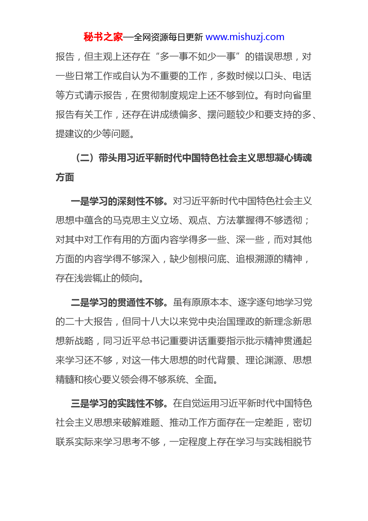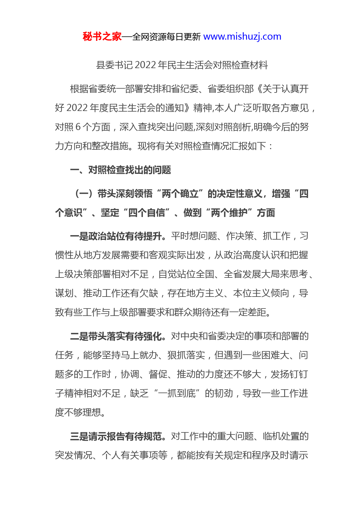 秘书之家—全网资源每日更新www.mishuzj.com县委书记2022年民主生活会对照检查材料根据省委统一部署安排和省纪委、省委组织部《关于认真开好2022年度民主生活会的通知》精神,本人广泛听取各方意见,对照6个方面,深入查找突出问题,深刻对照剖析,明确今后的努力方向和整改措施。现将有关对照检查情况汇报如下:一、对照检查找出的问题(一)带头深刻领悟“两个确立”的决定性意义,增强“四个意识”、坚定“四个自信”、做到“两个维护”方面一是政治站位有待提升。平时想问题、作决策、抓工作,习惯性从地方发展需要和客观实际出发,从政治高度认识和把握上级决策部署相对不足,自觉站位全国、全省发展大局来思考、谋划、推动工作还有欠缺,存在地方主义、本位主义倾向,导致有些工作与上级部署要求和群众期待还有一定差距。二是带头落实有待强化。对中央和省委决定的事项和部署的任务,能够坚持马上就办、狠抓落实,但遇到一些困难大、问题多的工作时,协调、督促、推动的力度还不够大,发扬钉钉子精神相对不足,缺乏“一抓到底”的韧劲,导致一些工作进度不够理想。三是请示报告有待规范。对工作中的重大问题、临机处置的突发情况、个人有关事项等,都能按有关规定和程序及时请示秘书之家—全网资源每日更新www.mishuzj.com报告,但主观上还存在“多一事不如少一事”的错误思想,对一些日常工作或自认为不重要的工作,多数时候以口头、电话等方式请示报告,在贯彻制度规定上还不够到位。有时向省里报告有关工作,还存在讲成绩偏多、摆问题较少和要支持的多、提建议的少等问题。(二)带头用习近平新时代中国特色社会主义思想凝心铸魂方面一是学习的深刻性不够。对习近平新时代中国特色社会主义思想中蕴含的马克思主义立场、观点、方法掌握得不够透彻;对其中对工作有用的方面内容学得多一些、深一些,而对其他方面的内容学得不够深入,缺少刨根问底、追根溯源的精神,存在浅尝辄止的倾向。二是学习的贯通性不够。虽有原原本本、逐字逐句地学习党的二十大报告,但同十八大以来党中央治国理政的新理念新思想新战略,同习近平总书记重要讲话重要指示批示精神贯通起来学习还不够,对这一伟大思想的时代背景、理论渊源、思想精髓和核心要义领会得不够系统、全面。三是学习的实践性不够。在自觉运用习近平新时代中国特色社会主义思想来破解难题、推动工作方面存在一定差距,密切联系实际来学习思考不够,一定程度上存在学习与实践相脱节秘书之家—全网资源每日更新www.mishuzj.com的问题。比如,对如何立足高质量发展,按照新时代党的建设总要求来选干部、配班子思考得不够深入、衔接得不够紧密。(三)带头坚持和加强党的全面领导方面一是意识形态工作领导权掌握的不够牢。对意识形态领域的复杂斗争缺乏深刻认识,落实意识形态工作领导责任的自觉性不够高,驾驭意识形态领域复杂局面的能力不够强,抓意识形态工作的思考研判不够系统全面,督促各级党委(党组)落实“四个亲自”不够到位,严格落实意识形态工作责任“一岗双责”方面力度不够。比如,在坚守意识形态主阵地、不断强化舆论引导能力,做社会主义核心价值观的引领者、传播者、践行者、推动者方面做得不够,基层宣传文化阵地作用发挥不充分,活动主题不够突出,活动效果不尽如人意。二是履行主体责任需强化。作为全面从严治党“第一责任人”,虽然能够身体力行践行“四个亲自”,但在抓常抓细、抓早抓小上探索创新不足。平常对市直部门自觉承担主体责任、领导干部履行“一岗双责”要求不够严格,落实监督执纪“四种形态”不够有力,压力传导不够,没有真正做到经常性地“咬耳朵”“扯袖子”,让“红红脸、出出汗”成为常态。三是民主集中制不够充分。有时一些重大决策虽然注意征求各方面的意见建议,但征求范围还不够广泛,形式也不够灵活,秘书之家—全网资源每日更新www.mishuzj.com民主集中制有时落实不够到位。比如,在一些重大民生项目规划建设上,群众的知情权、参与度不够。(四)带头坚持以人民为中心的发展思想,推动改革发展稳定方面一是服务群众不主动。坐等上门多、主动问需少,特别是在联系挂点县、乡、村,对弱势群众往往是重要节日、活动期间送温暖偏多,平时主动帮助解决实质性问题较少。在接访时了解群众诉求后就批示转给有关部门解决,亲自协调、督促落实的少,特别是对信访积案,缺乏有效解决办法。二是为民务实意识有待提升。虽然能坚持定期深入基层一线走访调研,但工作调研、督查落实的多,现场办公协调解决具体问题的少,而且走的线路、看的点,多数是根据工作需要事先进行对接安排,存在一定形式主义,多是指导督促工作落实,真正沉下身子体察民情、解决民生短板的还不够。三是宗旨意识有所淡化。对基层情况掌握不透彻、对群众呼声听得不真切,脱离基层群众的倾向还不同程度地存在。比如,对整治民生问题化解工作重视不够,尤其是基层群众密切关注的征地拆迁、乡村振兴等重点领域问题整治成效不明显。(五)带头发扬斗争精神,防范化解风险挑战方面秘书之家—全网资源每日更新www.mishuzj.com一是斗争精神不强。面对发展任务繁重的形势,对新常态不适应,总觉得工作不好做,