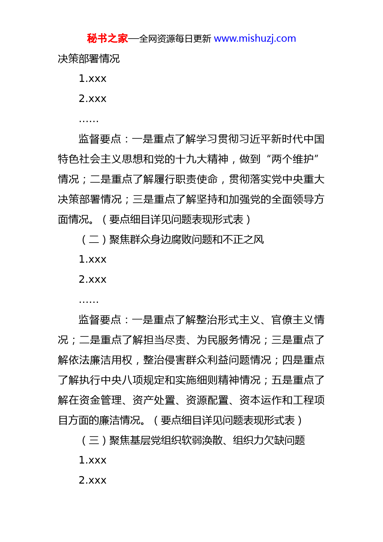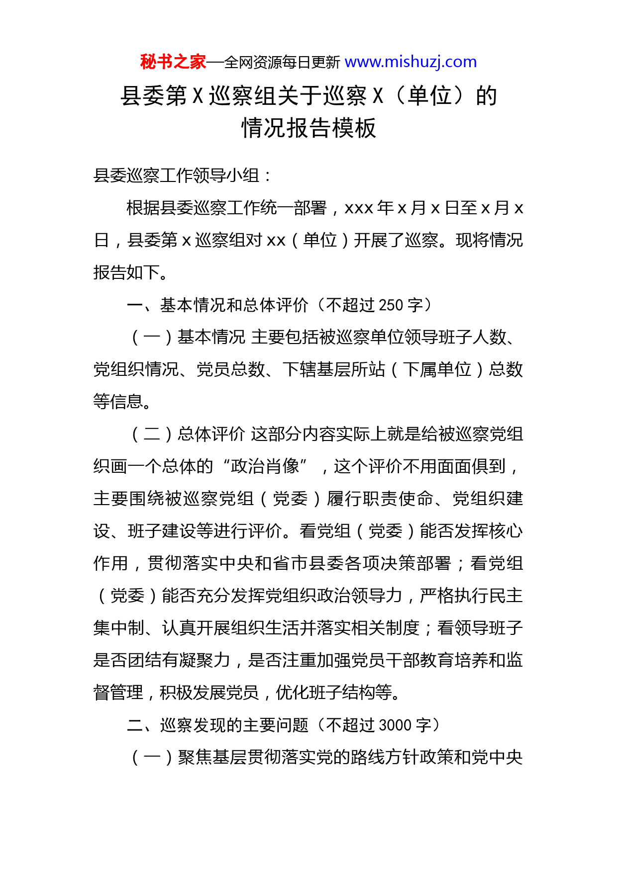秘书之家—全网资源每日更新www.mishuzj.com县委第X巡察组关于巡察X(单位)的情况报告模板县委巡察工作领导小组:根据县委巡察工作统一部署,xxx年x月x日至x月x日,县委第x巡察组对xx(单位)开展了巡察。现将情况报告如下。一、基本情况和总体评价(不超过250字)(一)基本情况主要包括被巡察单位领导班子人数、党组织情况、党员总数、下辖基层所站(下属单位)总数等信息。(二)总体评价这部分内容实际上就是给被巡察党组织画一个总体的“政治肖像”,这个评价不用面面俱到,主要围绕被巡察党组(党委)履行职责使命、党组织建设、班子建设等进行评价。看党组(党委)能否发挥核心作用,贯彻落实中央和省市县委各项决策部署;看党组(党委)能否充分发挥党组织政治领导力,严格执行民主集中制、认真开展组织生活并落实相关制度;看领导班子是否团结有凝聚力,是否注重加强党员干部教育培养和监督管理,积极发展党员,优化班子结构等。二、巡察发现的主要问题(不超过3000字)(一)聚焦基层贯彻落实党的路线方针政策和党中央秘书之家—全网资源每日更新www.mishuzj.com决策部署情况1.xxx2.xxx……监督要点:一是重点了解学习贯彻习近平新时代中国特色社会主义思想和党的十九大精神,做到“两个维护”情况;二是重点了解履行职责使命,贯彻落实党中央重大决策部署情况;三是重点了解坚持和加强党的全面领导方面情况。(要点细目详见问题表现形式表)(二)聚焦群众身边腐败问题和不正之风1.xxx2.xxx……监督要点:一是重点了解整治形式主义、官僚主义情况;二是重点了解担当尽责、为民服务情况;三是重点了解依法廉洁用权,整治侵害群众利益问题情况;四是重点了解执行中央八项规定和实施细则精神情况;五是重点了解在资金管理、资产处置、资源配置、资本运作和工程项目方面的廉洁情况。(要点细目详见问题表现形式表)(三)聚焦基层党组织软弱涣散、组织力欠缺问题1.xxx2.xxx秘书之家—全网资源每日更新www.mishuzj.com……监督要点:一是基层党组织建设情况;二是执行新时代党的组织路线和选人用人情况;三是履行管党治党政治责任情况。(要点细目详见问题表现形式表)三、反映重点人的问题线索(不超过300字)巡察共收到反映领导干部的问题线索x件,涉及x人,其中:科级x人、科以下x人。主要情况如下:(一)建议进一步了解关注类x人此类中,涉及科级x人,其中:……(按问题线索建议调查核实的先后排序):……[点名、点事、点判断]此类问题线索原则上巡察组应做深入了解。内容主要包括对问题线索的了解情况和基本判断。对了解具体过程不详述,做到简明扼要、定性准确。对进驻前有关部门建议重点关注的问题线索,经过巡察了解查否的,不再列入进一步了解关注类。(二)建议了解关注类x人此类中,涉及科级x人、科级以下x人。其中:……(按职级由高到低排序):……[点名、点事]此类问题线索一般指巡察中反映较多、有的比较具体,但巡察组尚未作了解,或作过一定了解但不秘书之家—全网资源每日更新www.mishuzj.com足以形成明确判断的。内容包括反映问题线索的来源(来信、来电、来访、谈话、署名举报、实名举报等),以及所反映问题线索的概要内容。表述要准确、简明、扼要。(三)建议参考类x人此类中,涉及科级x人、科级以下x人。[点数]此类问题线索一般反映比较笼统,在报告中点出被反映人的数量即可。注意事项:巡察关注的重点人指政治问题与腐败问题交织,不收敛不收手,问题线索反映集中、群众反映强烈,现在重要岗位且可能还要提拔使用的领导干部,具体范围为被巡察单位党组织领导班子成员、下一级主要负责人,以及重要岗位的领导干部。四、意见建议(不超过700字)(一)拟向xx(被巡察单位)反馈的意见注意与第一部分巡察发现的重点专项问题前后对应。点问题要透彻,整改要求要严肃、具体,督促被巡察单位党组织落实主体责任和监督责任(或支持县纪委监委派驻纪检监察组落实监督责任)。要体现“层层传导压力”,明确提出牢固树立“四个意识”,坚持党的领导、加强党的建设,落实全面从严治党要求。(二)拟向县纪委提出的建议注意针对被巡察单位党组织在党的领导、党的建设、秘书之家—全网资源每日更新www.mishuzj.com全面从严治党,以及党风廉政建设和反腐败工作等方面存在的具体问题,以及发现的重点问题线索,特别是违规违纪问题线索,提出有针对性的建议。按照领导小组要求,对党的领导核心作用弱化、抓党风廉政建设不敢担当造成严重后果的,对违反中央八项规定精神、“四风”禁而不绝的,要提出问责的建议。(三)拟向县委组织部提出的建议不提调整班子等具体建议,可建议关注班子建设。注意针对被巡察单位党组织选人用人方面存在的不正之风和腐败问题,提出具体建议。(四)拟向县委和县政府有关部门提出的建议注意事项:意见建议要与问题相对应,有针对性和可操作性。需要向县委县政府有关部门提出具体建议的,应附相关问题的专题附件,防止出现没有材料支撑、空提建议的情况。此项建议应写明具体向哪个部门提出建议。xxx镇村级巡察组组长:副组长:成员:X年X月X日