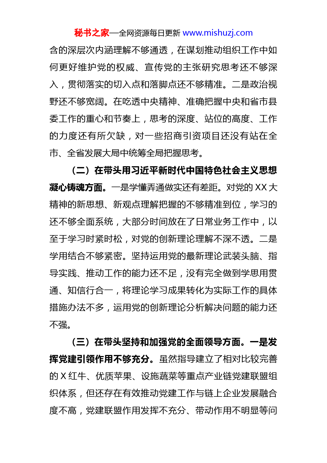 秘书之家—全网资源每日更新www.mishuzj.com县委组织部部长2022年度专题民主生活会发言提纲按照县委关于2022年度民主生活会要求,自己认真学习党的XX大报告和党章,习近平总书记在党的二十届一中全会上的重要讲话精神,学习贯彻习近平总书记关于各领域各方面工作的重要论述以及对X重要讲话和指示精神等内容,结合本次民主生活会主题,紧紧围绕六个方面具体内容,在谈心谈话、征求意见的基础上,认真对照检视,深挖问题根源,明确努力方向和改进措施,现对照检查如下,恳请同志们批评。一、上年度民主生活会查摆问题整改情况在2021年度党史学习教育和省委涉粮问题专项巡视反馈问题整改专题民主生活会上,通过谈心谈话、征求意见、自己查找、开展批评等方式,共查摆出XX个方面XX条问题,针对存在问题制定了XX条整改措施,目前已全部整改到位并长期坚持。同时,坚持从制度建设入手,建立健全长效机制,巩固提升整改实效。二、存在的突出问题(一)在带头深刻领悟“两个确立”的决定性意义,增强“四个意识”、坚定“四个自信”、做到“两个维护”方面。一是政治能力还有待提升。对“两个确立”蕴秘书之家—全网资源每日更新www.mishuzj.com含的深层次内涵理解不够通透,在谋划推动组织工作中如何更好维护党的权威、宣传党的主张研究思考还不够深入,贯彻落实的切入点和落脚点还不够精准。二是政治视野还不够宽阔。在吃透中央精神、准确把握中央和省市县委工作的重心和节奏上,思考的深度、站位的高度、工作的力度还有所欠缺,对一些招商引资项目还没有站在全市、全省发展大局中统筹全局把握思考。(二)在带头用习近平新时代中国特色社会主义思想凝心铸魂方面。一是学懂弄通做实还有差距。对党的XX大精神的新思想、新观点理解把握的不够精准到位,学习的还不够全面系统,大部分时间放在了日常业务工作中,以至于学习时紧时松,对党的创新理论理解不深不透。二是学用结合不够紧密。坚持运用党的最新理论武装头脑、指导实践、推动工作的能力还不足,没有完全做到学思用贯通、知信行合一,将理论学习成果转化为实际工作的具体措施办法不多,运用党的创新理论分析解决问题的能力还不强。(三)在带头坚持和加强党的全面领导方面。一是发挥党建引领作用不够充分。虽然指导建立了相对比较完善的X红牛、优质苹果、设施蔬菜等重点产业链党建联盟组织体系,但还存在有效推动党建工作与链上企业发展融合度不高,党建联盟作用发挥不充分、带动作用不明显等问秘书之家—全网资源每日更新www.mishuzj.com题,还需持续用力、久久为功。二是破解组织工作重难点措施还不够有力。今年,按照省市委组织部安排,紧盯组织工作中X个重点难题,逐项专题研究、制定方案,全力攻坚破难、固强补弱,但在干部政治素质考准考实、干部教育培训、优秀年轻干部储备培养等方面探索建立的制度机制还不够健全完善,缺乏系统性和长远规划。(四)在带头坚持以人民为中心的发展思想,推动改革发展稳定方面。一是用心用情服务群众还不够细致。面对新冠疫情冲击,广泛组织动员机关党组织和党员干部,下沉社区开展值班值守,有序进行全员核酸检测,全力保障人民群众生命健康,但在调研指导、落实工作中针对群众反映的困难和诉求,积极调度安排协调的多,走进群众身边,现场解决难题的少。二是推动改革发展的成效还不够明显。今年,针对交通运输、物业服务、互联网行业等新兴行业虽然建立了相对完善的组织体系,但在服务全县大局、推动县域经济发展的成效不够显著,特别是快递物流行业党员流动性强,党组织和党员与城市共建结合不紧密,没有真正发挥服务居民的“一线情报员”作用。(五)在带头发扬斗争精神,防范化解风险挑战方面。一是工作研究谋划还缺乏超前意识。主动对标党的XX大提出的新目标、新任务、新要求结合组织工作前瞻性思考、系统性谋划不深入,大多是参照中央和省市县委实施秘书之家—全网资源每日更新www.mishuzj.com意见开展工作,在干部、人才等方面创新性的工作思路举措还不多。二是攻坚克难的韧劲还有不足。面对一些村“两委”班子凝聚力战斗力不强,个别社区网格作用发挥还不够充分,个别党员组织观念不强、宗旨意识缺失,个别干部不担当不作为等问题缺乏一抓到底的狠劲和一以贯之的长劲。(六)在带头落实全面从严治党政治责任方面。一是落实“一岗双责”还不够到位。对分管部门和单位的党风廉政建设落实督促检查还不够经常,平时主要以警示教育和谈心谈话为主,对一些巡视巡察、督查反馈的问题,跟踪问效、一抓到底做的不够。二是推动干部能上能下的机制还不够健全。考准考实干部政治素质还有差距,考核评价机制不够健全,部分干部对于能上能下缺乏正确认识,还未形成能者上、优者奖、庸者下、劣者汰良好氛围。三、产生问题的原因分析一是理论武装不够扎实。虽然把加强党的政治理论学习摆在首要位置,通过集中学习、研讨交流等方式认真学习习近平新时代中国特色社会主义思想和党的XX大精神等党的最新政治理论,深刻领悟“两个确立”的重要意义,不断强化“四个意识”,坚定“四个自信”,坚决做到“两个维护”。但深刻反思自己在理论武装方面实效还不够明显,结合工作实际
