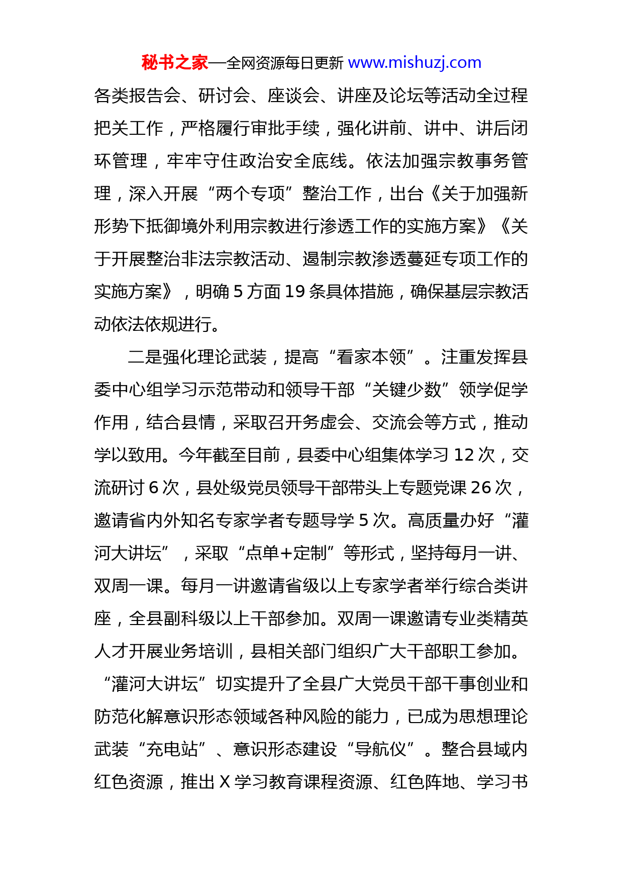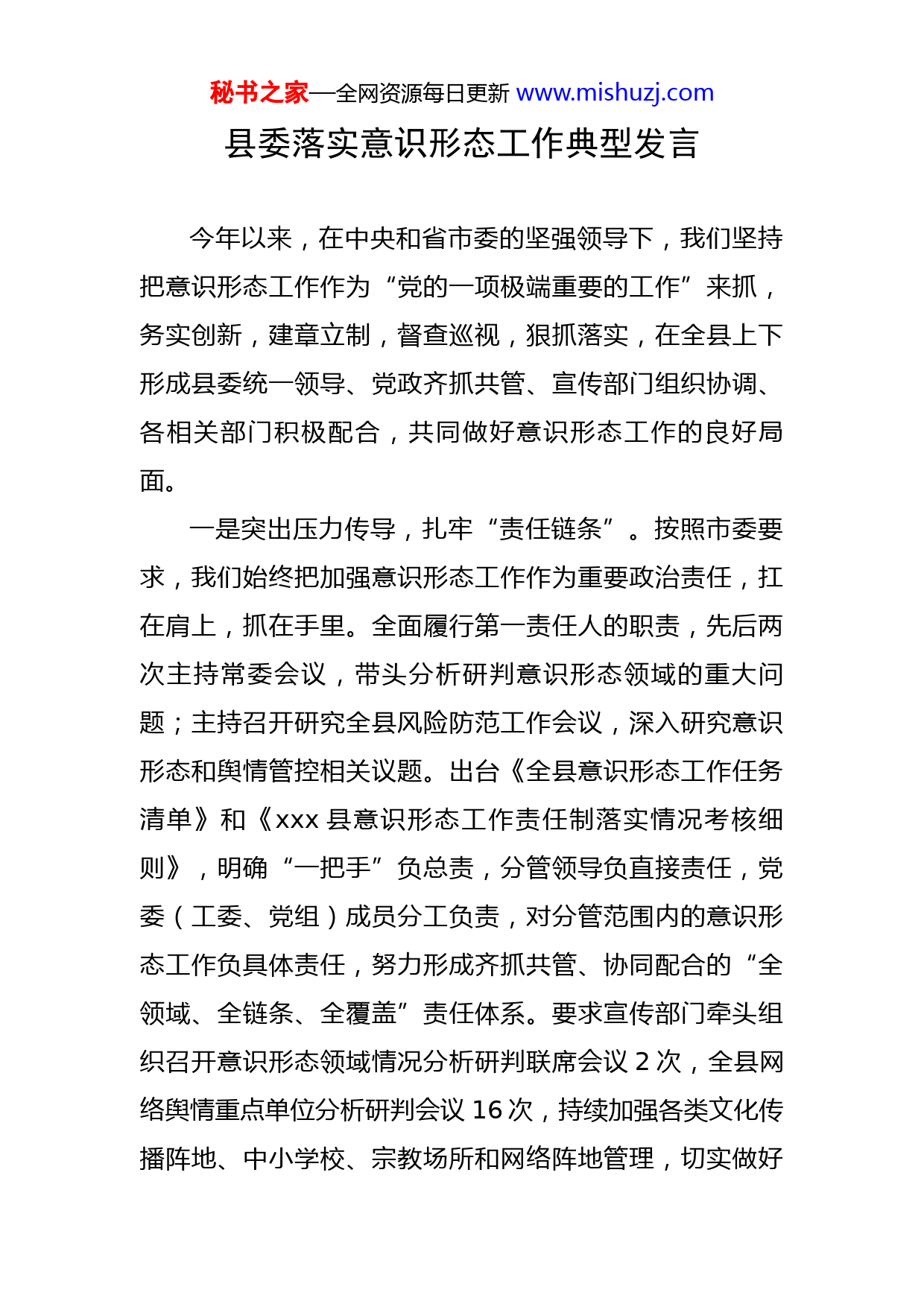 秘书之家—全网资源每日更新www.mishuzj.com县委落实意识形态工作典型发言今年以来,在中央和省市委的坚强领导下,我们坚持把意识形态工作作为“党的一项极端重要的工作”来抓,务实创新,建章立制,督查巡视,狠抓落实,在全县上下形成县委统一领导、党政齐抓共管、宣传部门组织协调、各相关部门积极配合,共同做好意识形态工作的良好局面。一是突出压力传导,扎牢“责任链条”。按照市委要求,我们始终把加强意识形态工作作为重要政治责任,扛在肩上,抓在手里。全面履行第一责任人的职责,先后两次主持常委会议,带头分析研判意识形态领域的重大问题;主持召开研究全县风险防范工作会议,深入研究意识形态和舆情管控相关议题。出台《全县意识形态工作任务清单》和《xxx县意识形态工作责任制落实情况考核细则》,明确“一把手”负总责,分管领导负直接责任,党委(工委、党组)成员分工负责,对分管范围内的意识形态工作负具体责任,努力形成齐抓共管、协同配合的“全领域、全链条、全覆盖”责任体系。要求宣传部门牵头组织召开意识形态领域情况分析研判联席会议2次,全县网络舆情重点单位分析研判会议16次,持续加强各类文化传播阵地、中小学校、宗教场所和网络阵地管理,切实做好秘书之家—全网资源每日更新www.mishuzj.com各类报告会、研讨会、座谈会、讲座及论坛等活动全过程把关工作,严格履行审批手续,强化讲前、讲中、讲后闭环管理,牢牢守住政治安全底线。依法加强宗教事务管理,深入开展“两个专项”整治工作,出台《关于加强新形势下抵御境外利用宗教进行渗透工作的实施方案》《关于开展整治非法宗教活动、遏制宗教渗透蔓延专项工作的实施方案》,明确5方面19条具体措施,确保基层宗教活动依法依规进行。二是强化理论武装,提高“看家本领”。注重发挥县委中心组学习示范带动和领导干部“关键少数”领学促学作用,结合县情,采取召开务虚会、交流会等方式,推动学以致用。今年截至目前,县委中心组集体学习12次,交流研讨6次,县处级党员领导干部带头上专题党课26次,邀请省内外知名专家学者专题导学5次。高质量办好“灌河大讲坛”,采取“点单+定制”等形式,坚持每月一讲、双周一课。每月一讲邀请省级以上专家学者举行综合类讲座,全县副科级以上干部参加。双周一课邀请专业类精英人才开展业务培训,县相关部门组织广大干部职工参加。“灌河大讲坛”切实提升了全县广大党员干部干事创业和防范化解意识形态领域各种风险的能力,已成为思想理论武装“充电站”、意识形态建设“导航仪”。整合县域内红色资源,推出X学习教育课程资源、红色阵地、学习书秘书之家—全网资源每日更新www.mishuzj.com目、“四史”电影“四张清单”,编纂出版《红色xxx》《xxx红色地标》等党史书籍,引导党员干部传承红色基因,汲取奋进力量。组建县委宣讲团赴基层开展“七一”讲话精神、十九届六中全会精神及党史学习教育专题宣讲200余场;县委X学习教育巡回指导组对基层中心组学习和基层支部学习教育开展情况巡听巡查180余次;“百姓名嘴”“草根志愿宣讲员”等采用喜闻乐见的形式,开展意识形态“进村居、进学校、进企业”活动200余场,有力提高了全县干部群众做好新形势下意识形态工作的责任感和使命感。三是注重鼓劲造势,推进“同频共振”。严格按照市委部署要求,统筹推进X学习教育、省市党代会精神学习宣传,xxx西兰花丰收画面荣登CCTV—1综合频道《晚间新闻》黄金时段,《万亩青贮玉米喜获丰收》《97岁抗战老兵自家开设“初心学堂”》等在CCTV—4中文国际频道播出,全年在省级以上媒体刊登外宣稿件2000余篇,其中国家级媒体220余篇。在县融媒体平台策划推出《全县重点项目观摩》等特别直播节目,《璀璨夜xxx盛装庆华诞》等短视频点击量突破10万+。以“永远跟党走”为主题,开展“党旗在基层一线高高飘扬”等群众性主题宣传教育活动260余场次,X学习教育简报省用稿2篇、市用稿近40篇,张集中心社区华余村党总支副书记王X被评为秘书之家—全网资源每日更新www.mishuzj.com“江苏省最美大学毕业生”(全省仅3名),在全县形成同频共振的强劲动力,为经济社会高质量发展营造了良好氛围。四是坚持凝心聚力,打造“精神家园”。以创建全国文明城市为龙头,大力实施基础设施建设、突出问题整改、行业部门履职、镇区补齐短板“四大攻坚”,打造主次干道、背街小巷、老旧小区、农贸市场等多个示范点,县城环境明显改善,一批城市“断头路”打通,新建县城12个停车场,增设停车位1300多个,获得群众一致好评。扎实开展新时代文明实践活动,实现新时代文明实践所、站建设全覆盖,开展志愿服务活动累计800多场次。公民道德建设深入人心,围绕“中国好人”X甫为代表的一批“最美人物”,传递富有正能量的xxx“最美故事”,1人获评“中国好人”,1人当选“江苏好人”,成立市首家县级好人协会,xxx助力微梦公益协会党支部被中共中央表彰为“全国先进基层党组织”。拓宽青少年思想道德教育渠道,组织开展“童心向党”“请党放心、强国有我”系列主题活动及“新时代好少年”评选发布、全县“四仪”示范观摩专场活动等,引导广大青少年坚定理想信念,树立高尚情操。加快文化阵地建设,精心打造文化品