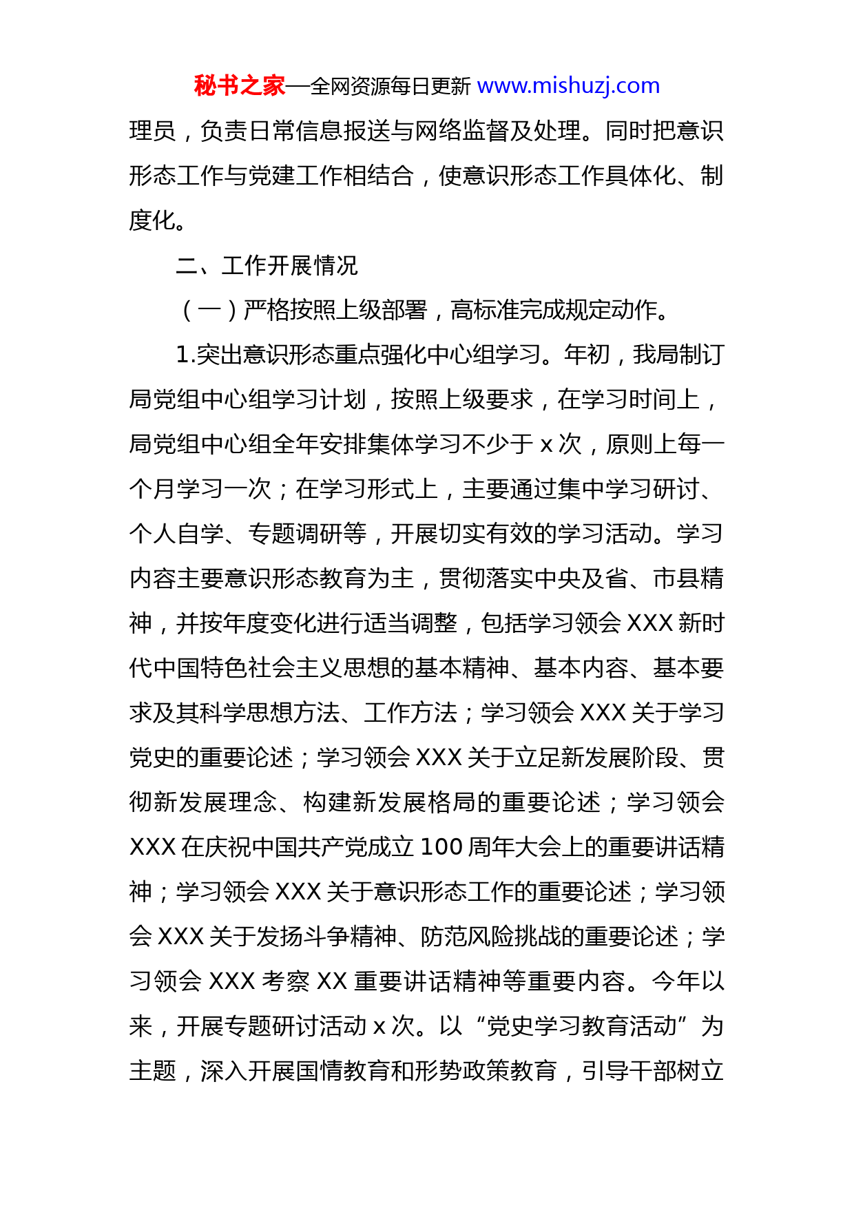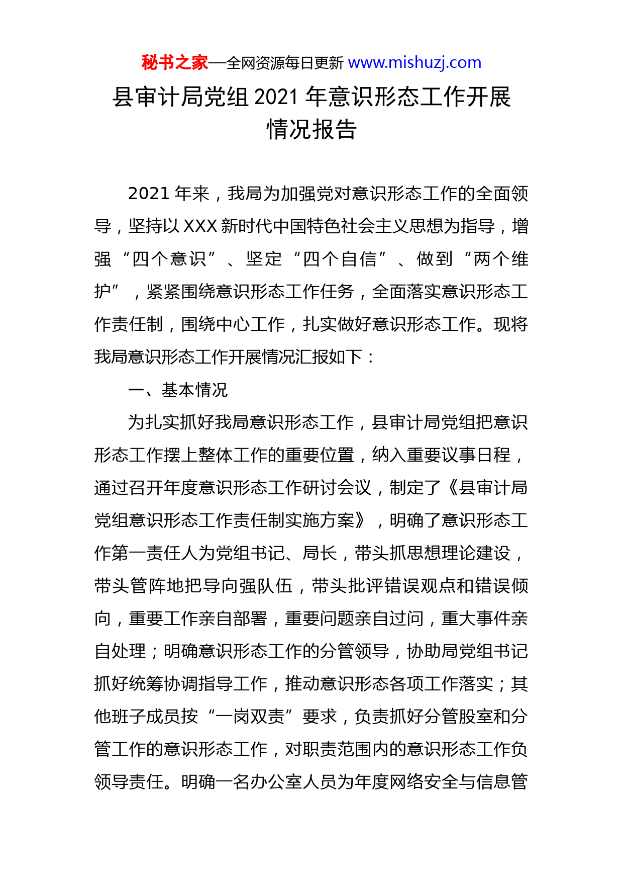 秘书之家—全网资源每日更新www.mishuzj.com县审计局党组2021年意识形态工作开展情况报告2021年来,我局为加强党对意识形态工作的全面领导,坚持以XXX新时代中国特色社会主义思想为指导,增强“四个意识”、坚定“四个自信”、做到“两个维护”,紧紧围绕意识形态工作任务,全面落实意识形态工作责任制,围绕中心工作,扎实做好意识形态工作。现将我局意识形态工作开展情况汇报如下:一、基本情况为扎实抓好我局意识形态工作,县审计局党组把意识形态工作摆上整体工作的重要位置,纳入重要议事日程,通过召开年度意识形态工作研讨会议,制定了《县审计局党组意识形态工作责任制实施方案》,明确了意识形态工作第一责任人为党组书记、局长,带头抓思想理论建设,带头管阵地把导向强队伍,带头批评错误观点和错误倾向,重要工作亲自部署,重要问题亲自过问,重大事件亲自处理;明确意识形态工作的分管领导,协助局党组书记抓好统筹协调指导工作,推动意识形态各项工作落实;其他班子成员按“一岗双责”要求,负责抓好分管股室和分管工作的意识形态工作,对职责范围内的意识形态工作负领导责任。明确一名办公室人员为年度网络安全与信息管秘书之家—全网资源每日更新www.mishuzj.com理员,负责日常信息报送与网络监督及处理。同时把意识形态工作与党建工作相结合,使意识形态工作具体化、制度化。二、工作开展情况(一)严格按照上级部署,高标准完成规定动作。1.突出意识形态重点强化中心组学习。年初,我局制订局党组中心组学习计划,按照上级要求,在学习时间上,局党组中心组全年安排集体学习不少于x次,原则上每一个月学习一次;在学习形式上,主要通过集中学习研讨、个人自学、专题调研等,开展切实有效的学习活动。学习内容主要意识形态教育为主,贯彻落实中央及省、市县精神,并按年度变化进行适当调整,包括学习领会XXX新时代中国特色社会主义思想的基本精神、基本内容、基本要求及其科学思想方法、工作方法;学习领会XXX关于学习党史的重要论述;学习领会XXX关于立足新发展阶段、贯彻新发展理念、构建新发展格局的重要论述;学习领会XXX在庆祝中国共产党成立100周年大会上的重要讲话精神;学习领会XXX关于意识形态工作的重要论述;学习领会XXX关于发扬斗争精神、防范风险挑战的重要论述;学习领会XXX考察XX重要讲话精神等重要内容。今年以来,开展专题研讨活动x次。以“党史学习教育活动”为主题,深入开展国情教育和形势政策教育,引导干部树立秘书之家—全网资源每日更新www.mishuzj.com正确的历史观、大局观、角色观,敢于直面风险挑战,在进行伟大斗争中更好弘扬爱国主义精神;以“新时代公民思想道德建设实施纲要”为主题,开展理想信念教育,深化社会主义和共产主义宣传教育。每季度如期召开党课专题活动,旨在增强干部廉政意识,加强廉洁自律,进一步推进党风廉政建设。2.突出意识形态重点抓好基层党建。建立和落实机关党建工作责任制。做好党建研究和信息报送工作,将党建工作目标层层下达,建立了目标考核机制,党组书记、局长为基层党建第一责任人,亲自抓,相关负责人具体抓,逐项抓落实,不定期地对支部组织开展活动情况进行检查,切实做到党建工作年初有计划、半年有检查,年终有总结。完善规章制度促进组织建设。进一步完善了党务公开制,增强党组织工作透明度;建立和完善制度,制订和完善了各项管理制度,并有效实施管理,签订了党风廉政建设责任书,在项目管理、财务管理及收支两条线等方面都严格按照国家有关规定及程序办理。我局坚持“三会一课”制度,上半年来,召开支委会和党员大会各x次,上党课x次,组织学习XXX新时代中国特色社会主义思想和学习贯彻落实中央、省委、市委、县委重大决策部暑;开展了党组班子成员履行基层党建”一岗双责”述职评议考核和党支部书记”双述双评”工作;扎实做好新时代文明秘书之家—全网资源每日更新www.mishuzj.com实践所建设工作,开展了x次志愿服务活动。3.突出意识形态重点把控反腐败网络舆情。建立网络舆情处置工作领导小组。局党组书记、局长为组长,分管副局长为副组长,局机关股室负责人为领导小组成员。成立网络舆情监控办公室,设在局办公室,负责网络舆情收集、整理、汇报、处理、回复等,努力做到网络舆情信息收集、分析、研判工作规范化常态化。建立网络舆情监控处置队伍。局办公室工作人员XXX担任网络舆情信息监督员,每天定时对红网论坛、红网百姓心声、人民网、新华网、搜狐等网站的舆情信息进行监测、整理、汇报、引导。建立网络舆情预警机制。突出在新冠疫情防控、信访举报、纠风、执法、效能、案件检查等工作过程中发现舆情苗头的重要性,对可能造成网络突发舆情事件进行重点监测、预警,加强对网络舆情的引导,防止恶意炒作。建立网络舆情处置机制。建立网络舆情评论机制。针对网民关注的涉及反腐倡廉工作的热点、难点问题和有关言论,组织反腐倡廉评论员,围绕反腐倡廉工作重点、社会关注的热点问题和敏感话题,引导舆论,保持正确的网络舆论导向。对于在网上捏造事实、恶意攻击等现象适时做好正面引导工作。由于工作到位,近年来审计领域没有出现负面舆论。(二)结合审计自身特点,灵活多样地