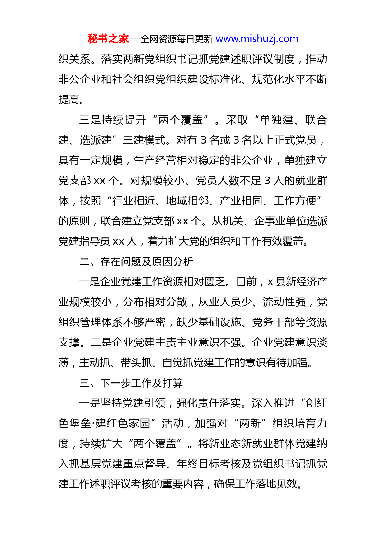 秘书之家—全网资源每日更新www.mishuzj.com县新就业新业态党建工作汇报x县紧密结合建设发展实际,聚焦快递物流、物业等新兴行业,积极探索在新经济新业态条件下开展党的建设工作。现将工作开展情况汇报如下。一、工作开展情况一是摸清底数情况。开展“集中排查组建攻坚月”行动,由市监局、住建局等行管部门选派工作人员,深入新经济新业态就业群体开展集中排查摸底行动。按照属地原则,对所辖的快递物流、物业数量、运转情况,党组织数量及党员人数,党组织工作开展情况等方面,通过电话咨询、实地走访的方式,进行了一次“地毯式”的调查摸底。切实做到了底数清,情况明。我县现有新业态两新组织xx个(从业人员xx人以上),其中专业市场4个、物业服务企业xx个、电商企业xx个、快递企业xx个;从业人员达到xx余人,其中党员xx人。二是严格规范管理。由县委组织部门牵头组织发改局、住建局、市监局、司法局、文体广电旅游局等5家单位,成立新业态新就业群体党建工作专班,构建了县级部门牵头抓总、行管部门主抓落实的工作格局。按照新经济新业态就业群体注册单位,物流、快递、物业等党组织隶属于非公党委,纳入“两新”组织管理,及时调整理顺组秘书之家—全网资源每日更新www.mishuzj.com织关系。落实两新党组织书记抓党建述职评议制度,推动非公企业和社会组织党组织建设标准化、规范化水平不断提高。三是持续提升“两个覆盖”。采取“单独建、联合建、选派建”三建模式。对有3名或3名以上正式党员,具有一定规模,生产经营相对稳定的非公企业,单独建立党支部xx个。对规模较小、党员人数不足3人的就业群体,按照“行业相近、地域相邻、产业相同、工作方便”的原则,联合建立党支部xx个。从机关、企事业单位选派党建指导员xx人,着力扩大党的组织和工作有效覆盖。二、存在问题及原因分析一是企业党建工作资源相对匮乏。目前,x县新经济产业规模较小,分布相对分散,从业人员少、流动性强,党组织管理体系不够严密,缺少基础设施、党务干部等资源支撑。二是企业党建主责主业意识不强。企业党建意识淡薄,主动抓、带头抓、自觉抓党建工作的意识有待加强。三、下一步工作及打算一是坚持党建引领,强化责任落实。深入推进“创红色堡垒·建红色家园”活动,加强对“两新”组织培育力度,持续扩大“两个覆盖”。将新业态新就业群体党建纳入抓基层党建重点督导、年终目标考核及党组织书记抓党建工作述职评议考核的重要内容,确保工作落地见效。秘书之家—全网资源每日更新www.mishuzj.com三是织密组织网络,推动有形有效双覆盖。持续摸排企业总数、运营情况、职工队伍、党员队伍等情况,开展组织找党员、党员找组织、党员找党员的“三找”行动,对符合条件的新业态新就业群体及时建立党组织,注重从机关事业单位选派党务经验丰富的退二线干部、退休干部担任党建指导员,探索在企业招聘中党员优先,增强企业党员队伍力量。三是密切联系服务,拓展提升党组织凝聚力。聚焦党建带群建,按照“党组织+工会+共青团+妇联”工作模式,组织工会、共青团、妇联、社会组织等资源力量下沉服务。充分调动党群工作资源,扩大党建工作覆盖,着力增强示范引带作用。依托工会户外劳动者服务站点建设,计划建立“红色驿站”,配置桌椅、饮水设备、微波炉、医药箱等实用设施,为户外工作者、外卖快递从业者提供暖心服务。