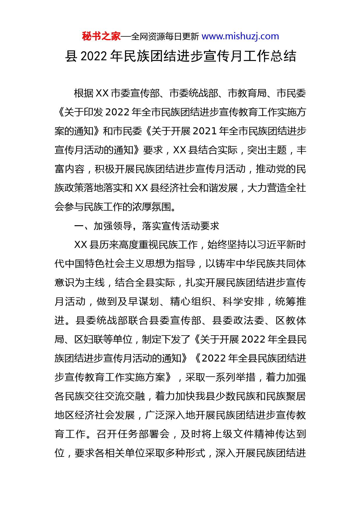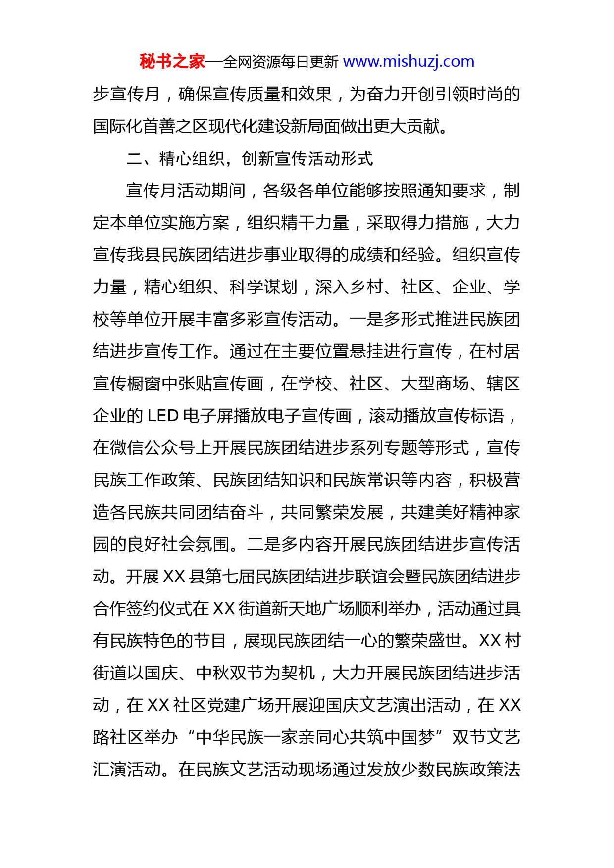 秘书之家—全网资源每日更新www.mishuzj.com县2022年民族团结进步宣传月工作总结根据XX市委宣传部、市委统战部、市教育局、市民委《关于印发2022年全市民族团结进步宣传教育工作实施方案的通知》和市民委《关于开展2021年全市民族团结进步宣传月活动的通知》要求,XX县结合实际,突出主题,丰富内容,积极开展民族团结进步宣传月活动,推动党的民族政策落地落实和XX县经济社会和谐发展,大力营造全社会参与民族工作的浓厚氛围。一、加强领导,落实宣传活动要求XX县历来高度重视民族工作,始终坚持以习近平新时代中国特色社会主义思想为指导,以铸牢中华民族共同体意识为主线,结合全县实际,扎实开展民族团结进步宣传月活动,做到及早谋划、精心组织、科学安排,统筹推进。县委统战部联合县委宣传部、县委政法委、区教体局、区妇联等单位,制定下发了《关于开展2022年全县民族团结进步宣传月活动的通知》《2022年全县民族团结进步宣传教育工作实施方案》,采取一系列举措,着力加强各民族交往交流交融,着力加快我县少数民族和民族聚居地区经济社会发展,广泛深入地开展民族团结进步宣传教育工作。召开任务部署会,及时将上级文件精神传达到位,要求各相关单位采取多种形式,深入开展民族团结进秘书之家—全网资源每日更新www.mishuzj.com步宣传月,确保宣传质量和效果,为奋力开创引领时尚的国际化首善之区现代化建设新局面做出更大贡献。二、精心组织,创新宣传活动形式宣传月活动期间,各级各单位能够按照通知要求,制定本单位实施方案,组织精干力量,采取得力措施,大力宣传我县民族团结进步事业取得的成绩和经验。组织宣传力量,精心组织、科学谋划,深入乡村、社区、企业、学校等单位开展丰富多彩宣传活动。一是多形式推进民族团结进步宣传工作。通过在主要位置悬挂进行宣传,在村居宣传橱窗中张贴宣传画,在学校、社区、大型商场、辖区企业的LED电子屏播放电子宣传画,滚动播放宣传标语,在微信公众号上开展民族团结进步系列专题等形式,宣传民族工作政策、民族团结知识和民族常识等内容,积极营造各民族共同团结奋斗,共同繁荣发展,共建美好精神家园的良好社会氛围。二是多内容开展民族团结进步宣传活动。开展XX县第七届民族团结进步联谊会暨民族团结进步合作签约仪式在XX街道新天地广场顺利举办,活动通过具有民族特色的节目,展现民族团结一心的繁荣盛世。XX村街道以国庆、中秋双节为契机,大力开展民族团结进步活动,在XX社区党建广场开展迎国庆文艺演出活动,在XX路社区举办“中华民族一家亲同心共筑中国梦”双节文艺汇演活动。在民族文艺活动现场通过发放少数民族政策法秘书之家—全网资源每日更新www.mishuzj.com规书籍、民族团结宣传册、民族团结宣传画和摆放民族团结展板的方式,积极宣传国家民族政策、惠民措施,教育引导各族群众积极参与民族团结进步创建活动。三是多媒体打造民族团结进步宣传氛围。在各项宣传活动中注重发挥新媒体作用,把宣传活动内容通过XX市电视台、安徽日报等传统媒体,中国网、凤凰网、人民网、听见天阳等新型网络媒体及时有效的发布出去,让更多人了解民族团结进步工作的重大意义,让社会参与民族团结进步建设。三、开展活动,注重宣传工作实效XX县民族团结进步宣传教育工作坚持“常规有创新、重点有突破、整体有特色”的工作要求,着力在民族宗教领域展现XX形象,务求工作实效。一是宣传内容上更加注重实效。注重文化交流,促进民族情谊,与新疆驻潜工作组签订合作协议,联合举办了“手拉手”潜疆融情交流营活动、石榴开花”潜疆艺术交流营活动,省民委、新疆驻潜工作组在XX县联合举办“潜疆一家亲舞动石榴情”舞蹈艺术交流活动,促进民族工作沟通协作。在XX路步行街少数民族特色产品展,助力少数民族企业克服疫情影响,恢复生产,助力少数民族群众脱贫致富。把民族宗教事项进区行政服务网,促进全县各族群众民族政策的了解,方便民族事项办理,提高工作效率。秘书之家—全网资源每日更新www.mishuzj.com二是宣传活动上更加注重结合。宣传月期间,各乡镇、街道利用多种形式,结合相关工作,开展了广泛的宣传教育活动。二里街道结合校园交通安全教育,在小学、中学中开展多种形式的宣传活动,牢固树立广大教职工和青少年学生正确的民族观;XX经开区结合“七五”普法活动,把民族工作的政策法规送进千家万户;XXX街道结合“争当文明市民,要从我做起,从现在做起,从小事做起”活动,邀请少数民族家庭共同参与活动,宣传民族团结相关常识;XX街道通过举办“民族知识竞赛”、“新乡贤讲民族团结”知识讲座等活动,大力宣传党和国家的民族政策法律法规、民族团结进步的意义;XX街道组织群众开展丰富多彩的“朗读者”活动,促进不同民族居民之间友好交流。三是走访慰问更加注重实情。XX街道定期走访辖区少数民族企业,了解企业生产经营情况,及时解决实际困难;XX乡结合网格化管理服务工作机制,开展入户走访少数民族活动;XX经开区“大摸底、大排查、大提升”活动为契机,对辖区少数民族进行摸底,共摸出15户36人;XX街道XX社区结合“四联四定”,联合XX市商务局机关党委,邀请XX骨科医院专家,走进小区开展免费义诊和健康咨询,期间服务少数
