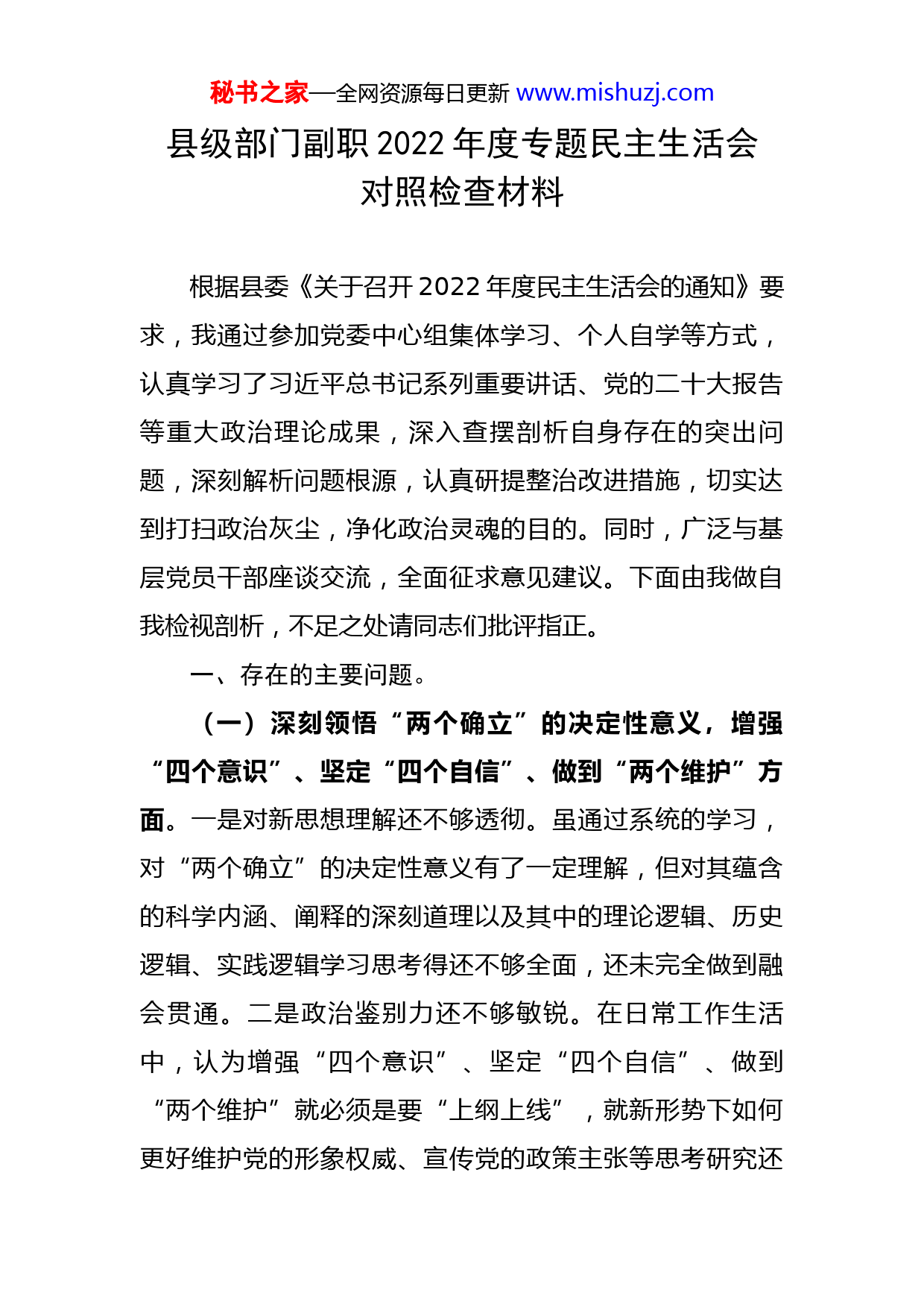 秘书之家—全网资源每日更新www.mishuzj.com县级部门副职2022年度专题民主生活会对照检查材料根据县委《关于召开2022年度民主生活会的通知》要求,我通过参加党委中心组集体学习、个人自学等方式,认真学习了习近平总书记系列重要讲话、党的二十大报告等重大政治理论成果,深入查摆剖析自身存在的突出问题,深刻解析问题根源,认真研提整治改进措施,切实达到打扫政治灰尘,净化政治灵魂的目的。同时,广泛与基层党员干部座谈交流,全面征求意见建议。下面由我做自我检视剖析,不足之处请同志们批评指正。一、存在的主要问题。(一)深刻领悟“两个确立”的决定性意义,增强“四个意识”、坚定“四个自信”、做到“两个维护”方面。一是对新思想理解还不够透彻。虽通过系统的学习,对“两个确立”的决定性意义有了一定理解,但对其蕴含的科学内涵、阐释的深刻道理以及其中的理论逻辑、历史逻辑、实践逻辑学习思考得还不够全面,还未完全做到融会贯通。二是政治鉴别力还不够敏锐。在日常工作生活中,认为增强“四个意识”、坚定“四个自信”、做到“两个维护”就必须是要“上纲上线”,就新形势下如何更好维护党的形象权威、宣传党的政策主张等思考研究还秘书之家—全网资源每日更新www.mishuzj.com不深,对意识形态领域的复杂性缺乏警惕性和鉴别力,比如对身边和社会上的个别消极或负面言论当成了笑话听,认为自己只要不附和就行了,没能做到第一时间抵制和斗争。三是在服务大局上还存有偏差。贯彻执行上级决策部署时,政治站位还不够高,局限于自己负责的工作领域,在执行时经常首先考虑的是如何从本部门角度去推动落实、完成分管的任务指标,缺乏从战略的高度和围绕中心重点工作、单位整体发展大局的角度来统筹推进。(二)带头用习近平新时代中国特色社会主义思想凝心铸魂方面。一是在学懂弄通上还不够到位。在学习习近平新时代中国特色社会主义思想过程中,缺少一定的系统性、全面性,没有很好地处理学习与工作的关系,沉下心来深学细研新思想的次数较少,学习过程比较粗糙,没有真正做到立足新时代历史背景、立足工作实际去深入探究思想内涵和精神实质。二是在教育引导上还不够贯通。坚持不懈用党的创新理论凝心铸魂是我的本职工作,平时的抓建中我也想了很多办法、出了很多实招,也取得了一定实效,但在主抓学习教育中还是容易忽视个体文化素养差异和接受理解消化能力,有的方式方法与队伍目前能力素质的实际还不相适应日常学习教育抓建成效还不够凸显。三是在学用结合上还不够紧密。如何将所学的理论知识运用到实际工作中,创造性地指导和推动工作方面做得不够秘书之家—全网资源每日更新www.mishuzj.com好,对习近平新时代中国特色社会主义思想在如何做到以知促行、以行促知、知行合一等方面领悟还有很大差距,理论学习的实践性、实效性有待强化。(三)带头坚持和加强党的全面领导方面。一是落实民主意志还不够充分。对民主集中制的理论学习还不够深入,对把握民主与集中的关系不够到位,在参与党委议事过程中有时过多的关注自己负责和分管的工作,对于未分管的工作主动思考不够多、研究得不够深,发表的工作建议针对性和操作性不够强。二是思想转换还不够迅速。从去年提任副局长以来,因到任时间还较短,工作思维都还未完全融合转化,考虑事项、抓建工作都还存有一定片面,尤其是对新形势下的党建工作、政治教育以及人员管理等工作深入思考和调研还不够,对基层的指导力度还需进一步加大。三是决策执行还不够深入。在面对多项党委决策部署同步推进落实时没有很好的处理和妥善协调安排,执行过程中存有顾此失彼、见子打子现象,轻重缓急、全盘统筹得还不够到位。同时,在执行决策中有时还存有一定的急切心理,易造成“隧道效应”,忽视了整体工作推进,导致有的党委决策执行落实缺乏精细、精致。(四)带头坚持以人民为中心的发展思想方面。一是工作创新意识不够有力。受个人阅历、思维、能力等客观因素限制,在落实以人民为中心的发展思想中,工作方式秘书之家—全网资源每日更新www.mishuzj.com方法的创新力度还不够,思维局限于老经验、老办法、老套路,凝聚集体智慧力量进行问题集中攻坚做得还不够深入,工作措施制定上没有真正做到与时俱进,后续推力不够强,在增强工作的创新性、实效性、持续性上还有很大的提升空间。二是深入调查研究不够经常。在调研过程,对自己想要了解的事情关注多一些,导致调研反映出的问题还不够全面,在推动解决基层队伍建设、实际困难等方面,推进还需进一步加强。同时,平常与班子成员、基层骨干都能经常进行谈心交心,对他们的情况掌握也比较好,但对于一般的沟通交流还不够,对于他们的情况主要还是靠逐级汇报,一些实际困难掌握的不够及时、全面、具体。三是问题解决成效不够明显。虽用心用情用力解决职工部分困难问题,对重点、难点困难诉求也进行了认真的研究、协调、推进,但还没有完全做到全面认清和系统把握不同群体困难问题的多样化、个性化、特殊化,未能做到及时、科学、合理地回应个别职工关切的诉求,解决突出困难问题成效还需进一步发力(五)带头发扬斗争精神,防范化解风险挑战方面