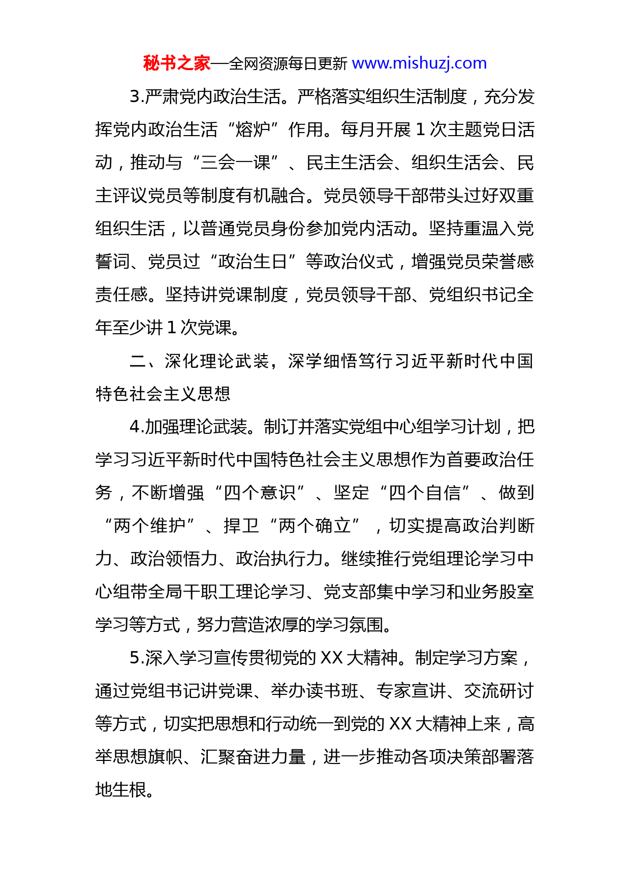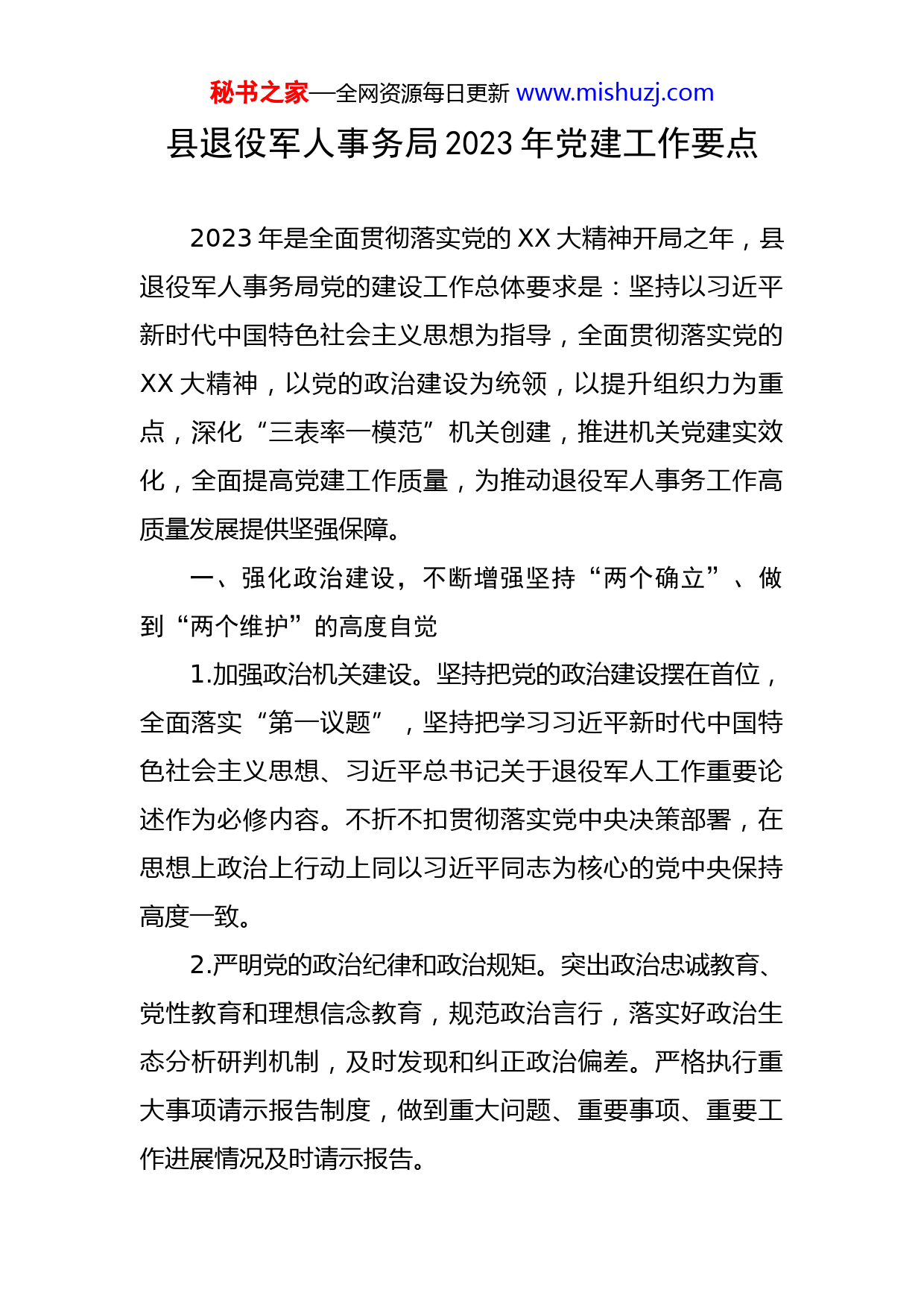秘书之家—全网资源每日更新www.mishuzj.com县退役军人事务局2023年党建工作要点2023年是全面贯彻落实党的XX大精神开局之年,县退役军人事务局党的建设工作总体要求是:坚持以习近平新时代中国特色社会主义思想为指导,全面贯彻落实党的XX大精神,以党的政治建设为统领,以提升组织力为重点,深化“三表率一模范”机关创建,推进机关党建实效化,全面提高党建工作质量,为推动退役军人事务工作高质量发展提供坚强保障。一、强化政治建设,不断增强坚持“两个确立”、做到“两个维护”的高度自觉1.加强政治机关建设。坚持把党的政治建设摆在首位,全面落实“第一议题”,坚持把学习习近平新时代中国特色社会主义思想、习近平总书记关于退役军人工作重要论述作为必修内容。不折不扣贯彻落实党中央决策部署,在思想上政治上行动上同以习近平同志为核心的党中央保持高度一致。2.严明党的政治纪律和政治规矩。突出政治忠诚教育、党性教育和理想信念教育,规范政治言行,落实好政治生态分析研判机制,及时发现和纠正政治偏差。严格执行重大事项请示报告制度,做到重大问题、重要事项、重要工作进展情况及时请示报告。秘书之家—全网资源每日更新www.mishuzj.com3.严肃党内政治生活。严格落实组织生活制度,充分发挥党内政治生活“熔炉”作用。每月开展1次主题党日活动,推动与“三会一课”、民主生活会、组织生活会、民主评议党员等制度有机融合。党员领导干部带头过好双重组织生活,以普通党员身份参加党内活动。坚持重温入党誓词、党员过“政治生日”等政治仪式,增强党员荣誉感责任感。坚持讲党课制度,党员领导干部、党组织书记全年至少讲1次党课。二、深化理论武装,深学细悟笃行习近平新时代中国特色社会主义思想4.加强理论武装。制订并落实党组中心组学习计划,把学习习近平新时代中国特色社会主义思想作为首要政治任务,不断增强“四个意识”、坚定“四个自信”、做到“两个维护”、捍卫“两个确立”,切实提高政治判断力、政治领悟力、政治执行力。继续推行党组理论学习中心组带全局干职工理论学习、党支部集中学习和业务股室学习等方式,努力营造浓厚的学习氛围。5.深入学习宣传贯彻党的XX大精神。制定学习方案,通过党组书记讲党课、举办读书班、专家宣讲、交流研讨等方式,切实把思想和行动统一到党的XX大精神上来,高举思想旗帜、汇聚奋进力量,进一步推动各项决策部署落地生根。秘书之家—全网资源每日更新www.mishuzj.com6.巩固拓展党史学习教育成果。巩固拓展“不忘初心、牢记使命”主题教育、党史学习教育成果,大力弘扬伟大建党精神。加强“四史”宣传教育,切实将党史学习教育激发出来的热情转化为攻坚克难、干事创业的精气神,持续深化“党旗在基层一线高高飘扬”“我为老兵办实事”等实践活动,形成常态化长效化机制,以实实在在的行动提升退役军人获得感幸福感荣誉感。7.加强意识形态工作。落实意识形态工作责任制,定期专题研究意识形态工作,紧盯重要时间节点,加强意识形态领域形势分析研判,防范化解风险隐患特别是政治风险,及时报告意识形态工作情况。三、夯实基层基础,深入推动机关党组织全面进步全面过硬8.筑牢支部战斗堡垒。对标落实支部工作条例、机关基层组织工作条例及贯彻落实的具体措施,以“星级党支部”建设为载体,从思想教育、基础建设、作用发挥等方面推进党支部标准化规范化建设,着力打造政治坚定、组织健全、队伍过硬、机制完善、服务优良、保障有力的党支部。9.加强党员教育管理。加强对入党积极分子的教育、培养和考察,规范党员发展程序,坚持把政治标准摆在首位,严把党员发展“入口关”,提高发展党员质量。规范秘书之家—全网资源每日更新www.mishuzj.com党费收缴、使用和管理。坚持教育、管理、监督、服务相结合,推动党员教育管理抓在日常、严在经常。推行党务公开,发挥党员主体作用,认真履行义务,正确行使权利。10.发挥党员先锋模范作用。着眼全局、立足岗位,充分发挥党员模范带头作用,在急难险重工作中冲锋在前。持续做好机关支部与社区党组织结对共建工作,常态化组织在职党员到小区开展志愿服务活动,帮助群众解决实际困难。四、服务中心大局,以高质量党建引领全局工作高质量发展11.始终牢记“国之大者”。把党建工作成效体现在贯彻党中央和省委、市委、县委决策部署和工作要求上,体现在提升人民群众满意度上。切实找准党建服务中心大局的切入点和结合点,探索推动党支部、广大党员发挥作用的有效载体和工作抓手。12.深入推进抓党建促乡村振兴。持续派强用好驻村第一书记和工作队,全面落实待遇保障和关心关爱政策。整合单位资源力量助推村级发展,党组书记每年至少到村调研1次,指导发展壮大集体经济和美丽村庄建设,推动联系村做好产业振兴、文化振兴和生态振兴文章。13.推动党建和业务深度融合。深刻把握党建围绕中秘书之家—全网资源每日更新www.mishuzj.com心、服务大局的职责定位,全力促进党建和业务工作一体推动、深度融合,以固根基、守底线,求精准、提质效,扬优势、创品牌为目标,把党的领导贯穿履职尽责全过程,推动思想权益、优待抚恤、移交安置、就业创业、军休服务、