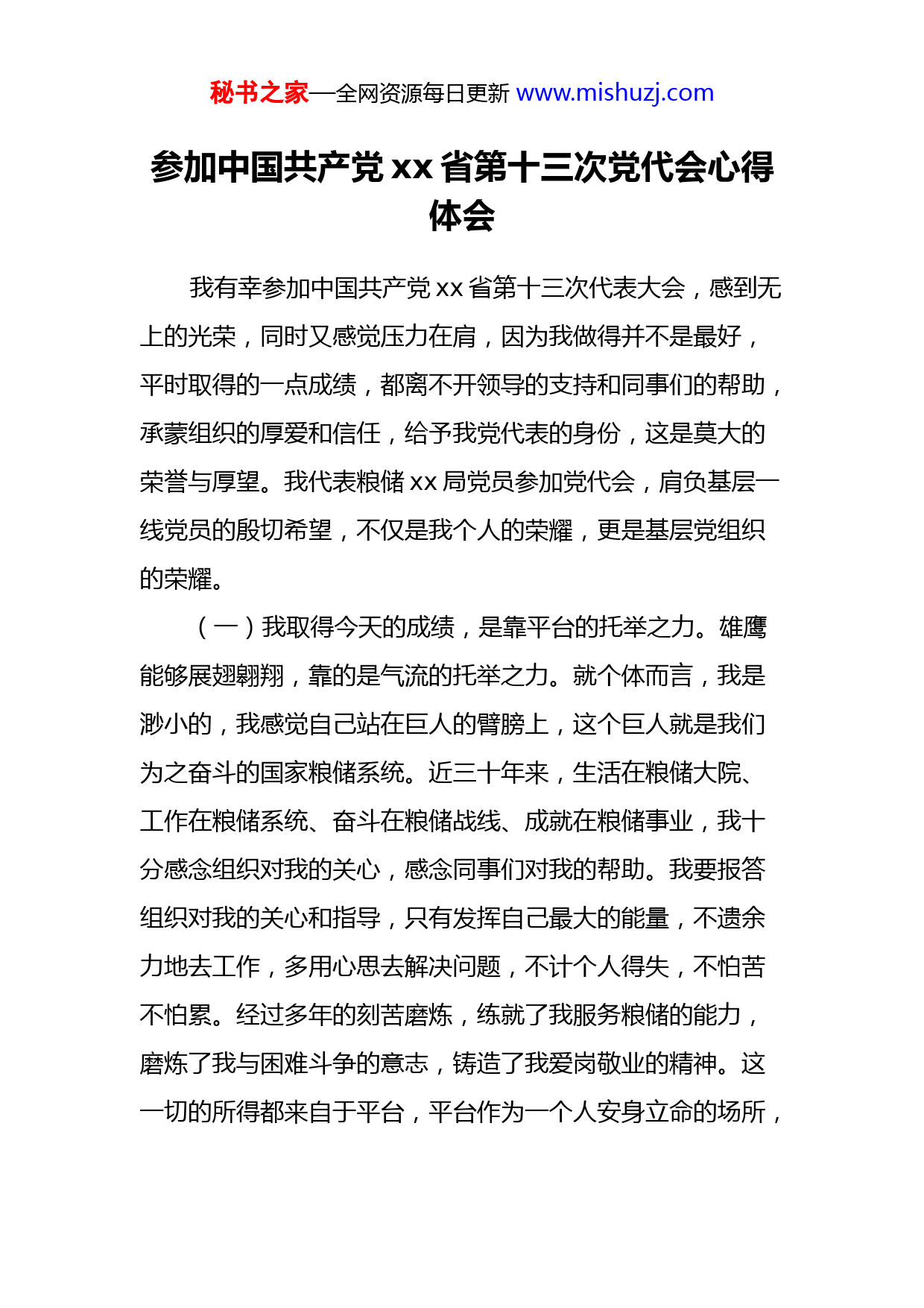 秘书之家—全网资源每日更新www.mishuzj.com参加中国共产党xx省第十三次党代会心得体会我有幸参加中国共产党xx省第十三次代表大会,感到无上的光荣,同时又感觉压力在肩,因为我做得并不是最好,平时取得的一点成绩,都离不开领导的支持和同事们的帮助,承蒙组织的厚爱和信任,给予我党代表的身份,这是莫大的荣誉与厚望。我代表粮储xx局党员参加党代会,肩负基层一线党员的殷切希望,不仅是我个人的荣耀,更是基层党组织的荣耀。(一)我取得今天的成绩,是靠平台的托举之力。雄鹰能够展翅翱翔,靠的是气流的托举之力。就个体而言,我是渺小的,我感觉自己站在巨人的臂膀上,这个巨人就是我们为之奋斗的国家粮储系统。近三十年来,生活在粮储大院、工作在粮储系统、奋斗在粮储战线、成就在粮储事业,我十分感念组织对我的关心,感念同事们对我的帮助。我要报答组织对我的关心和指导,只有发挥自己最大的能量,不遗余力地去工作,多用心思去解决问题,不计个人得失,不怕苦不怕累。经过多年的刻苦磨炼,练就了我服务粮储的能力,磨炼了我与困难斗争的意志,铸造了我爱岗敬业的精神。这一切的所得都来自于平台,平台作为一个人安身立命的场所,秘书之家—全网资源每日更新www.mishuzj.com是无比重要的,如果离开了平台,我们会变得很渺小,会变得前路茫茫,单打独斗很难成功。我感到很荣幸和幸运,能够立足于粮储这个平台,发挥自己最大的能量。所以,我要以老粮储的身份,与年轻人分享经历,立足粮储大平台,服务粮储大家庭,不要怕吃苦,也不要怕吃亏,任何付出都会有回报,只是回报的形式不同而已,只是回报的时间长短而已。(二)我这些年默默地奉献,是靠利他精神在支撑。攀登者能不畏艰难跋涉前行,靠的是不登顶峰不舍弃的精神支撑。这些年来在七三三处,我孜孜以求认真履职,所做的任何事情,只考虑单位的发展,不考虑个人之得失,单位的荣辱就是我个人的荣辱,单位的成功就是我个人的成功,把自己托付给储备事业,把自己的力量奉献给储备事业。多年来我一如既往,不管是哪个岗位的设备,只要找到了我,我都义无反顾去帮忙,这就是利他精神,没有利他精神,再成功也是失败的。我们立足社会干事创业,衡量成功与否,不是你得到了多少,而是你为集体、为国家奉献了多少。我感到很荣幸,能够立足于粮储这个平台,发挥自己最大的能量。(三)为什么我身上落满花瓣?因为我行走在春天里。我们这一代粮储人是幸运的,我们生活在一个伟大的时代,我们在伟大的中国共产党的带领下不断向前探索,我们所服务的国家粮储事业,是国家发展的“压舱石”“稳定器”,秘书之家—全网资源每日更新www.mishuzj.com我们所做的一切工作,是多么的光荣和重要。以我们的事业为荣,立足岗位,努力工作,守好自己的防线,切实做到“多添彩、不添乱”,一心一意干工作,全心全意为事业。这几年为了储备事业的发展,我们储备战线增添了不少有知识、有文化、朝气蓬勃的年轻人,我要以我的经历告诉大家,要把做老实人、讲老实话、做老实事作为人生信条,强化实践磨炼,立足岗位成才,要主动争取任务、争取担子,在艰苦工作中砥砺品质、增长才干。粮储的未来在你们身上,储备的壮大要靠大家去努力。服务粮储是我一生中最自豪的事,我要用行动去诠释我的爱。干事业就像栽一棵果树,你用心去栽培浇灌、施肥打药,付出了汗水,它总会结出你需要的果实