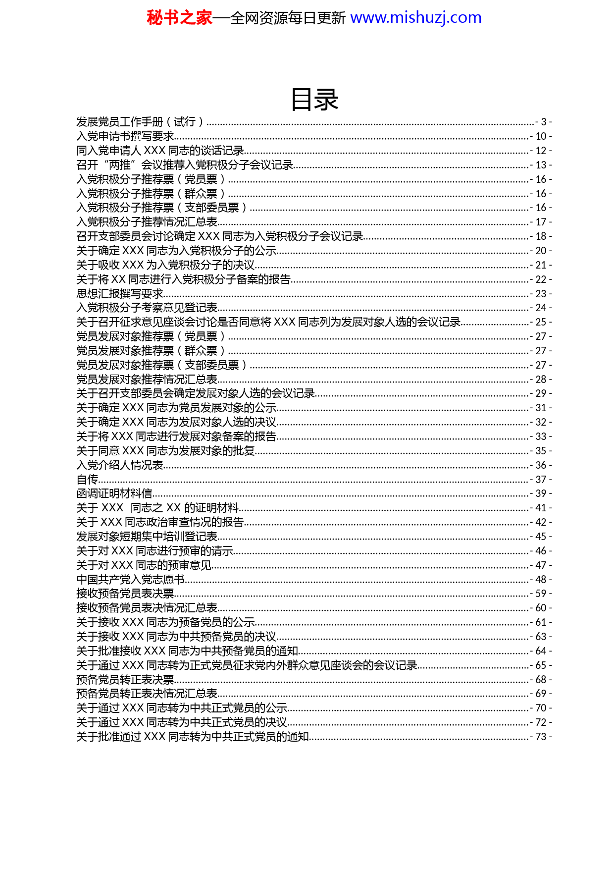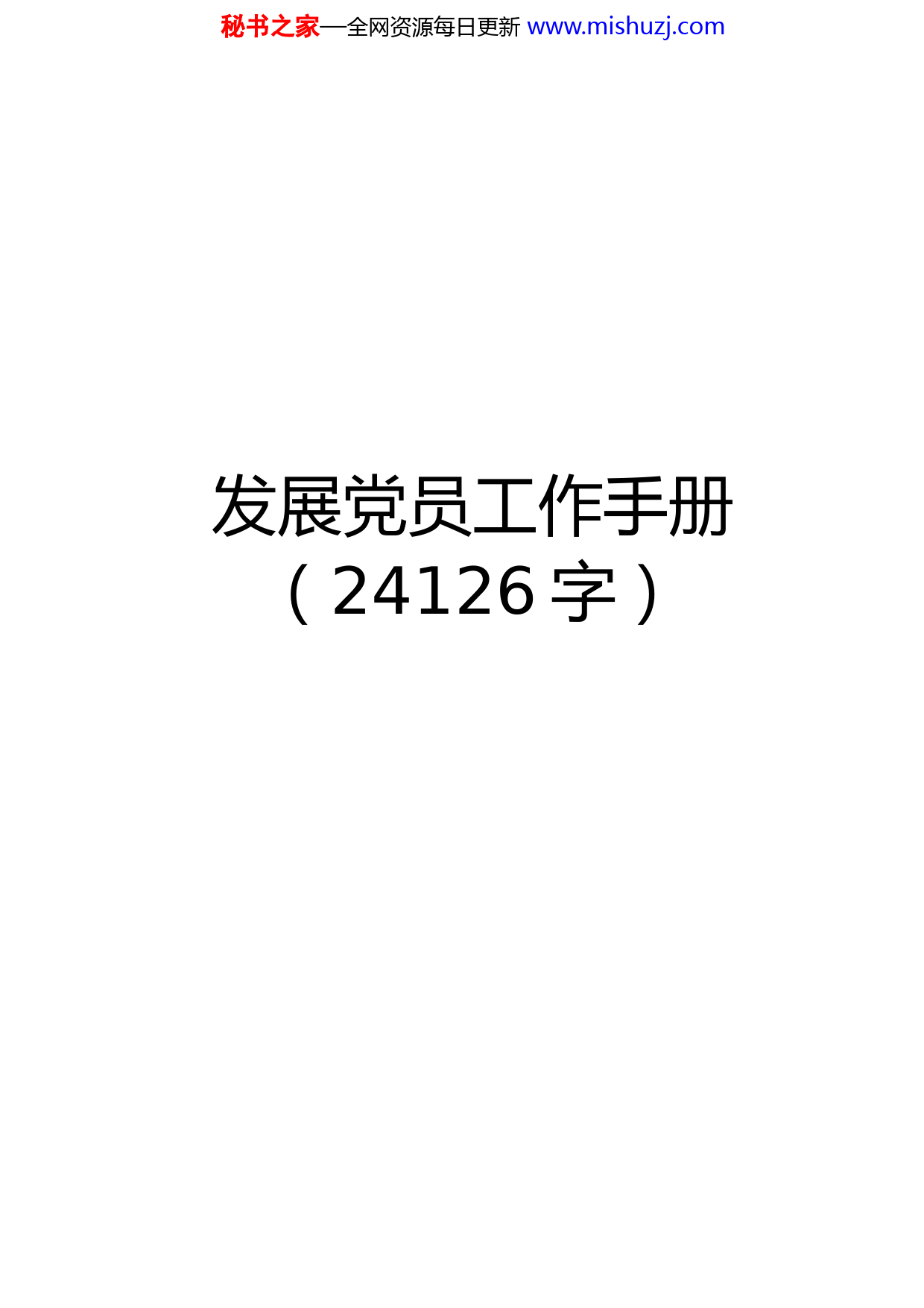 秘书之家—全网资源每日更新www.mishuzj.com发展党员工作手册(24126字)秘书之家—全网资源每日更新www.mishuzj.com目录发展党员工作手册(试行)........................................................................................................................-3-入党申请书撰写要求..................................................................................................................................-10-同入党申请人XXX同志的谈话记录........................................................................................................-12-召开“两推”会议推荐入党积极分子会议记录......................................................................................-13-入党积极分子推荐票(党员票)..............................................................................................................-16-入党积极分子推荐票(群众票)..............................................................................................................-16-入党积极分子推荐票(支部委员票)......................................................................................................-16-入党积极分子推荐情况汇总表..................................................................................................................-17-召开支部委员会讨论确定XXX同志为入党积极分子会议记录............................................................-18-关于确定XXX同志为入党积极分子的公示............................................................................................-20-关于吸收XXX为入党积极分子的决议....................................................................................................-21-关于将XX同志进行入党积极分子备案的报告.......................................................................................-22-思想汇报撰写要求......................................................................................................................................-23-入党积极分子考察意见登记表..................................................................................................................-24-关于召开征求意见座谈会讨论是否同意将XXX同志列为发展对象人选的会议记录.........................-25-党员发展对象推荐票(党员票)..............................................................................................................-27-党员发展对象推荐票(群众票)..............................................................................................................-27-党员发展对象推荐票(支部委员票)......................................................................................................-27-党员发展对象推荐情况汇总表..................................................................................................................-28-关于召开支部委员会确定发展对象人选的会议记录..............................................................................-29-关于确定XXX同志为党员发展对象的公示............................................................................................-31-关于确定XXX同志为发展对象人选的决议............................................................................................-32-关于将XXX同志进行发展对象备案的报告............................................................................................-33-关于同意XXX同志为发展对象的批复....................................................................................................-35-入党介绍人情况表......................................................................................................................................-36-自传.............................................................................................................................................................-37-函调证明材料信..........................................................................................................................................-39-关于XXX同志之XX的证明材料..........................................................................................................-41-关于XXX同志政治审查情况的报告........................................................................................................-42-发展对象短期集中培训登记表..................................................................................................................-45-关于对XXX同志进行预审的请示............................................................................................................-46-关于对XXX同志的预审意见....................................................................................................................-47-中国共产党入党志愿书..............................................................................................................................-48-接收预备党员表决票..................................................................................................................................-59-接收预备党员表决情况汇总表..................................................................................................................-60-关于接收XXX同志为预备党员的公示....................................................................................................-61-关于接收XXX同志为中共预备党员的决议............................................................................................-63-关于批准接收XXX同志为中共预备党员的通知....................................................................................-64-关于通过XXX同志转为正式党员征求党内外群众意见座谈会