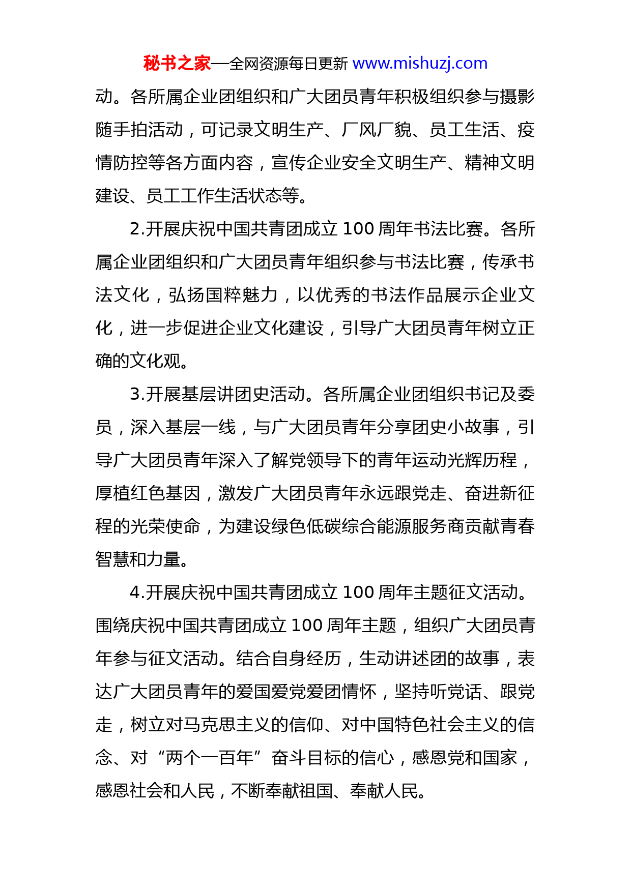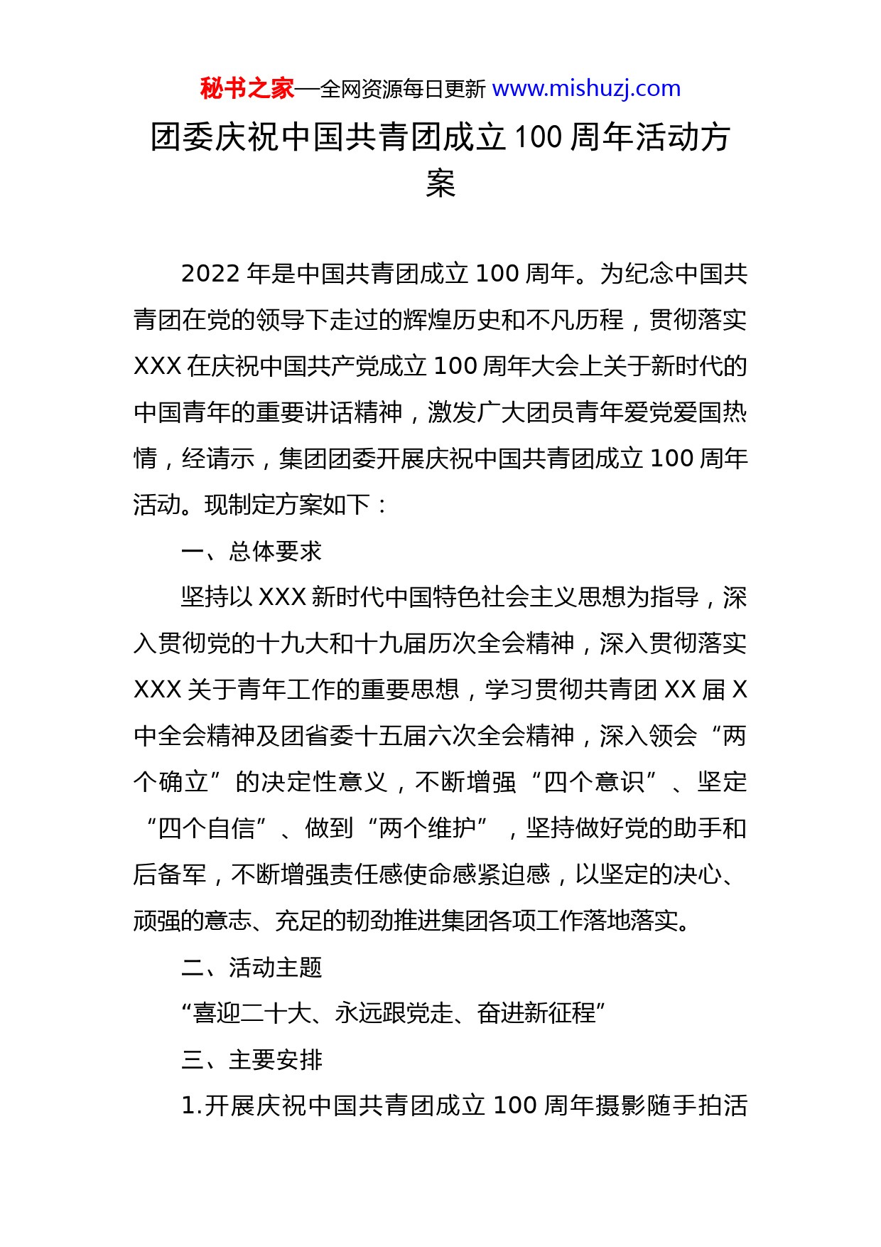 秘书之家—全网资源每日更新www.mishuzj.com团委庆祝中国共青团成立100周年活动方案2022年是中国共青团成立100周年。为纪念中国共青团在党的领导下走过的辉煌历史和不凡历程,贯彻落实XXX在庆祝中国共产党成立100周年大会上关于新时代的中国青年的重要讲话精神,激发广大团员青年爱党爱国热情,经请示,集团团委开展庆祝中国共青团成立100周年活动。现制定方案如下:一、总体要求坚持以XXX新时代中国特色社会主义思想为指导,深入贯彻党的十九大和十九届历次全会精神,深入贯彻落实XXX关于青年工作的重要思想,学习贯彻共青团XX届X中全会精神及团省委十五届六次全会精神,深入领会“两个确立”的决定性意义,不断增强“四个意识”、坚定“四个自信”、做到“两个维护”,坚持做好党的助手和后备军,不断增强责任感使命感紧迫感,以坚定的决心、顽强的意志、充足的韧劲推进集团各项工作落地落实。二、活动主题“喜迎二十大、永远跟党走、奋进新征程”三、主要安排1.开展庆祝中国共青团成立100周年摄影随手拍活秘书之家—全网资源每日更新www.mishuzj.com动。各所属企业团组织和广大团员青年积极组织参与摄影随手拍活动,可记录文明生产、厂风厂貌、员工生活、疫情防控等各方面内容,宣传企业安全文明生产、精神文明建设、员工工作生活状态等。2.开展庆祝中国共青团成立100周年书法比赛。各所属企业团组织和广大团员青年组织参与书法比赛,传承书法文化,弘扬国粹魅力,以优秀的书法作品展示企业文化,进一步促进企业文化建设,引导广大团员青年树立正确的文化观。3.开展基层讲团史活动。各所属企业团组织书记及委员,深入基层一线,与广大团员青年分享团史小故事,引导广大团员青年深入了解党领导下的青年运动光辉历程,厚植红色基因,激发广大团员青年永远跟党走、奋进新征程的光荣使命,为建设绿色低碳综合能源服务商贡献青春智慧和力量。4.开展庆祝中国共青团成立100周年主题征文活动。围绕庆祝中国共青团成立100周年主题,组织广大团员青年参与征文活动。结合自身经历,生动讲述团的故事,表达广大团员青年的爱国爱党爱团情怀,坚持听党话、跟党走,树立对马克思主义的信仰、对中国特色社会主义的信念、对“两个一百年”奋斗目标的信心,感恩党和国家,感恩社会和人民,不断奉献祖国、奉献人民。秘书之家—全网资源每日更新www.mishuzj.com5.持续深入开展“我为青年做件事”主题实践活动。各所属企业团组织结合实际,广泛征求团员青年意见和建议,深化密切联系青年机制,持续开展“我为青年做件事”,为身边青年至少办一件看得见、摸得着的实事,增强青年的光荣感和归属感,为青年搭建良好的成才环境,不断提升团员青年满意度和幸福感。四、工作要求1.严格部署、积极参与。各所属企业团组织要抓住建团100周年的契机,加强领导、统筹安排、形成合力,把开展好建团100周年纪念活动作为推动团的工作全面活跃、巩固团的组织基础的重要措施来抓,积极引导广大团员青年参与进来。2.广泛宣传、营造氛围。把庆祝中国共青团成立100周年作为全面加强团组织建设和从严治团的重要内容,引领广大团员青年听党话、跟党走,注重广大团员青年的参与,创新活动内容形式,积极营造良好氛围。3.精心组织、做好总结。集团各所属企业团组织要广泛发动团员青年积极参与活动,并认真做好总结,将汇总文字、图片、视频资料,于5月1日报送至集团团委邮箱XXXXX@163.com。4.严防疫情、保障安全。各所属企业团组织要严把安全关,严格执行疫情防控措施,加强监督排查,做好常态化秘书之家—全网资源每日更新www.mishuzj.com疫情防控,全力守护好干部职工群众生命安全和身体健康。