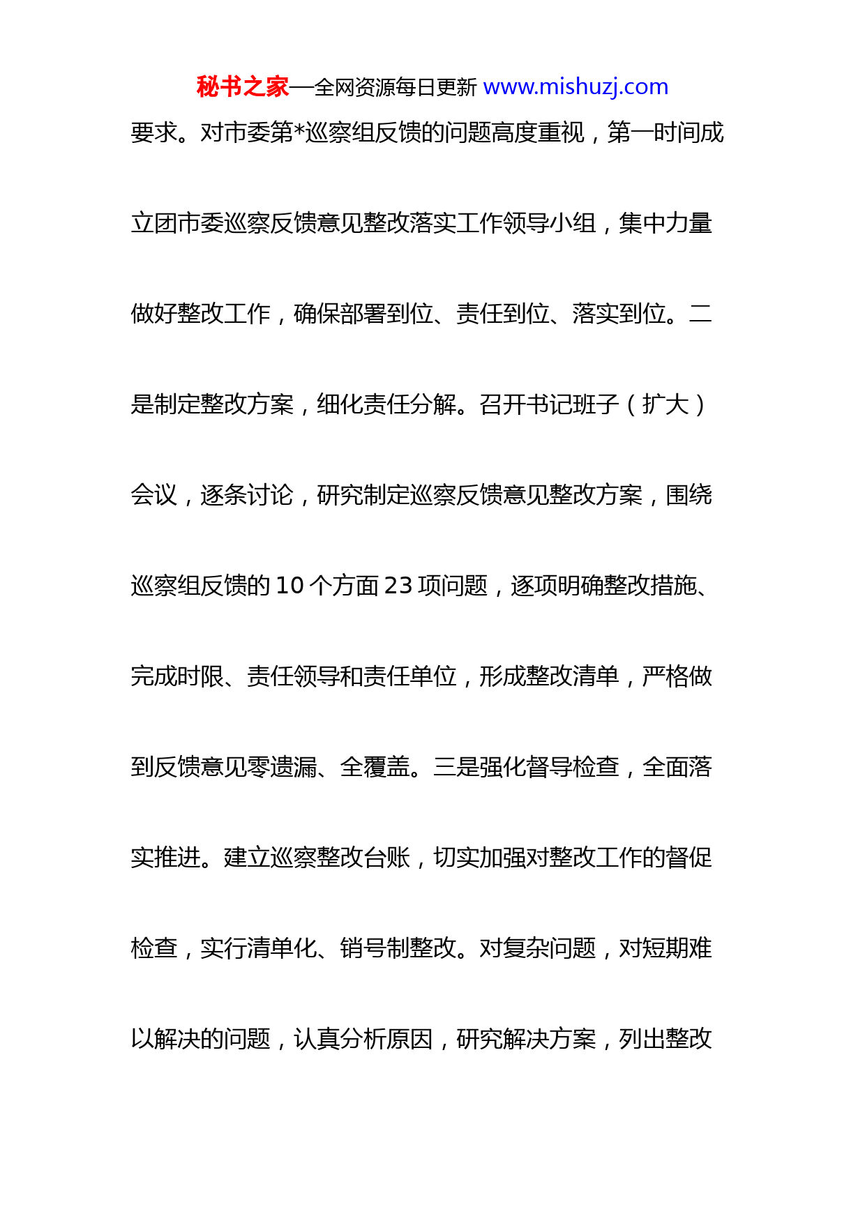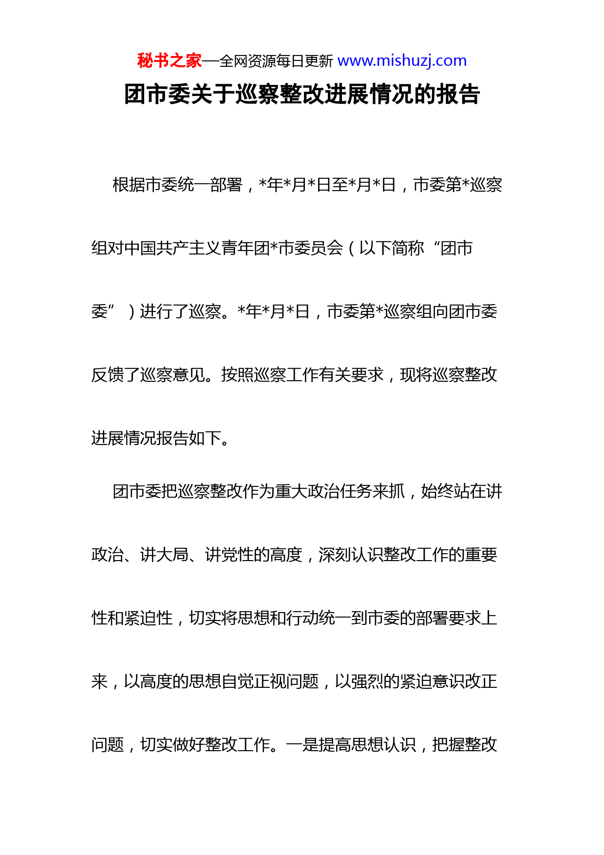秘书之家—全网资源每日更新www.mishuzj.com团市委关于巡察整改进展情况的报告根据市委统一部署,年月日至月日,市委第巡察组对中国共产主义青年团市委员会(以下简称“团市委”)进行了巡察。年月日,市委第巡察组向团市委反馈了巡察意见。按照巡察工作有关要求,现将巡察整改进展情况报告如下。团市委把巡察整改作为重大政治任务来抓,始终站在讲政治、讲大局、讲党性的高度,深刻认识整改工作的重要性和紧迫性,切实将思想和行动统一到市委的部署要求上来,以高度的思想自觉正视问题,以强烈的紧迫意识改正问题,切实做好整改工作。一是提高思想认识,把握整改秘书之家—全网资源每日更新www.mishuzj.com要求。对市委第巡察组反馈的问题高度重视,第一时间成立团市委巡察反馈意见整改落实工作领导小组,集中力量做好整改工作,确保部署到位、责任到位、落实到位。二是制定整改方案,细化责任分解。召开书记班子(扩大)会议,逐条讨论,研究制定巡察反馈意见整改方案,围绕巡察组反馈的10个方面23项问题,逐项明确整改措施、完成时限、责任领导和责任单位,形成整改清单,严格做到反馈意见零遗漏、全覆盖。三是强化督导检查,全面落实推进。建立巡察整改台账,切实加强对整改工作的督促检查,实行清单化、销号制整改。对复杂问题,对短期难以解决的问题,认真分析原因,研究解决方案,列出整改秘书之家—全网资源每日更新www.mishuzj.com时限,分期分批解决;对能够立即整改的问题,迅速整改,确保取得扎实成效。在巡察整改工作中,截至目前,巡察反馈23个问题,已完成整改22个,尚未整改到位1个,整改完成率95.65%,制定及修改完善制度6项,追缴资金0.2205万元,召开民主生活会批评帮助的4人次,提醒谈话7人次。一、关于“贯彻落实习近平总书记指示精神不够深入。习近平总书记强调‘共青团要坚持为党育人,始终成为引领中国青年思想进步的政治学校’‘共青团要履行好全团带队职责,团结带领少先队牢记初心使命,始终听党的秘书之家—全网资源每日更新www.mishuzj.com话、跟党走,让红领巾更加鲜艳’,但团市委在贯彻落实上还存在以下问题。”问题的整改情况(一)加强青少年思想教育。谋划开展“学习贯彻大”系列主题教育实践等各类青少年思想教育和活动,深化“红色剧本杀”“青春悦读会”“红领巾爱学习”等品牌载体。探索设计少先队“项目化活动”实施路径,市第一小学开展以赋权、赋行、赋能提升少先队活动实效的试点,《小学少先队“项目化活动”实施路径研究》《初中少先队中队活动课的设计与实施研究》被评定为年度省少先队研究课题优秀成果。秘书之家—全网资源每日更新www.mishuzj.com(二)夯实基层团组织建设。召开全市共青团工作述评会暨2023年共青团工作务虚会,加强对基层团干部的考核。严格落实团员编号制度,采取“按比例分配+适当调整”的方法,做好发展团员调控工作。下发团员发展、团员管理的学习资料39册,进一步加强对基层团组织指导和监督。对全市所有镇乡街道团干部情况整体排摸,目前4个镇乡街道未配备团委书记,下一步将积极与组织部对接,请组织部加快配齐镇乡街道团干部。(三)抓好青少年帮扶工作。全体机关干部加强服务帮扶青少年的文件精神学习,进一步理清要求、提高认识。加强对青少年宫开展活动的监督,要求青少年宫各类活动秘书之家—全网资源每日更新www.mishuzj.com提前半个月上报活动方案给团市委审阅。结合四类重点青少年帮扶,认真承接谋划困难青少年慰问、七彩假期公益托管等相关活动,精准活动对象,优化社会效益。并对青少年宫相关责任人员开展提醒谈话。二、关于“推进省市重点工作不够有力。”问题的整改情况(一)凝聚青年发展行动合力。组织机关全体团干部学习《省中长期青年发展规划(2017-2025)》等青年发展规划行动文件,加强认识。在现有制定出的实施方案基础上,明确牵头单位和参与单位等24家,增强可操作性。召开市青年工作联席会议第三次全体(扩大)会议,进一秘书之家—全网资源每日更新www.mishuzj.com步联合有关青年发展的职能单位,出台了《市青年发展型城市建设实施方案》,结合青年发展型城市建设,推动青年发展规划行动落实落地。(二)提高青年志愿行动合力。组织召开班子会议,紧扣市委、市政府中心工作,谋划2023年工作思路,明确“1+4+4”工作格局,开展四大专项行动。召开全市共青团工作述评会暨2023年共青团工作务虚会,进一步凝聚基层团组织的力量。结合省运会志愿服务工作,与广厦大学开展校地合作,建立“万千马生”青年志愿组织,常态化储备青年骨干志愿者500名,加强对全市志愿者的储备和秘书之家—全网资源每日更新www.mishuzj.com培训,打造平战结合的应急志愿服务体系,让志愿力量在重点工作和应急事件中发挥应有的作用。三、关于“意识形态和统战工作不够重视。”问题的整改情况(一)压紧压实“一岗双责”。坚持党管意识形态,组织全体机关干部学习相关文件要求,对意识形态工作进行再部署再强调。每年2次召开理论学习中心组落实维护意识形态安全的专题学习,年12月12日,召开第二次理论学习中心组意识形态专题学习。起草《关于落实团市委班子成员意识形态工作责任提示单》,在每年班子成员撰写秘书之家—全网资源每日更新www.mishu