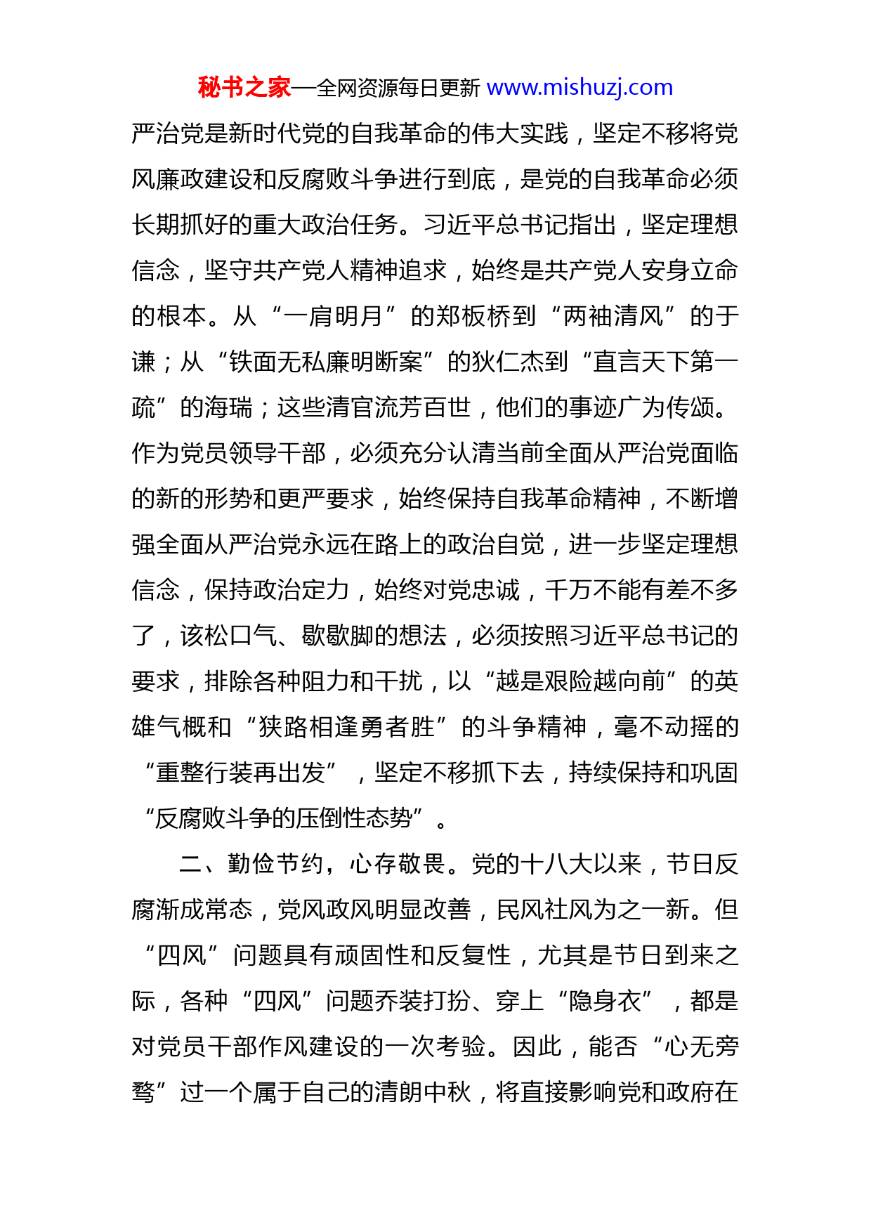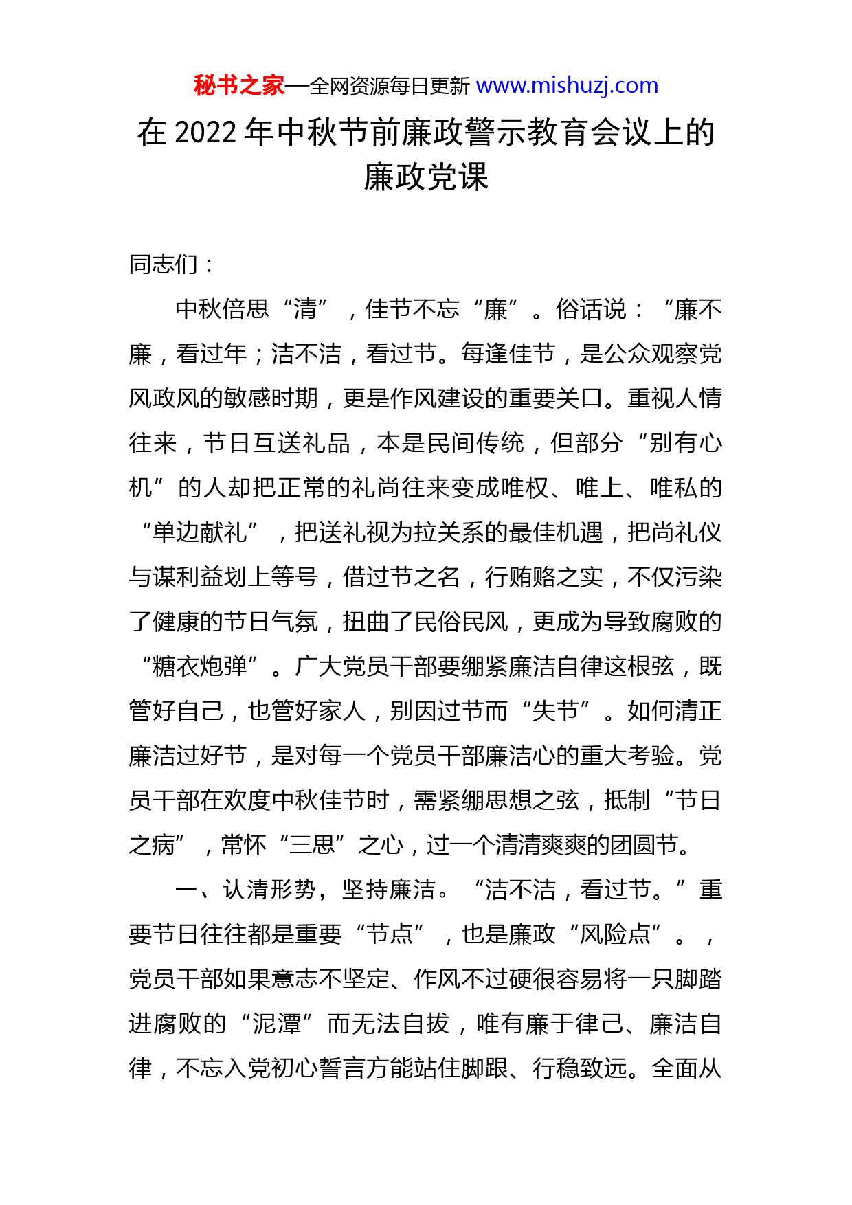 秘书之家—全网资源每日更新www.mishuzj.com在2022年中秋节前廉政警示教育会议上的廉政党课同志们:中秋倍思“清”,佳节不忘“廉”。俗话说:“廉不廉,看过年;洁不洁,看过节。每逢佳节,是公众观察党风政风的敏感时期,更是作风建设的重要关口。重视人情往来,节日互送礼品,本是民间传统,但部分“别有心机”的人却把正常的礼尚往来变成唯权、唯上、唯私的“单边献礼”,把送礼视为拉关系的最佳机遇,把尚礼仪与谋利益划上等号,借过节之名,行贿赂之实,不仅污染了健康的节日气氛,扭曲了民俗民风,更成为导致腐败的“糖衣炮弹”。广大党员干部要绷紧廉洁自律这根弦,既管好自己,也管好家人,别因过节而“失节”。如何清正廉洁过好节,是对每一个党员干部廉洁心的重大考验。党员干部在欢度中秋佳节时,需紧绷思想之弦,抵制“节日之病”,常怀“三思”之心,过一个清清爽爽的团圆节。一、认清形势,坚持廉洁。“洁不洁,看过节。”重要节日往往都是重要“节点”,也是廉政“风险点”。,党员干部如果意志不坚定、作风不过硬很容易将一只脚踏进腐败的“泥潭”而无法自拔,唯有廉于律己、廉洁自律,不忘入党初心誓言方能站住脚跟、行稳致远。全面从秘书之家—全网资源每日更新www.mishuzj.com严治党是新时代党的自我革命的伟大实践,坚定不移将党风廉政建设和反腐败斗争进行到底,是党的自我革命必须长期抓好的重大政治任务。习近平总书记指出,坚定理想信念,坚守共产党人精神追求,始终是共产党人安身立命的根本。从“一肩明月”的郑板桥到“两袖清风”的于谦;从“铁面无私廉明断案”的狄仁杰到“直言天下第一疏”的海瑞;这些清官流芳百世,他们的事迹广为传颂。作为党员领导干部,必须充分认清当前全面从严治党面临的新的形势和更严要求,始终保持自我革命精神,不断增强全面从严治党永远在路上的政治自觉,进一步坚定理想信念,保持政治定力,始终对党忠诚,千万不能有差不多了,该松口气、歇歇脚的想法,必须按照习近平总书记的要求,排除各种阻力和干扰,以“越是艰险越向前”的英雄气概和“狭路相逢勇者胜”的斗争精神,毫不动摇的“重整行装再出发”,坚定不移抓下去,持续保持和巩固“反腐败斗争的压倒性态势”。二、勤俭节约,心存敬畏。党的十八大以来,节日反腐渐成常态,党风政风明显改善,民风社风为之一新。但“四风”问题具有顽固性和反复性,尤其是节日到来之际,各种“四风”问题乔装打扮、穿上“隐身衣”,都是对党员干部作风建设的一次考验。因此,能否“心无旁骛”过一个属于自己的清朗中秋,将直接影响党和政府在秘书之家—全网资源每日更新www.mishuzj.com人民群众心中的形象。中秋团圆,免不了聚会用餐,党员干部要杜绝“舌尖上的浪费”。对待名利,我们要想得开、看得透,多向下看,少向上看,多看自己,少看别人,这样我们在名利面前就不会失去平衡,就不会犯错误。在座的各位,都是各个岗位的负责同志,手中或多或少掌握着人、财、物等方面的权力,这就难免会成为别有用心的人接近、拉拢的对象。特别是在中秋这个腐败问题易发高发的时间节点,更应该引起大家的高度警惕。现在,月饼作为寄予思念与亲情的文化价值正在回归,勤俭节约、风清气正过廉节已成为共识,在思想上树立起节俭办事、廉洁办事、按规矩办事的高度自觉。要高度警觉,要珍惜自己的岗位和前途,在如何对待权力这个重要问题上想清楚、想正确、有敬畏,始终怀有如履薄冰、如临深渊的敬畏之心,审慎用好权力,不能因为一念之差,一失足成千古恨。以明月为镜,时刻提醒自身应该具备廉洁奉公的品质,时刻保持廉洁之心,不能让传统佳节蒙上灰色“外衣”,成为一些居心叵测之人的腐败工具。要在润物细无声的方式中自觉遵守工作纪律和廉洁纪律,争做廉洁过节的宣传者、引领者,发挥榜样的力量,让“廉洁过节”成为人人自觉、人人遵守的“新常态”,带领广大职工度过一个安定祥和、清正廉洁的中秋节和国庆节。三、坚持底线,廉洁从政。清心为治本,直道是身秘书之家—全网资源每日更新www.mishuzj.com谋”。习近平总书记讲过,“干部廉洁自律的关键在于守住底线。只要守住做人、做事、用权、交友的底线,就能守住党和人民交给的政治责任,守住自己的政治生命线,守住正确的人生价值”。作为一名党的领导干部,我们就决不能仅仅以普通人的身份来要求自己。我们无论是做人、干事还是交易,都必须明底线、知敬畏,多一份自省,少一份浮躁,做到社会再变信仰不能忘,诱惑再大原则不能丢。要坚持清廉过节,更应严格要求自己,算好自己的政治账、经济账、声誉账、亲情账,守住纪律底线,把握好交往界限,在日常生活工作当“外圆”而“内方”,敢于担当困难,克服艰险,牢记使命,尽心尽力、尽职尽责。保持“时时勤拂拭,勿使惹尘埃”,拒绝“人情腐败”的“馅饼”,拧紧思想关、绷紧作风弦、守好廉洁心。要认真学习中央、省、市、各项会议公开通报违反中央八项规定精神的内容,学习《中国共产党廉洁自律准则》《中国共产党纪律处分条例》等党纪党规,督促领导干部严守政治纪律和政治规矩;教育广大党员干部绷紧作风建设这根弦,自觉抵制享乐奢靡歪风,始终做到政治自觉、思想自觉和行动自觉,树立良好的干部形象。