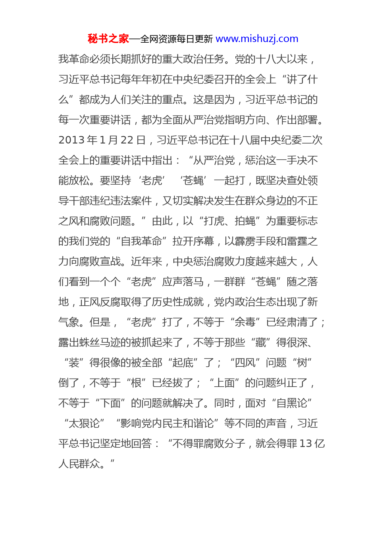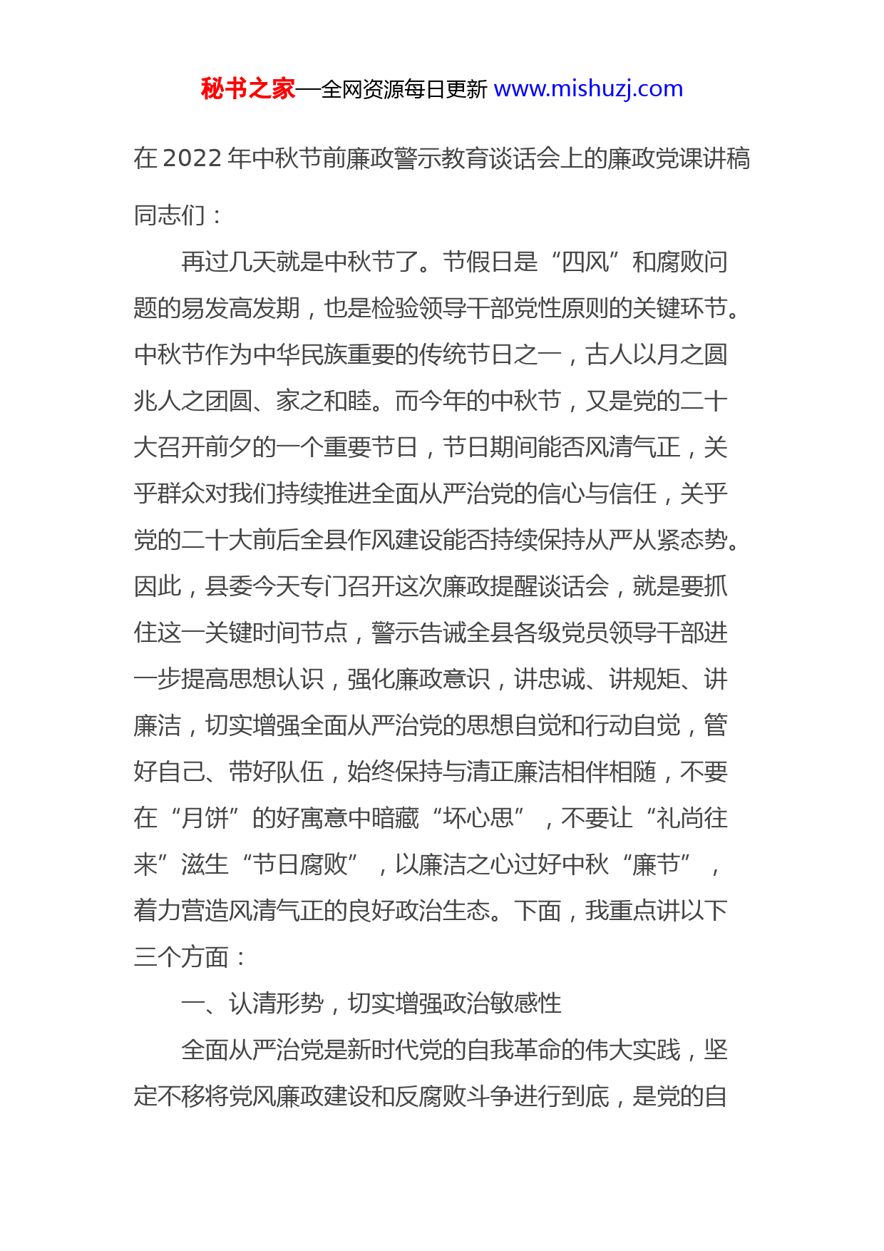 秘书之家—全网资源每日更新www.mishuzj.com在2022年中秋节前廉政警示教育谈话会上的廉政党课讲稿同志们:再过几天就是中秋节了。节假日是“四风”和腐败问题的易发高发期,也是检验领导干部党性原则的关键环节。中秋节作为中华民族重要的传统节日之一,古人以月之圆兆人之团圆、家之和睦。而今年的中秋节,又是党的二十大召开前夕的一个重要节日,节日期间能否风清气正,关乎群众对我们持续推进全面从严治党的信心与信任,关乎党的二十大前后全县作风建设能否持续保持从严从紧态势。因此,县委今天专门召开这次廉政提醒谈话会,就是要抓住这一关键时间节点,警示告诫全县各级党员领导干部进一步提高思想认识,强化廉政意识,讲忠诚、讲规矩、讲廉洁,切实增强全面从严治党的思想自觉和行动自觉,管好自己、带好队伍,始终保持与清正廉洁相伴相随,不要在“月饼”的好寓意中暗藏“坏心思”,不要让“礼尚往来”滋生“节日腐败”,以廉洁之心过好中秋“廉节”,着力营造风清气正的良好政治生态。下面,我重点讲以下三个方面:一、认清形势,切实增强政治敏感性全面从严治党是新时代党的自我革命的伟大实践,坚定不移将党风廉政建设和反腐败斗争进行到底,是党的自秘书之家—全网资源每日更新www.mishuzj.com我革命必须长期抓好的重大政治任务。党的十八大以来,习近平总书记每年年初在中央纪委召开的全会上“讲了什么”都成为人们关注的重点。这是因为,习近平总书记的每一次重要讲话,都为全面从严治党指明方向、作出部署。2013年1月22日,习近平总书记在十八届中央纪委二次全会上的重要讲话中指出:“从严治党,惩治这一手决不能放松。要坚持‘老虎’‘苍蝇’一起打,既坚决查处领导干部违纪违法案件,又切实解决发生在群众身边的不正之风和腐败问题。”由此,以“打虎、拍蝇”为重要标志的我们党的“自我革命”拉开序幕,以霹雳手段和雷霆之力向腐败宣战。近年来,中央惩治腐败力度越来越大,人们看到一个个“老虎”应声落马,一群群“苍蝇”随之落地,正风反腐取得了历史性成就,党内政治生态出现了新气象。但是,“老虎”打了,不等于“余毒”已经肃清了;露出蛛丝马迹的被抓起来了,不等于那些“藏”得很深、“装”得很像的被全部“起底”了;“四风”问题“树”倒了,不等于“根”已经拔了;“上面”的问题纠正了,不等于“下面”的问题就解决了。同时,面对“自黑论”“太狠论”“影响党内民主和谐论”等不同的声音,习近平总书记坚定地回答:“不得罪腐败分子,就会得罪13亿人民群众。”秘书之家—全网资源每日更新www.mishuzj.com全面从严治党永远在路上。当前,世界百年未有之大变局和新冠肺炎疫情全球大流行交织影响,外部环境更趋复杂严峻,国内新冠肺炎疫情防控和经济社会发展各项任务极为繁重艰巨,各种可以预见和难以预见的风险挑战层出不穷,自我革命永远在路上。今年1月18日,习近平总书记在十九届中央纪委六次全会上强调,“我们党历经百年、成就辉煌,党内党外、国内国外赞扬声很多。越是这样越要发扬自我革命精神,千万不能在一片喝彩声中迷失自我。”对此,作为党员领导干部,必须充分认清当前全面从严治党面临的新的形势和更严要求,始终保持自我革命精神,不断增强全面从严治党永远在路上的政治自觉,进一步坚定理想信念,保持政治定力,始终对党忠诚,千万不能有差不多了,该松口气、歇歇脚的想法,必须按照习近平总书记的要求,排除各种阻力和干扰,以“越是艰险越向前”的英雄气概和“狭路相逢勇者胜”的斗争精神,毫不动摇的“重整行装再出发”,坚定不移抓下去,持续保持和巩固“反腐败斗争的压倒性态势”。二、保持清醒,始终对待权利心存敬畏名利,世人皆有之。司马迁说:“天下熙熙,皆为利来,天下攘攘,皆为利往。”求利,乃人之常情。关键是留什么样的名,求什么样的利。人们常说,人生有两难,一是认识自己、塑造自己、找准自己人生坐标的位置难;秘书之家—全网资源每日更新www.mishuzj.com二是摆脱名利的困扰难。对待名利,我们要想得开、看得透,多向下看,少向上看,多看自己,少看别人,这样我们在名利面前就不会失去平衡,就不会犯错误。在座的各位,都是全县各个岗位的负责同志,手中或多或少掌握着人、财、物等方面的权力,这就难免会成为别有用心的人接近、拉拢的对象。特别是在中秋这个腐败问题易发高发的时间节点,更应该引起大家的高度警惕。从近年来查处的腐败案件看,一些领导干部经不住“糖衣炮弹”的诱惑,利用手中的权力大开方便之门,搞权力寻租、权钱交易的现象确实存在,危害也非常大。在月份召开的全县“以案促改”警示教育大会上,我们通报了、等4起典型案例,这是发生在我们身边的事情,教训不可谓不深刻。我们要深刻吸取反面典型和警示教育的教训,受警醒、明底线、知敬畏,分清是非界限,澄清模糊认识,廓清思想迷雾,点亮心中“明灯”,照亮光明之路。一个干部的成长需要很长的时间,付出了很多努力,非常不容易。我讲这些,主要还是提醒大家要高度警觉,大家要珍惜自己的岗位和前途,在如何对待权力这个重要问题上想清楚、想正确、有敬畏,始终怀有如履薄冰、如临深渊的敬畏之心,审慎用好权力,不能因为一念之差,一失足成千古恨。