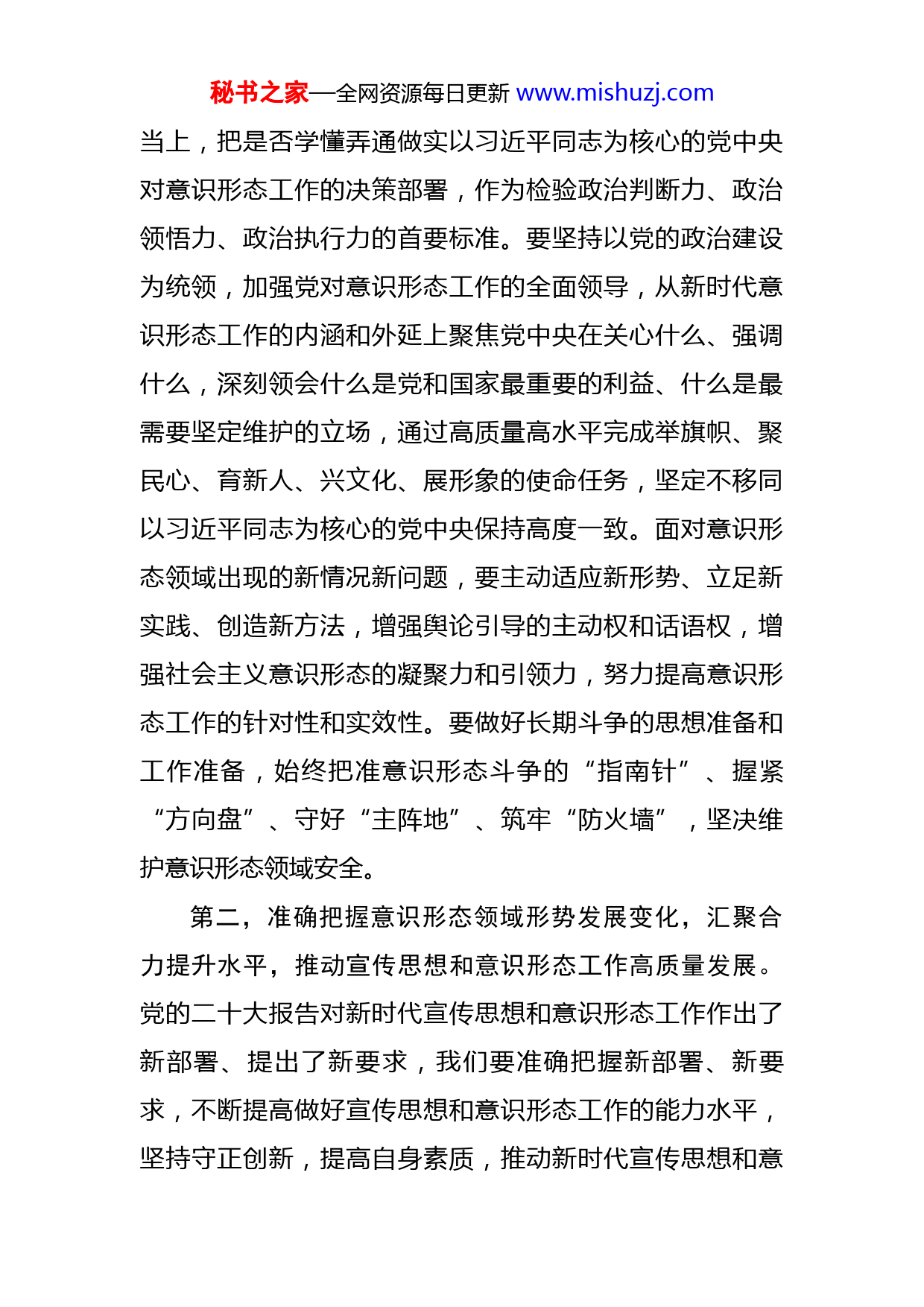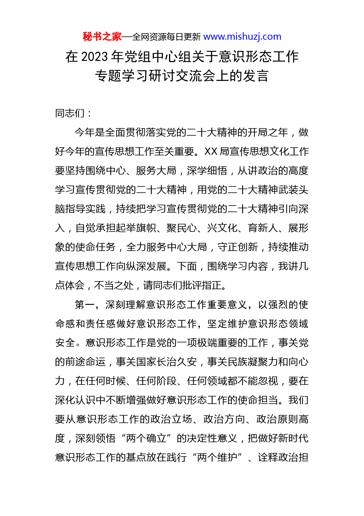 秘书之家—全网资源每日更新www.mishuzj.com在2023年党组中心组关于意识形态工作专题学习研讨交流会上的发言同志们:今年是全面贯彻落实党的二十大精神的开局之年,做好今年的宣传思想工作至关重要。XX局宣传思想文化工作要坚持围绕中心、服务大局,深学细悟,从讲政治的高度学习宣传贯彻党的二十大精神,用党的二十大精神武装头脑指导实践,持续把学习宣传贯彻党的二十大精神引向深入,自觉承担起举旗帜、聚民心、兴文化、育新人、展形象的使命任务,全力服务中心大局,守正创新,持续推动宣传思想工作向纵深发展。下面,围绕学习内容,我讲几点体会,不当之处,请同志们批评指正。第一,深刻理解意识形态工作重要意义,以强烈的使命感和责任感做好意识形态工作,坚定维护意识形态领域安全。意识形态工作是党的一项极端重要的工作,事关党的前途命运,事关国家长治久安,事关民族凝聚力和向心力,在任何时候、任何阶段、任何领域都不能忽视,要在深化认识中不断增强做好意识形态工作的使命担当。我们要从意识形态工作的政治立场、政治方向、政治原则高度,深刻领悟“两个确立”的决定性意义,把做好新时代意识形态工作的基点放在践行“两个维护”、诠释政治担秘书之家—全网资源每日更新www.mishuzj.com当上,把是否学懂弄通做实以习近平同志为核心的党中央对意识形态工作的决策部署,作为检验政治判断力、政治领悟力、政治执行力的首要标准。要坚持以党的政治建设为统领,加强党对意识形态工作的全面领导,从新时代意识形态工作的内涵和外延上聚焦党中央在关心什么、强调什么,深刻领会什么是党和国家最重要的利益、什么是最需要坚定维护的立场,通过高质量高水平完成举旗帜、聚民心、育新人、兴文化、展形象的使命任务,坚定不移同以习近平同志为核心的党中央保持高度一致。面对意识形态领域出现的新情况新问题,要主动适应新形势、立足新实践、创造新方法,增强舆论引导的主动权和话语权,增强社会主义意识形态的凝聚力和引领力,努力提高意识形态工作的针对性和实效性。要做好长期斗争的思想准备和工作准备,始终把准意识形态斗争的“指南针”、握紧“方向盘”、守好“主阵地”、筑牢“防火墙”,坚决维护意识形态领域安全。第二,准确把握意识形态领域形势发展变化,汇聚合力提升水平,推动宣传思想和意识形态工作高质量发展。党的二十大报告对新时代宣传思想和意识形态工作作出了新部署、提出了新要求,我们要准确把握新部署、新要求,不断提高做好宣传思想和意识形态工作的能力水平,坚持守正创新,提高自身素质,推动新时代宣传思想和意秘书之家—全网资源每日更新www.mishuzj.com识形态工作高质量发展。进入新发展阶段,互联网新技术持续深刻地改变着舆论生态、文化业态、传播形态,同时也让我们迎来了数字化赋能的战略机遇期。我们要抢抓机遇,用好管好新技术,准确把握数字经济发展带来的传播格局变化和治理体系变革,破除思维定式、工作惯性、路径依赖,实施宣传思想工作创新行动,全面推进宣传思想工作理念、内容建设、话语方式、体制机制创新,更好地适应变化、把握时势、引领潮流。紧扣宣传思想工作急难险重任务、多年难啃的“硬骨头”和重大改革创新突破点,深入开展学习调研,找准症结、靶向施策;对发现的经验及时总结提炼,形成可推广的具体举措和工作制度。强化责任意识,坚持守土有责、守土尽责,知重负重、攻坚克难,切实抓好关键环节、解决突出问题,彰显宣传思想战线的担当作为。我们要全面理解、准确把握新发展理念的丰富内涵和理论精髓,把新发展理念贯穿宣传思想工作全过程,奋力推进各项工作守正创新、提质增效。第三,持续扩大行业主流舆论声量,唱响自信自强、团结奋斗主旋律,牢牢掌握意识形态工作领导权主导权。加强思想引领,唱响意识形态”主旋律”,局属各单位和机关各科室要以即将开展的学习贯彻习近平新时代中国特色社会主义思想主题教育为载体,教育党员干部群众学深悟透、入脑入心,坚定“四个自信”、做到“两个维秘书之家—全网资源每日更新www.mishuzj.com护”,履职尽责、团结奋进,重整行装再出发;党员干部要示范引领,深入学习习近平新时代中国特色社会主义思想,把意识形态工作纳入党员理论学习专题,通过加强理论学习,进一步深化党员干部理想信念教育;深入开展“主题党日“活动,领导干部讲党课活动,社会主义核心价值观教育活动,不断提高党员干部的理论素养,唱响意识形态“主旋律”,激励更是党员干部真抓实干、破解发展难题。要加强社会主义核心价值观教育,深入挖掘本地传统文化蕴含的思想观念、人文精神、道德规范,大力弘扬党领导人民在革命、建设、改革中创造的革命文化和社会主义先进文化,用悠久的历史文化滋养广大党员干部群众的精神世界,提振人民群众的精神力量;大力弘扬道德模范的正能量,广泛宣传身边道德模范的先进事迹,弘扬道德模范高尚品格,引领每个人都向道德模范学习,争做崇德向善的践行者、文明风尚的维护者、美好生活的创造者。提高风险化解能力,对出现的网络风险高度重视,科学预测网络意识形态发展趋势,增强处置工作的前瞻性和主动性,充分发挥制度体制优势,坚持管用防并举,方